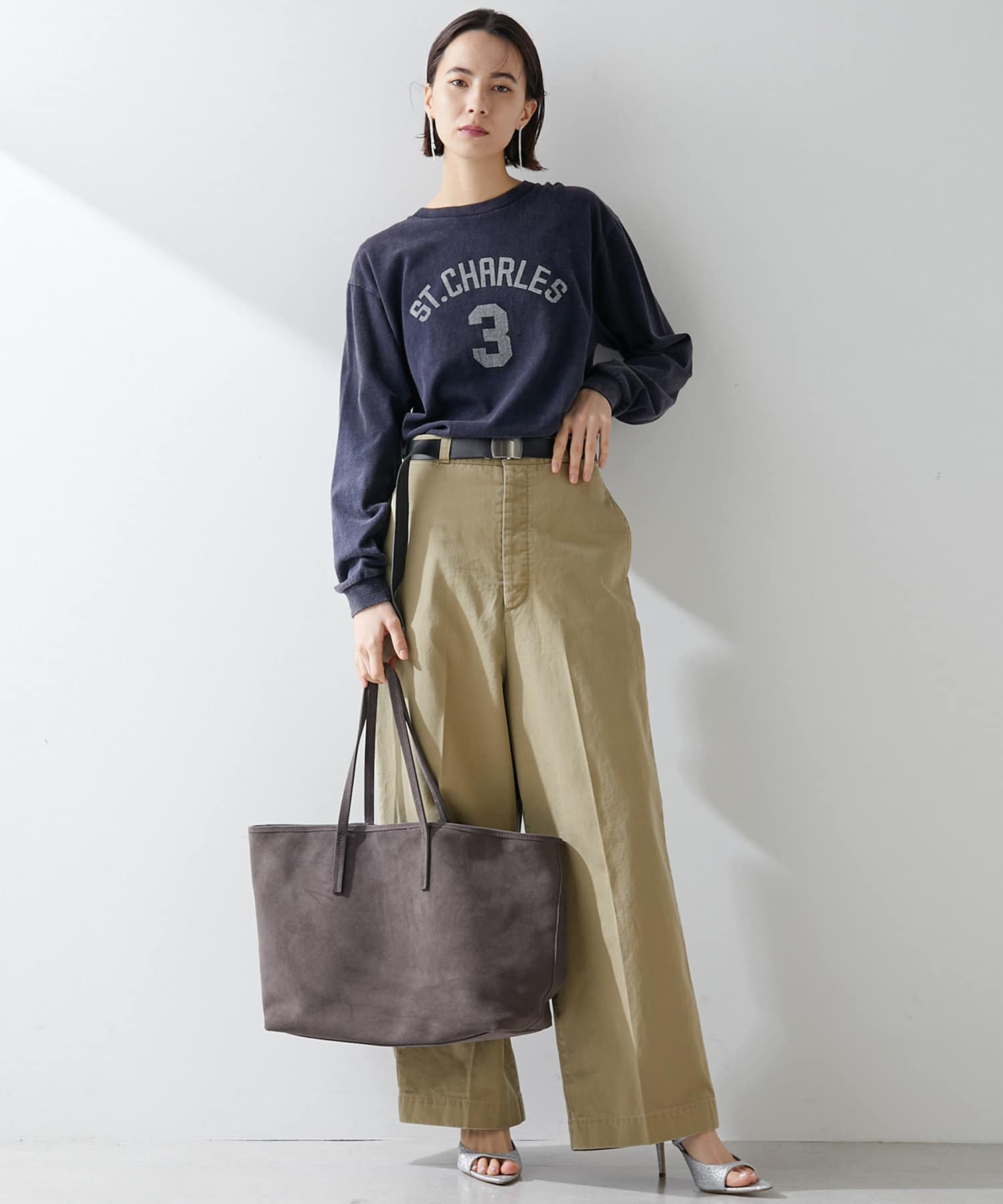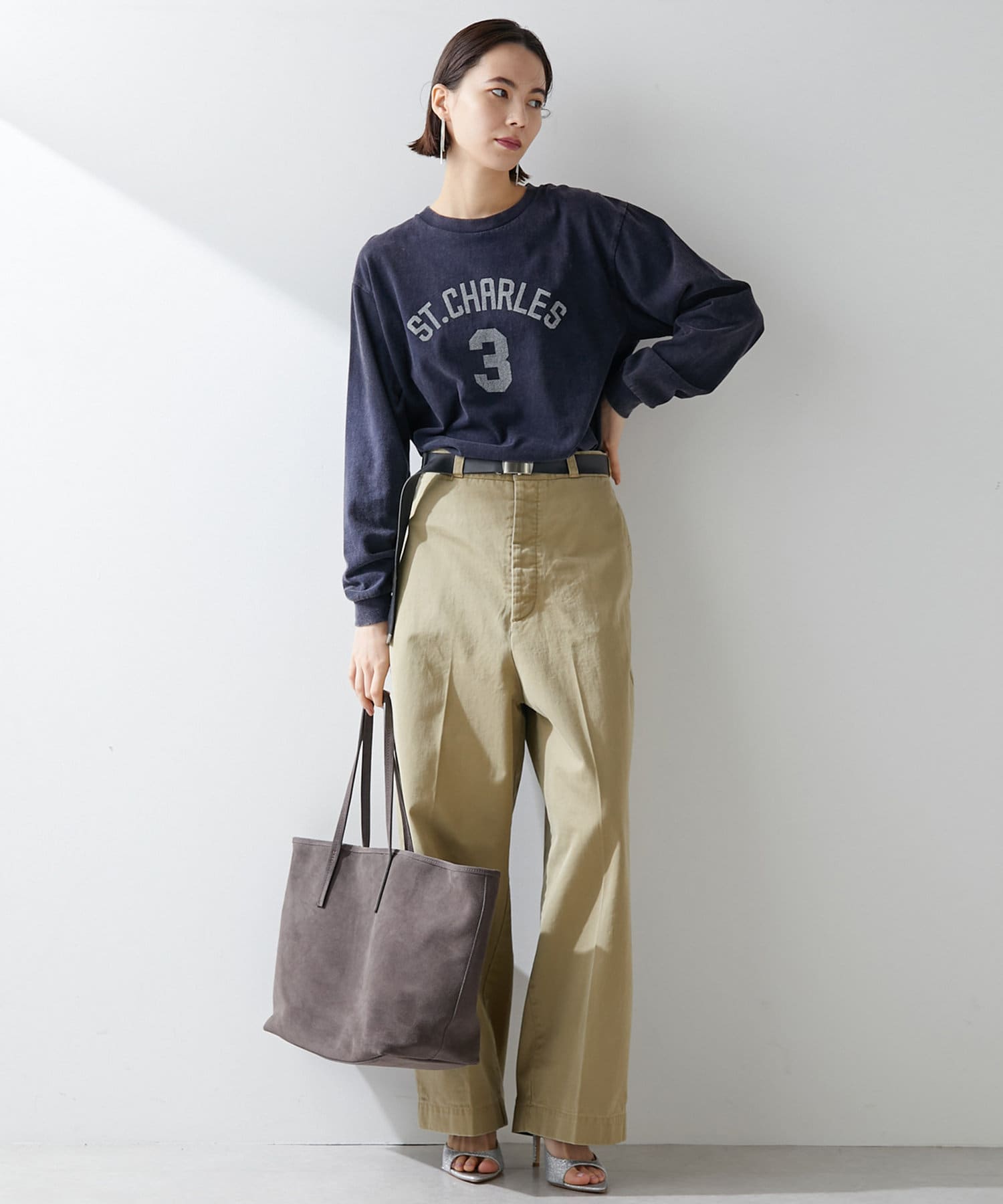 ゆるっとしたシルエットで一枚でもサマになり、ボトムインでもアウトでも使いやすい丈感です。ジャケットのインナーにも着やすい生地の厚みで、秋~春までロングシーズン使えるアイテムです!