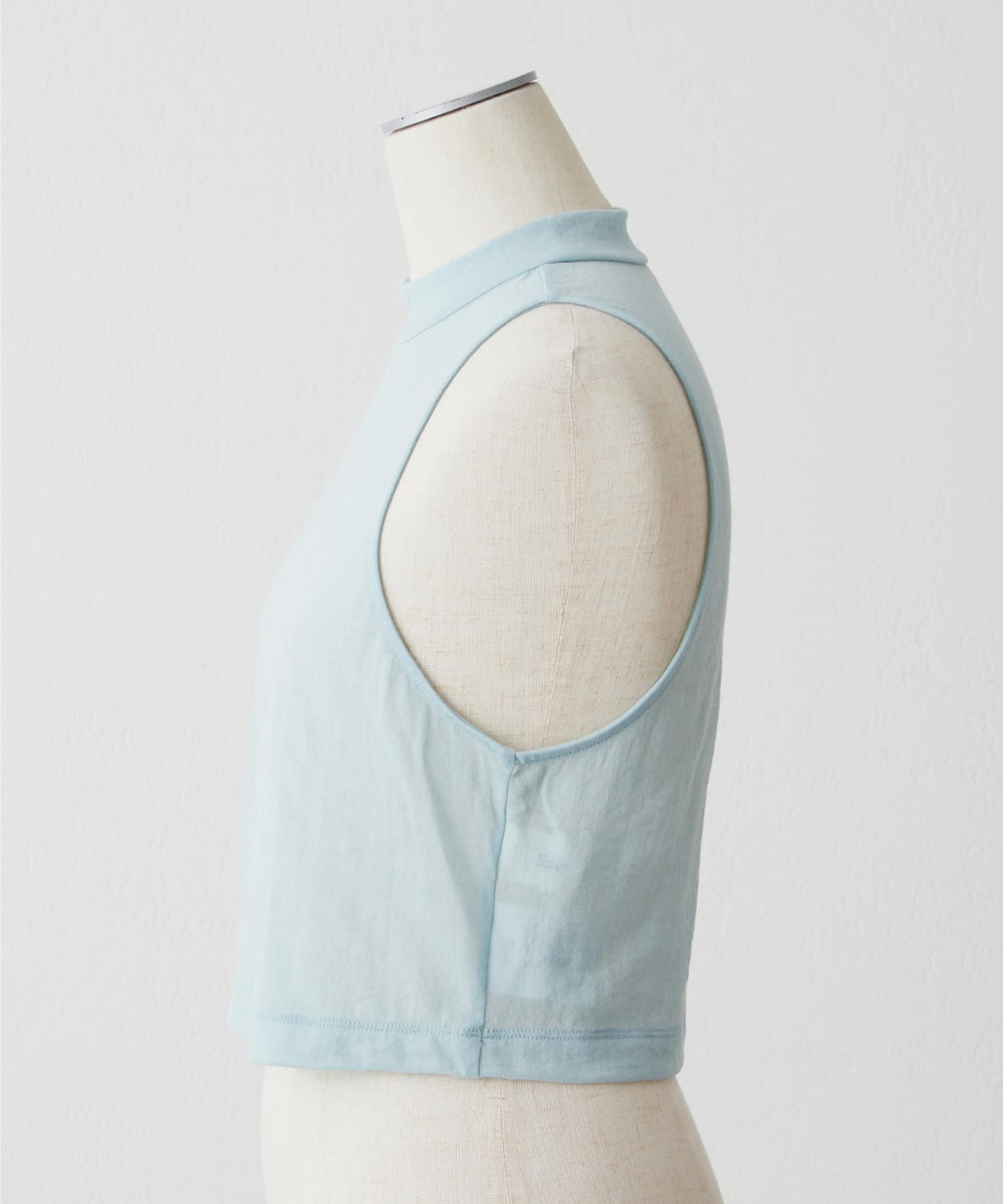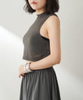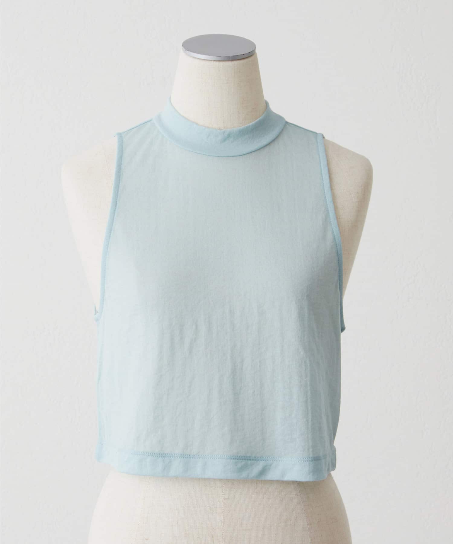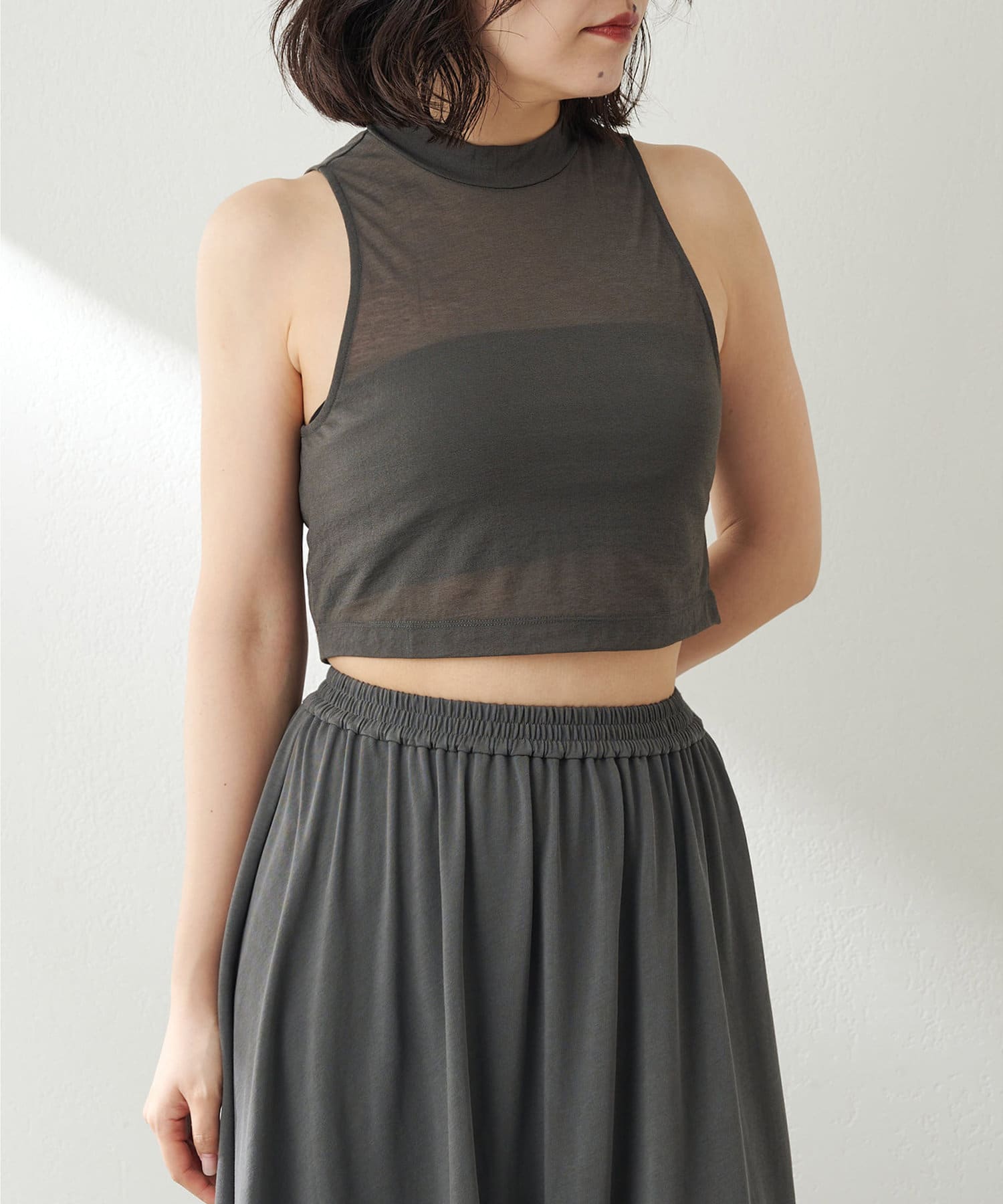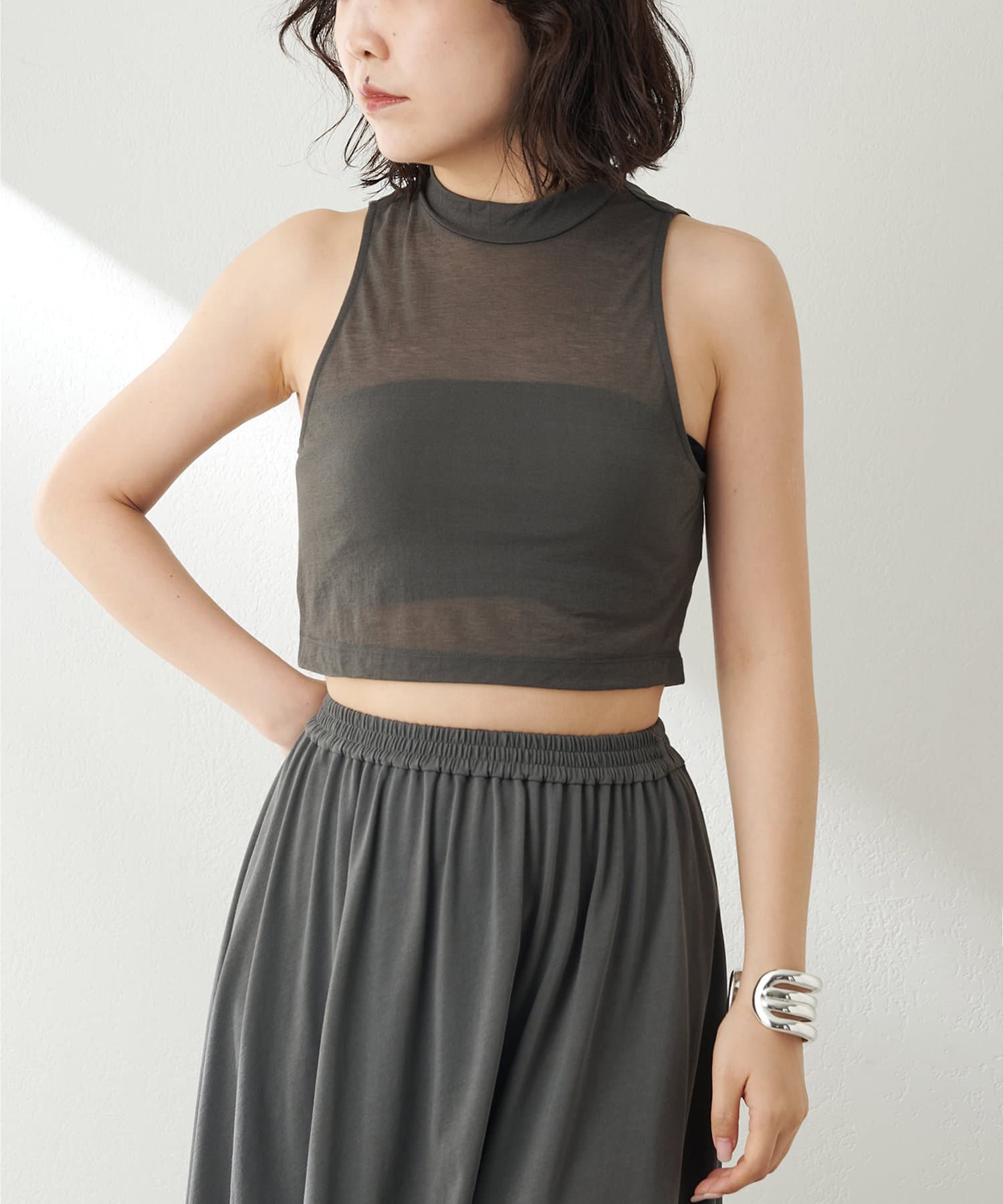 シアーな生地とアメスリで大人ヘルシーな1着。モックネックデザインで1枚でも様になります。短丈なのでハイウエストなボトムとも相性が良いです。