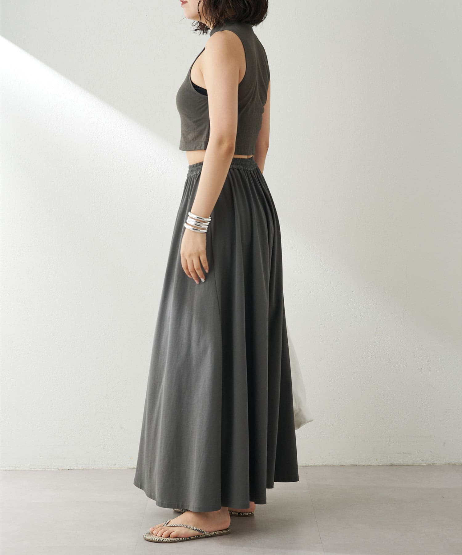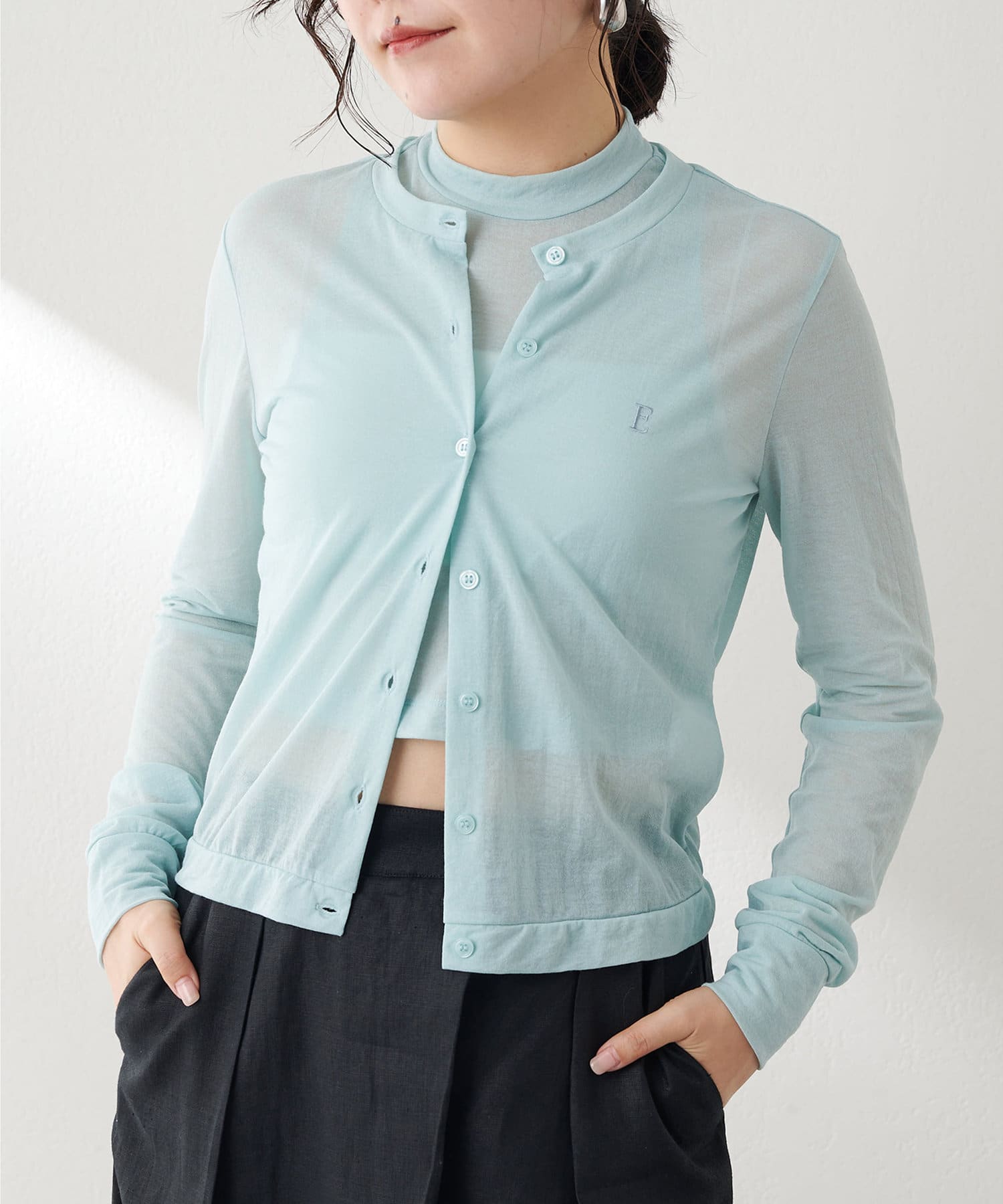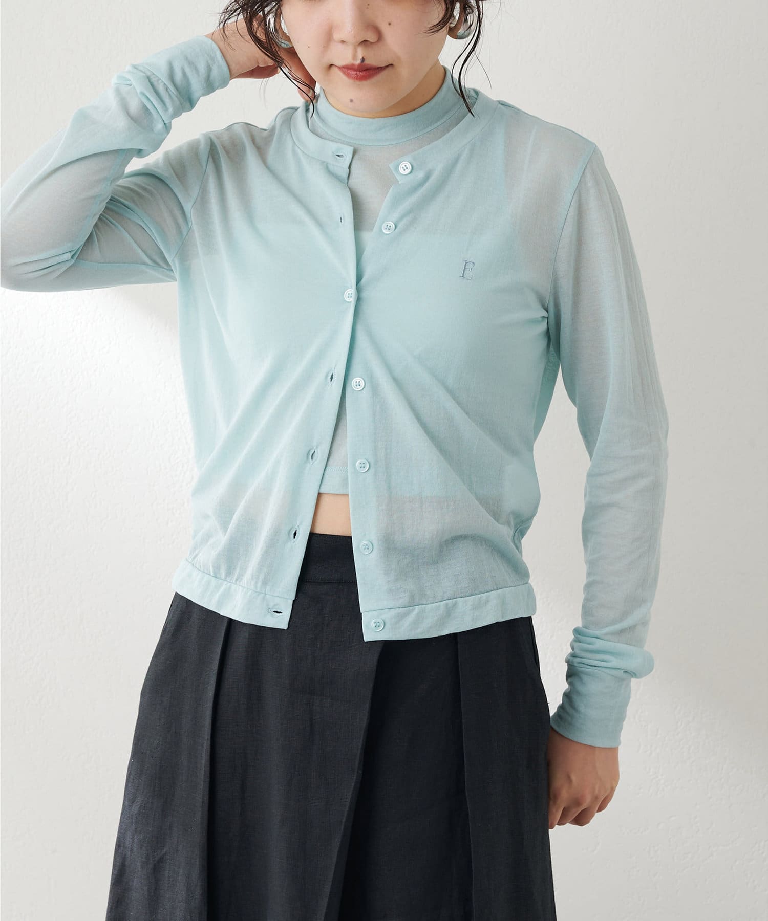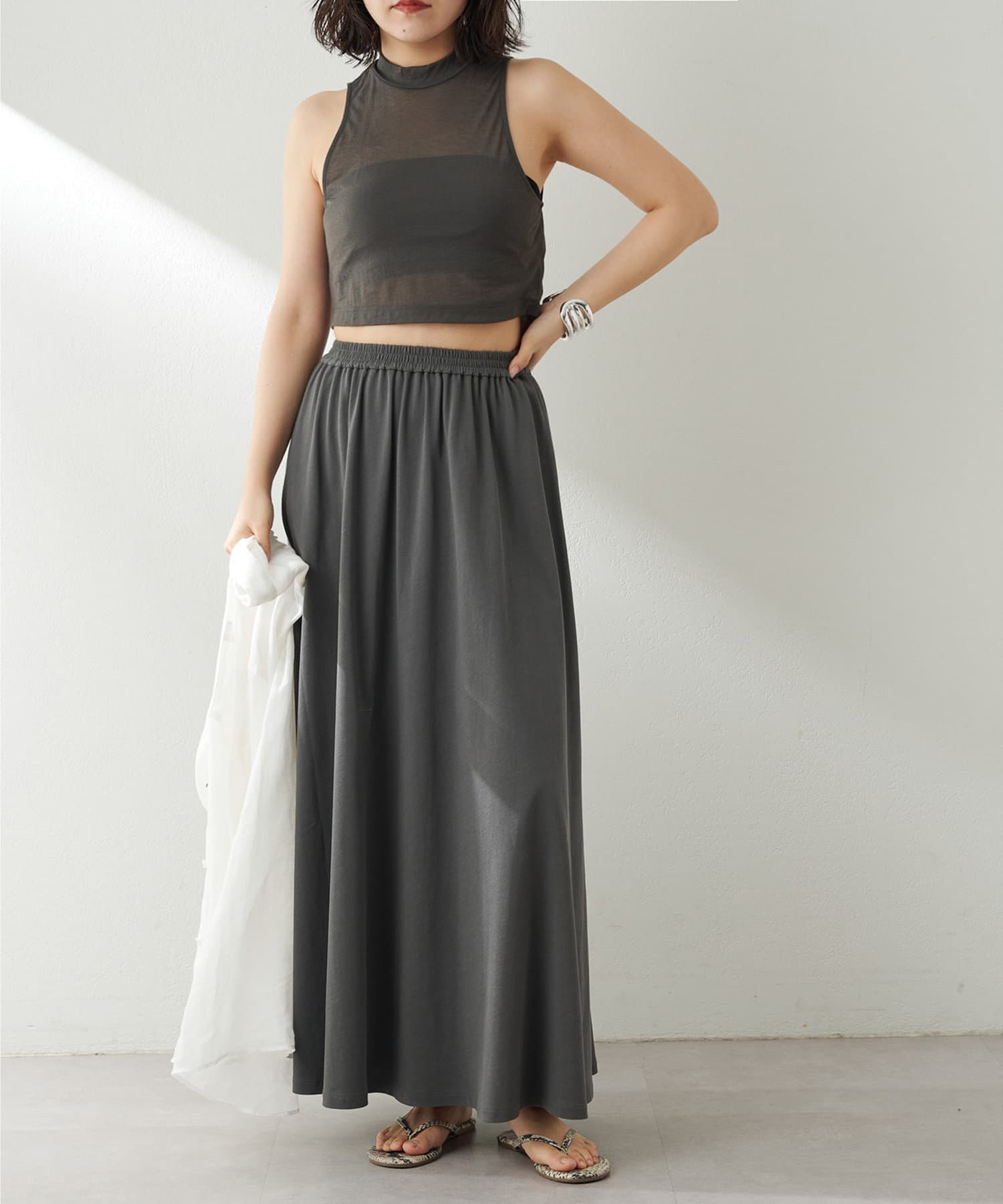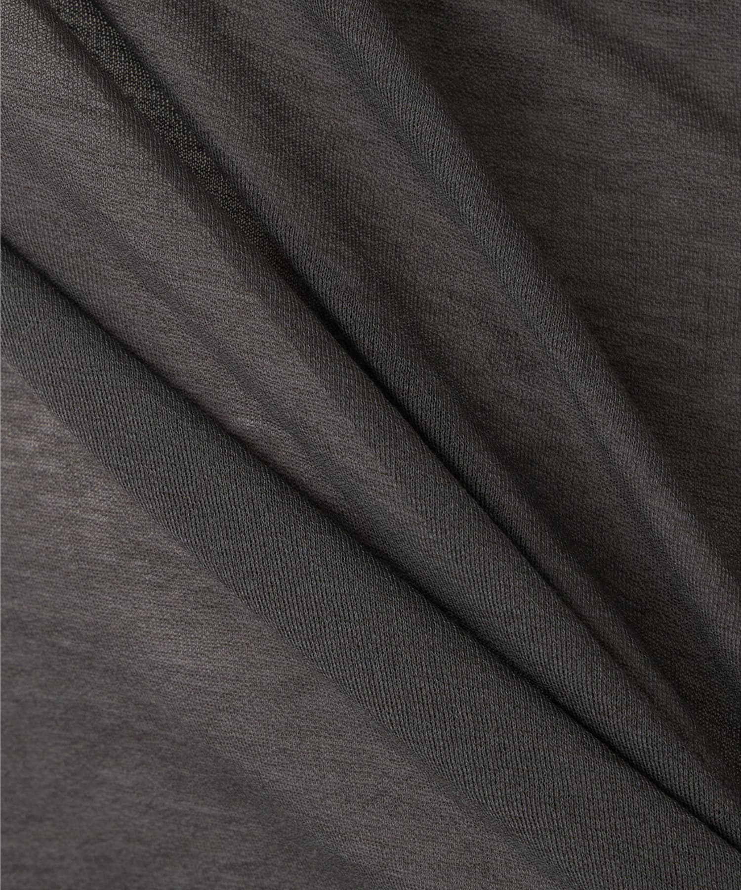 シアーな生地とアメスリで大人ヘルシーな1着。モックネックデザインで1枚でも様になります。短丈なのでハイウエストなボトムとも相性が良いです。