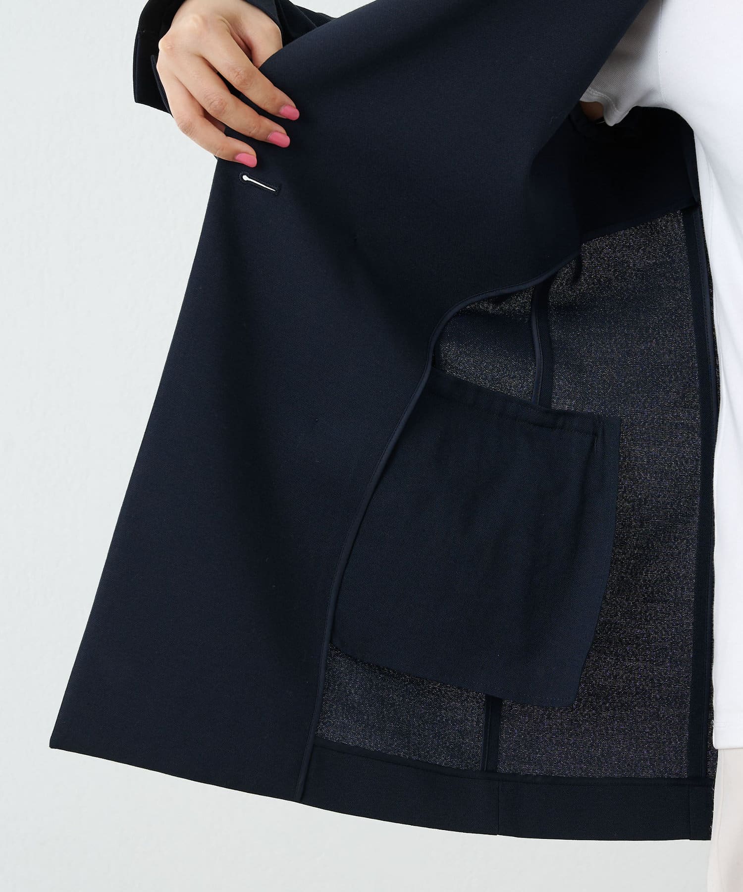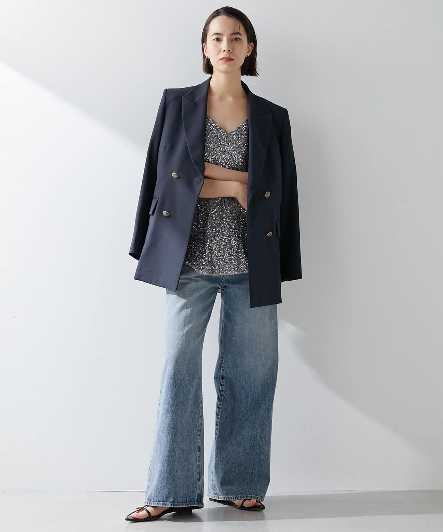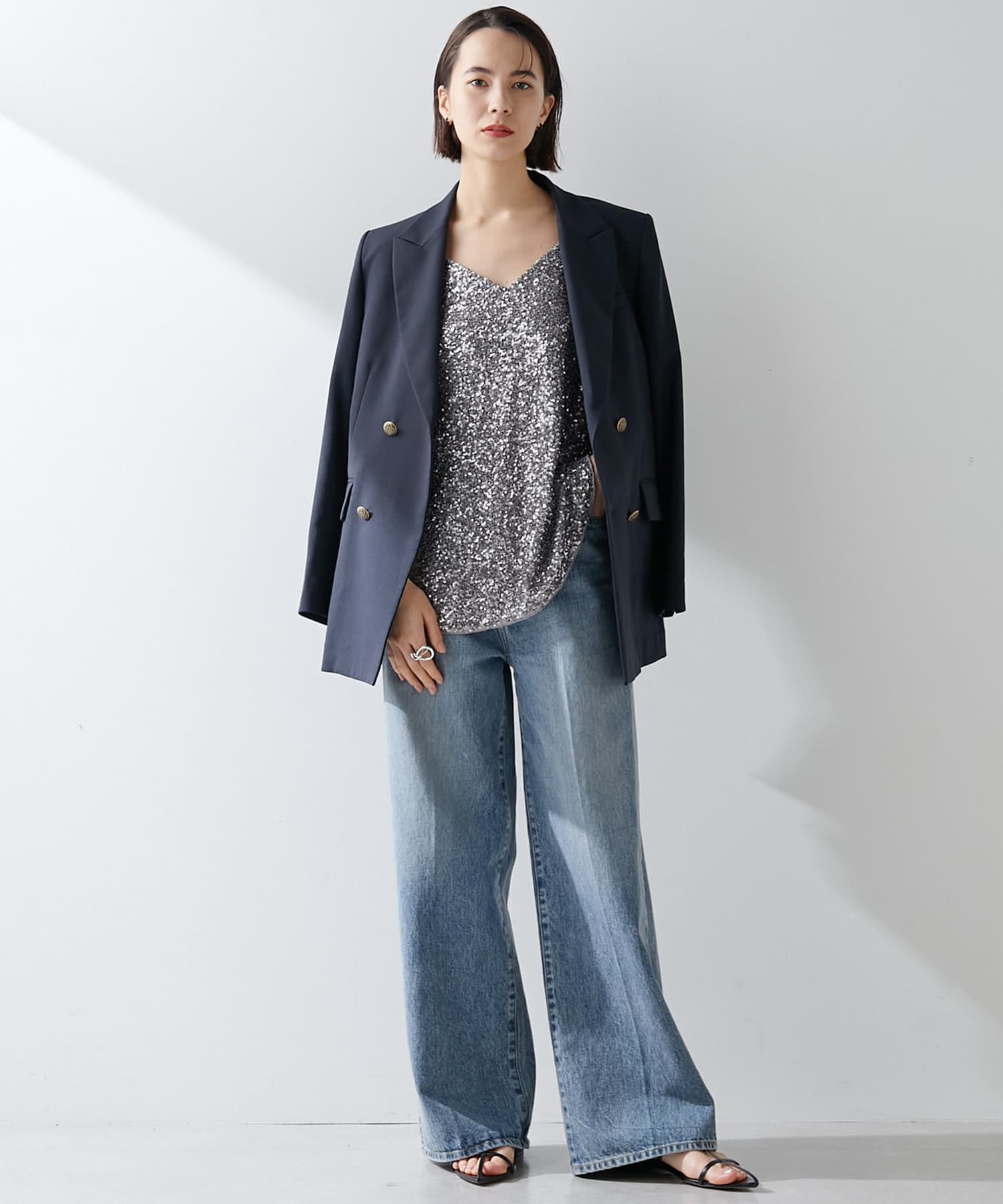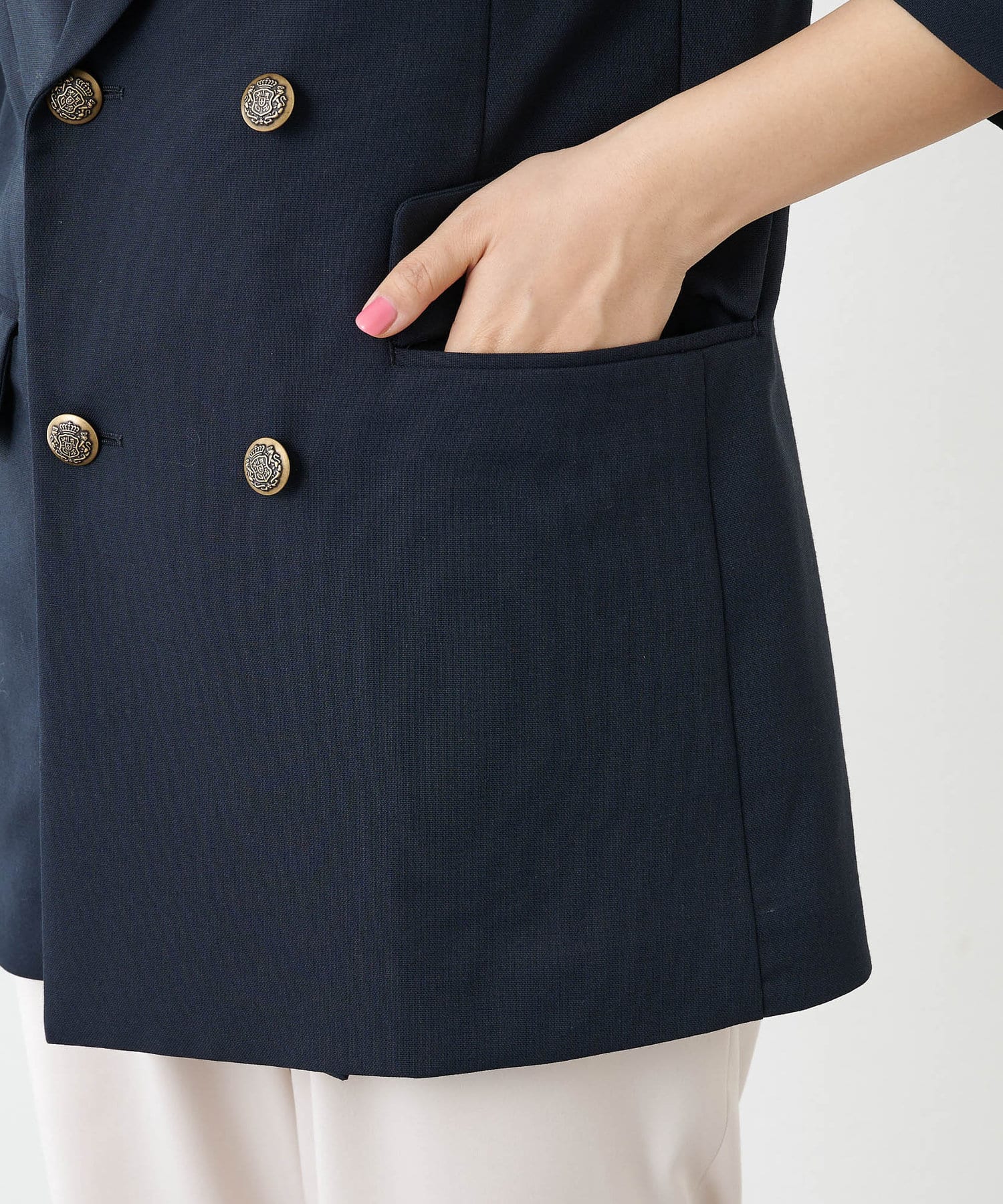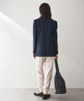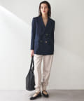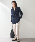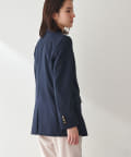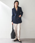 少し透け感のあるダブルブレストのジャケットです。見た目はかっちりとしたジャケットですが、とても軽やかで重たく見えずにサラッと羽織れ、初夏や初秋にも使いやすいデザインです。