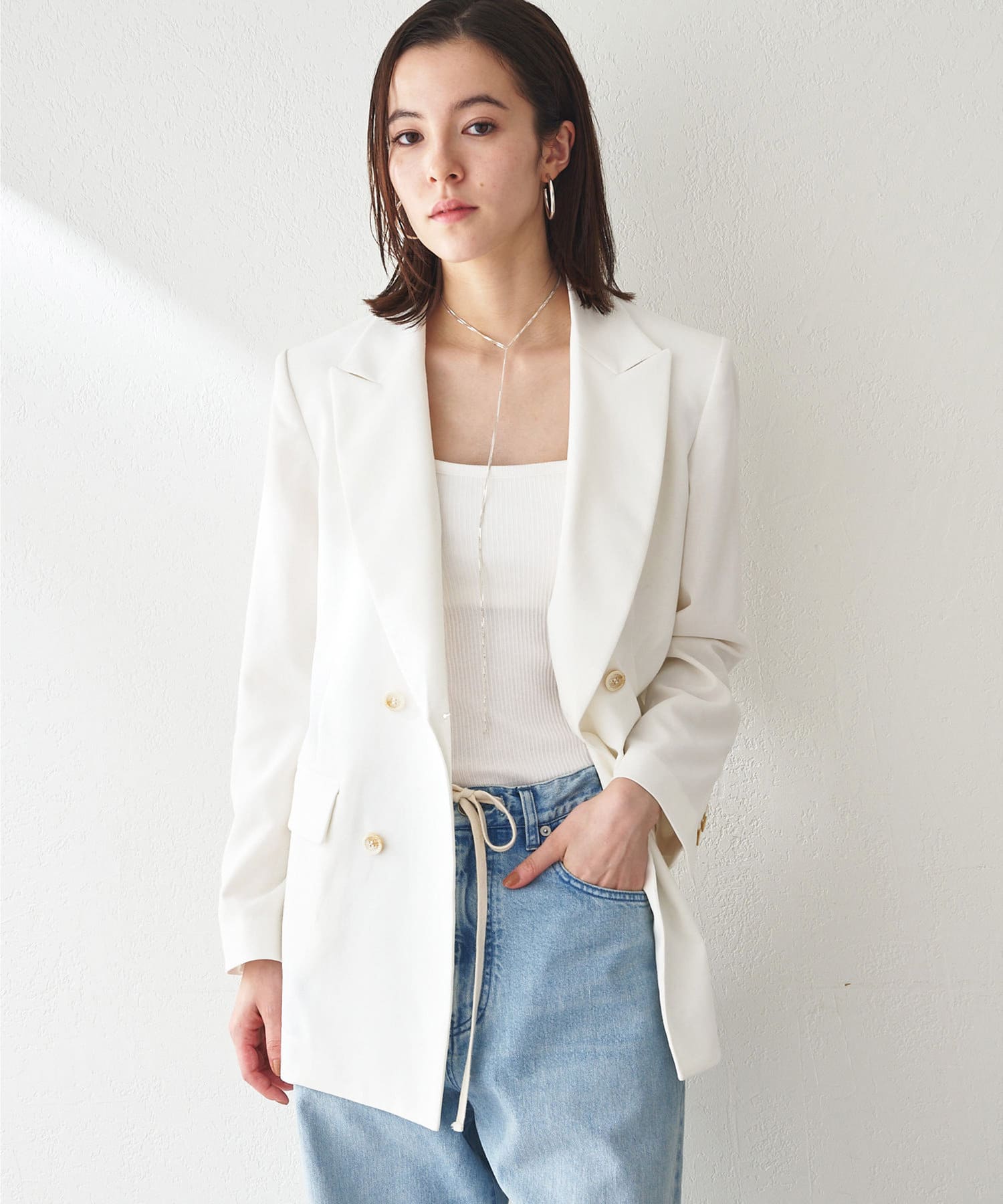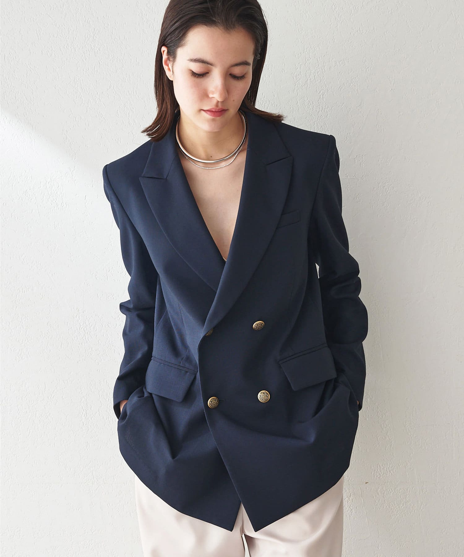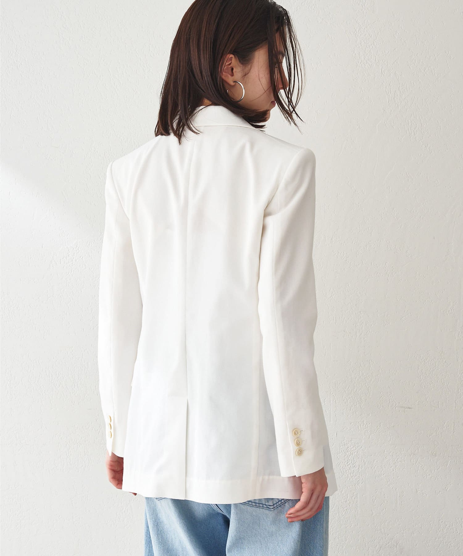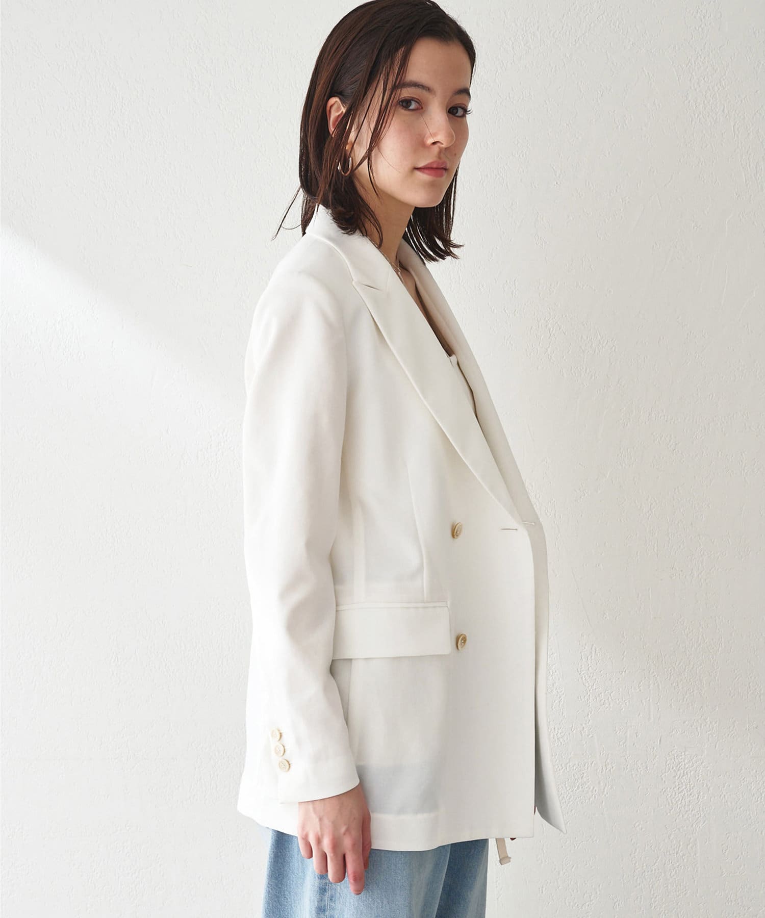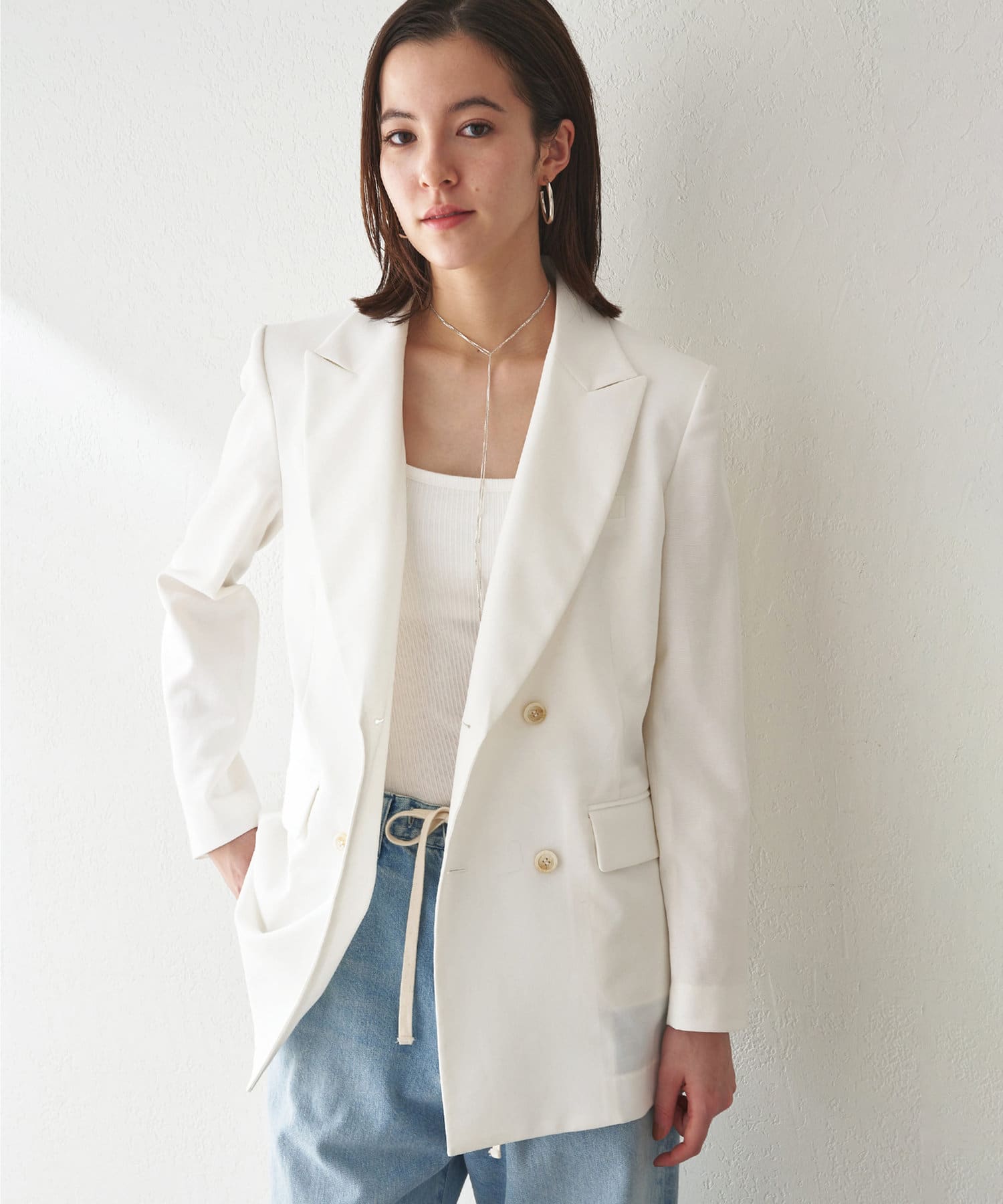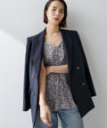 ■さりげない透け感のある素材を使用したダブルブレストジャケット。