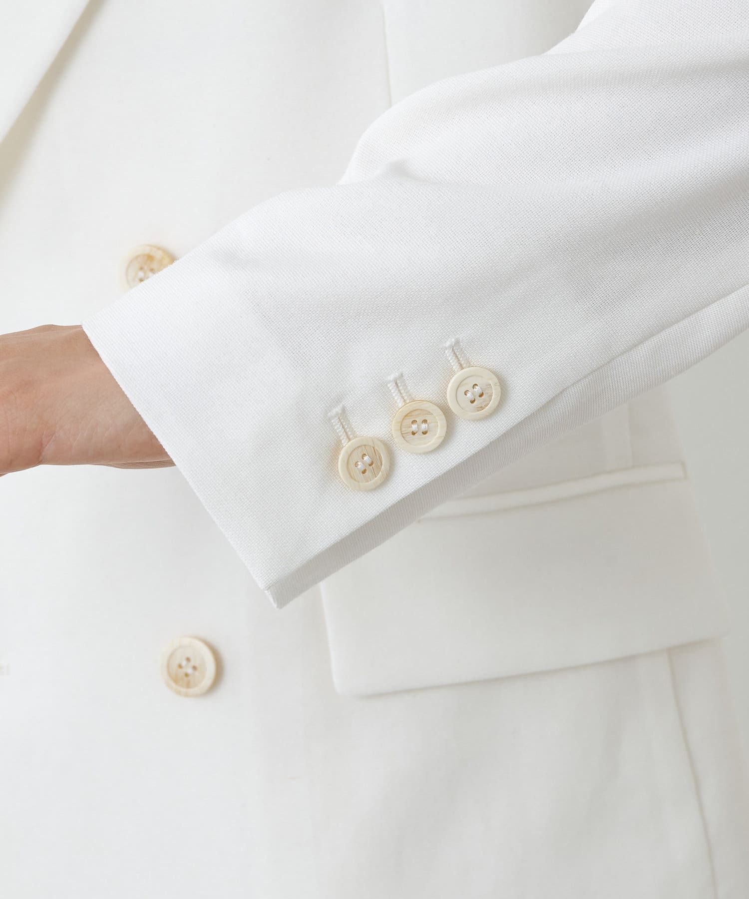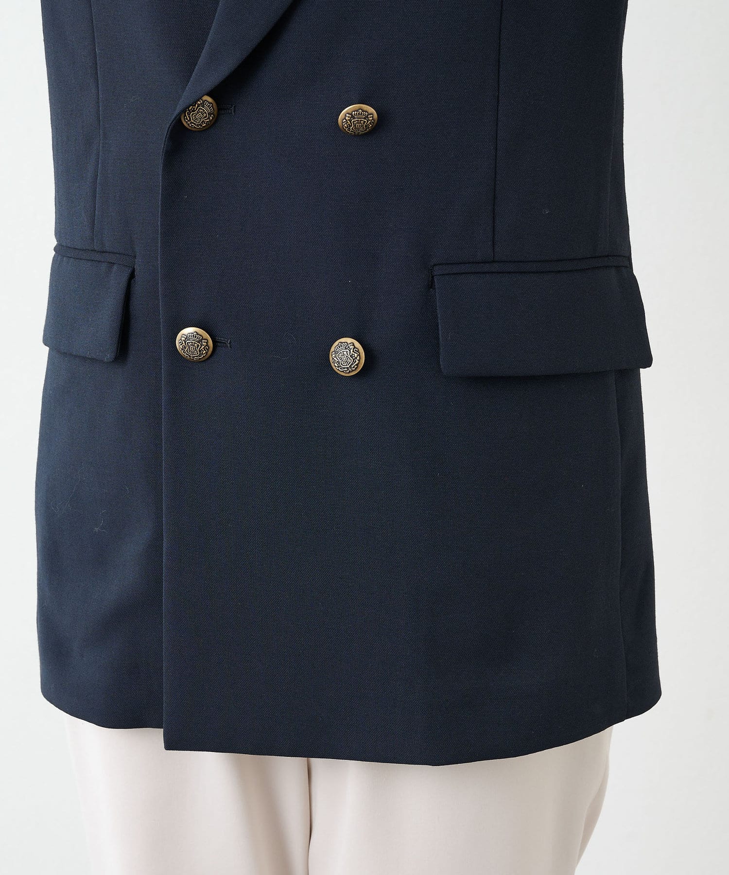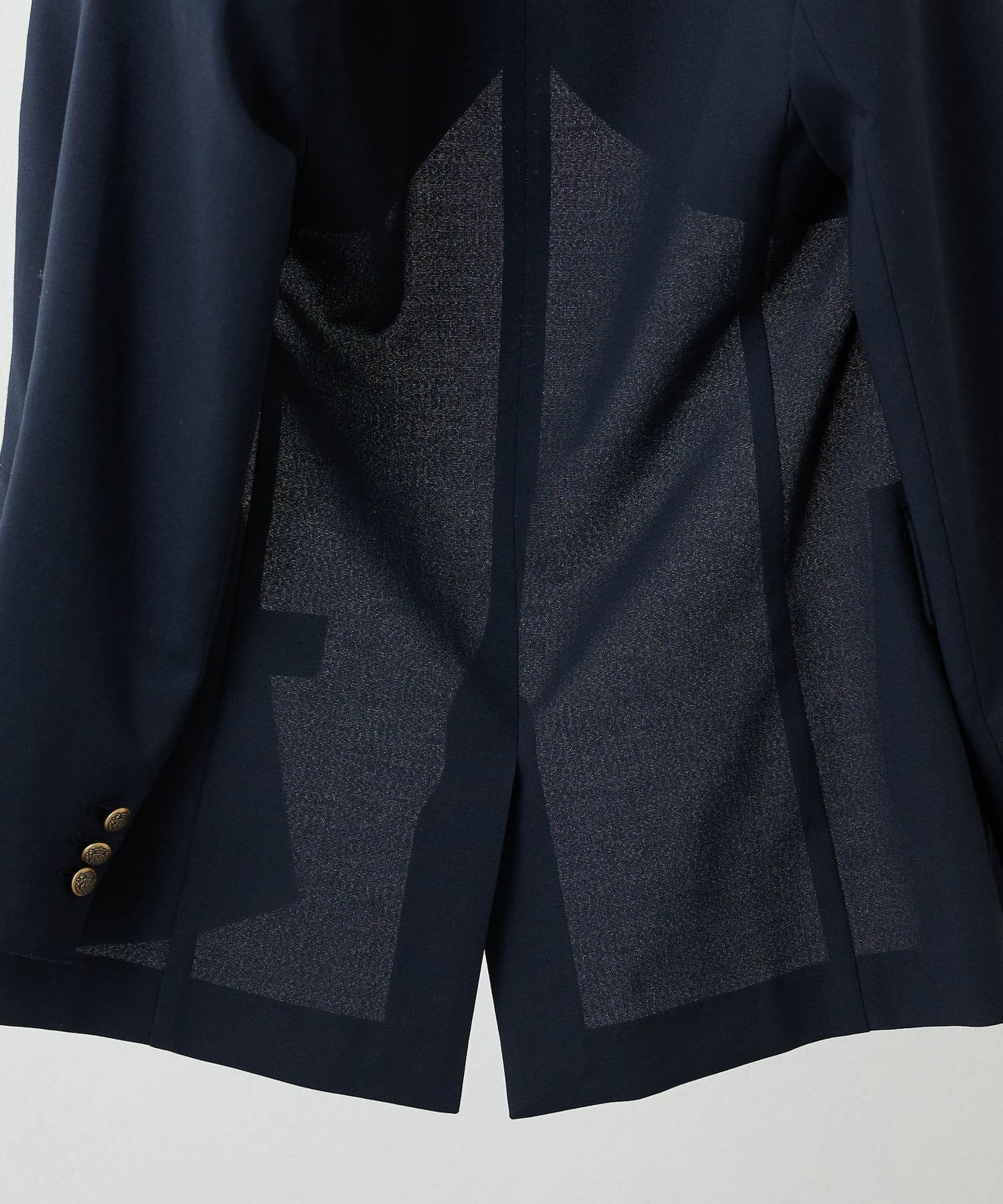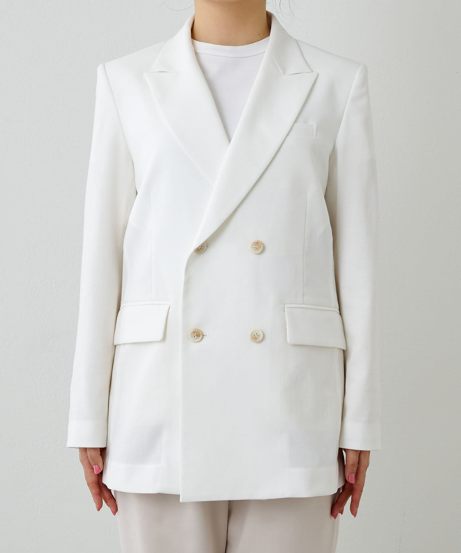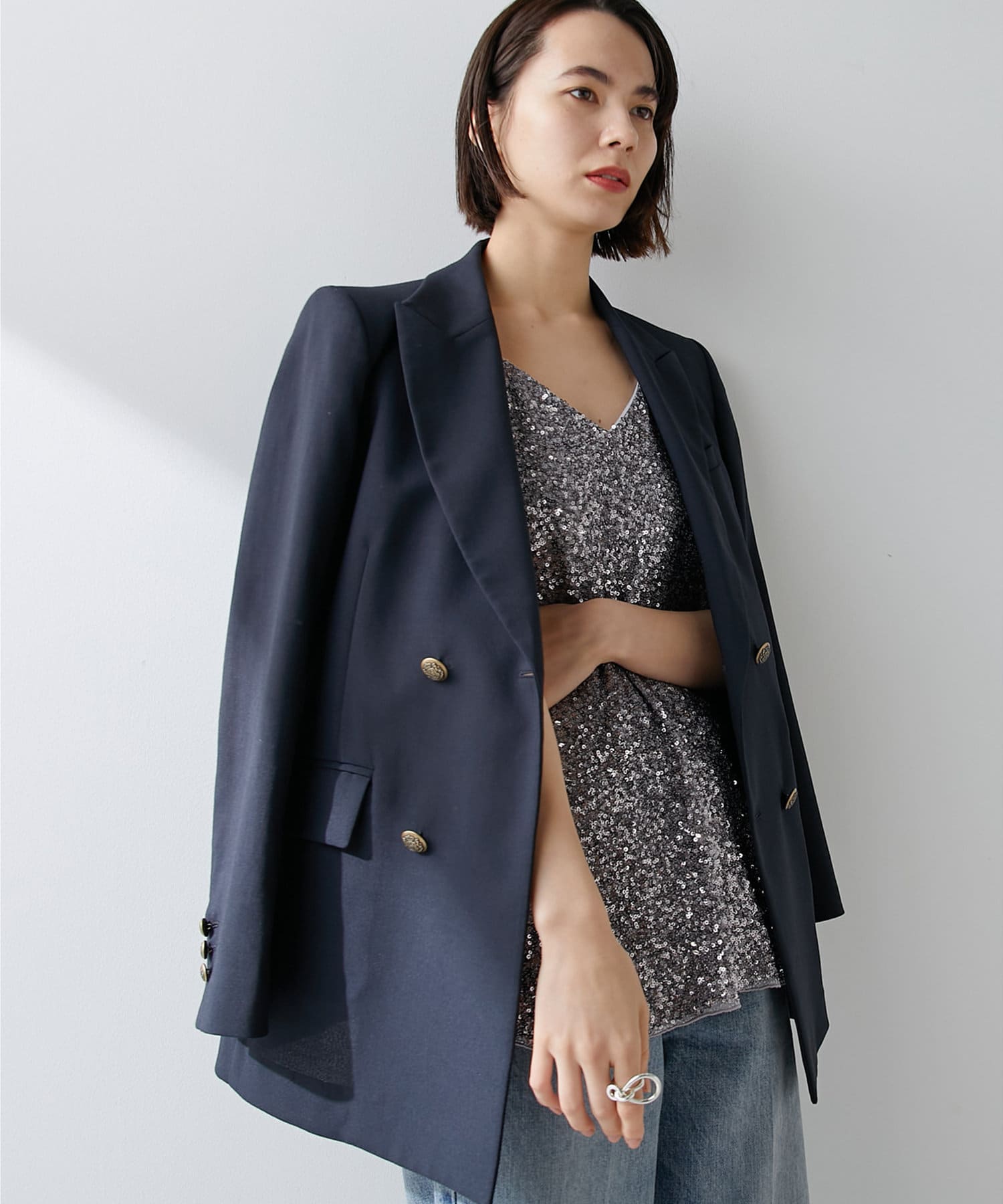 ■さりげない透け感のある素材を使用したダブルブレストジャケット。