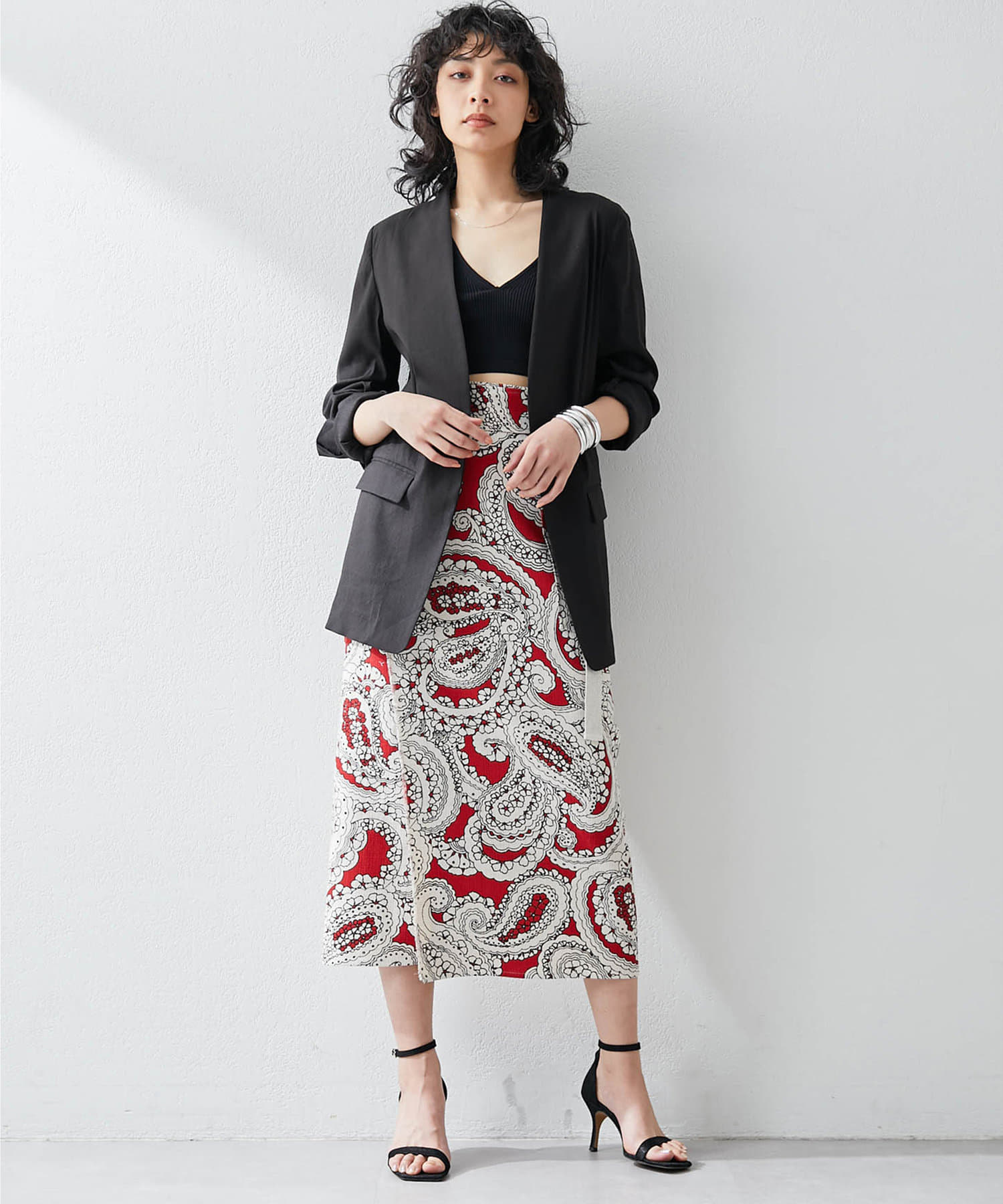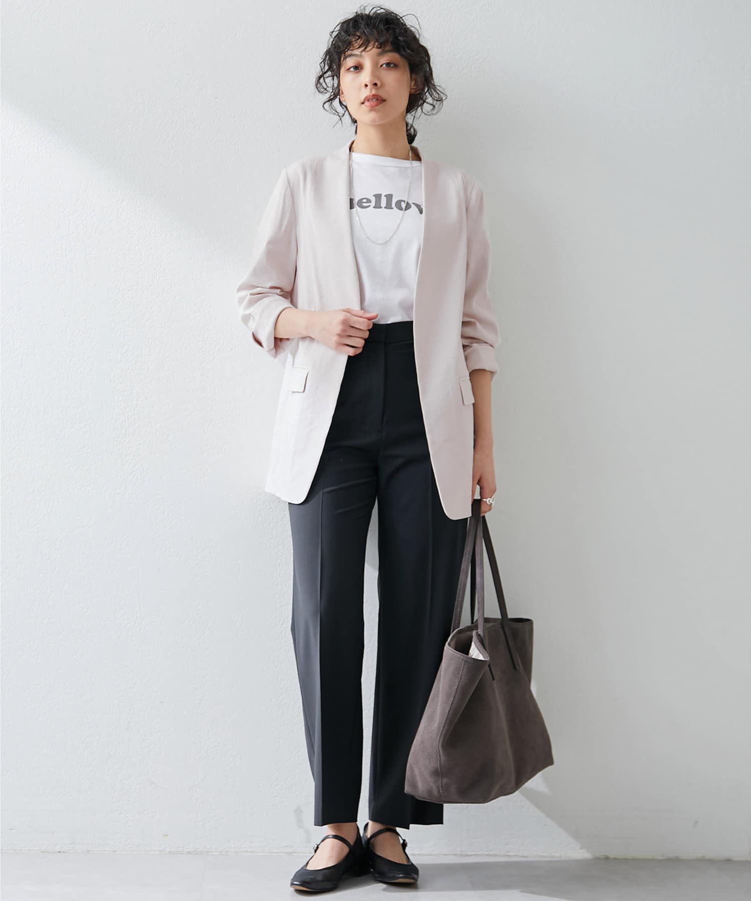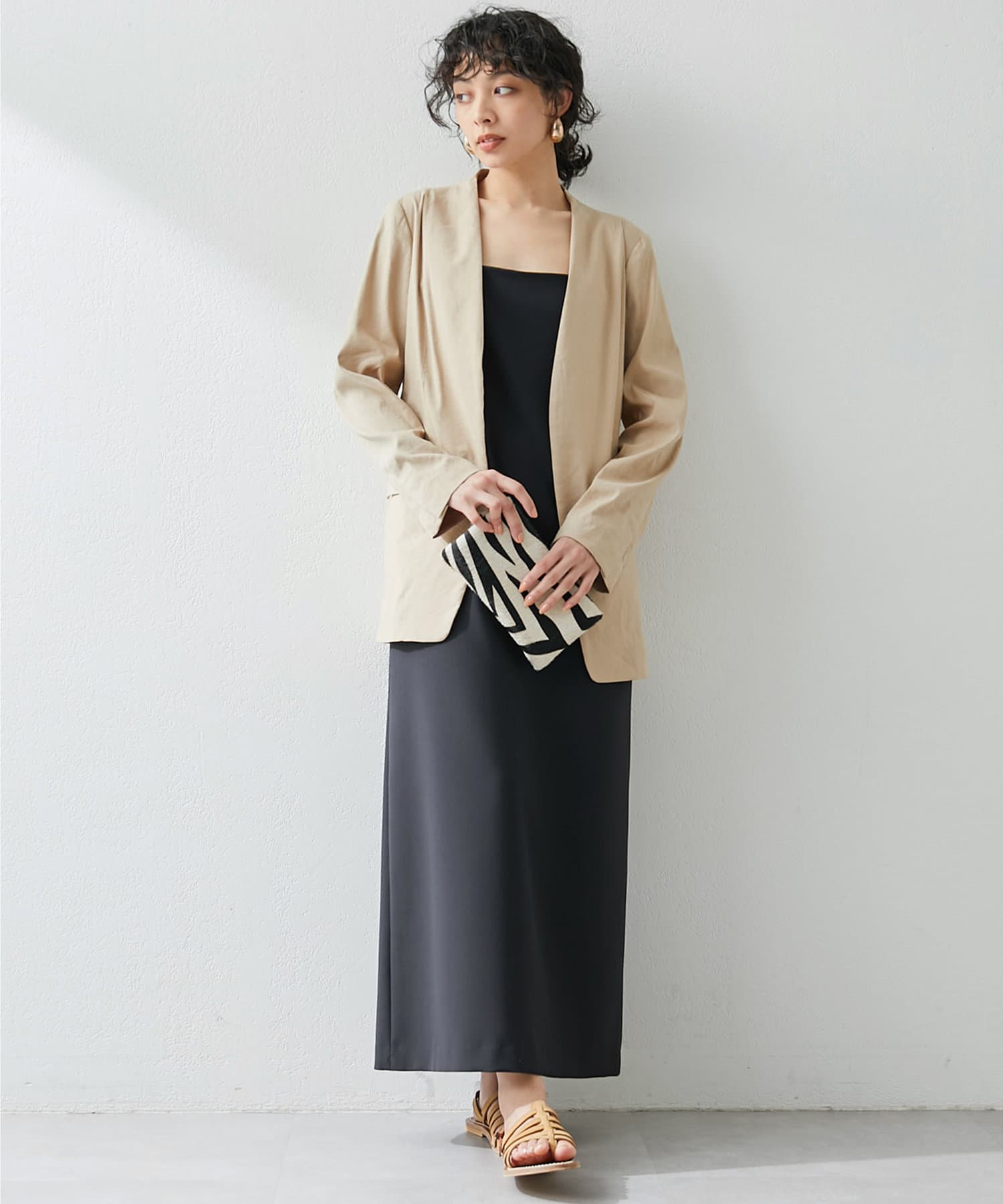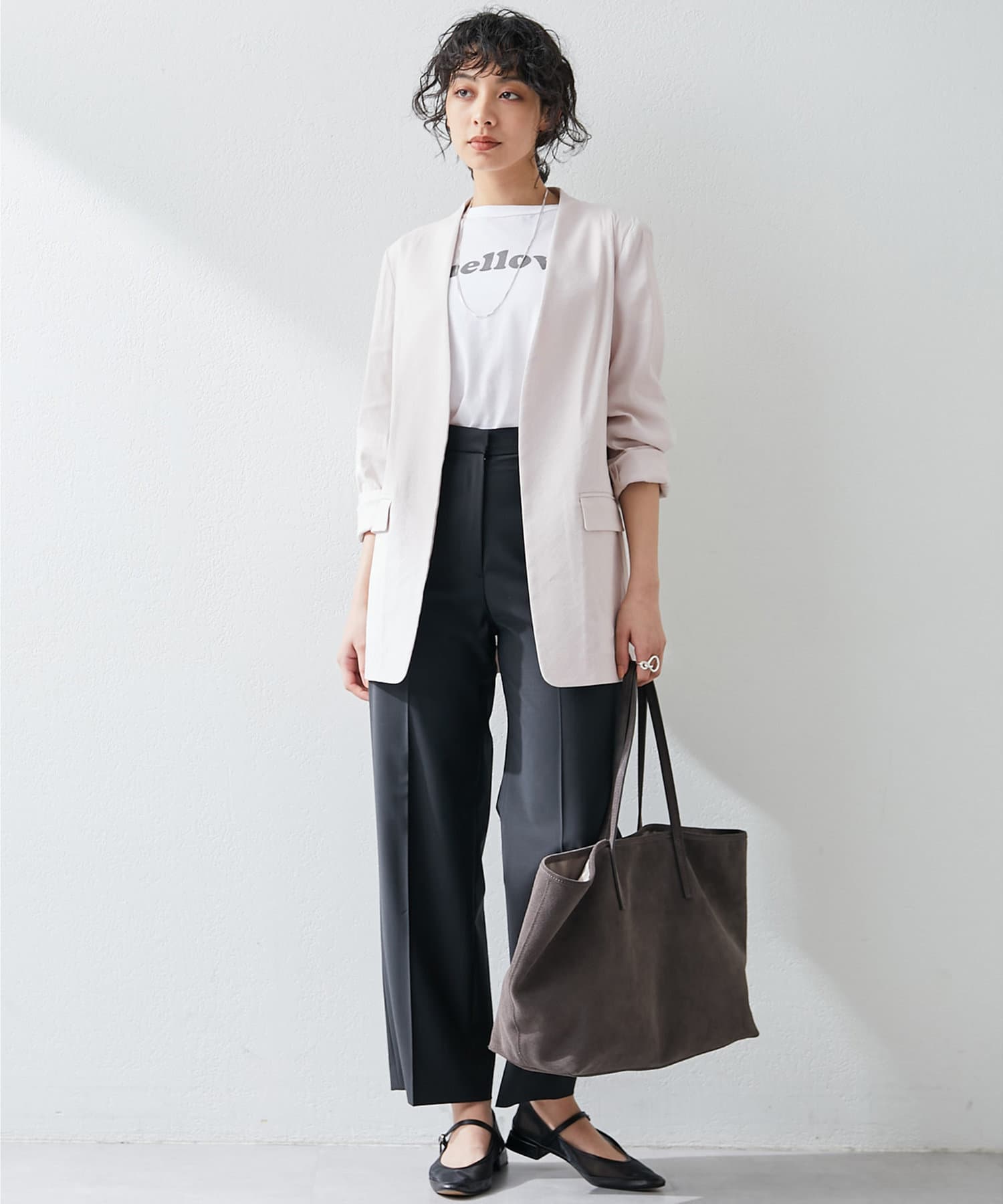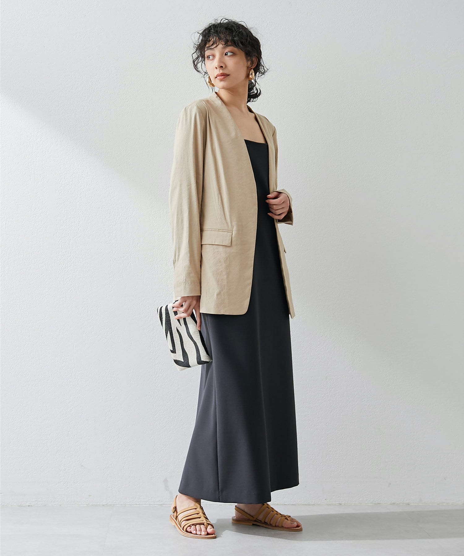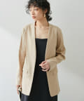 ■ノーカラーがすっきりとした印象のシンプルなジャケット。