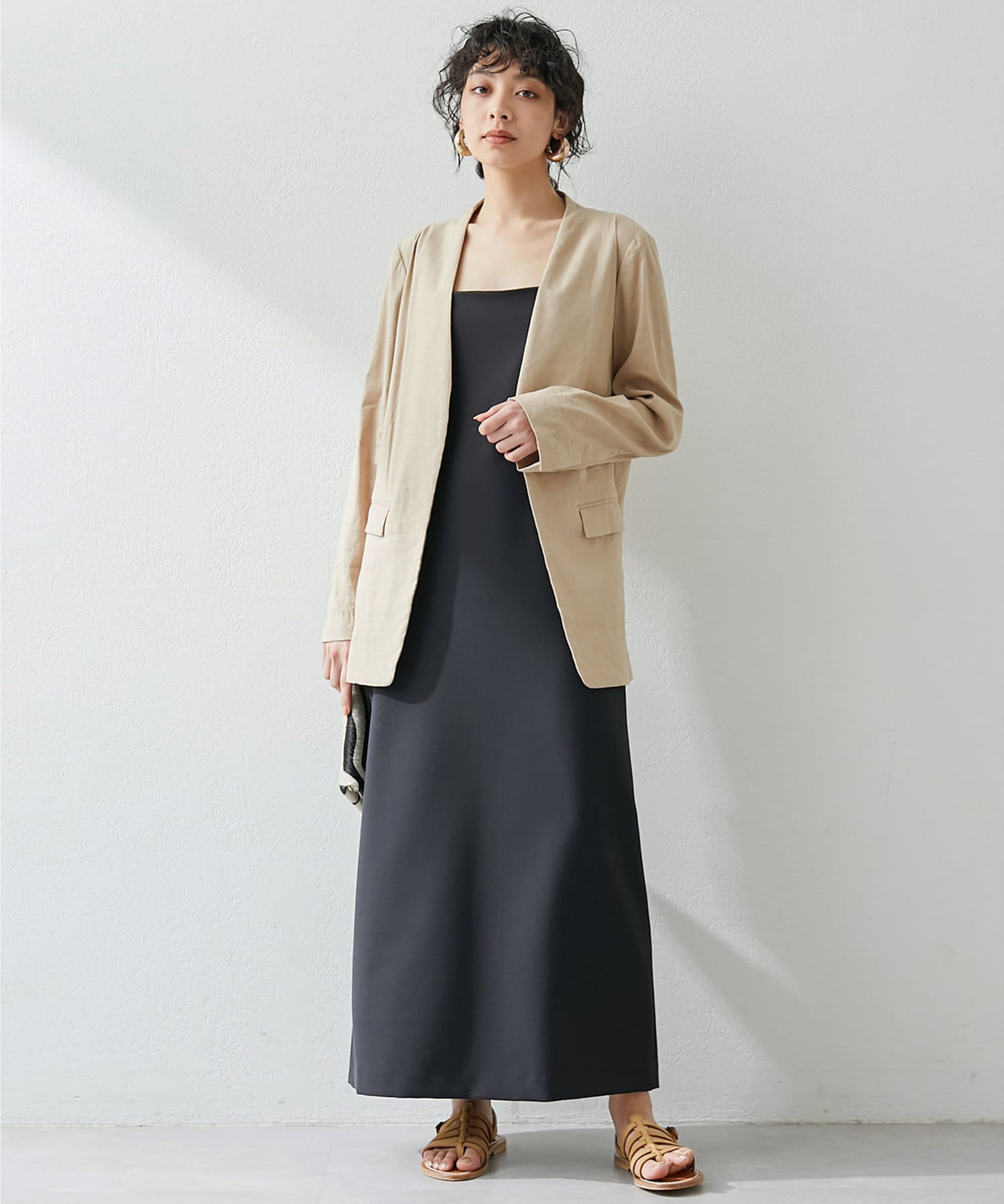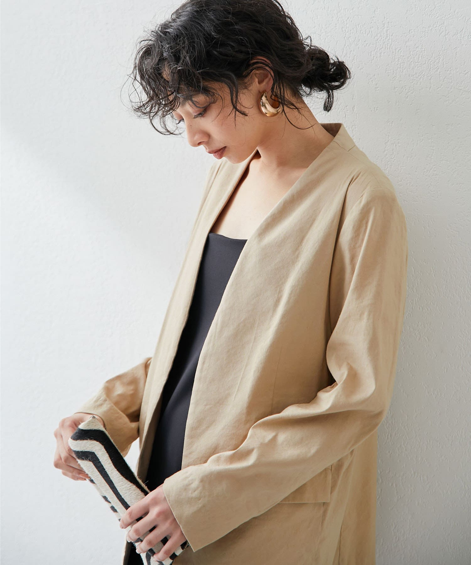 シンプルなノーカラージャケットです。麻素材を使用しておりますが、柔らかくて肌触りが良いです。伸縮性もあるのでさらっと羽織れます。