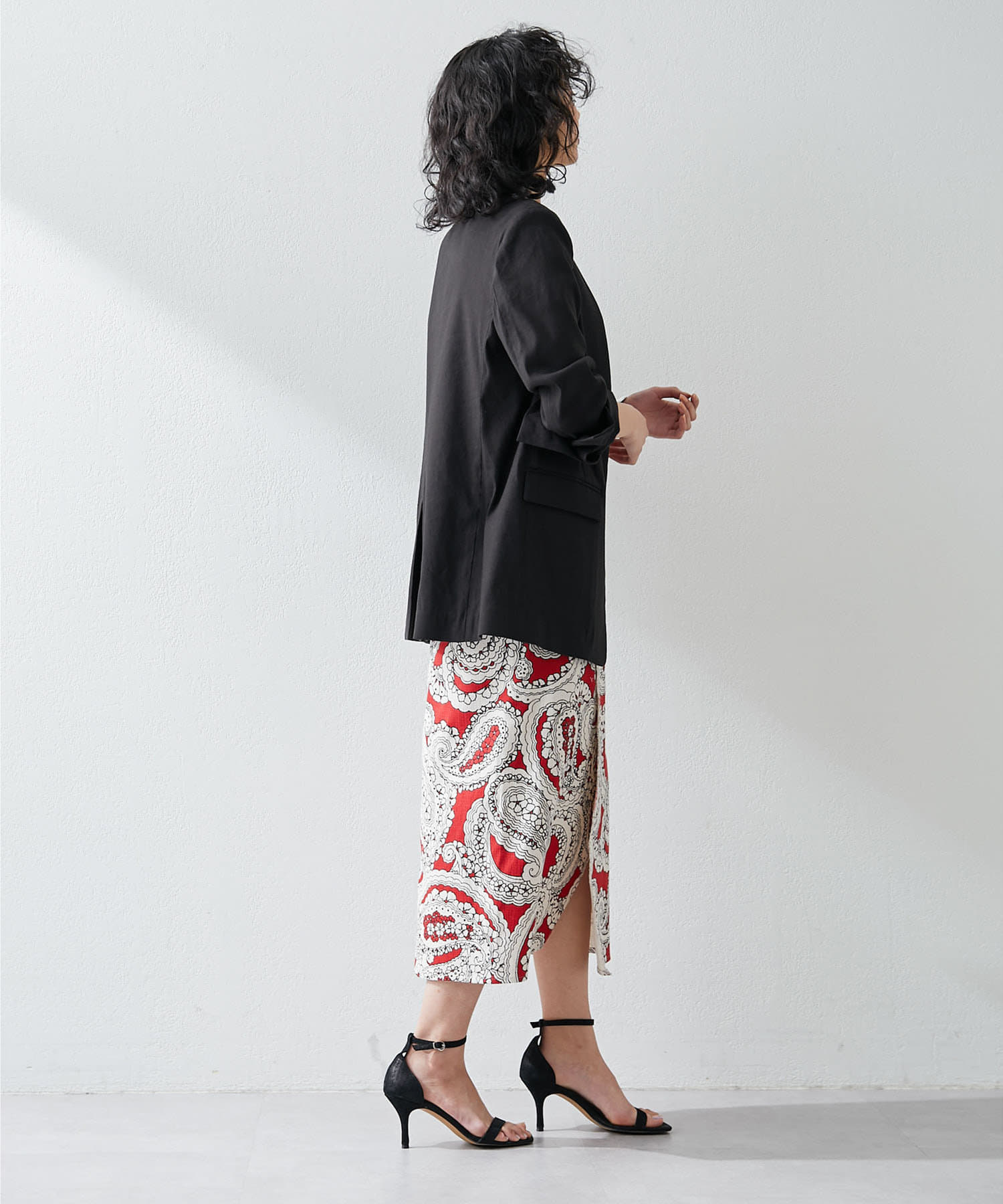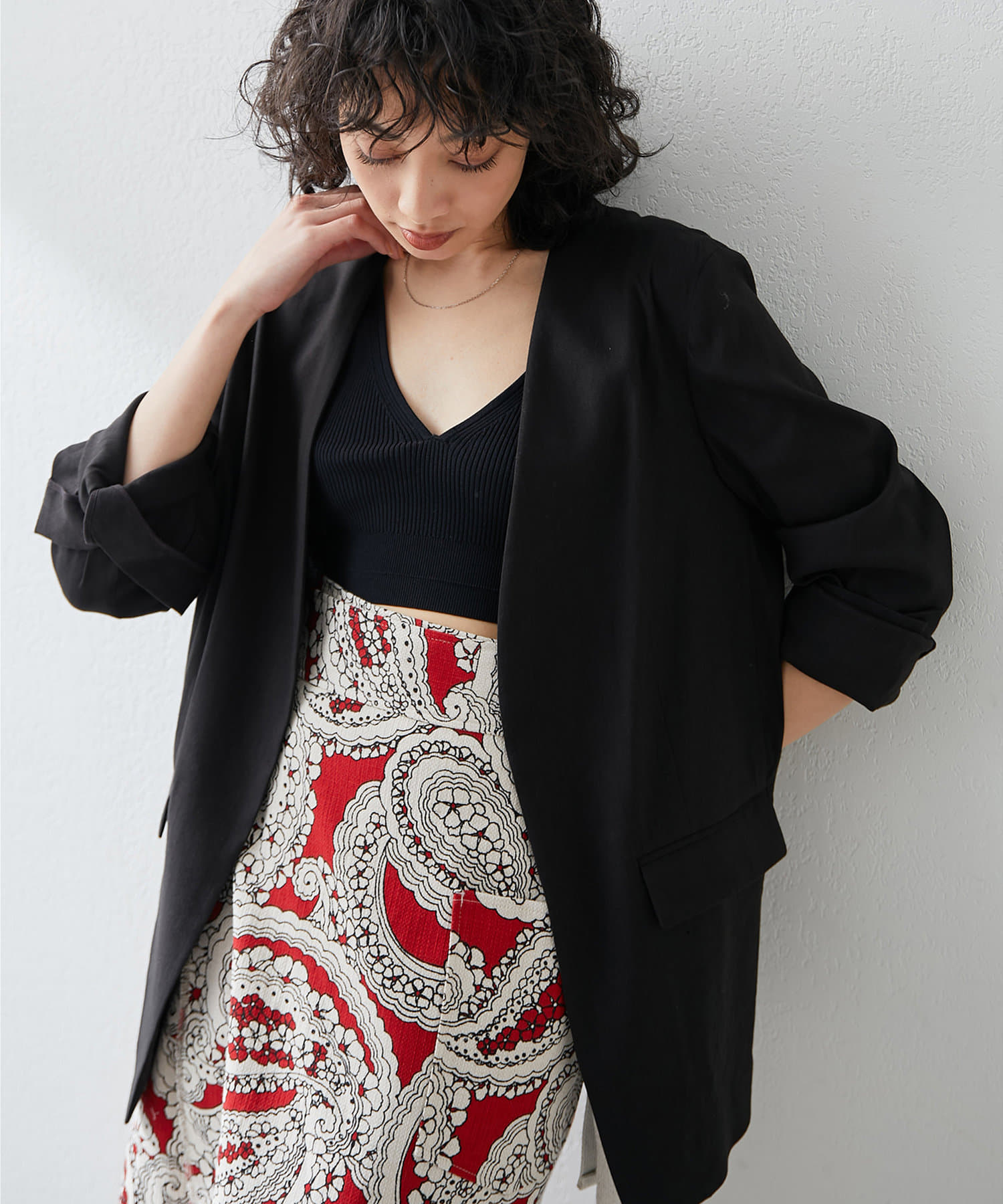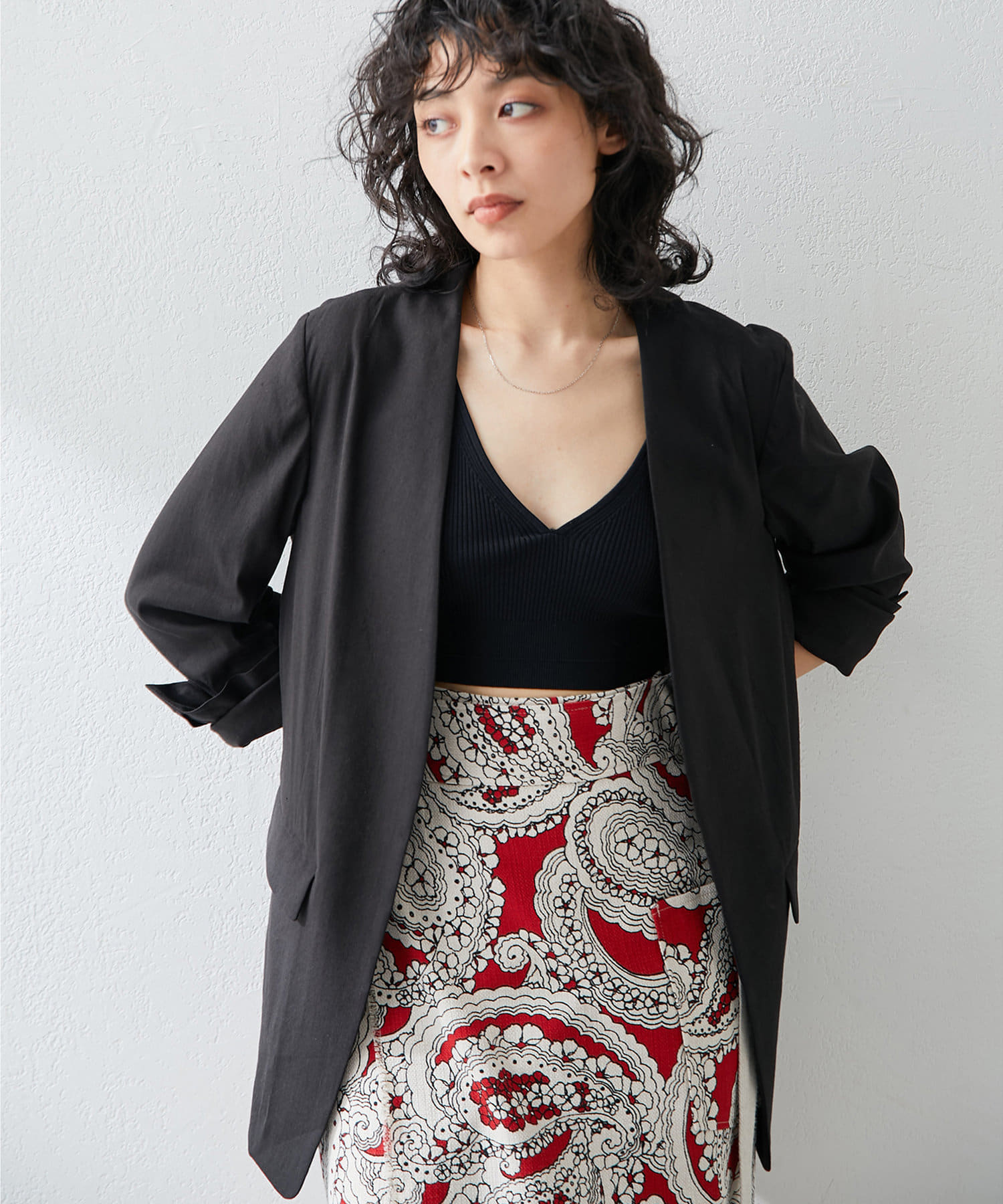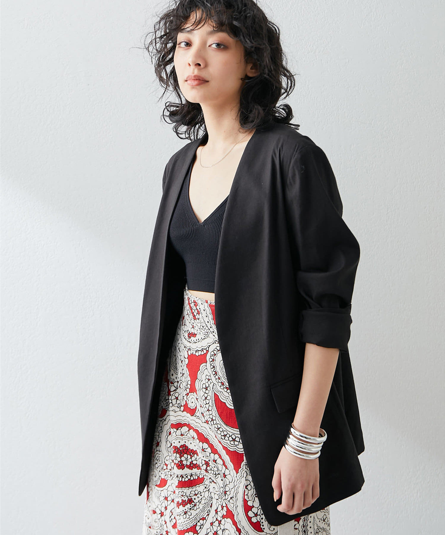 ■裏地がないため袖をたくしあげても様になり、カーディガン感覚で気軽に使える抜け感ジャケット。