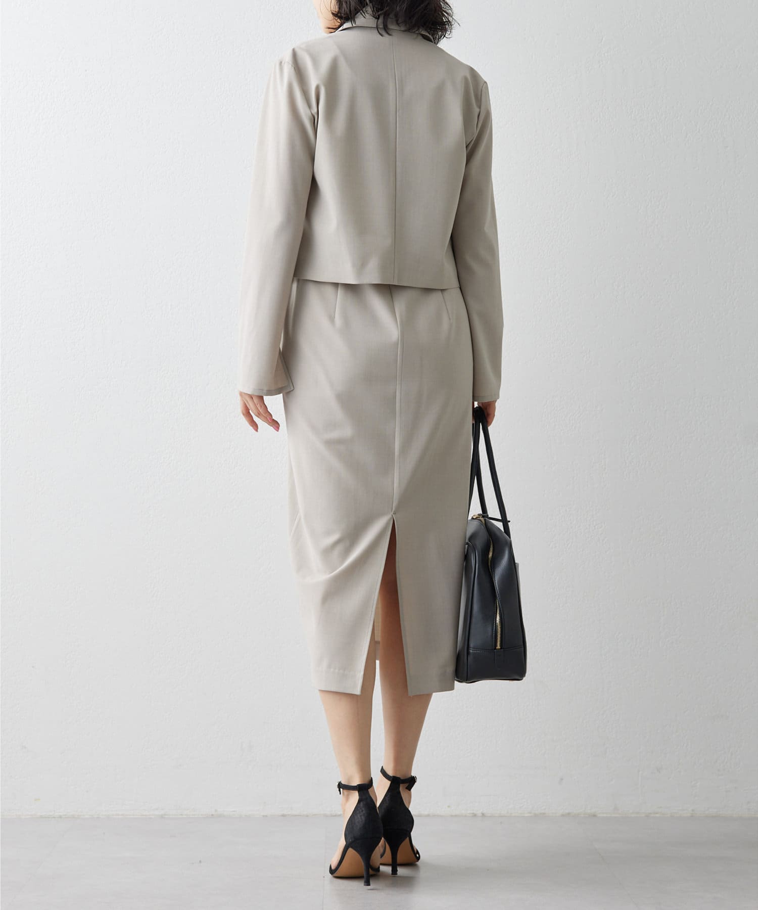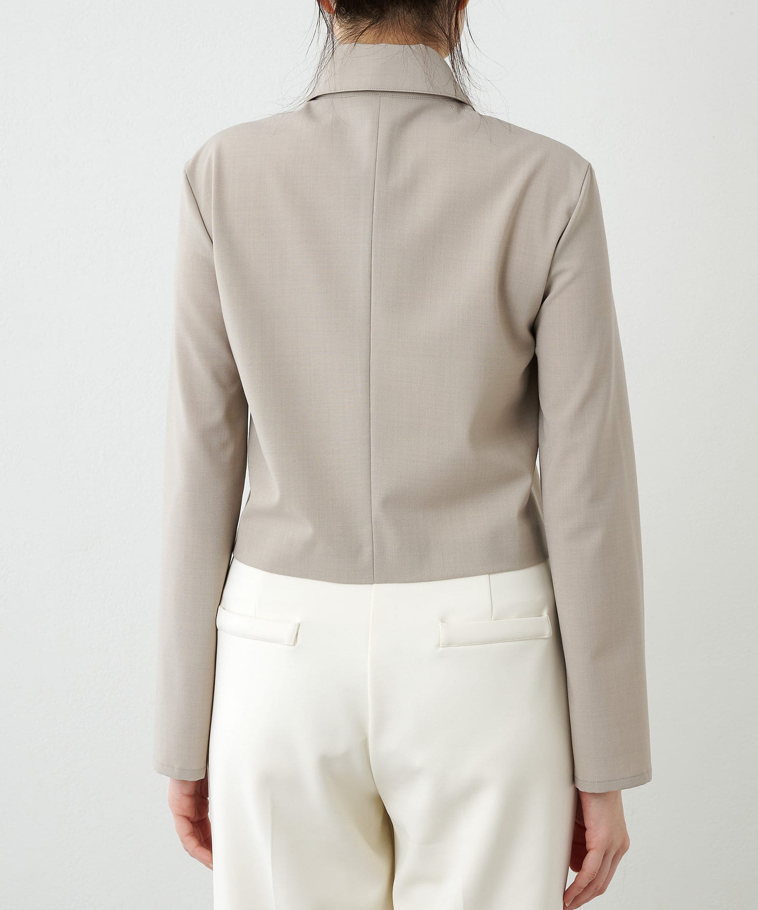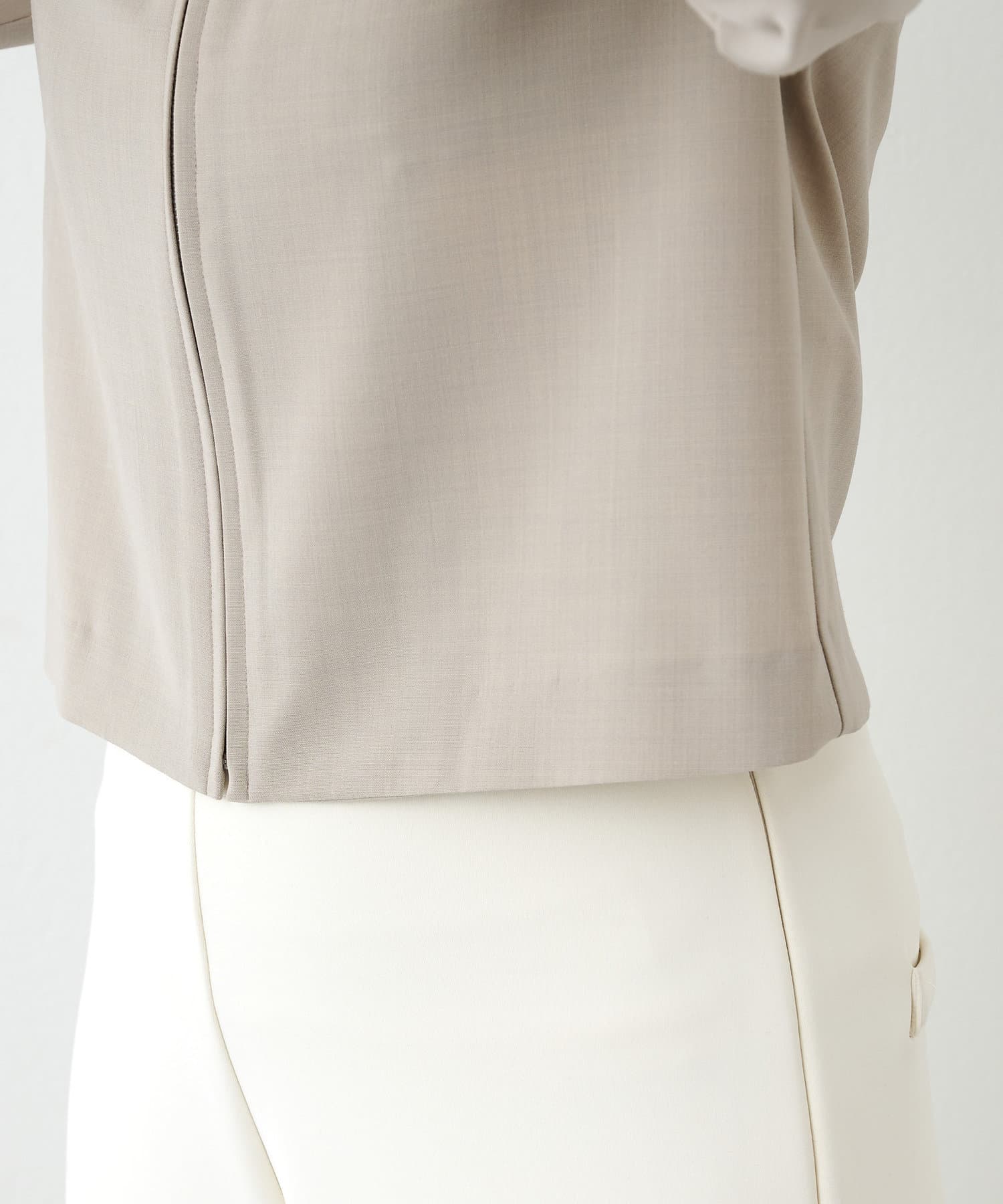ショート丈が差をつける大人ジャケット。上質な素材感で、上品さがあります。スッキリとした袖のシルエットに袖口のスリットが、コーデに抜けを出してくれます。