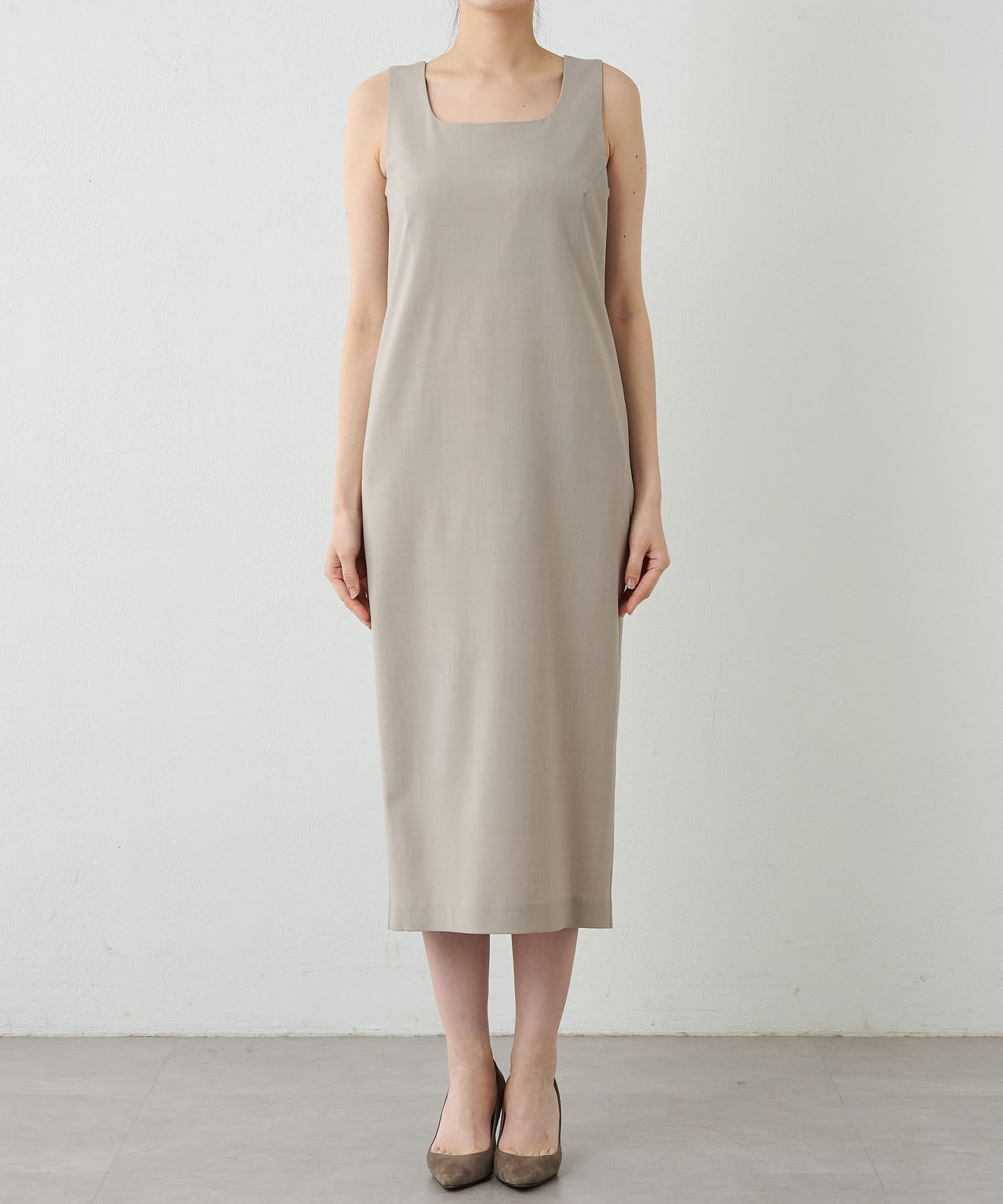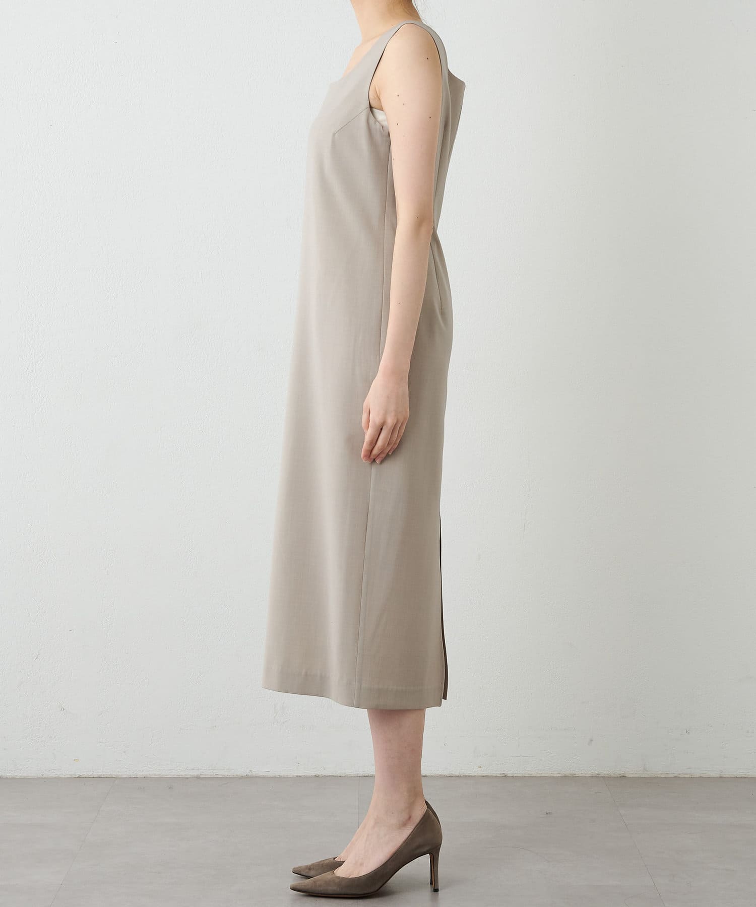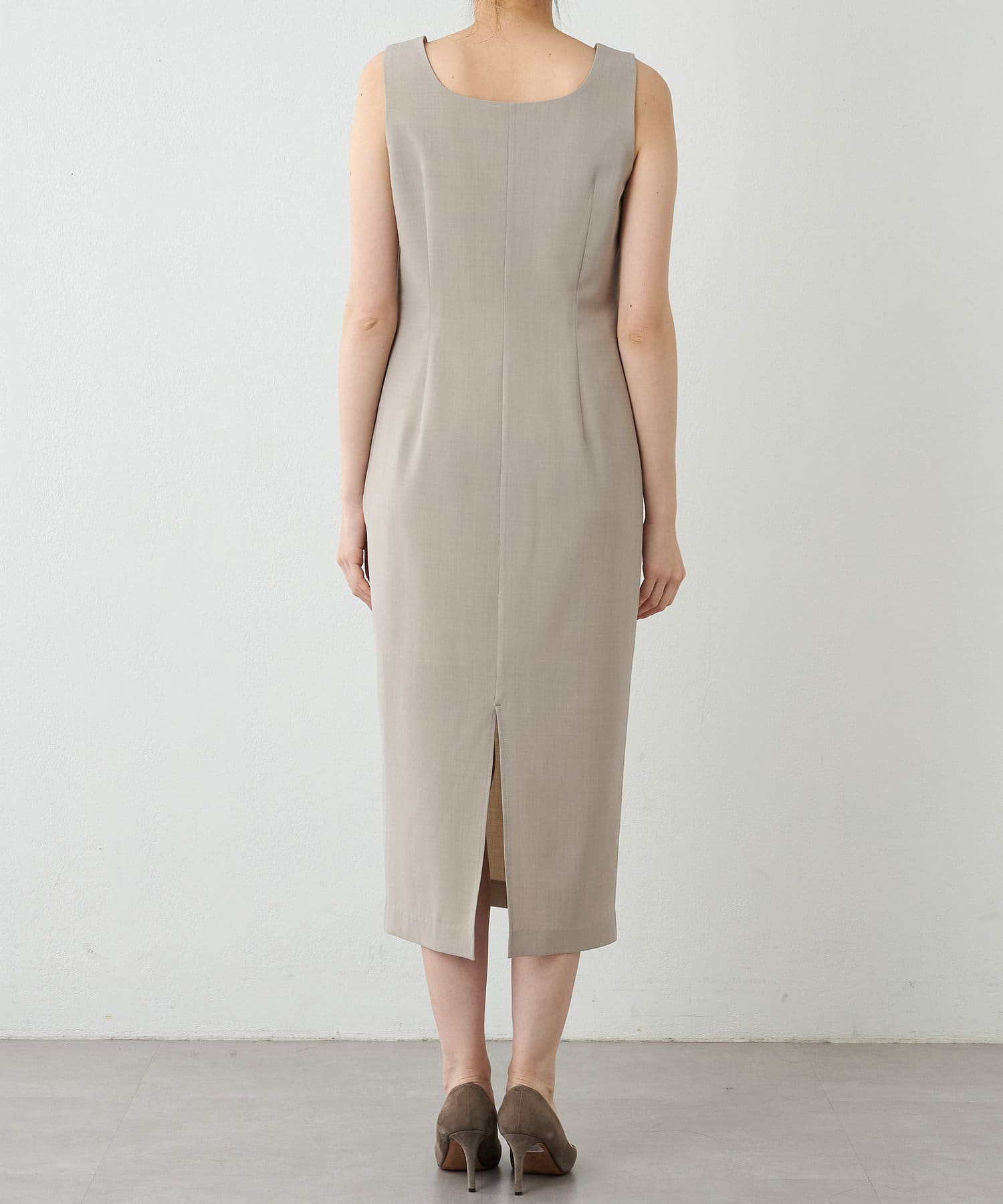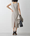 一見シンプルなノースリーブのワンピースですがネックがスクエアになっていたり、深めのバッグスリットや少しくびれた背中のラインなどとっても女性らしいポイントが詰まった1着です。サラッとノースリーブ1枚で夏場着てもどこか上品に仕上がります。