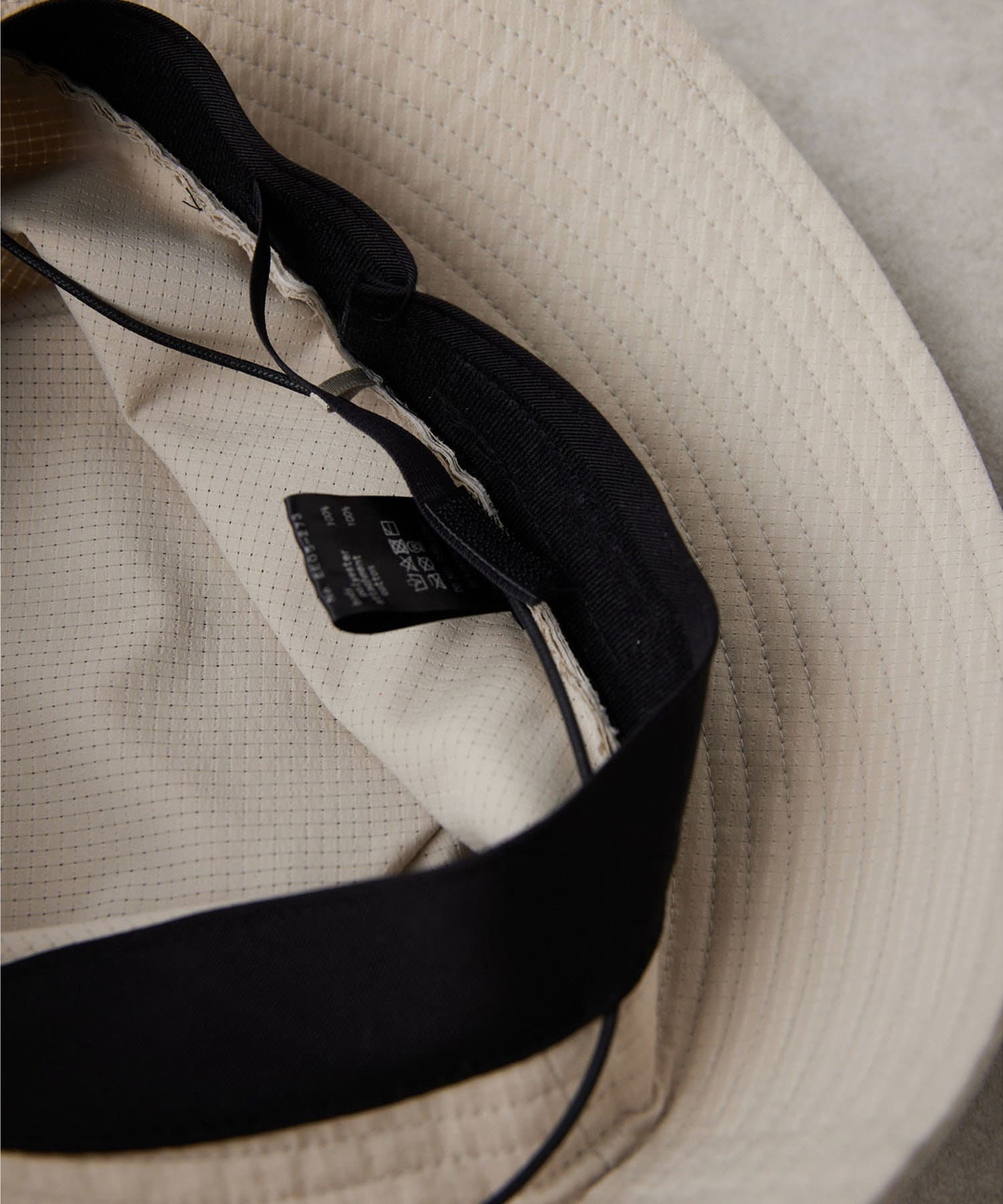 ナイロン素材のコード付きのブレードハット。ツバの後ろが少し長く首元を日差しからしっかりカバーしてくれます。内側がメッシュ生地になっているので夏場も蒸れず快適です。