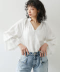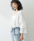 フロントの刺繍デザインと袖のフリルがポイントになるブラウス。ガーゼのようなラフな素材感なので華やかなデザインでもお休みの日に着やすいと思いました!太めなボトムにはインした方が全体的にすっきりと見え、より袖のデザインが目立つため素敵です。
