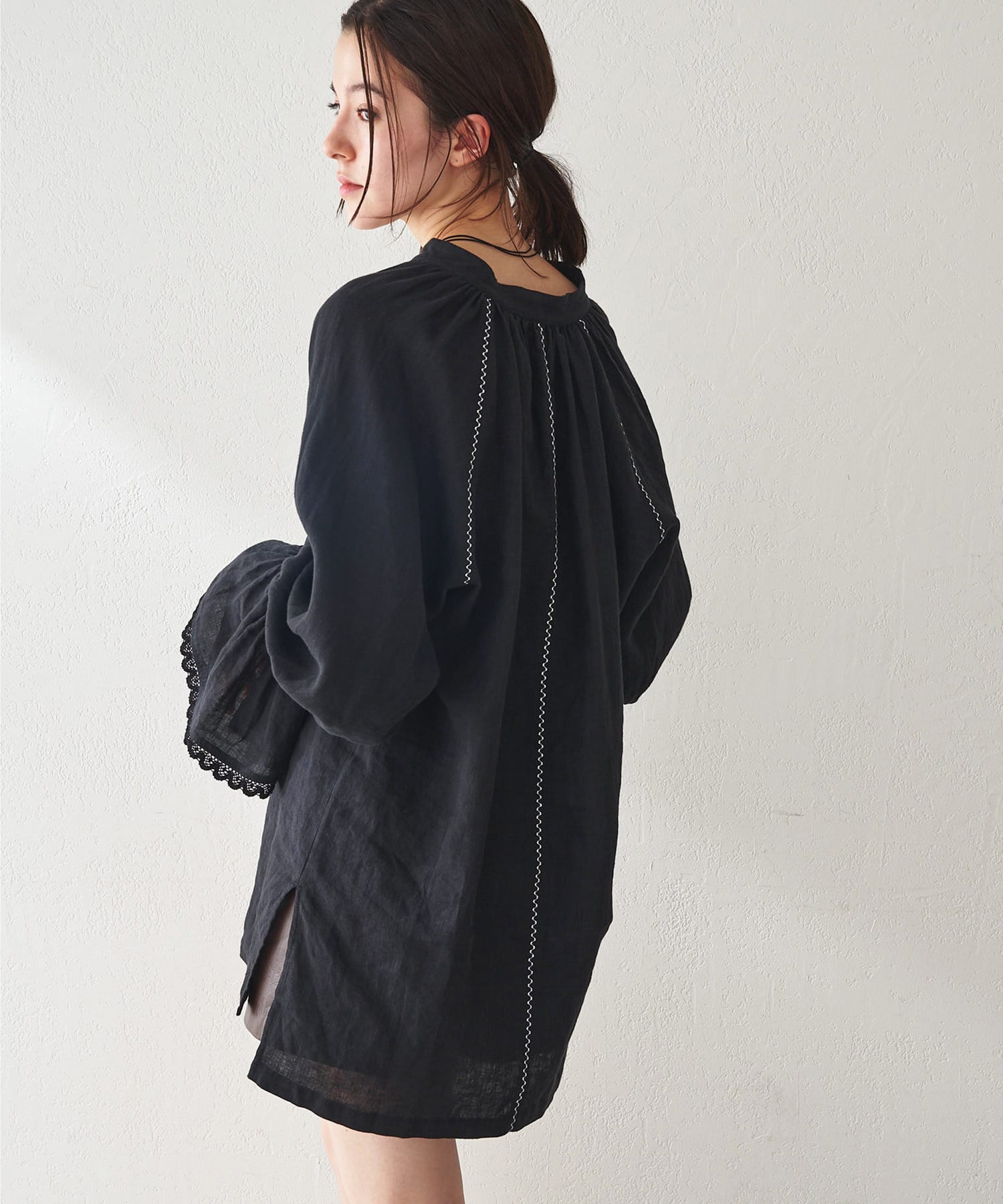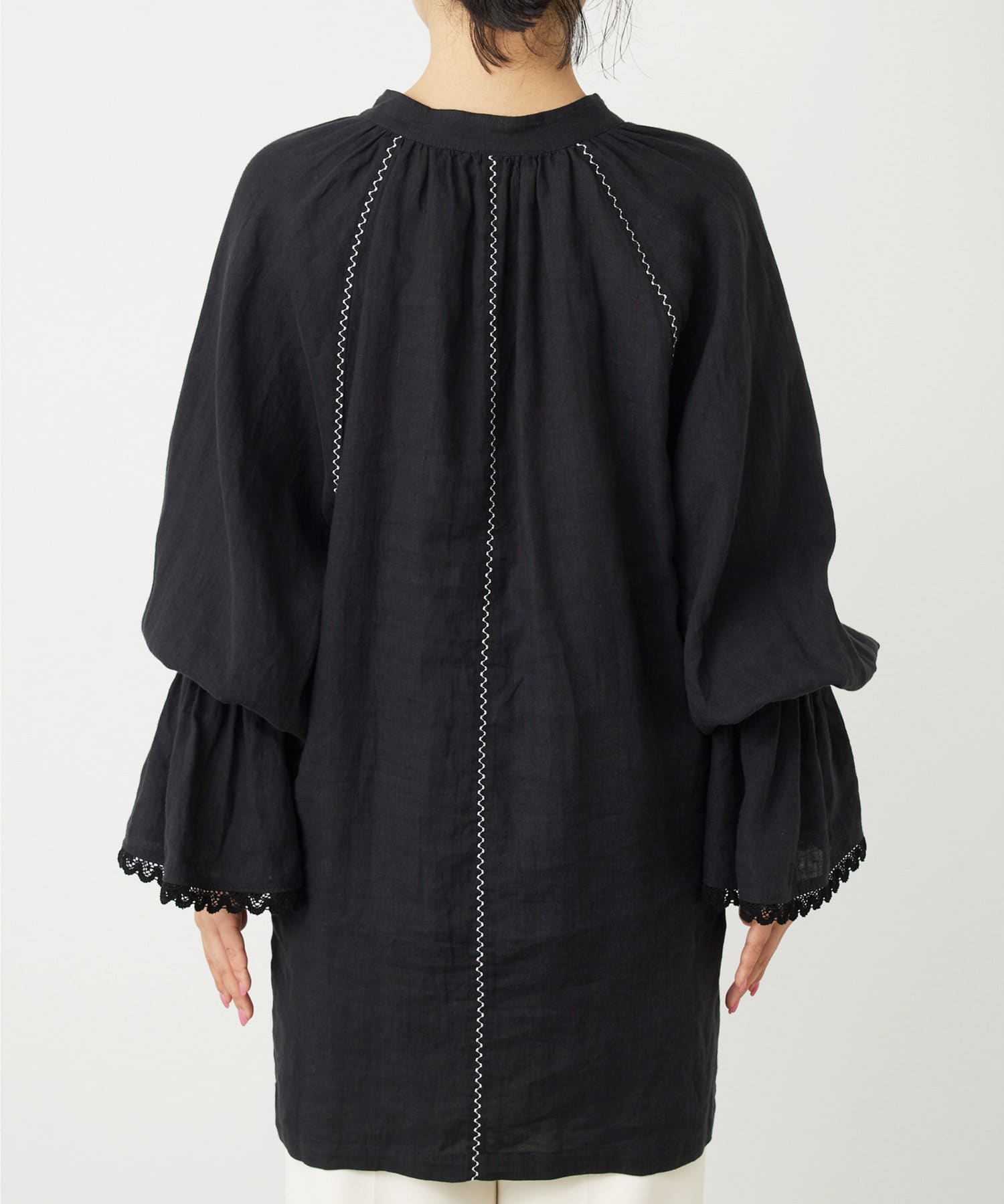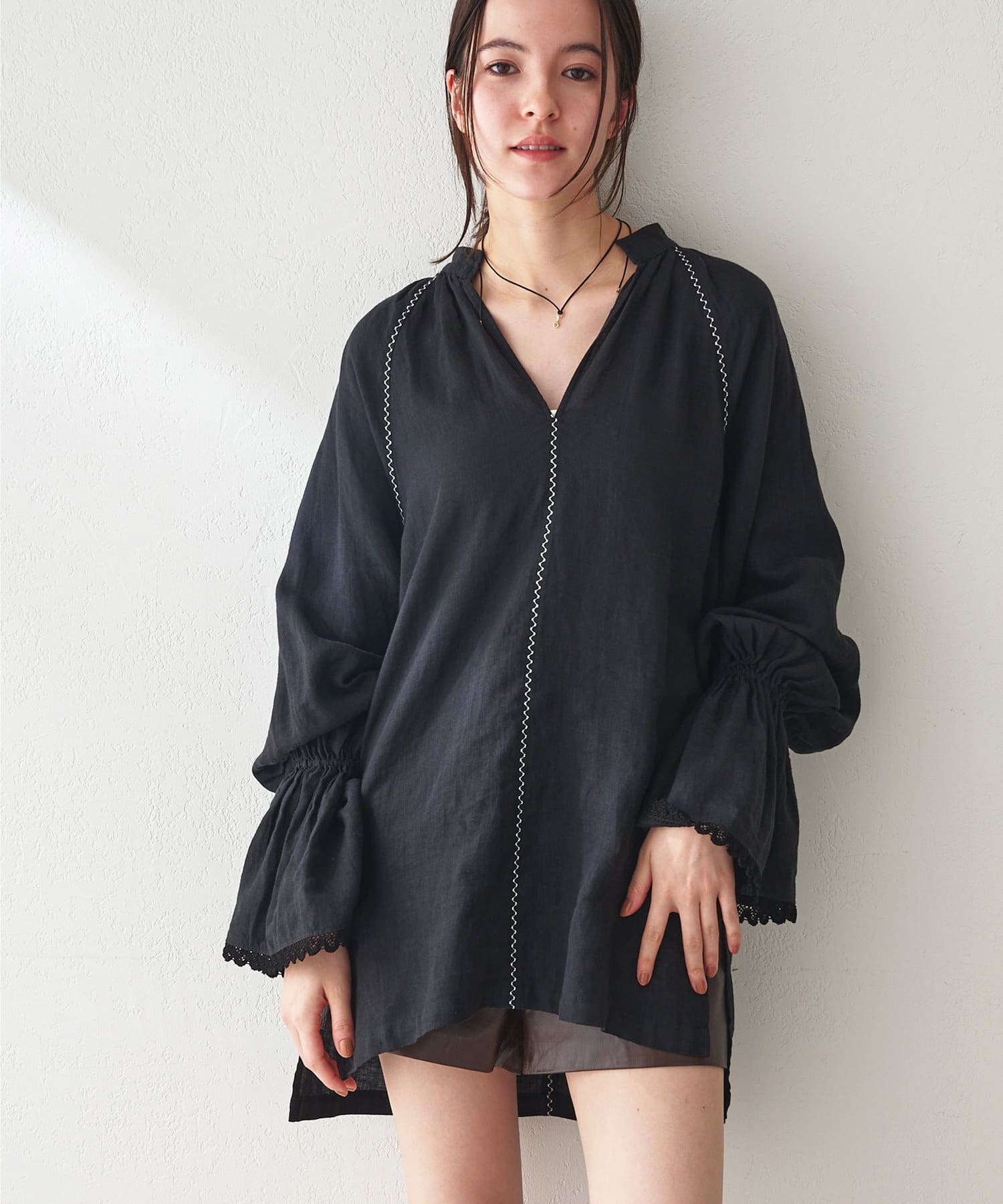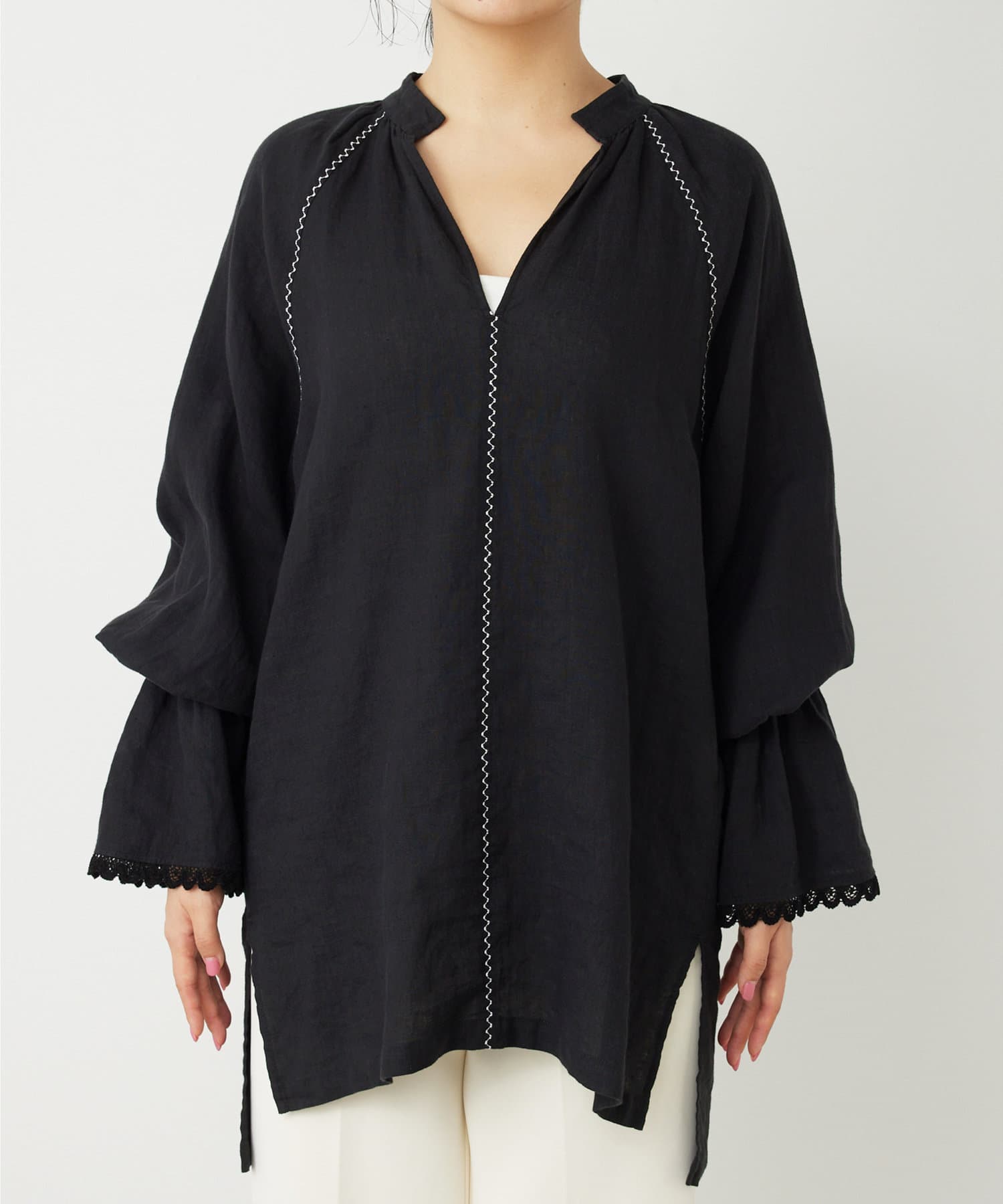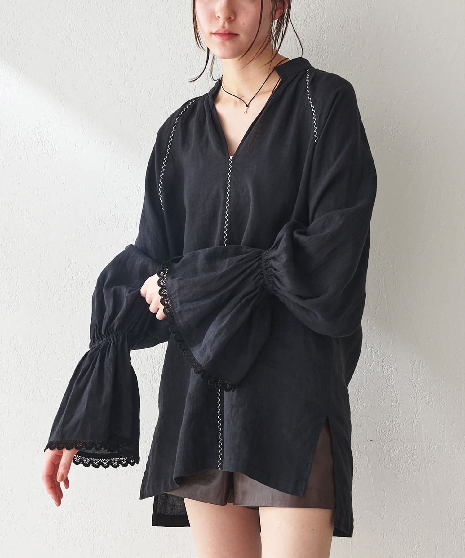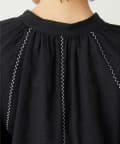 ■細やかな刺繍がアクセントになったチュニック丈のブラウス。