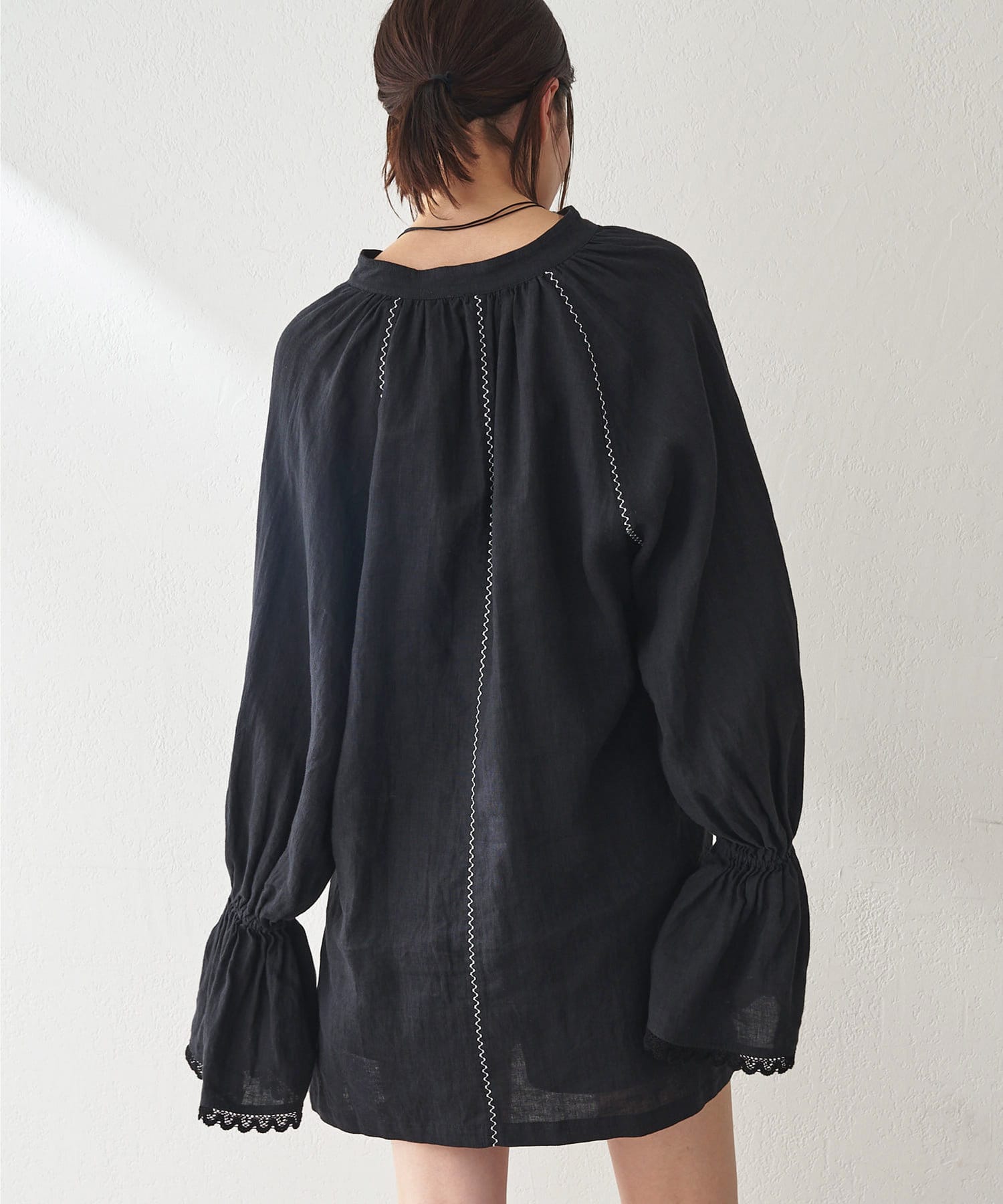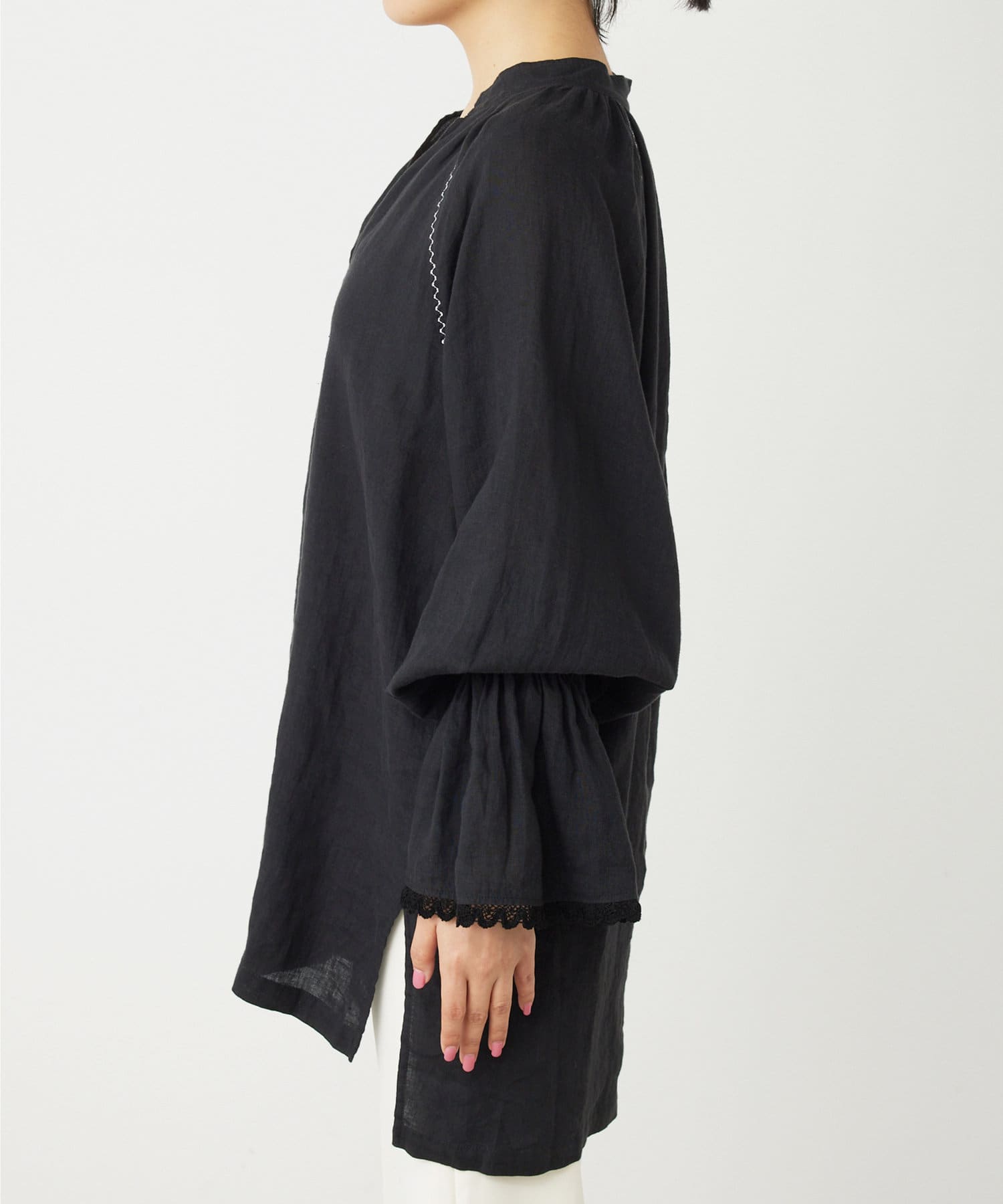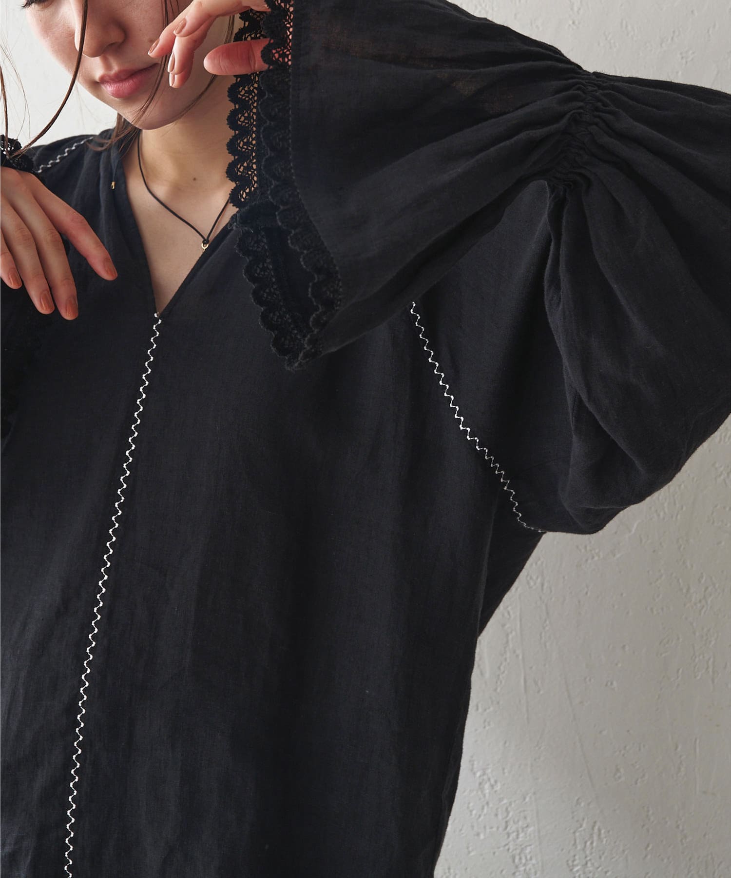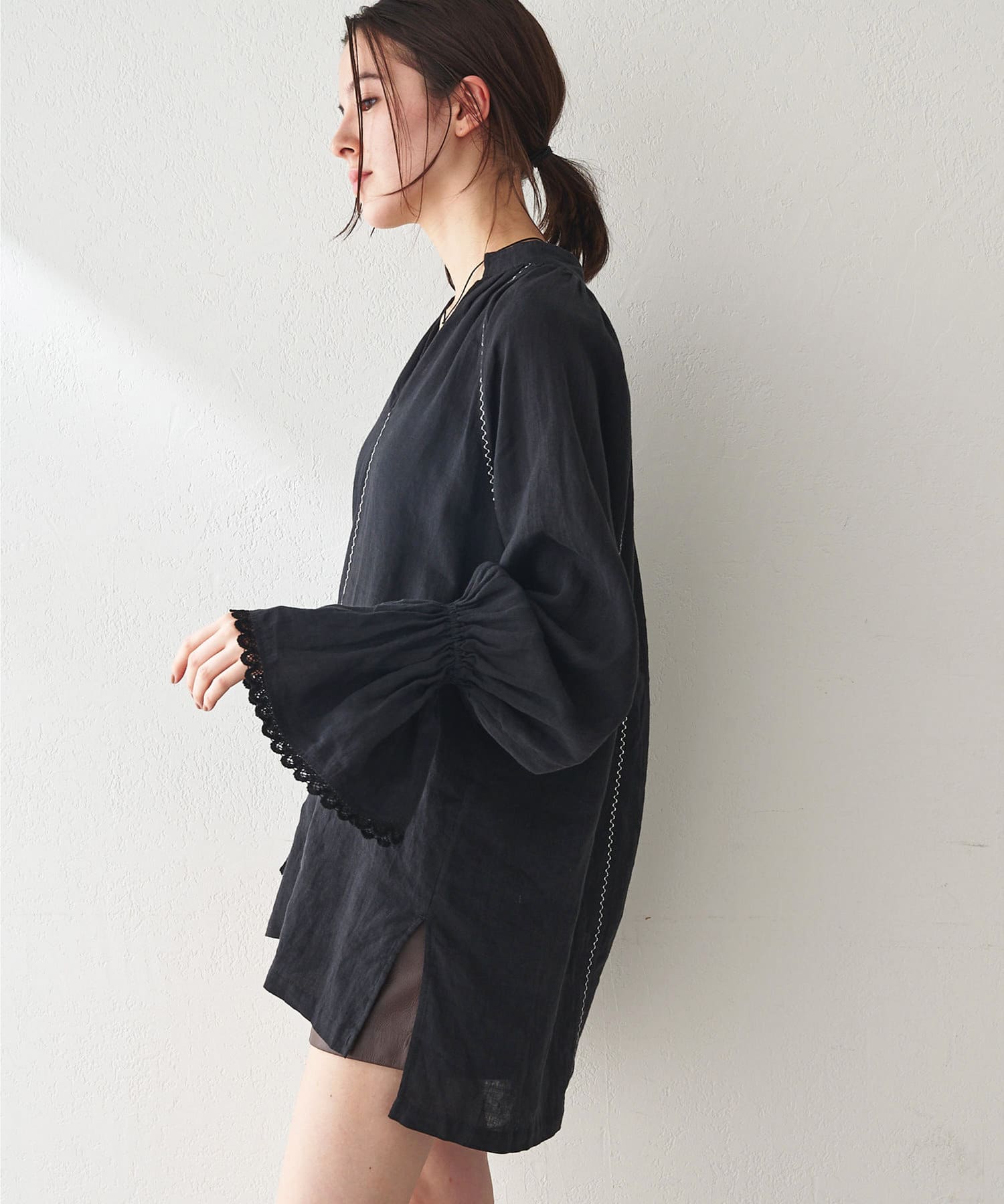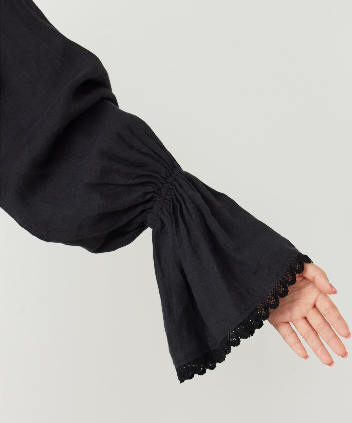 ■ギャザーを入れたキャンディスリーブ+袖口の端にレースをあしらいフェミニンな印象に。