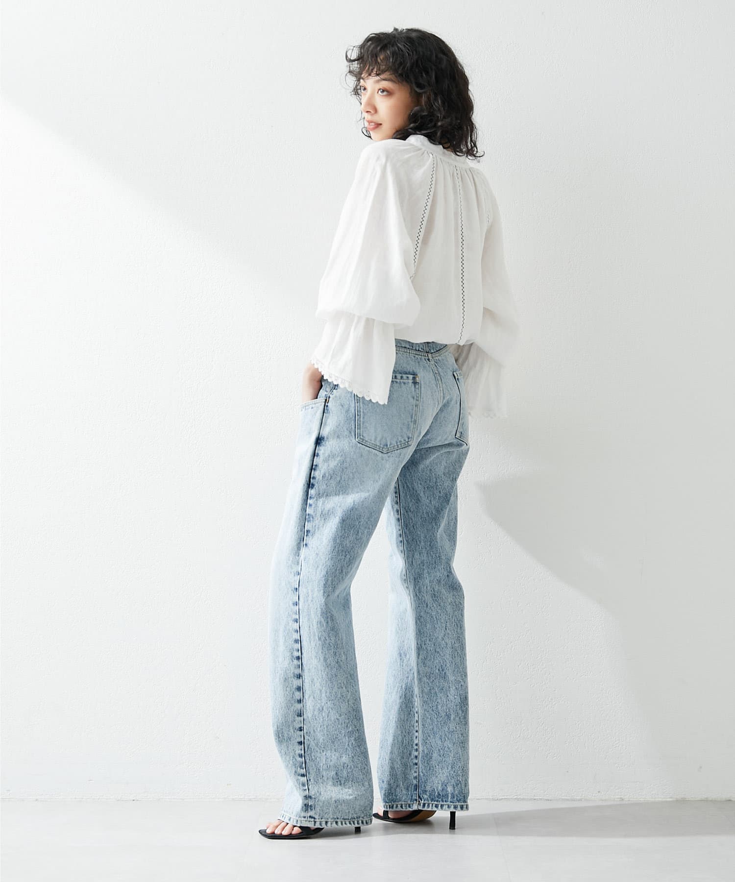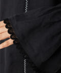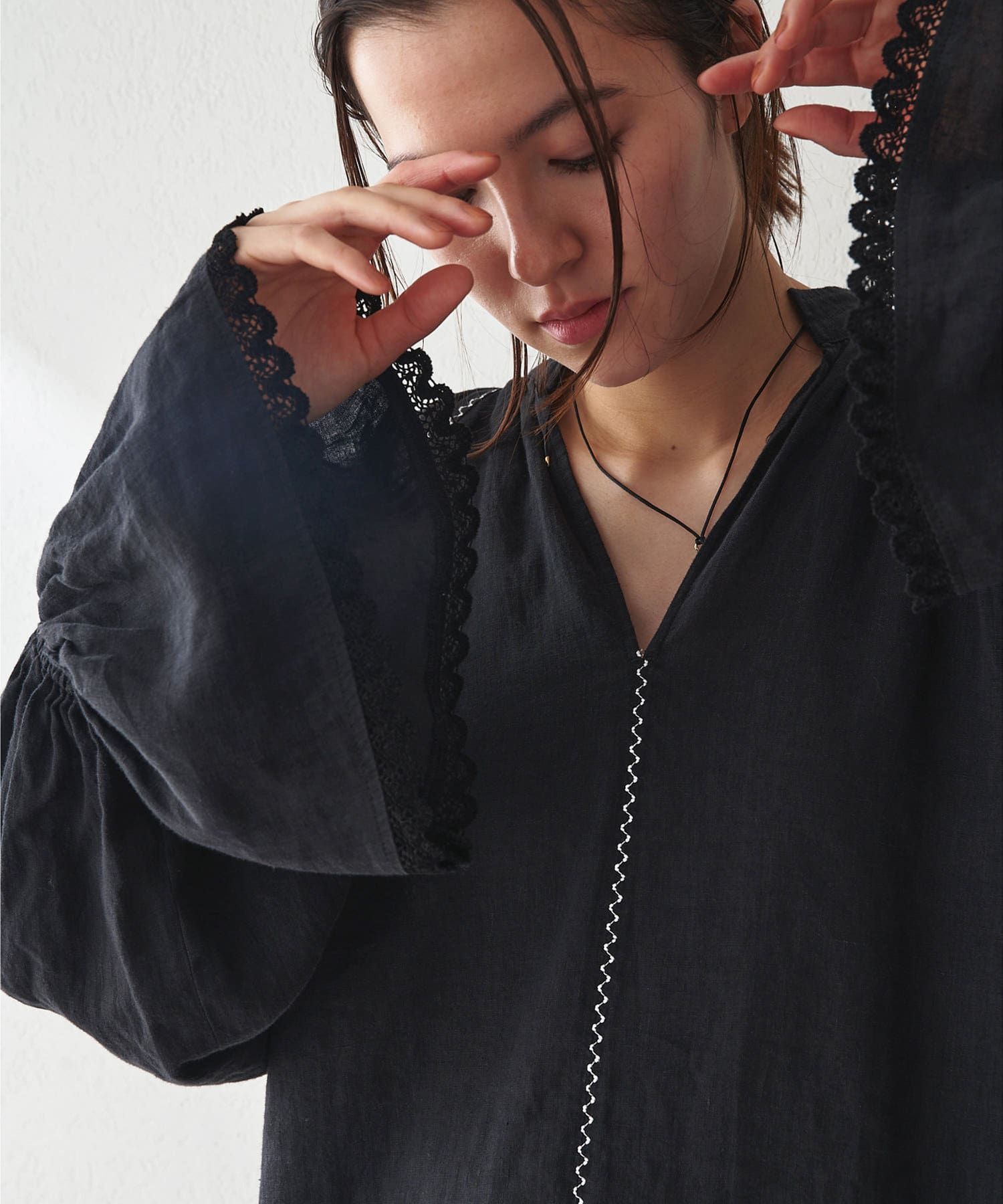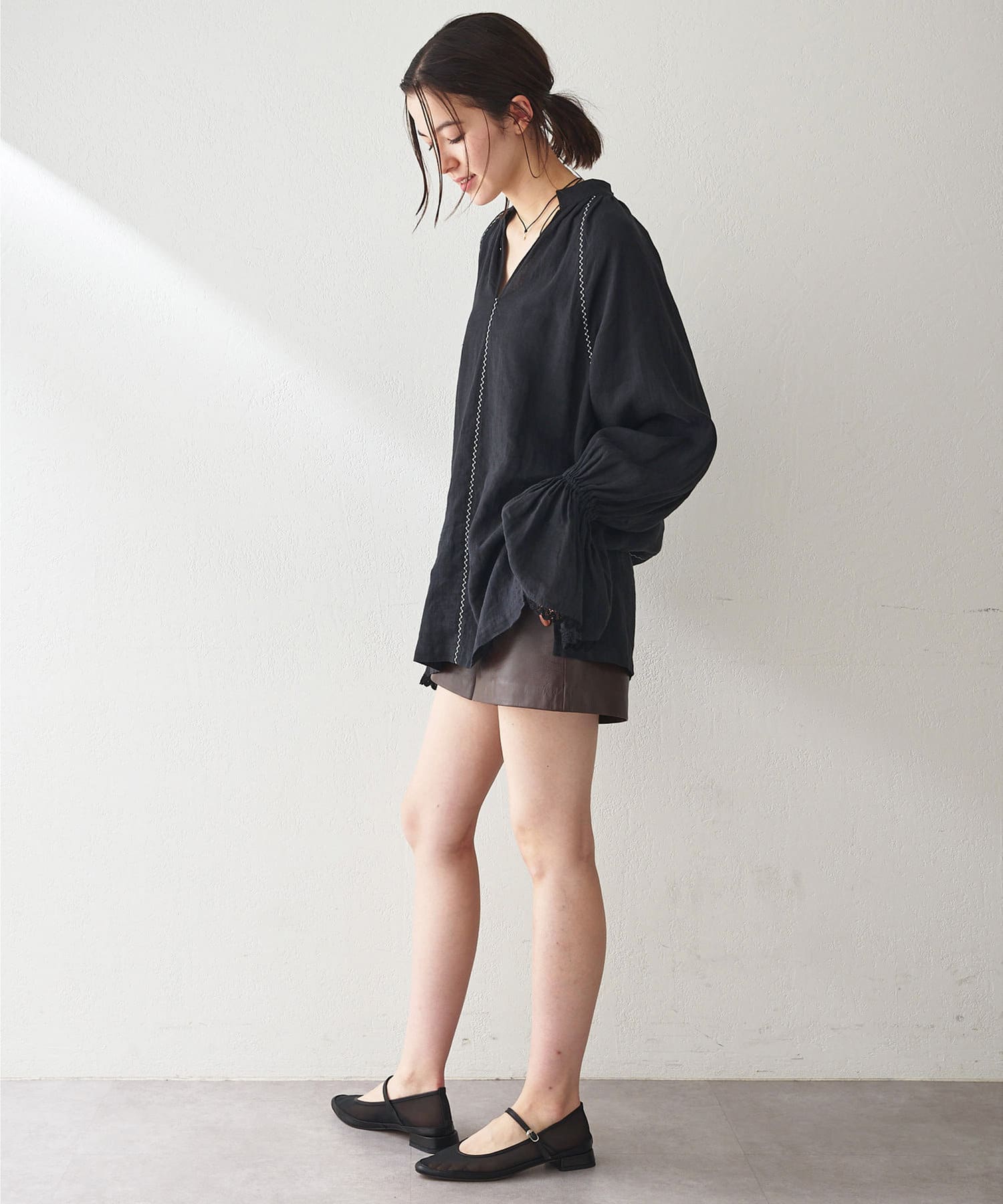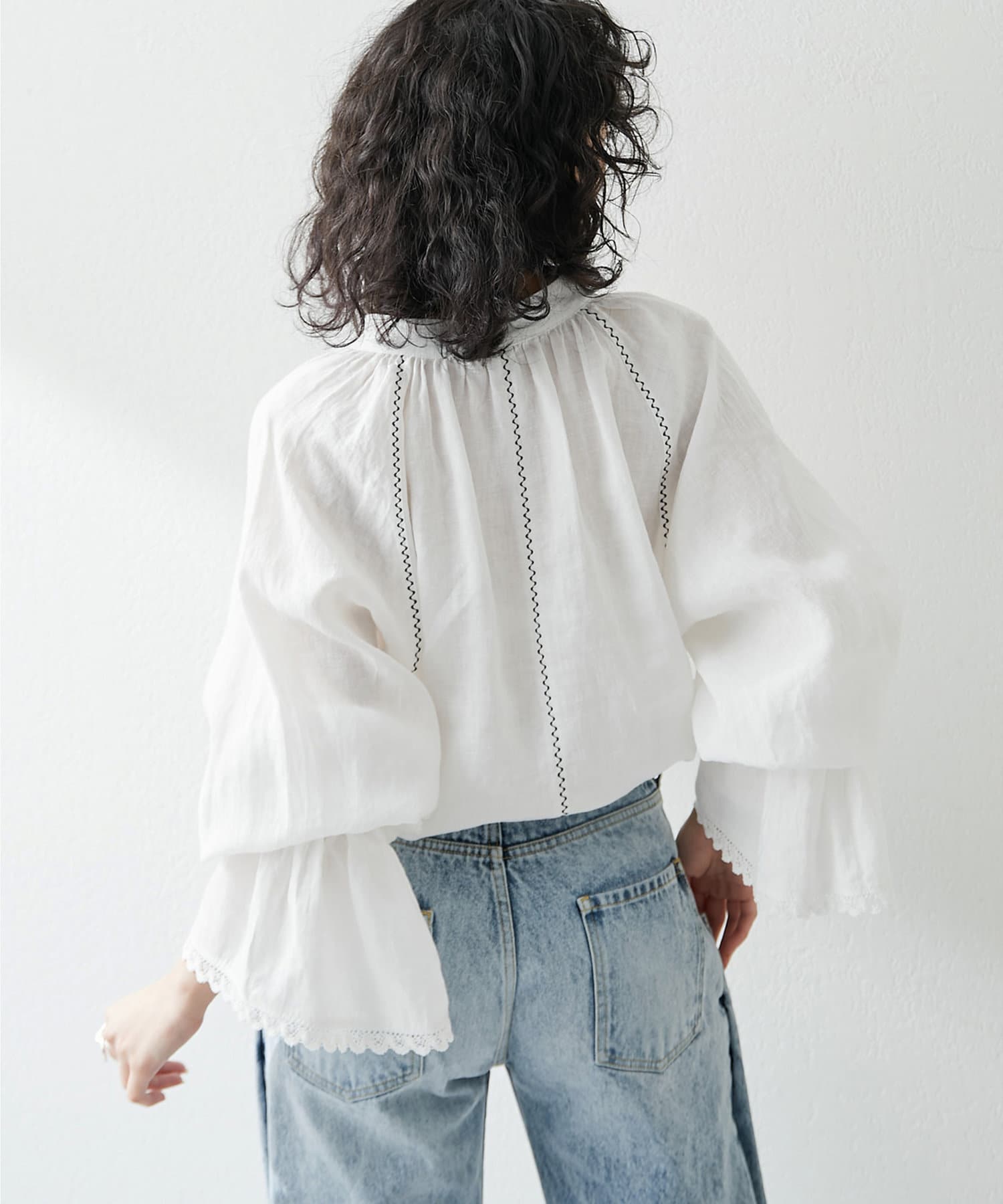 ■ギャザーを入れたキャンディスリーブ+袖口の端にレースをあしらいフェミニンな印象に。