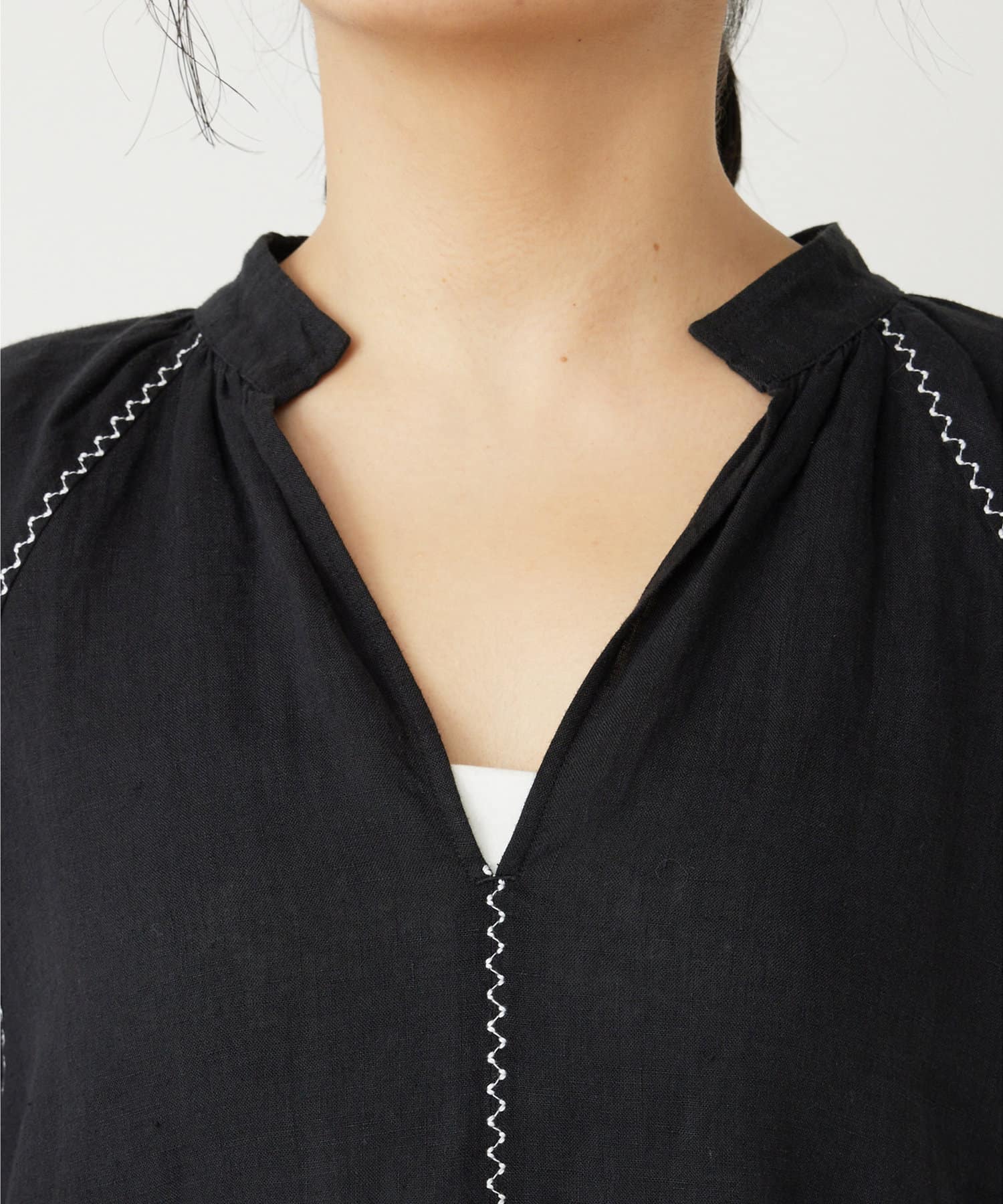 ■ネックをスキッパー開きにすることでデコルテをすっきりと見せ抜け感をプラス。
