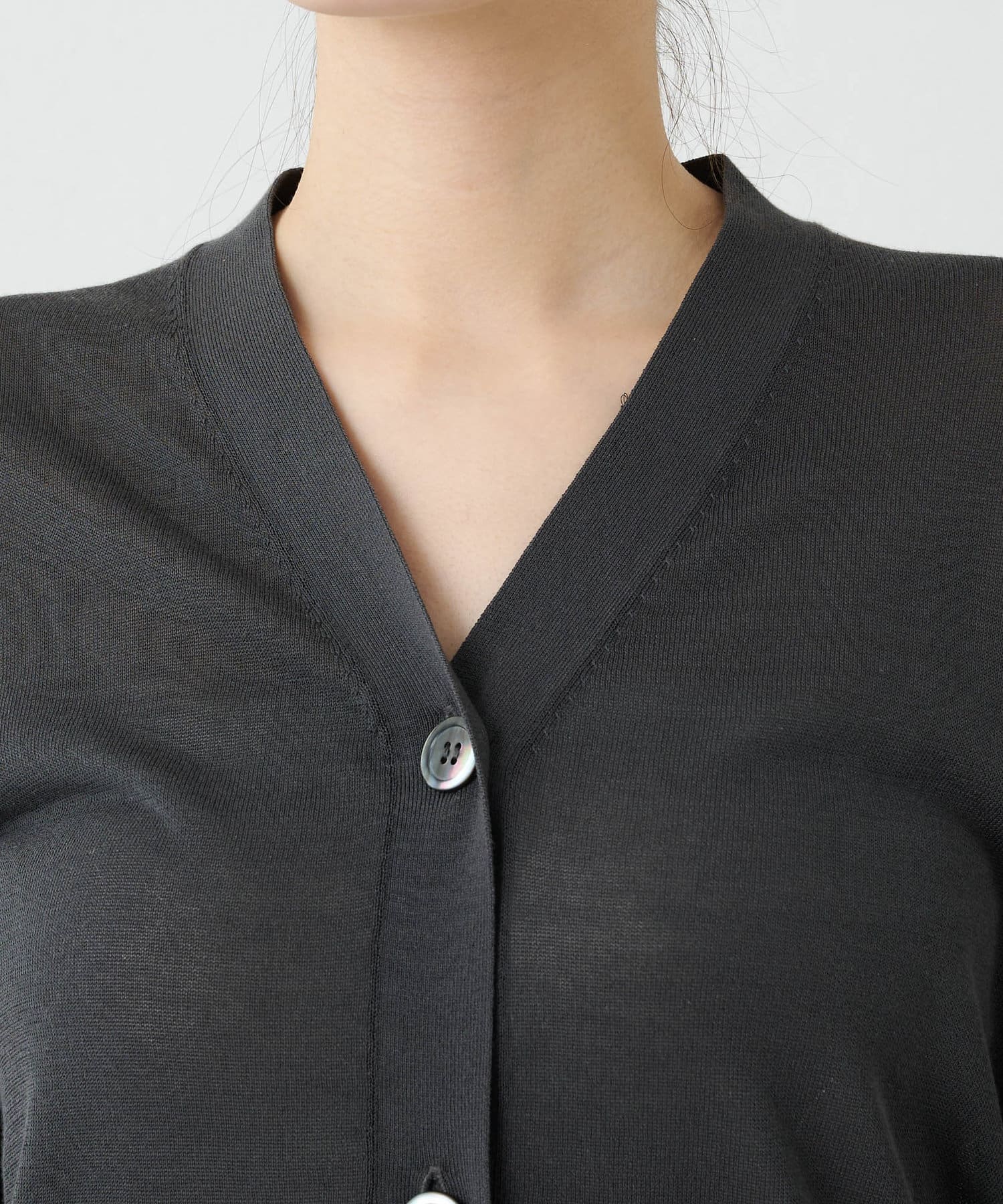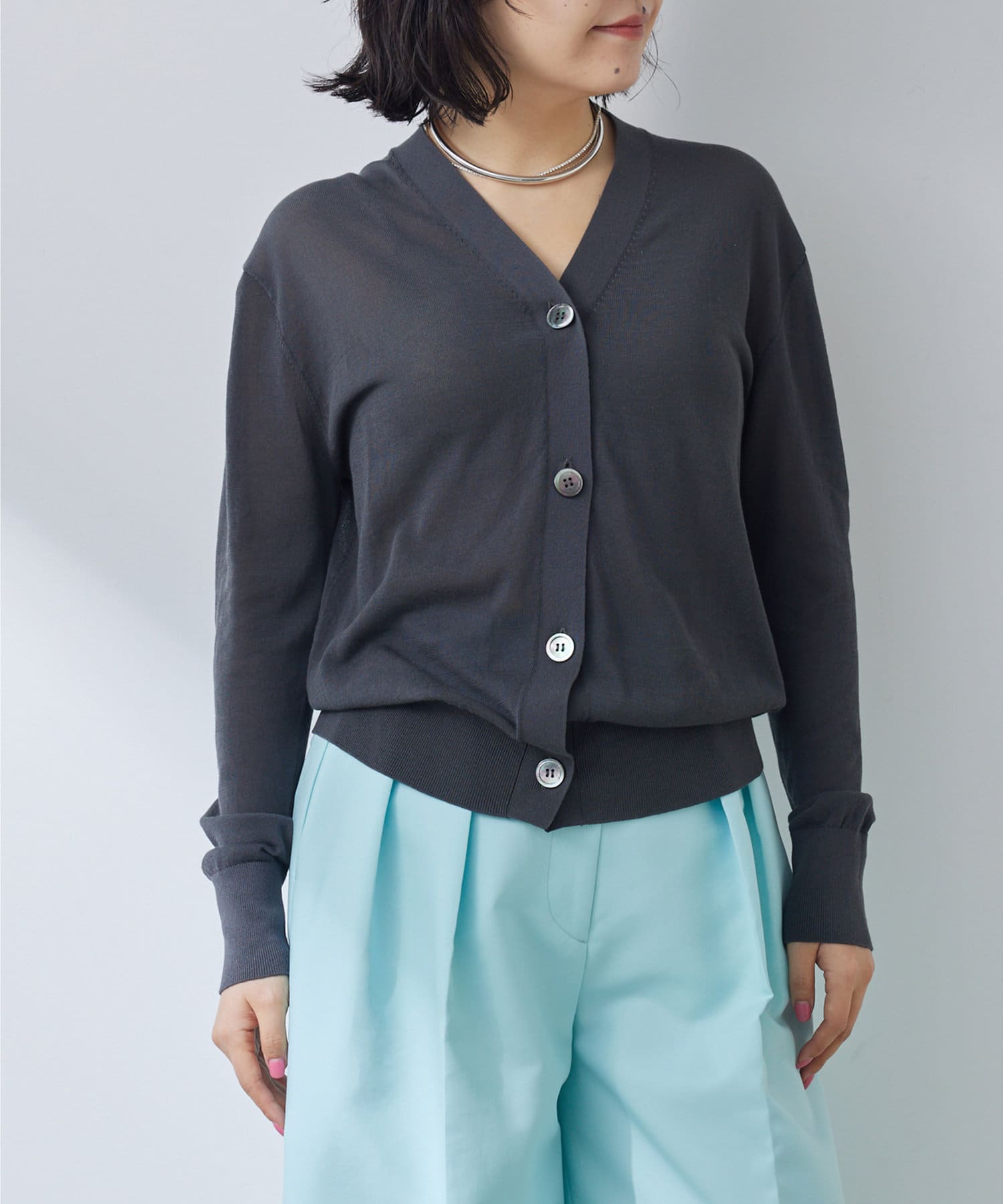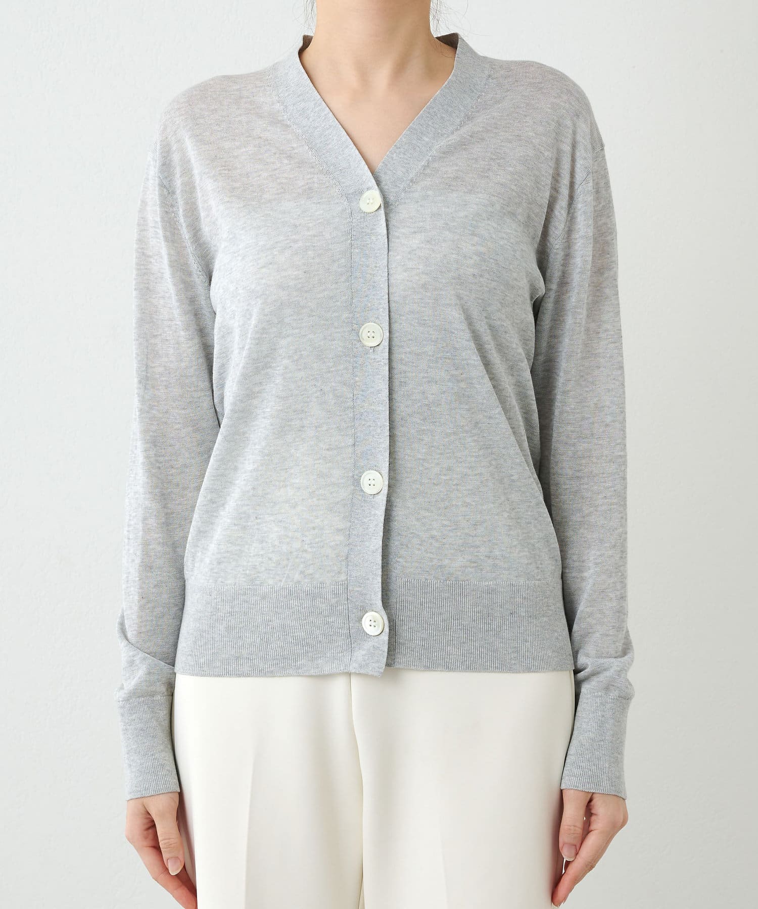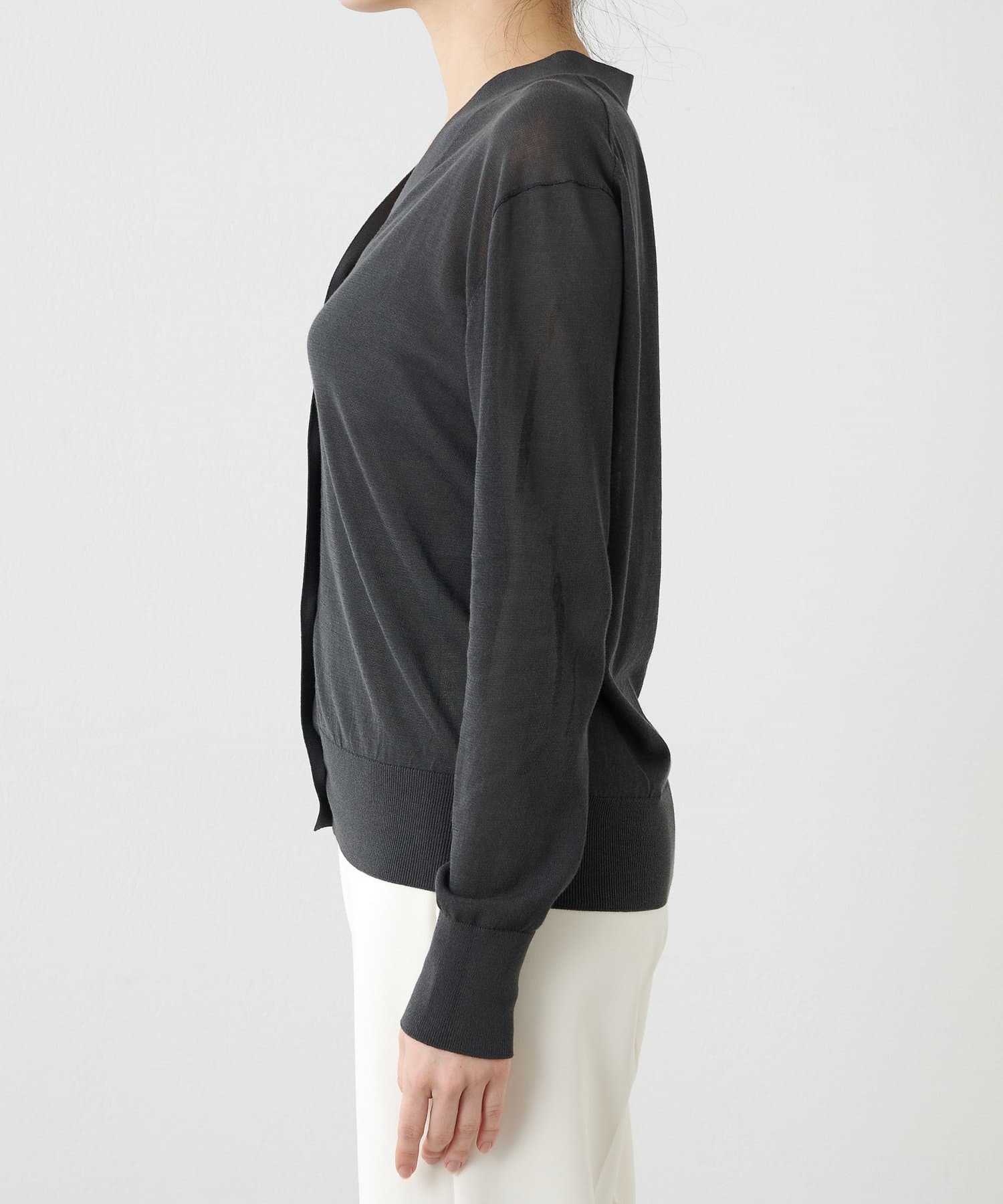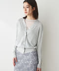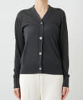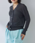 やや光沢を感じられる薄手のニットカーディガン。肌のあたりが柔らかく、着心地が良いです。サラッとした質感でなので、春夏に活躍間違いなし。体のラインを拾い過ぎないので安心のシルエット。ボタンをとめてプルオーバーとしても使えます。