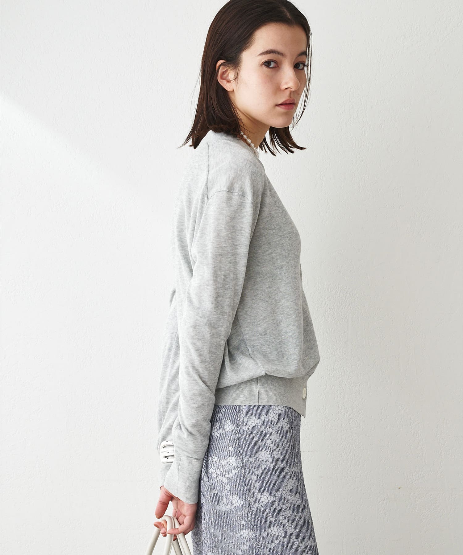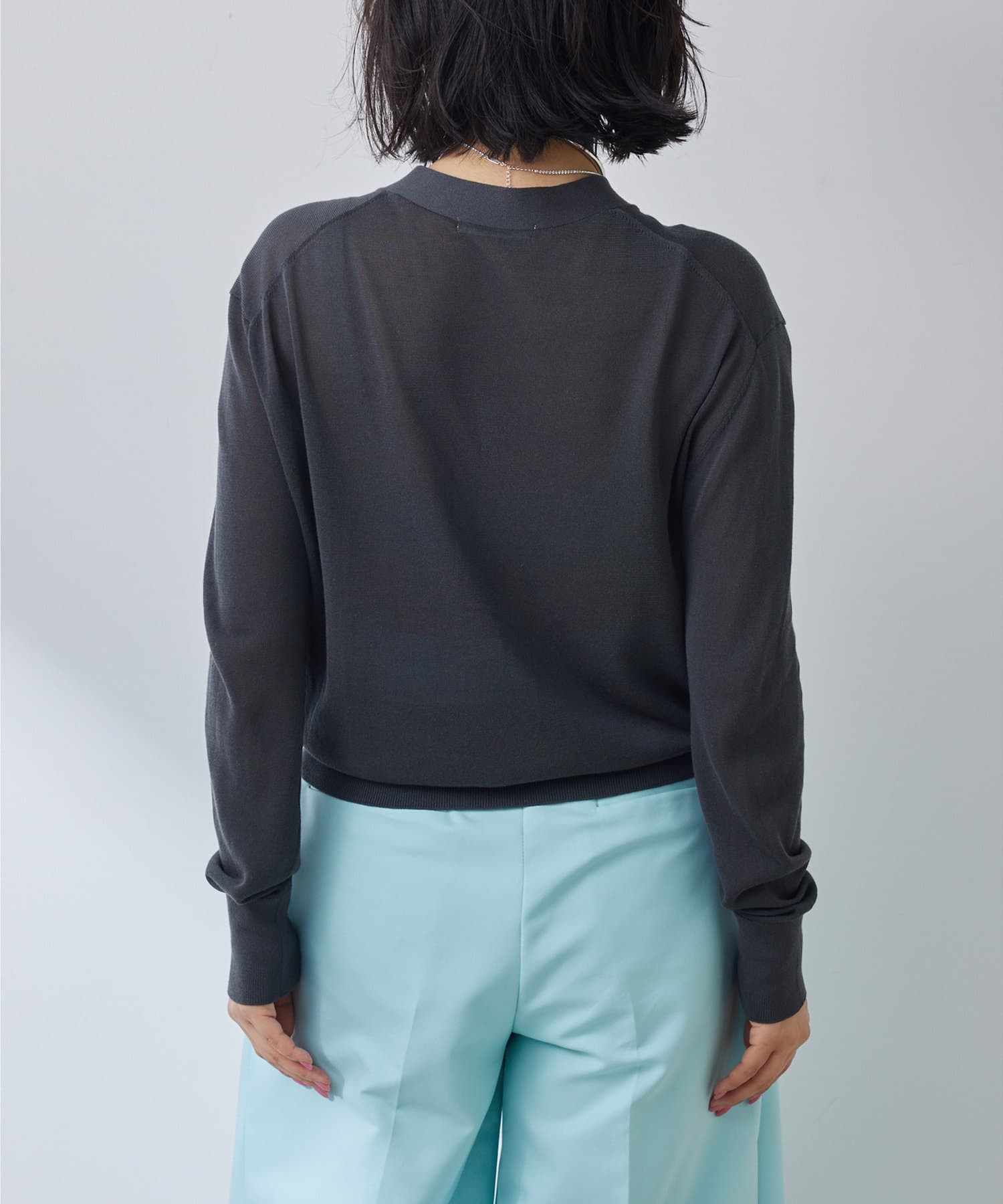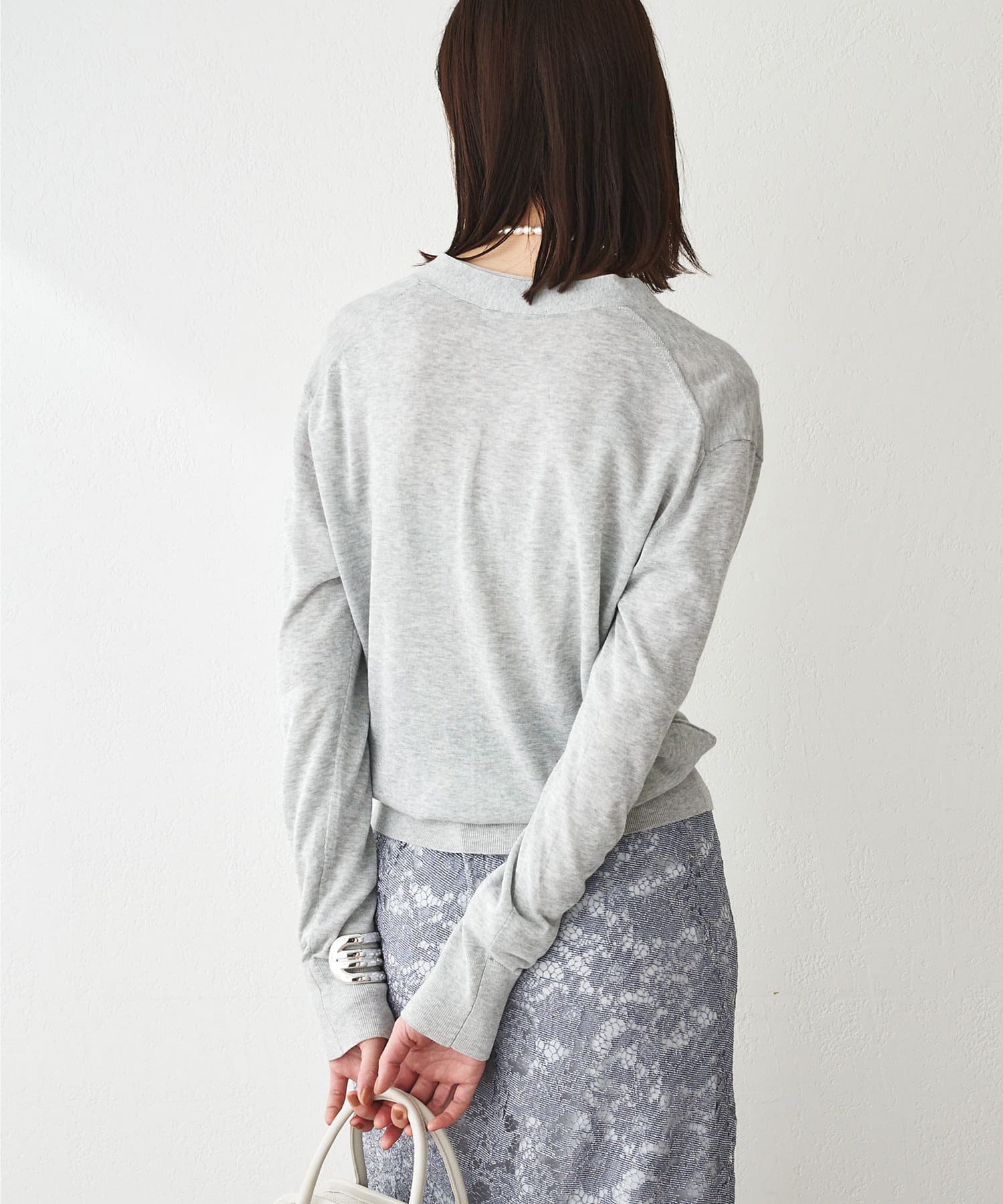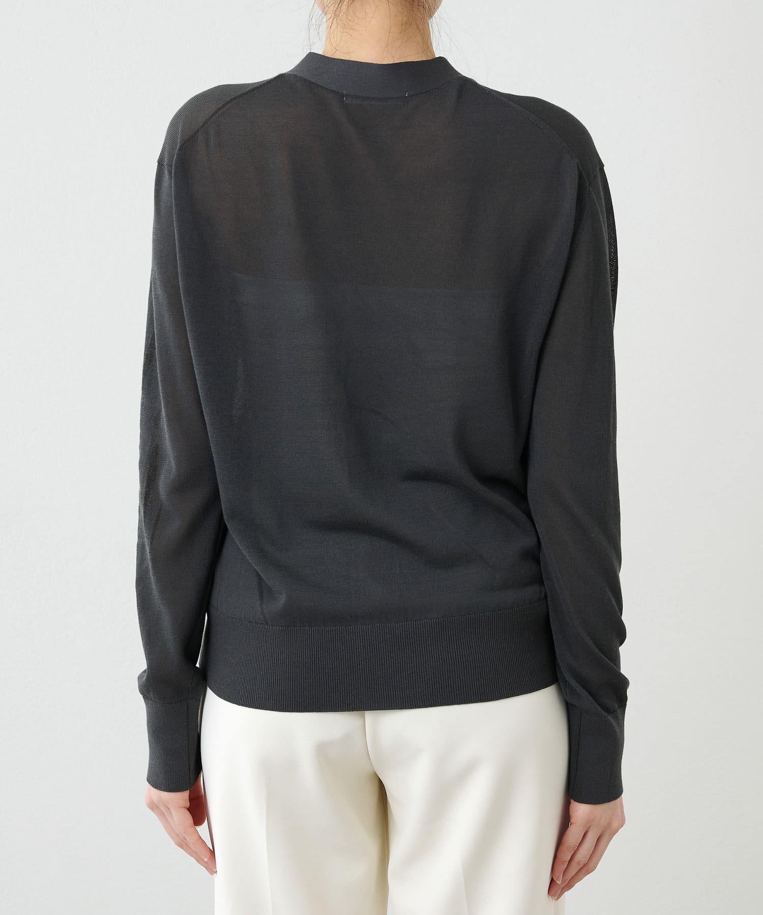 やや光沢を感じられる薄手のニットカーディガン。肌のあたりが柔らかく、着心地が良いです。サラッとした質感でなので、春夏に活躍間違いなし。体のラインを拾い過ぎないので安心のシルエット。ボタンをとめてプルオーバーとしても使えます。
