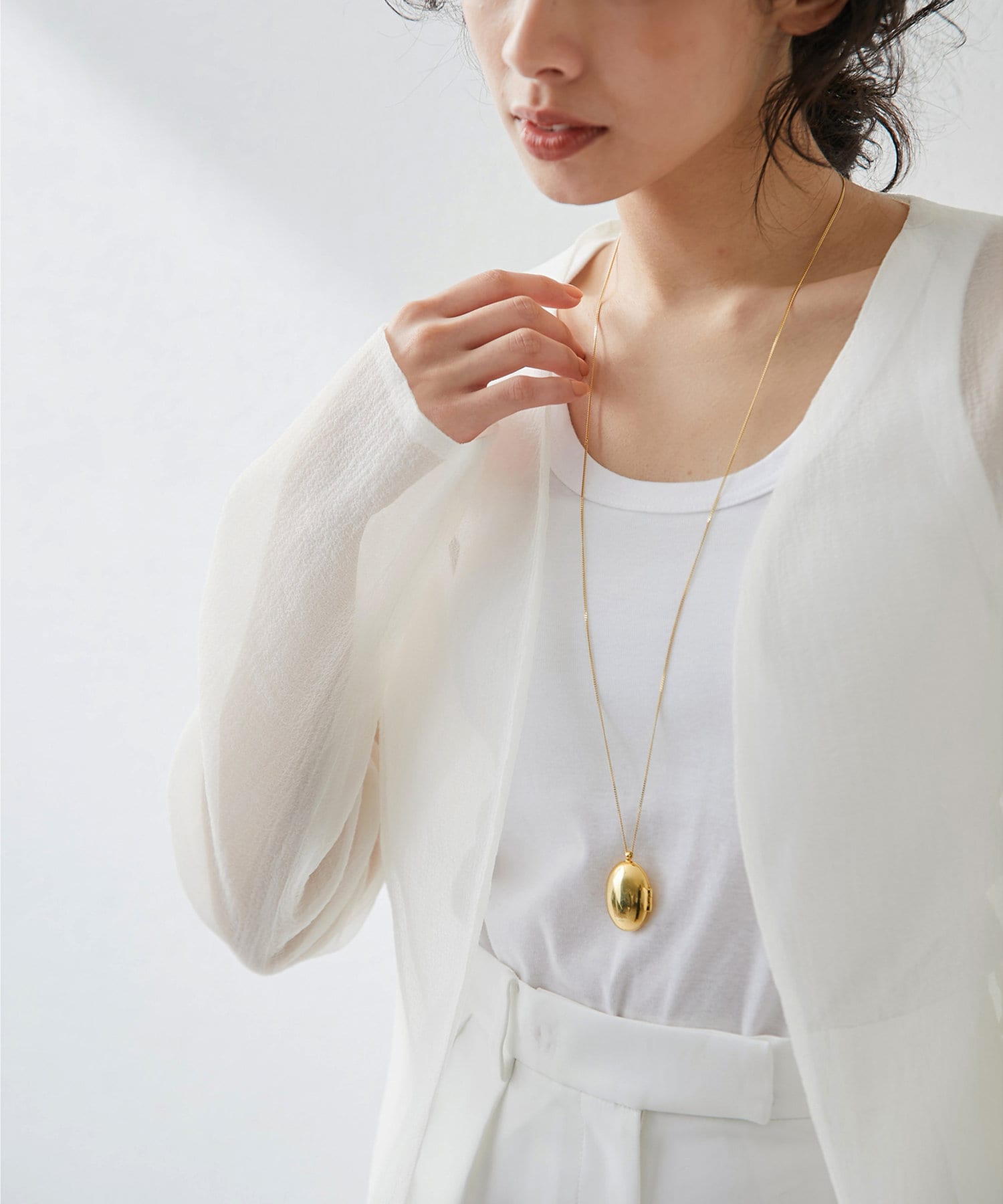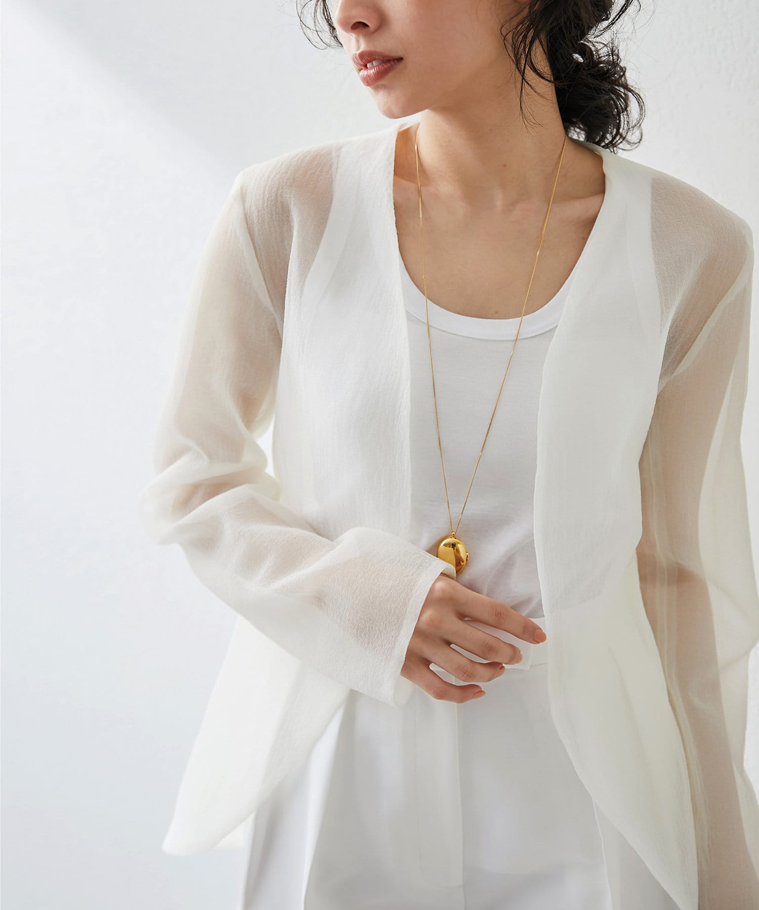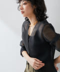 張りのある素材がシルエットを美しく見せてくれます。暑い季節にも羽織れるジャケットです。シアー感がちょうど良く、結婚式やパーティーシーンの羽織にもおすすめです。