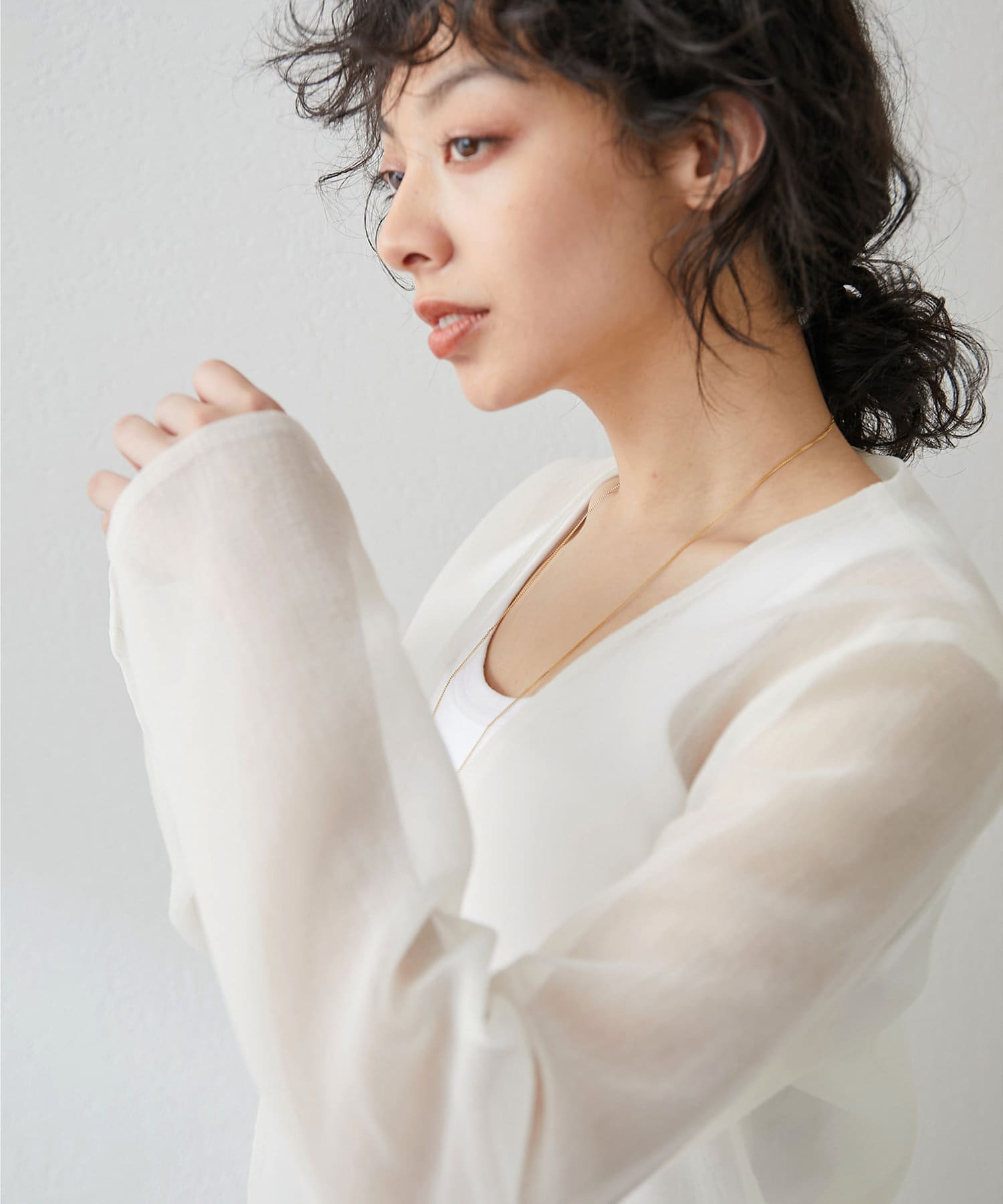 ハリとコシのあるオーガンジーにワッシャー加工を施した、透け感がありながらも凹凸の表面感のある素材。