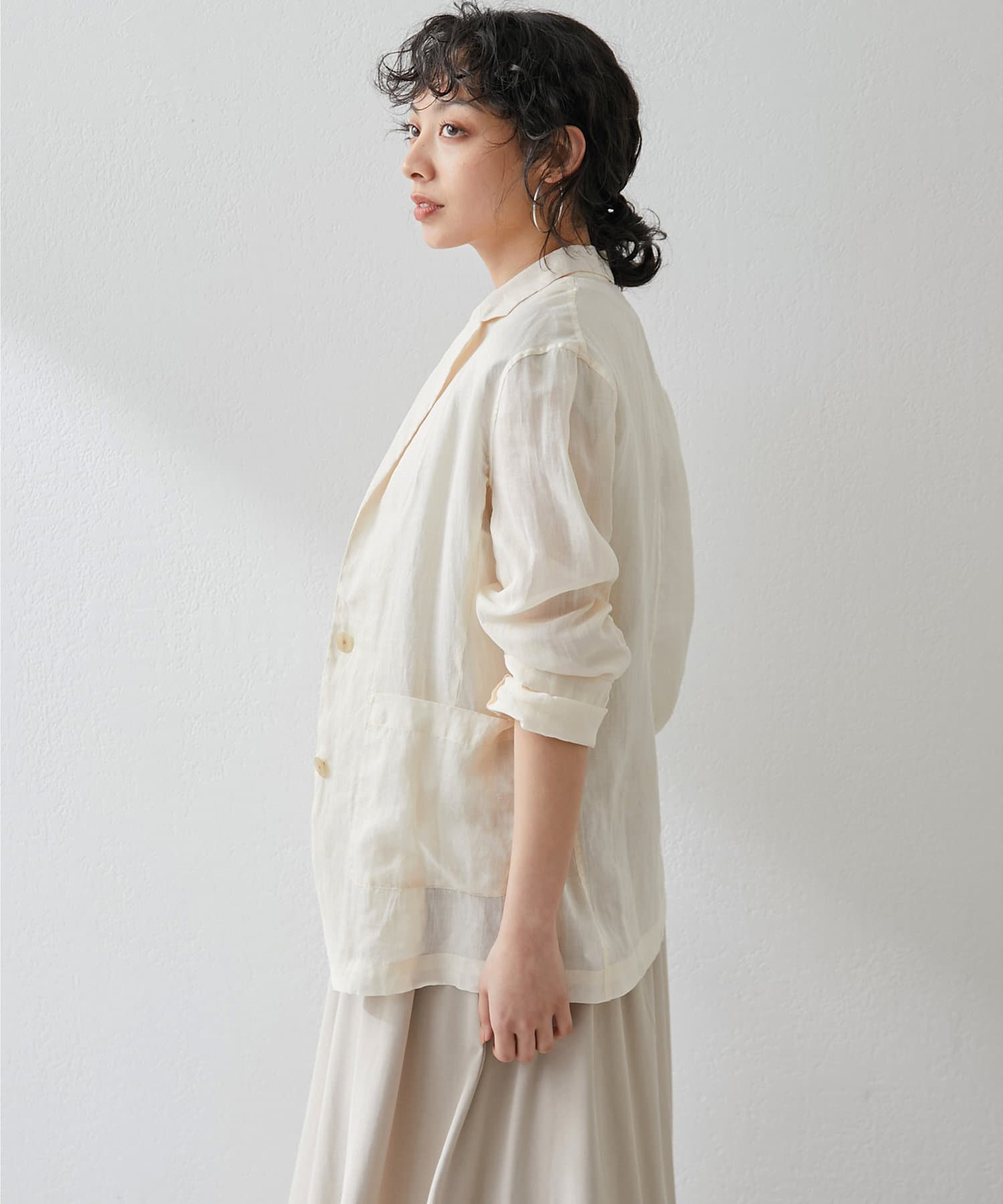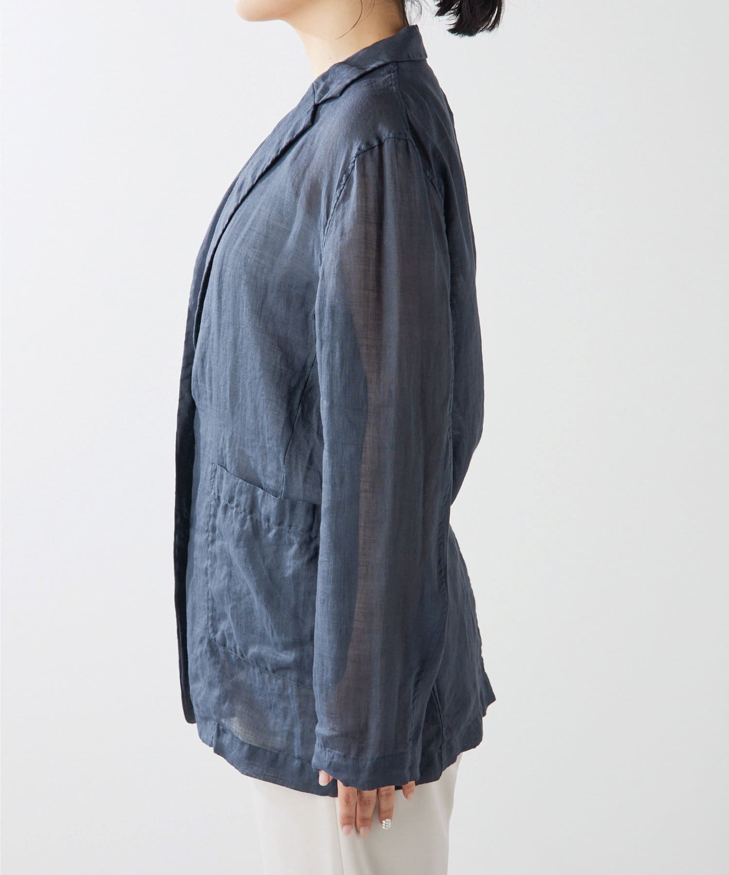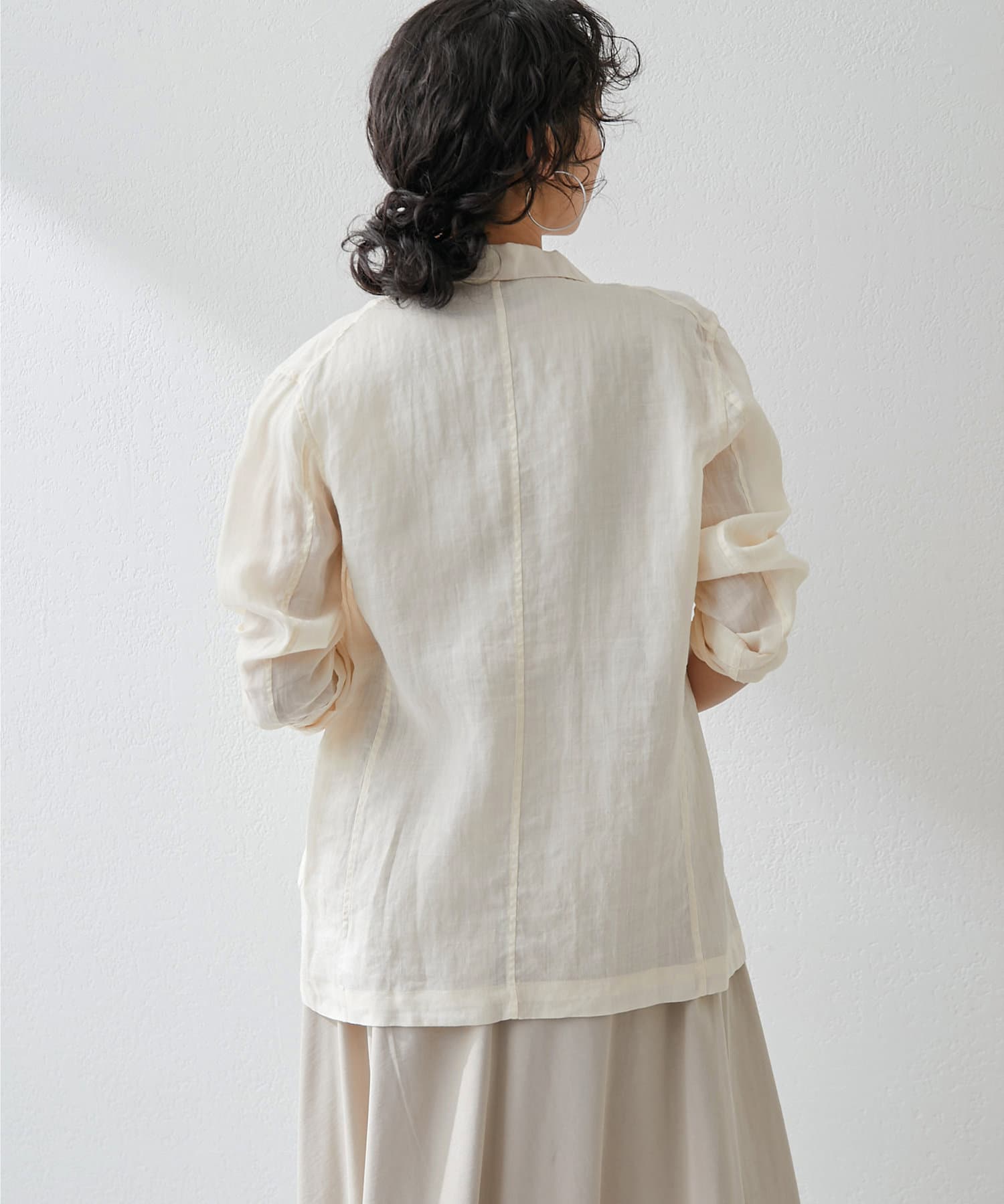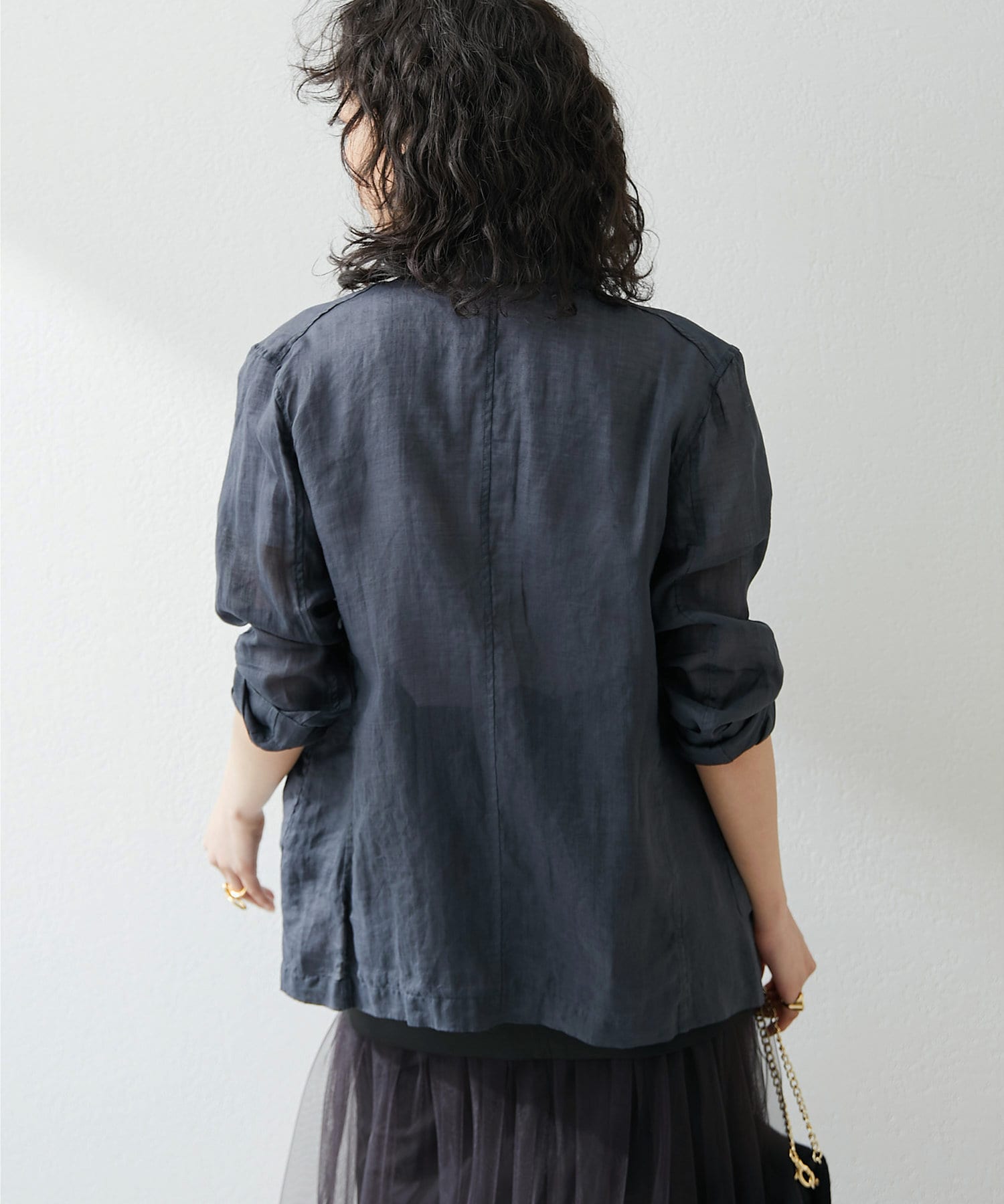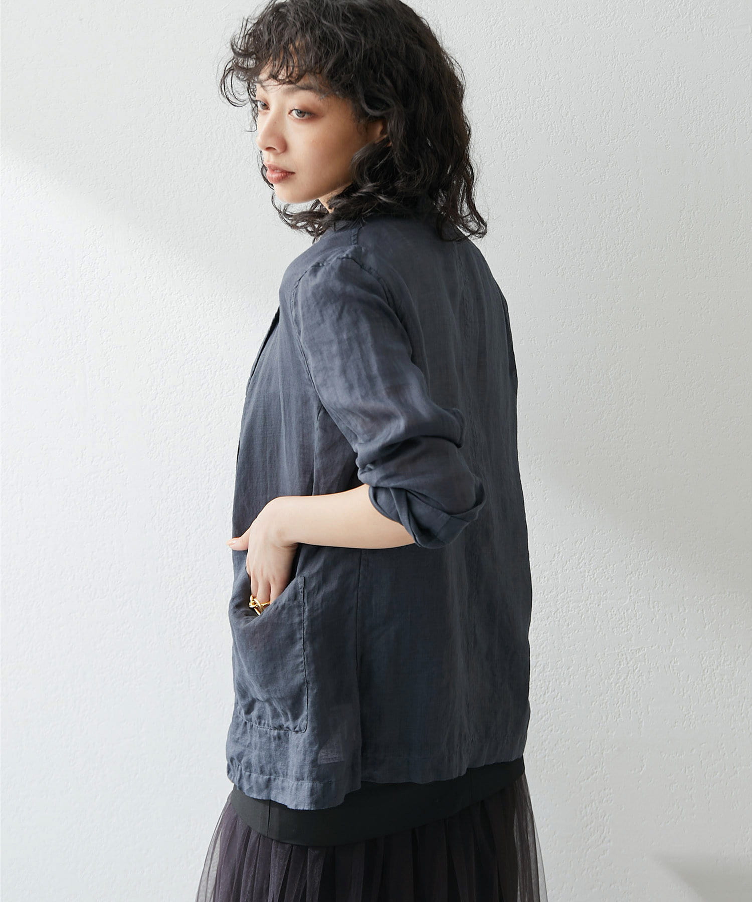 毎年人気のラミー素材のジャケット。パッと羽織れて、こなれ感のでるアイテムです。程よいシアー感が素敵。少し長めの丈感がオシャレ。気温調整の羽織としても春夏に活躍間違いなしです。