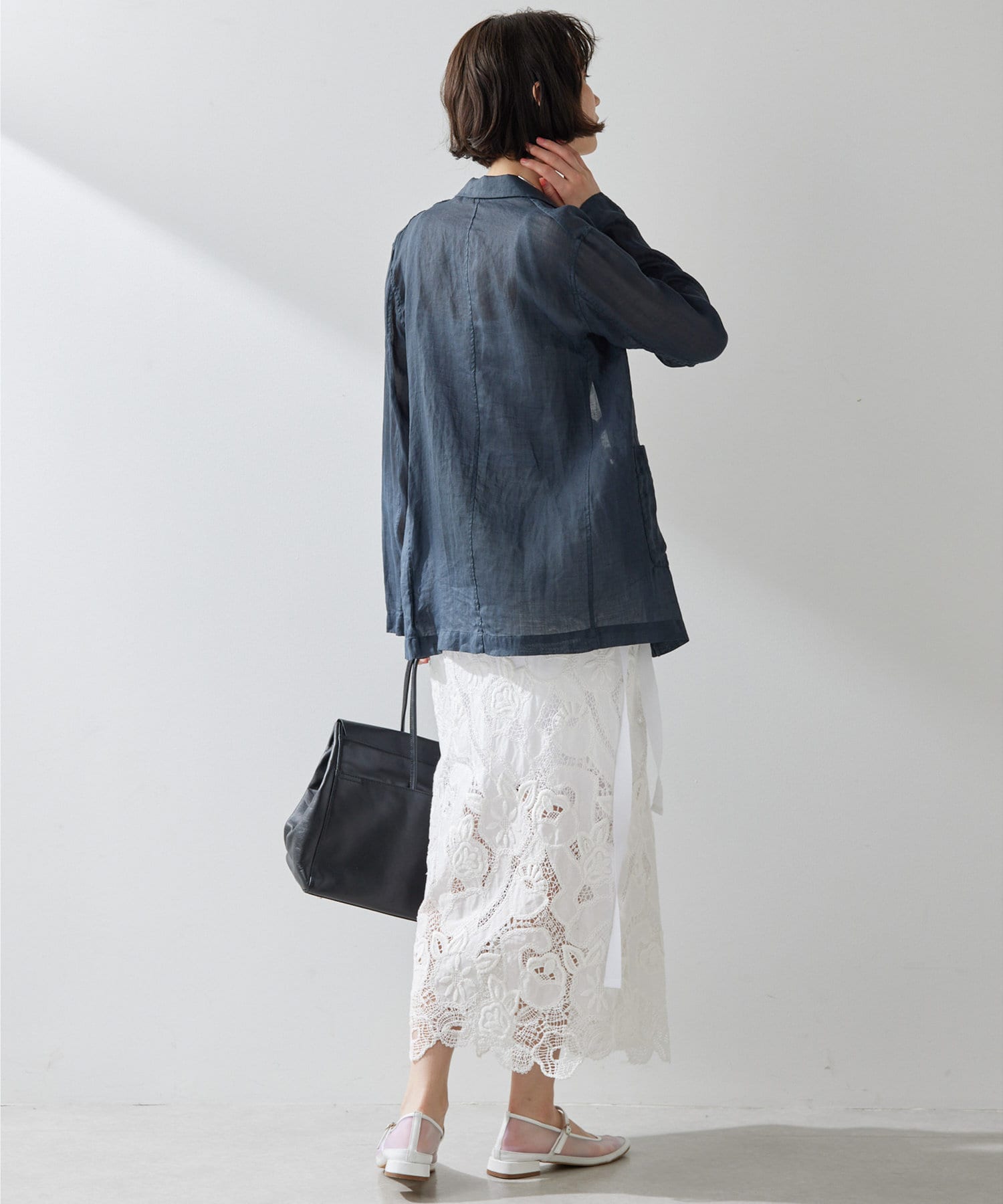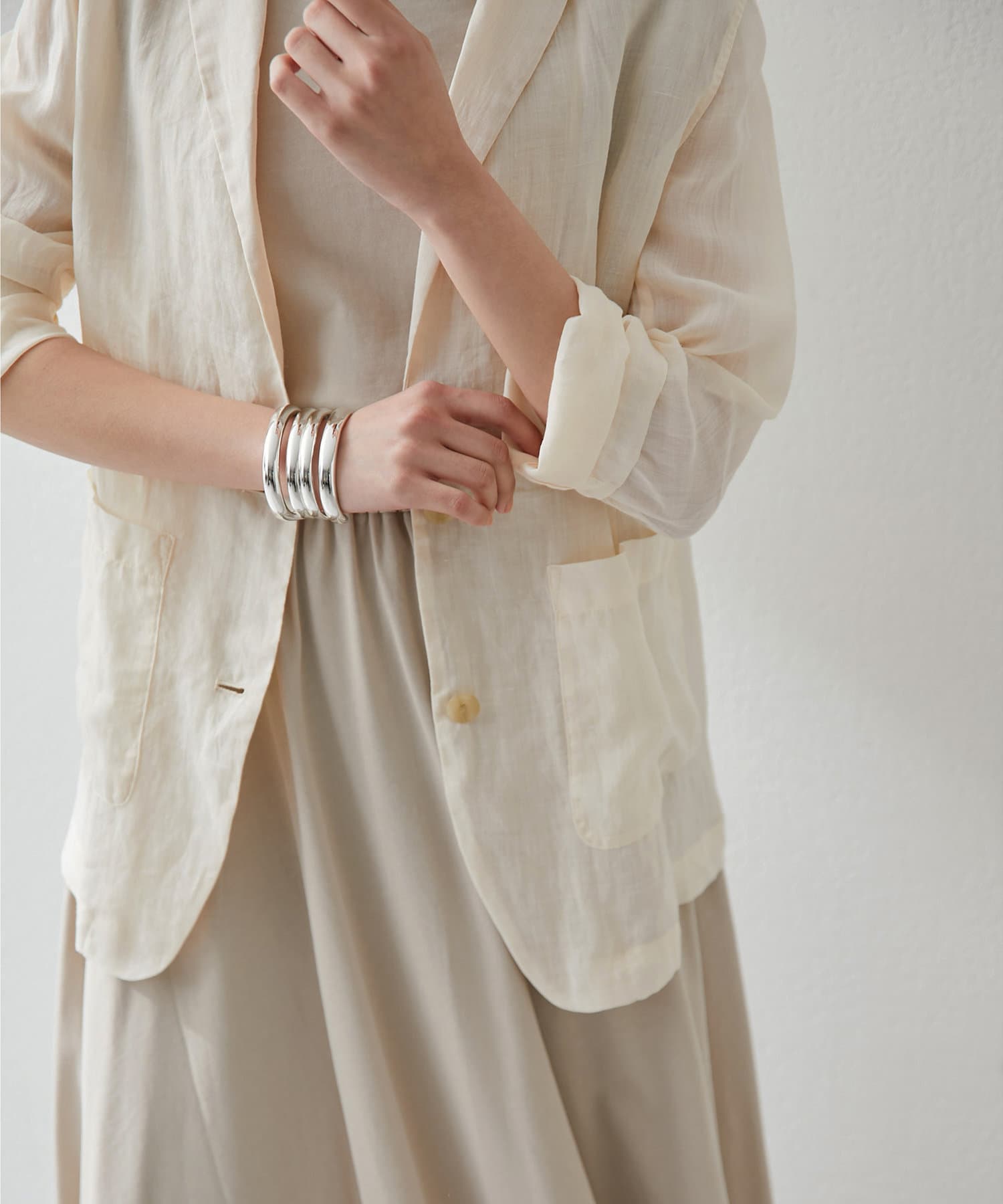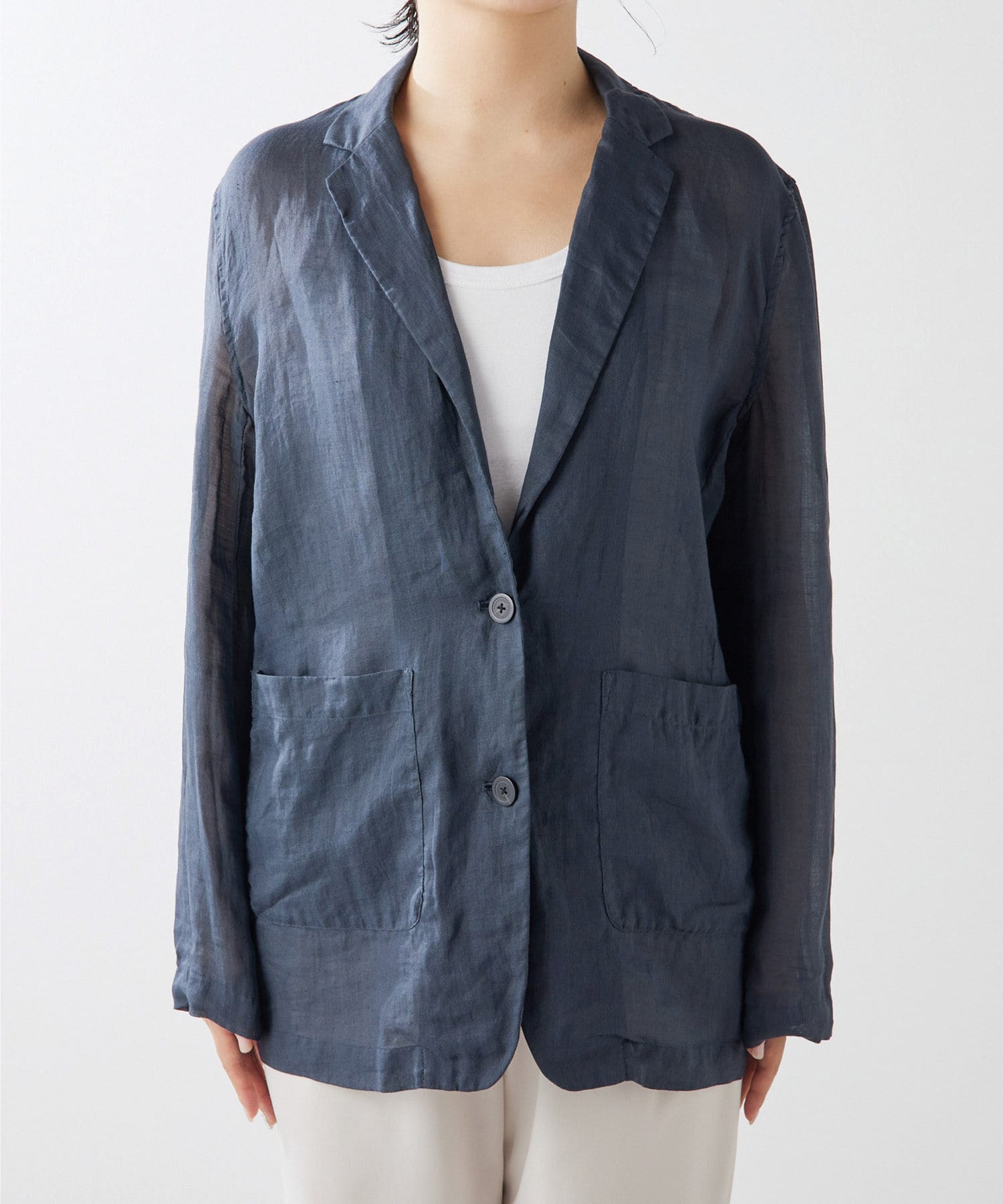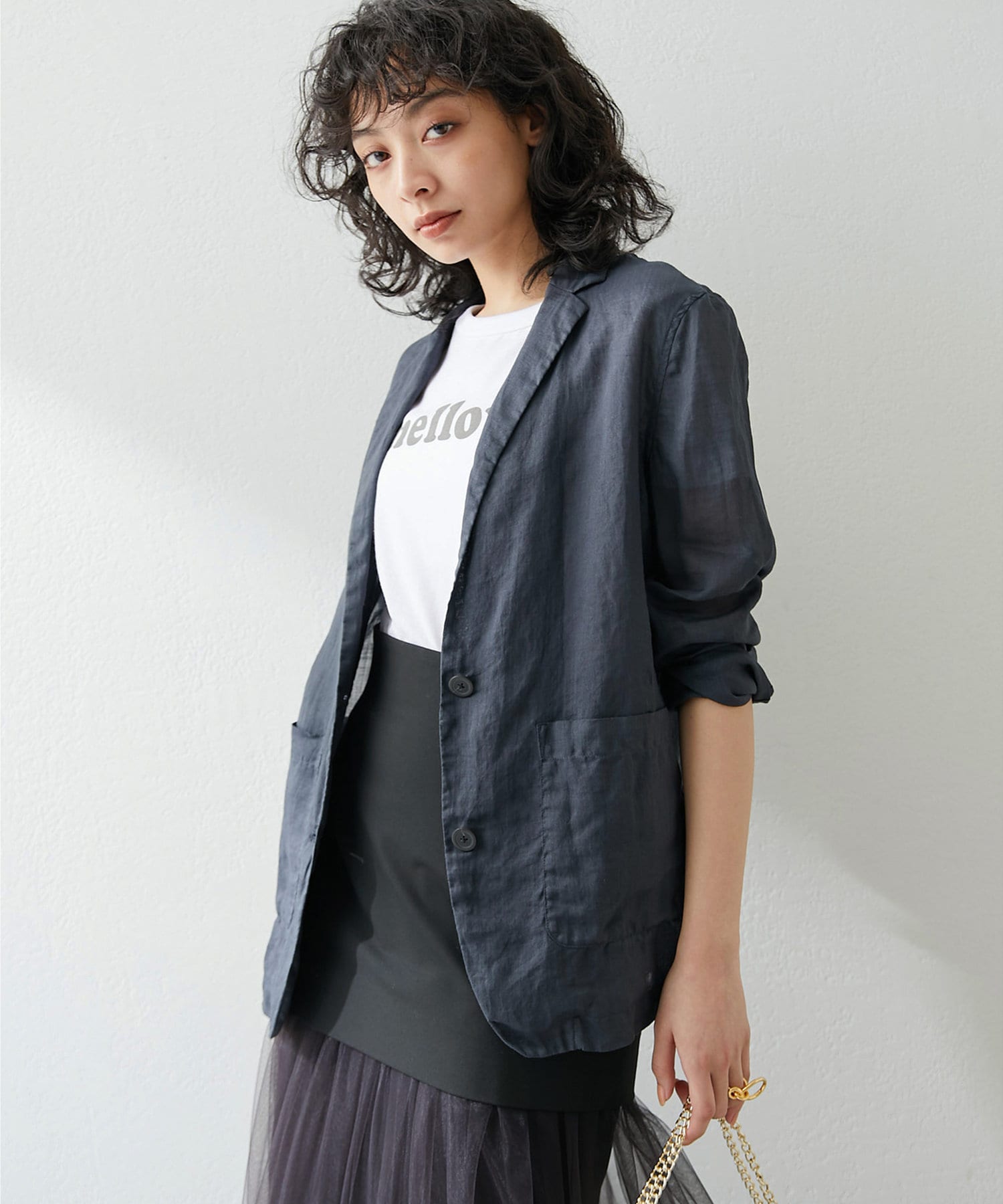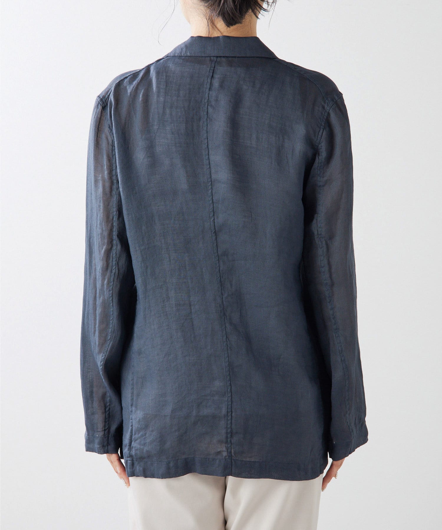 毎年人気のラミー素材のジャケット。パッと羽織れて、こなれ感のでるアイテムです。程よいシアー感が素敵。少し長めの丈感がオシャレ。気温調整の羽織としても春夏に活躍間違いなしです。