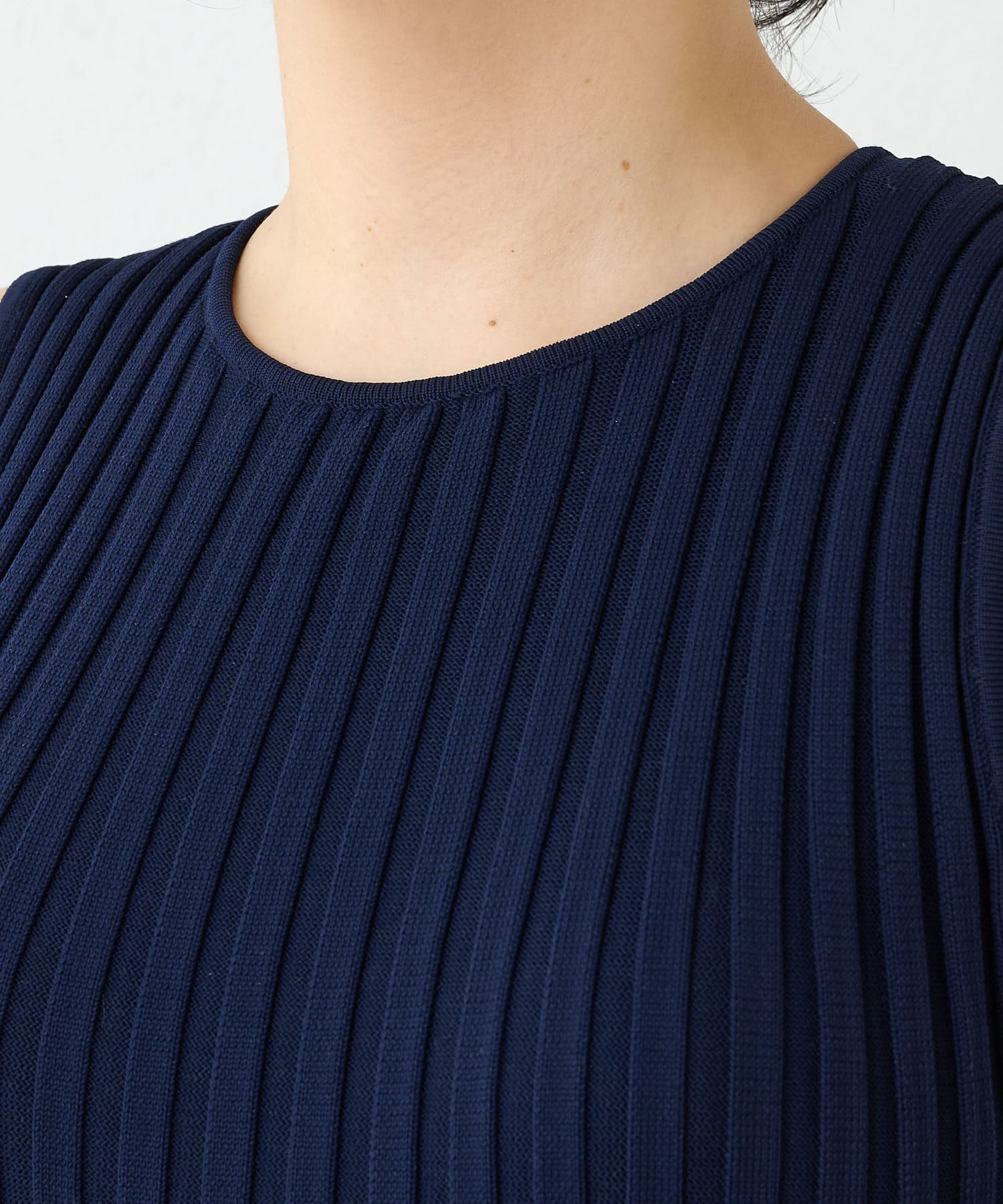 ■スリーブレスに、程よく詰まったクルーネックで上半身はミニマムな印象に。