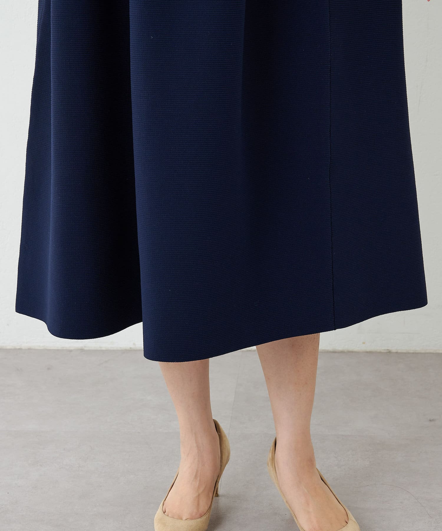 ■ニット素材のラフな着心地に加え、フィット&フレアのシルエットが目を惹く一枚。