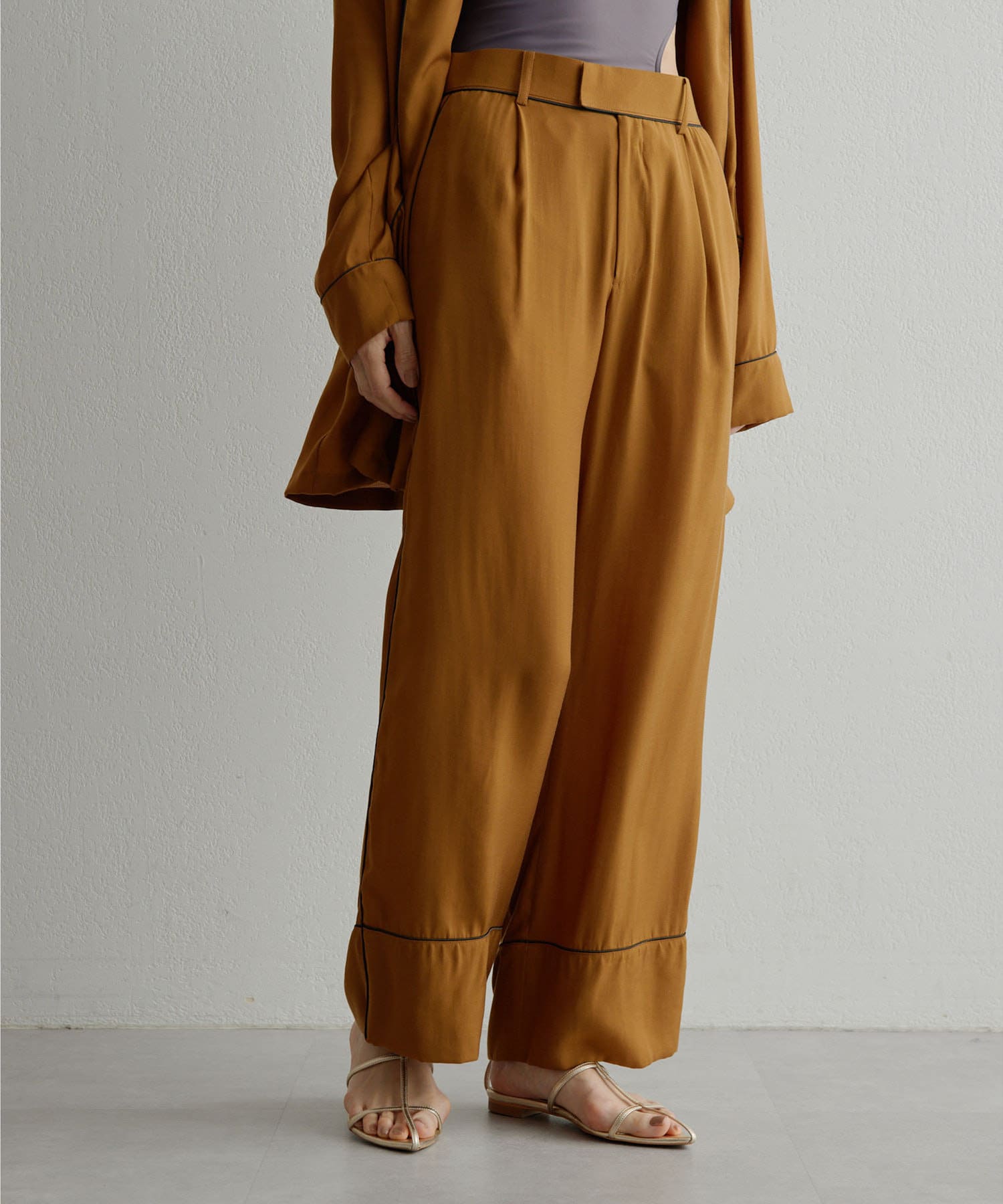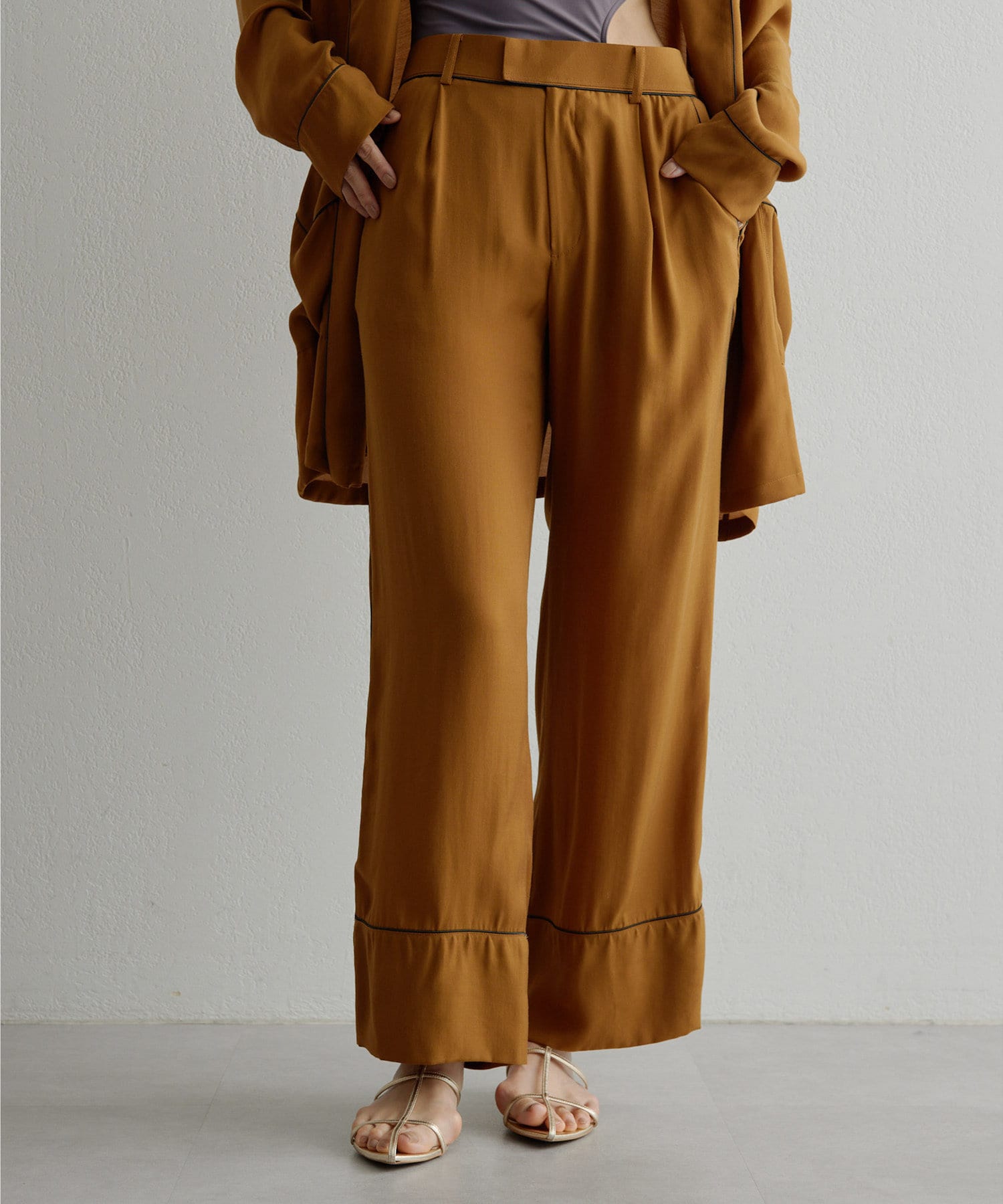 ■配色のパイピンクがポイントのリラクシーなワイドパンツ。