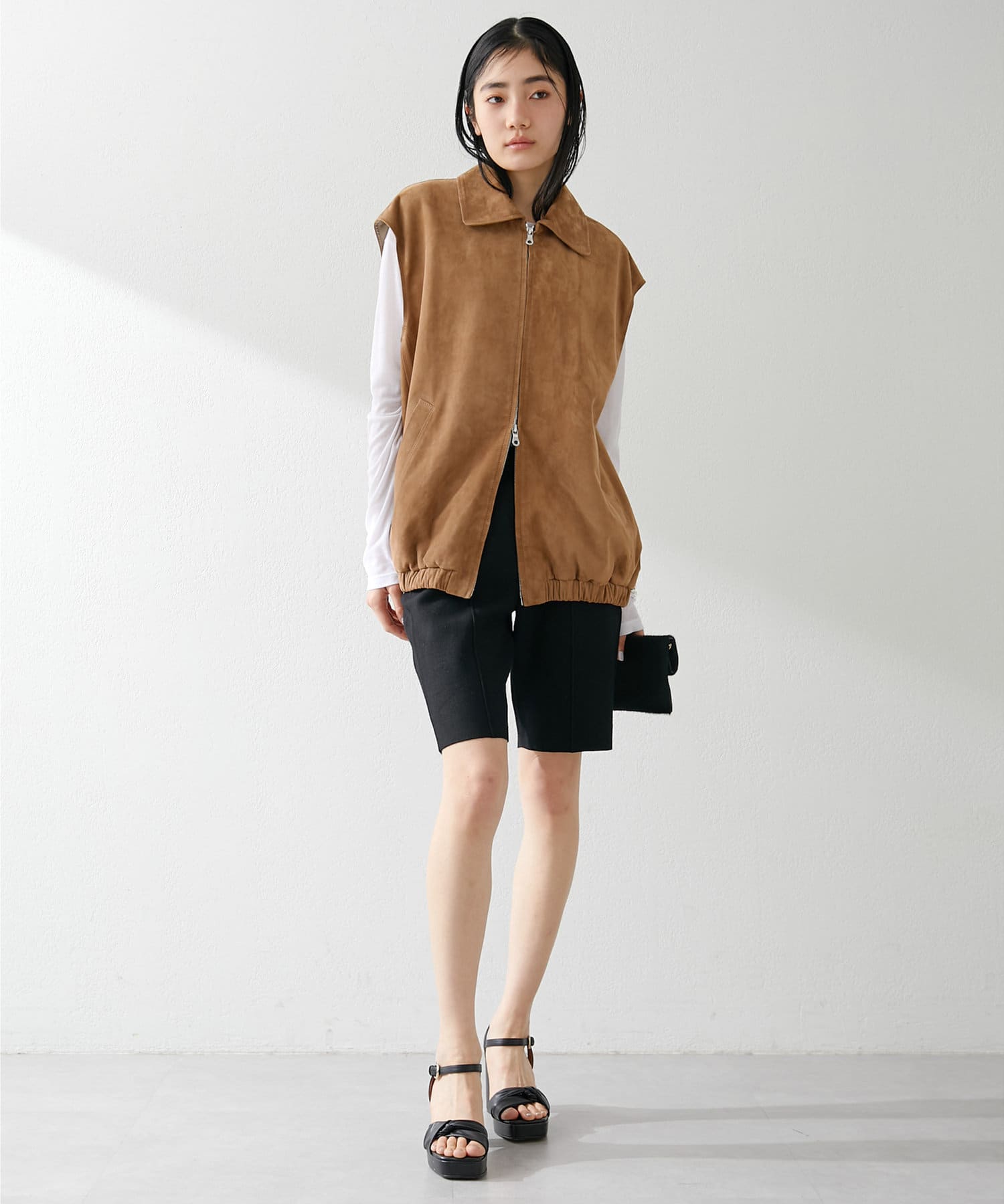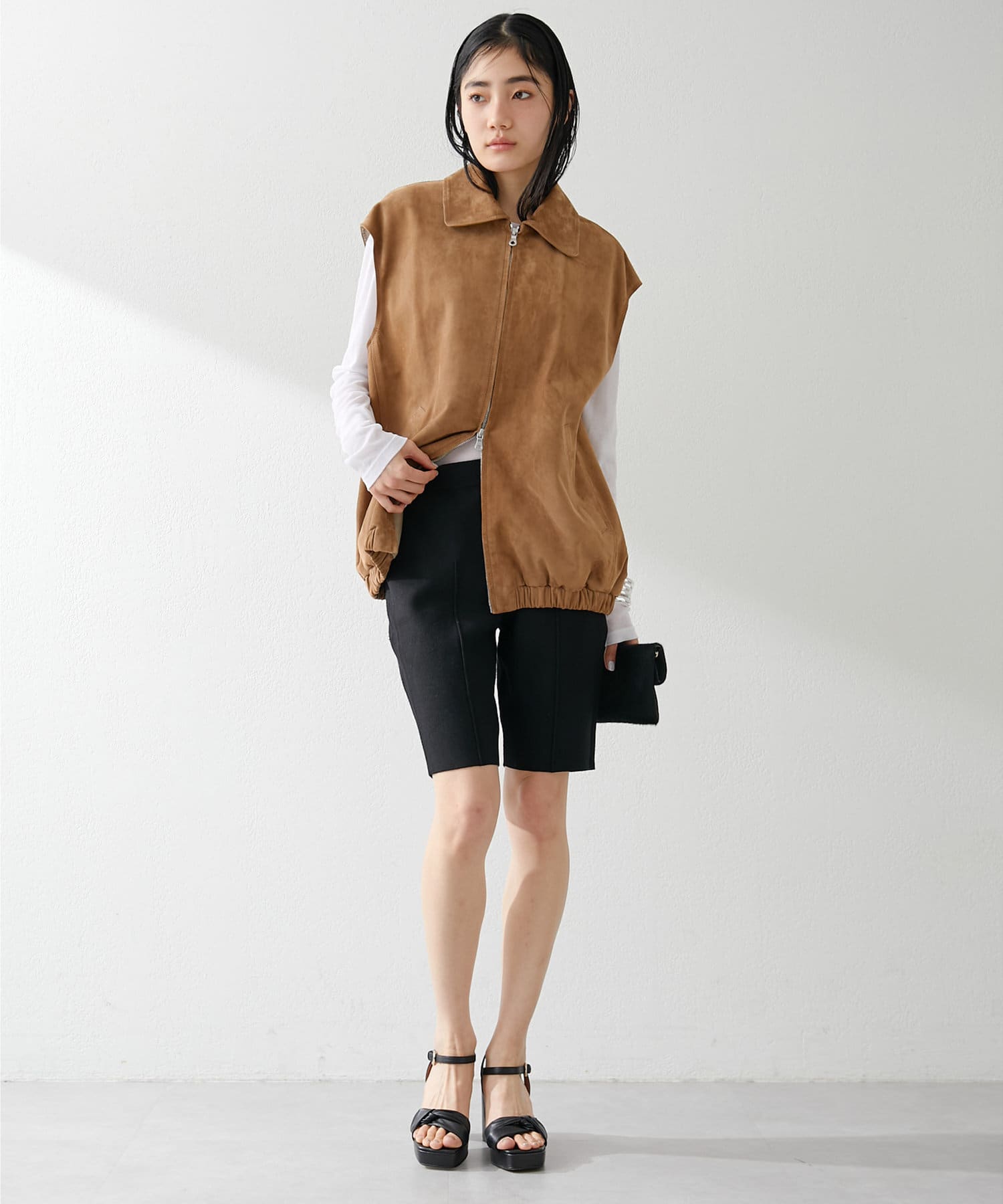 締め付け感のないバイカーパンツ。ストレッチが効いていてとても楽です。トップスはボリュームのあるものはヒップまで隠れるくらいの丈のものと合わせるとバランスよく着こなせます。