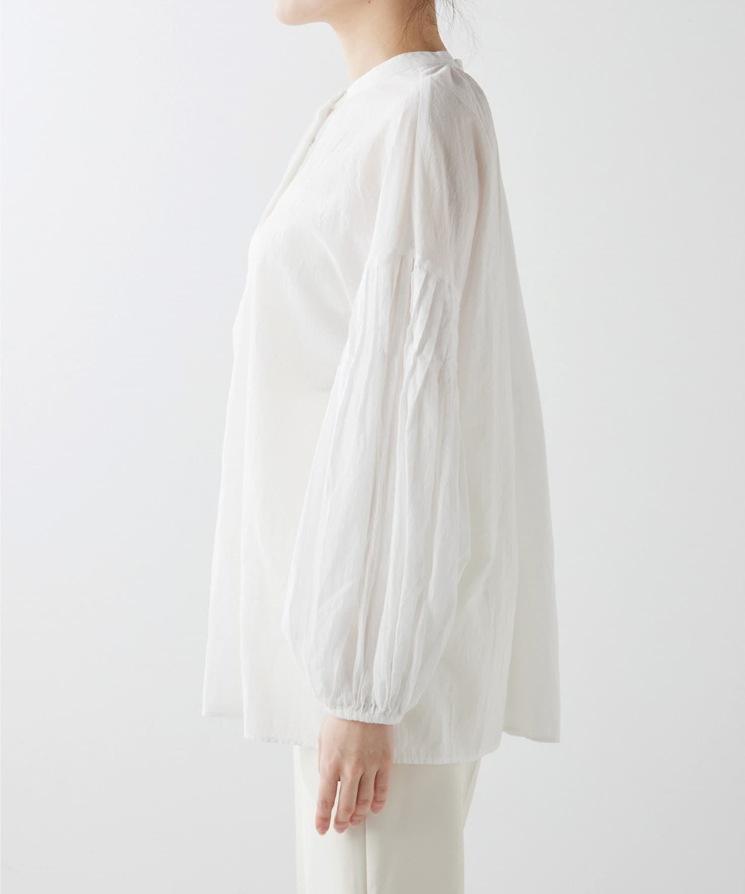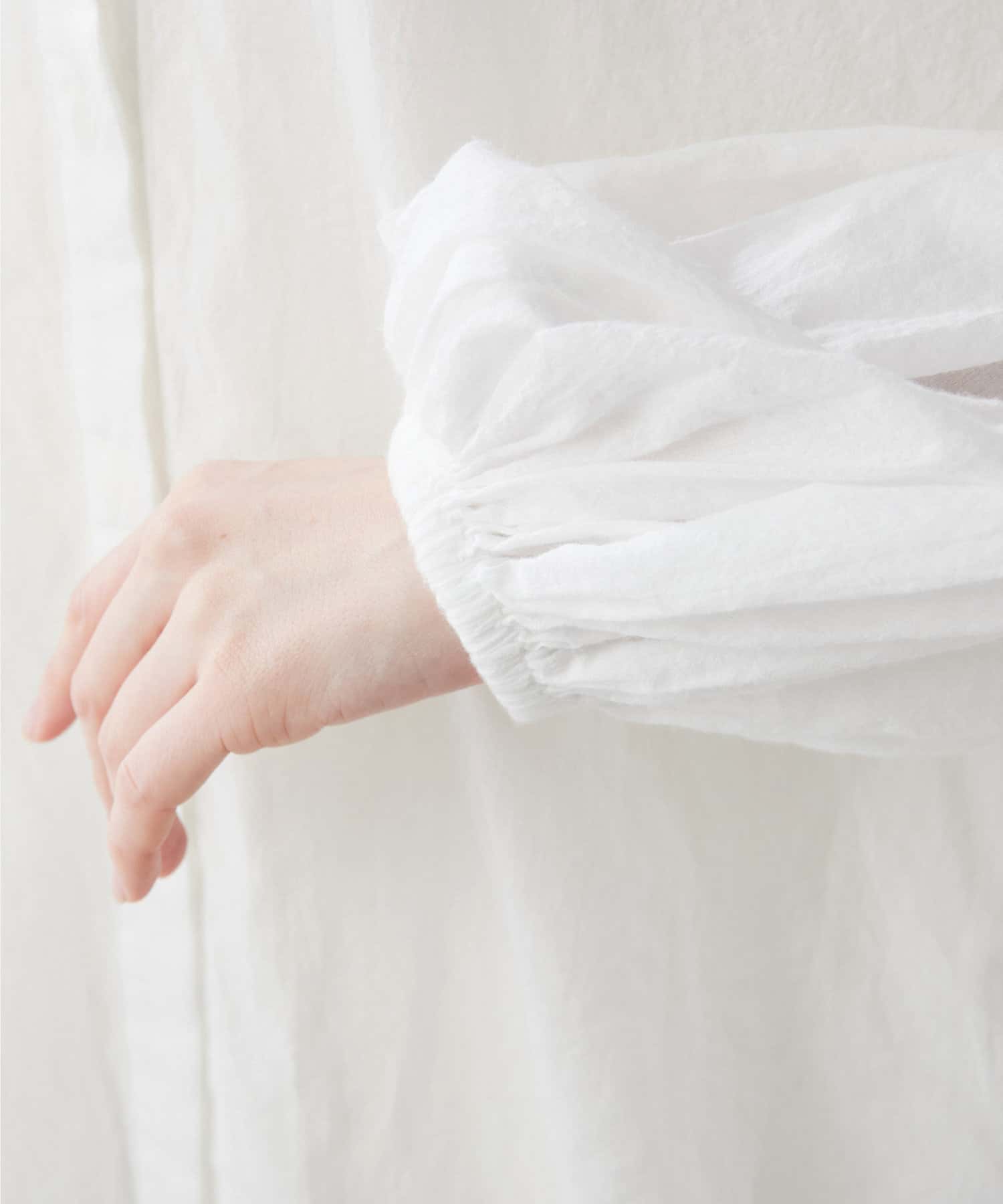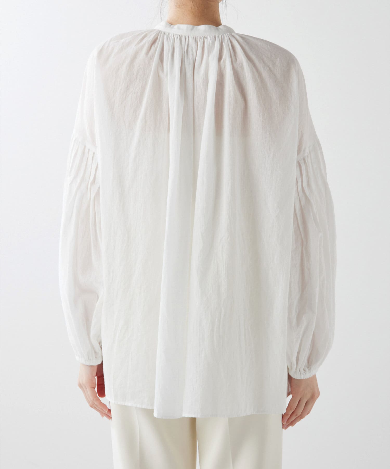 コットンシフォンの素材感が着心地良く、柔らかな印象にしてくれます。袖のボリューム感がオシャレ。シルエットを楽しめます。2wayなので前後逆にも着ていただけます。着回し力のある一枚です。程よい透け感が差をつけるアイテムです。