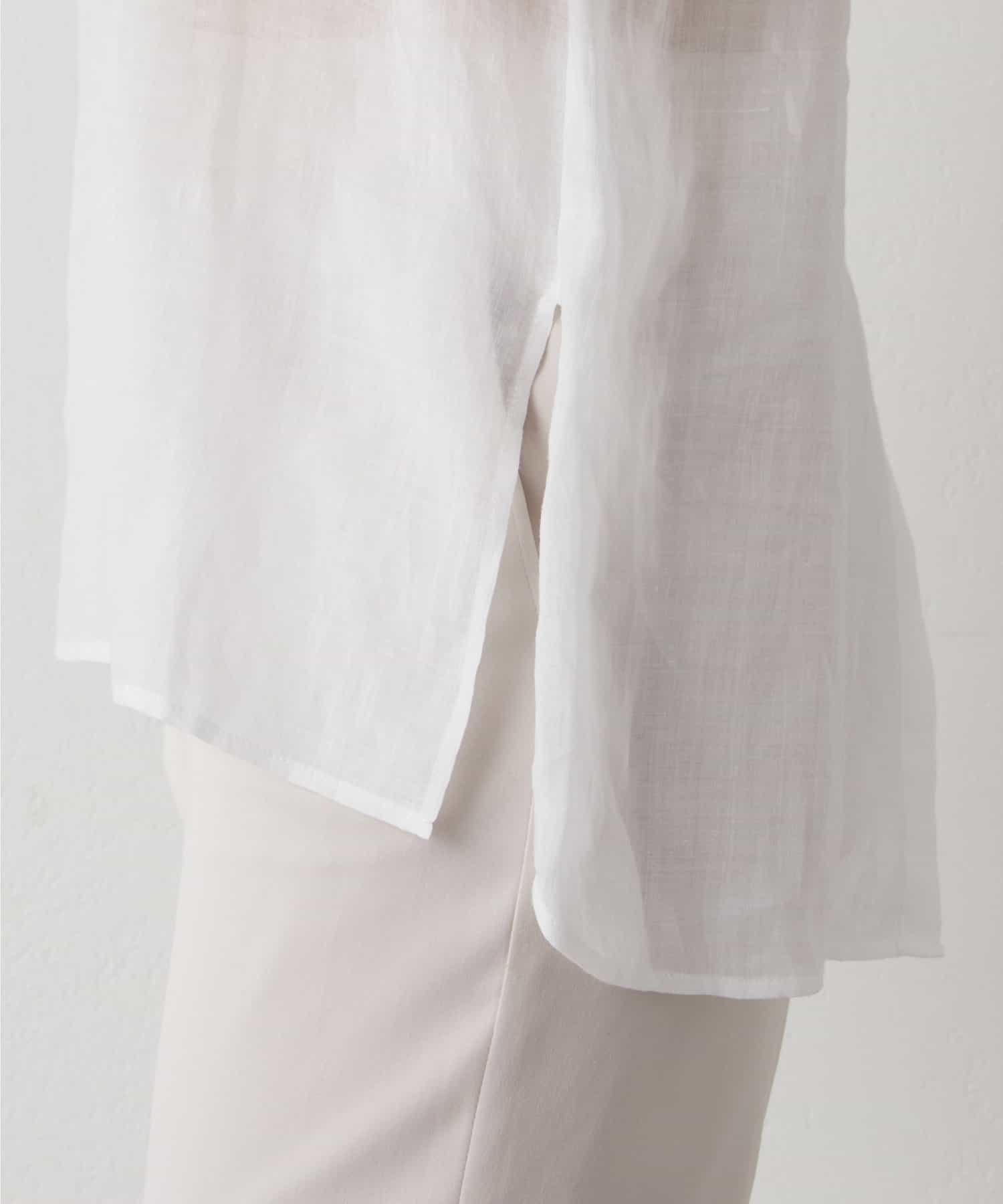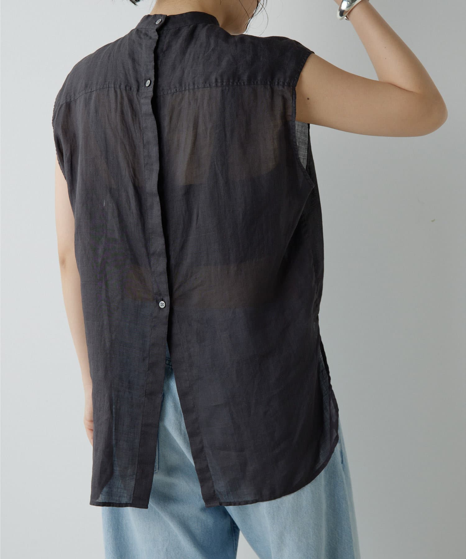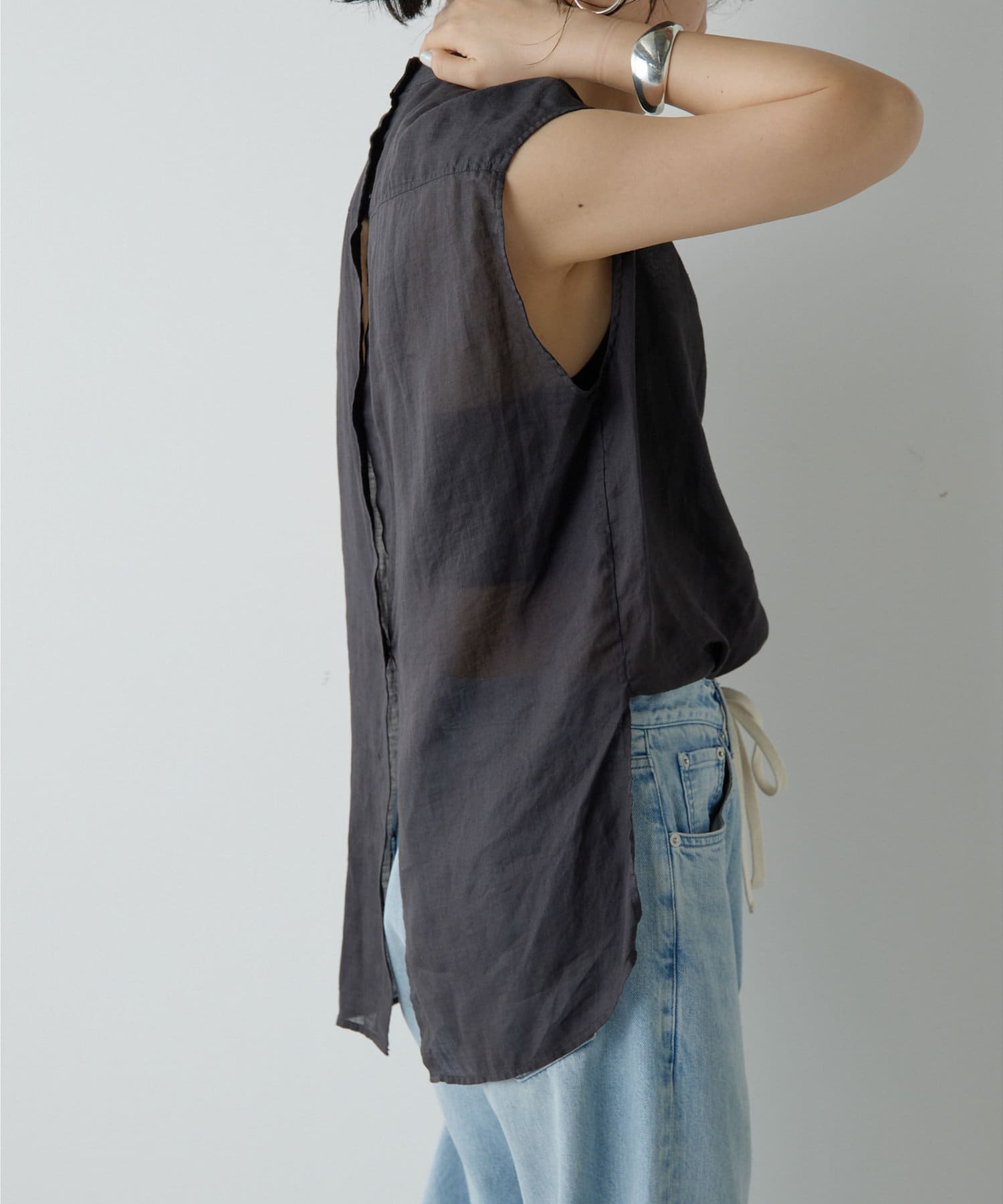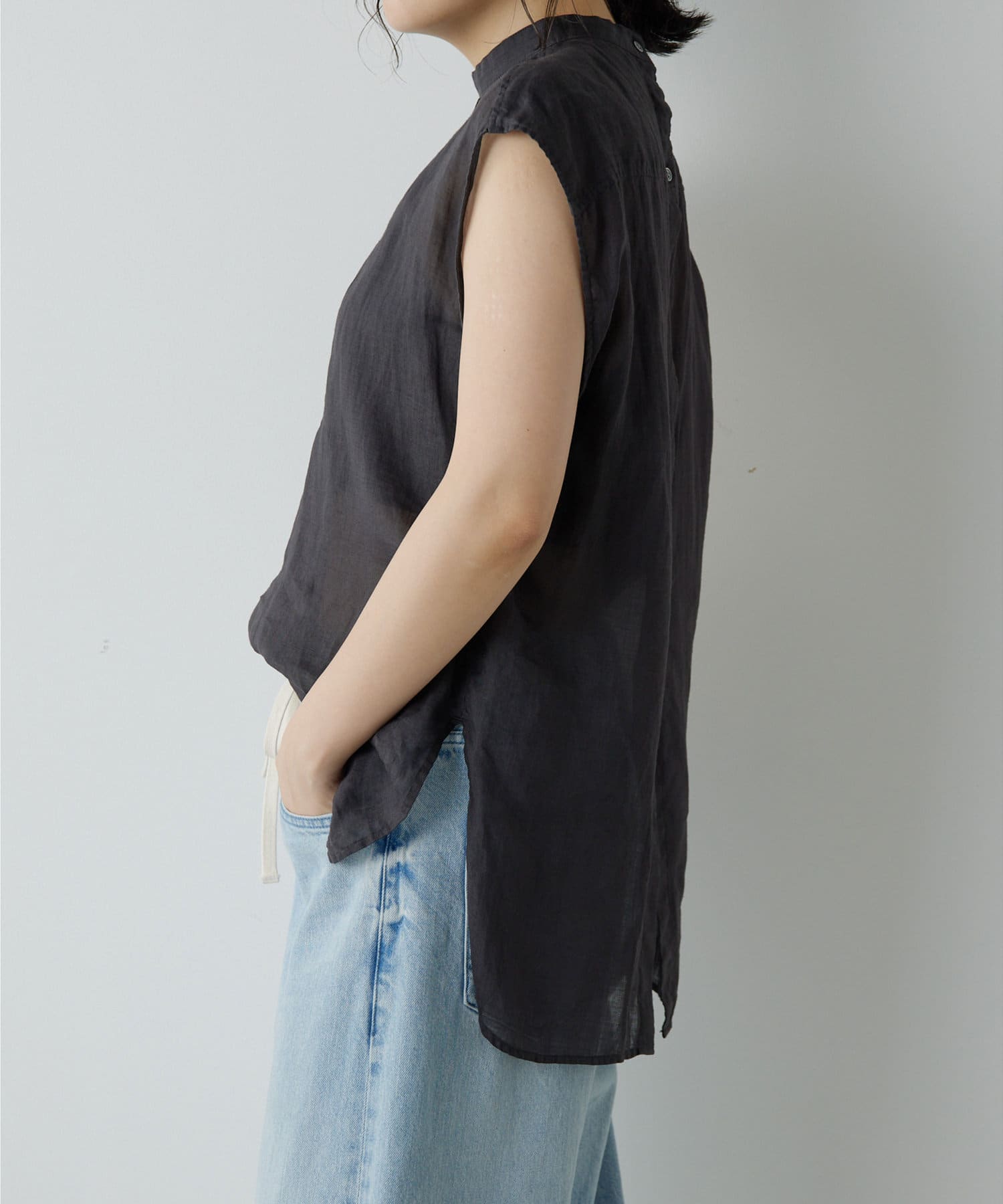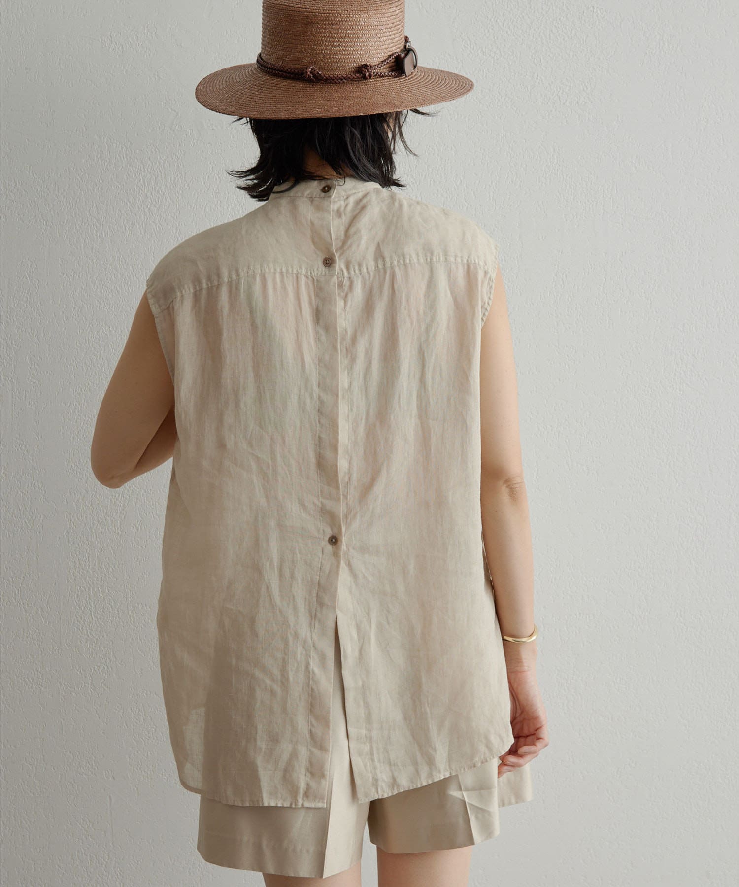 後ろボタン仕様で、後ろのスリットが抜け感を演出。程よい透け感とリネンのドライな雰囲気で、夏まで涼しくお召しいただけます。