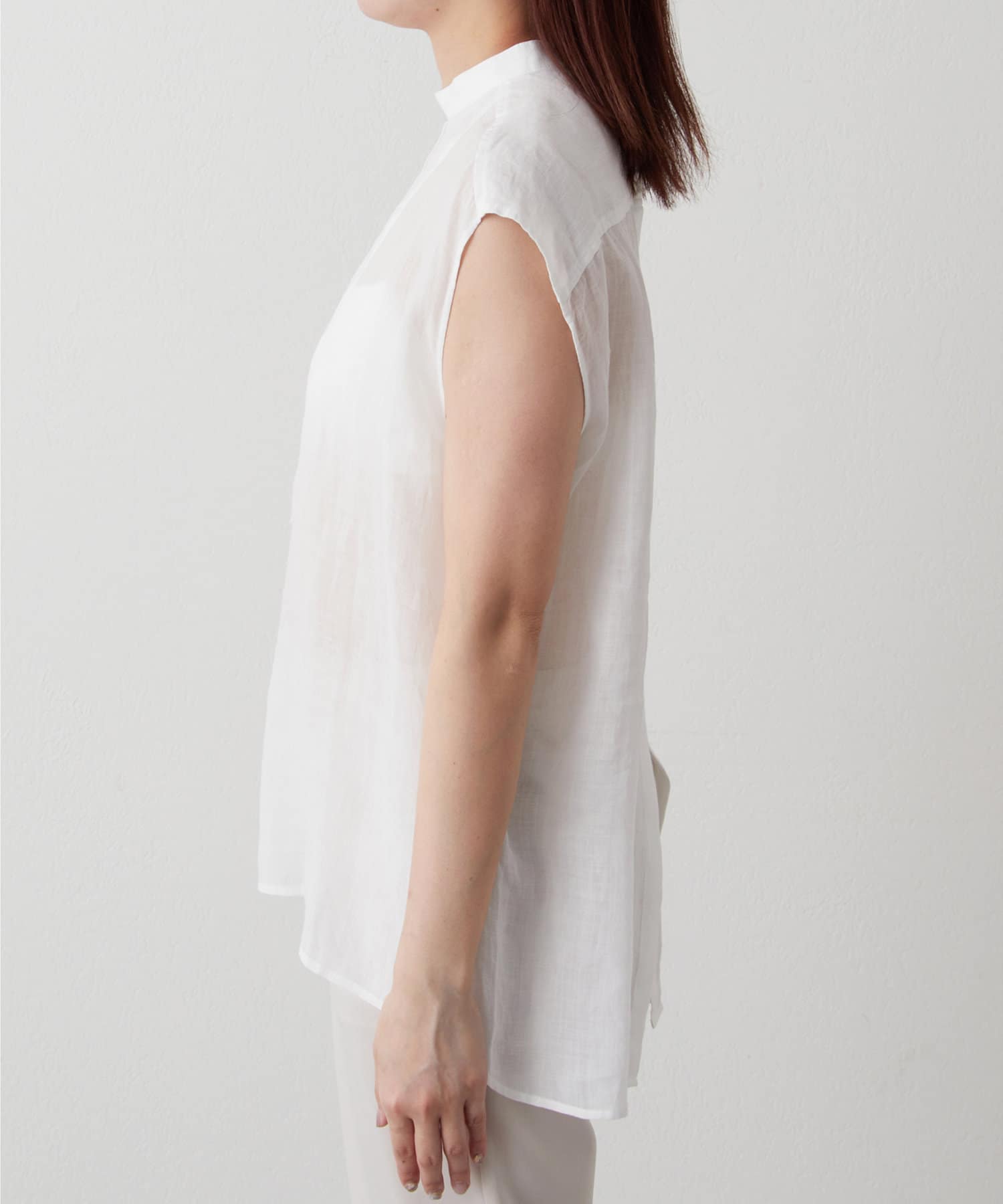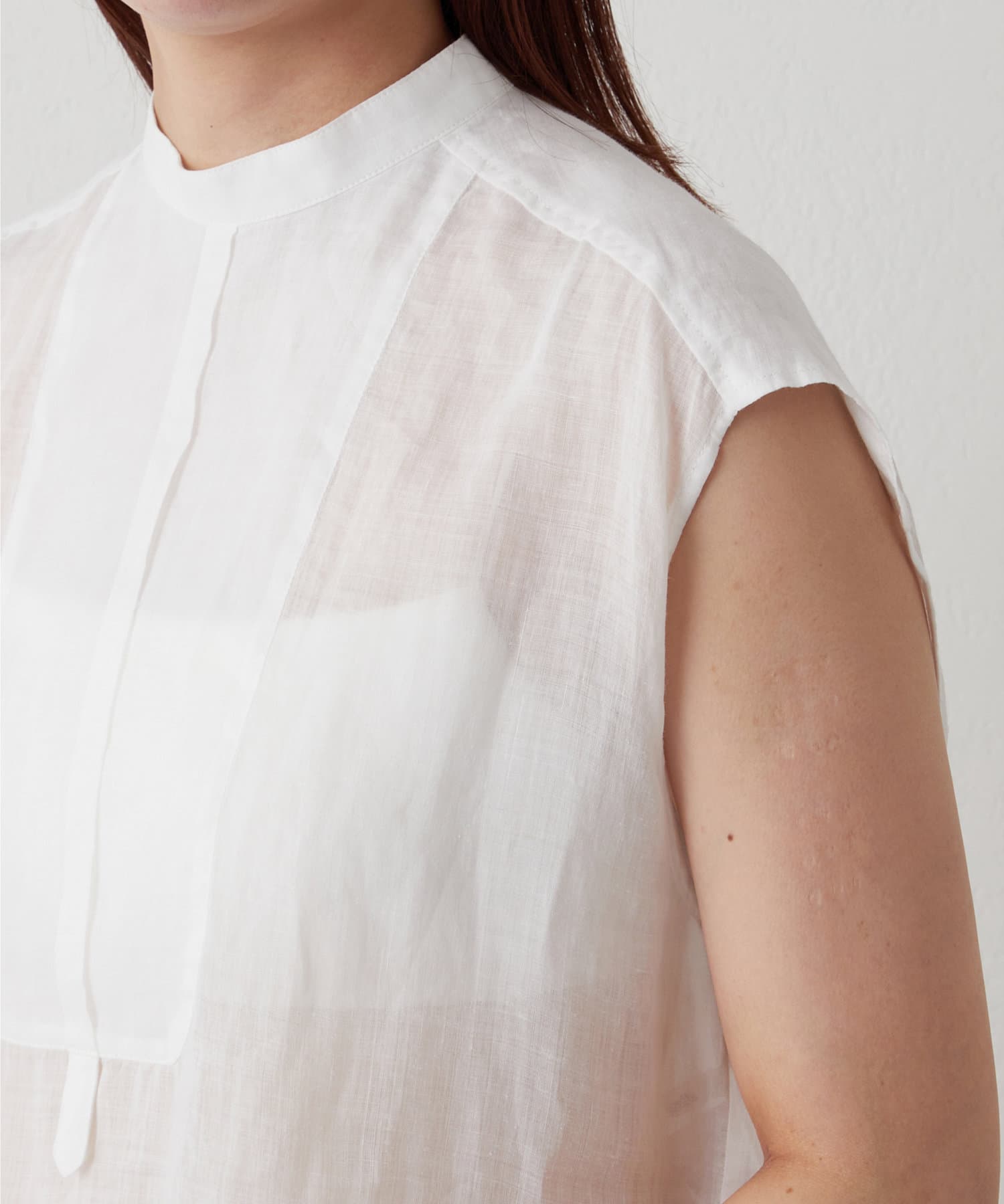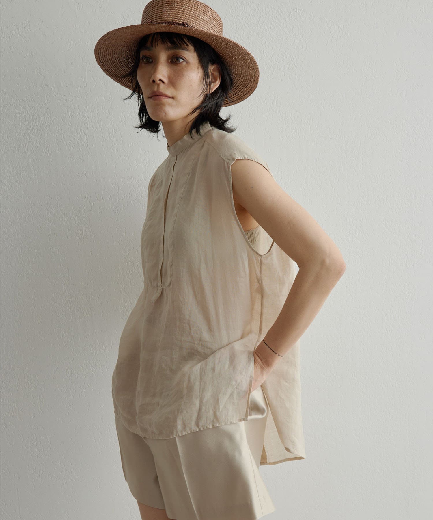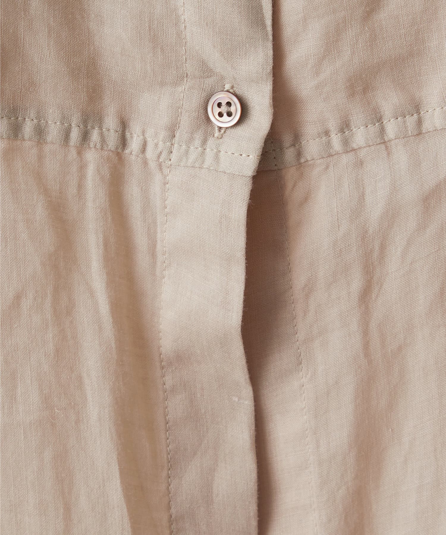 後ろボタン仕様で、後ろのスリットが抜け感を演出。程よい透け感とリネンのドライな雰囲気で、夏まで涼しくお召しいただけます。