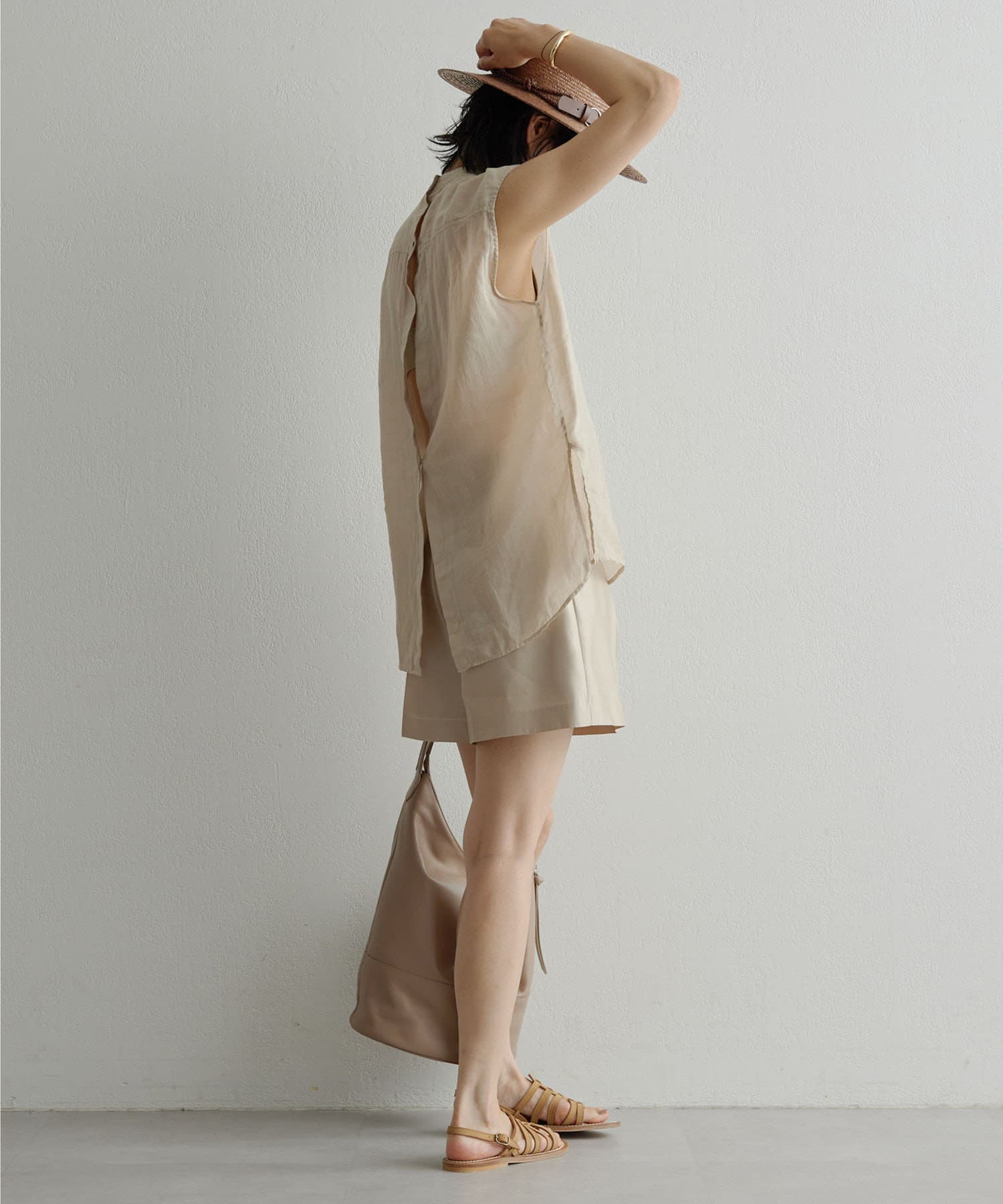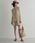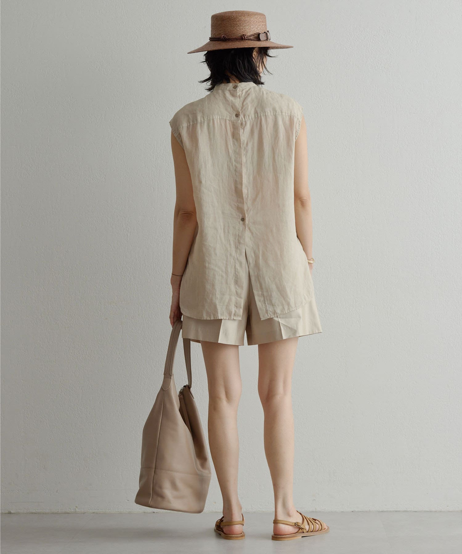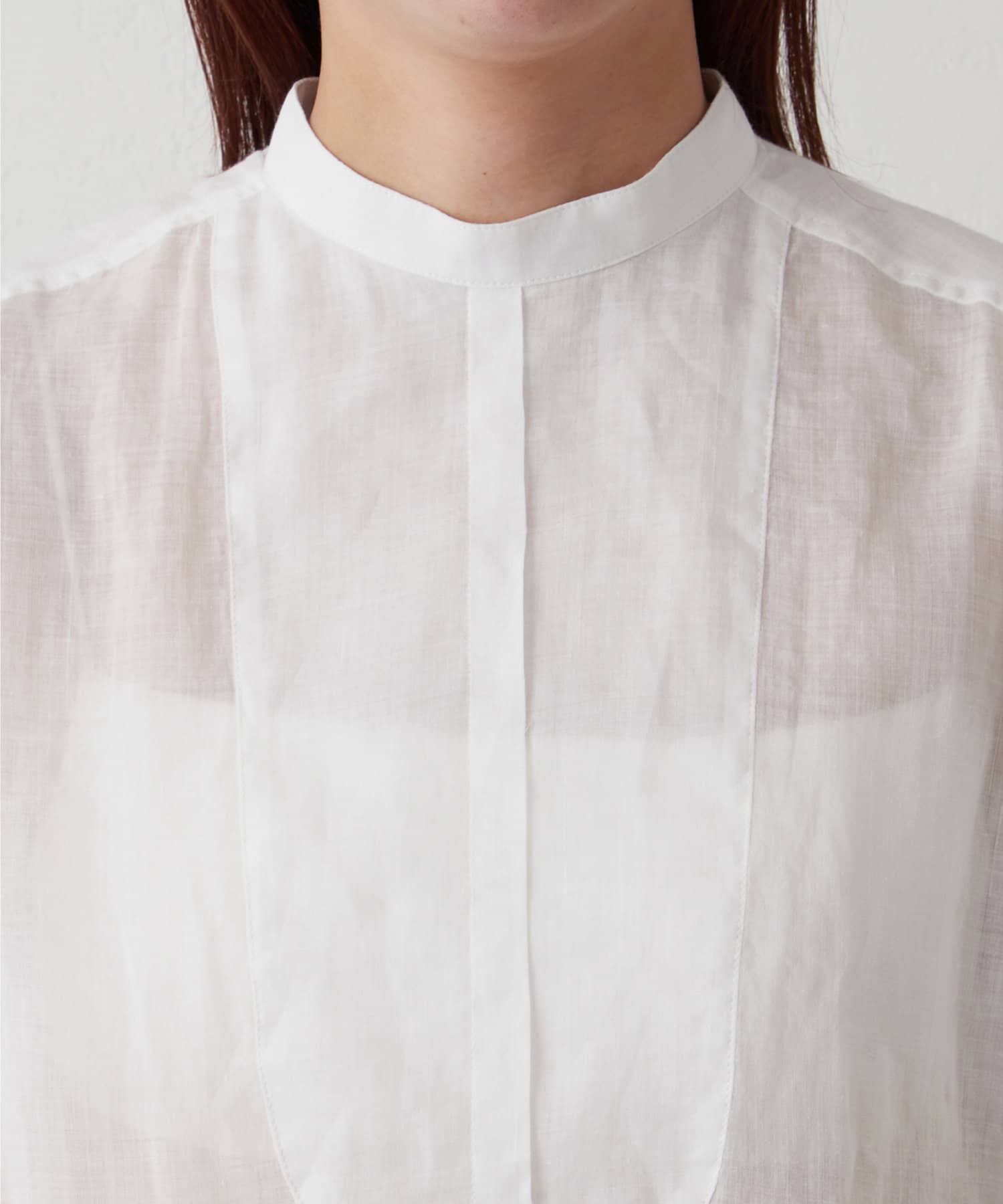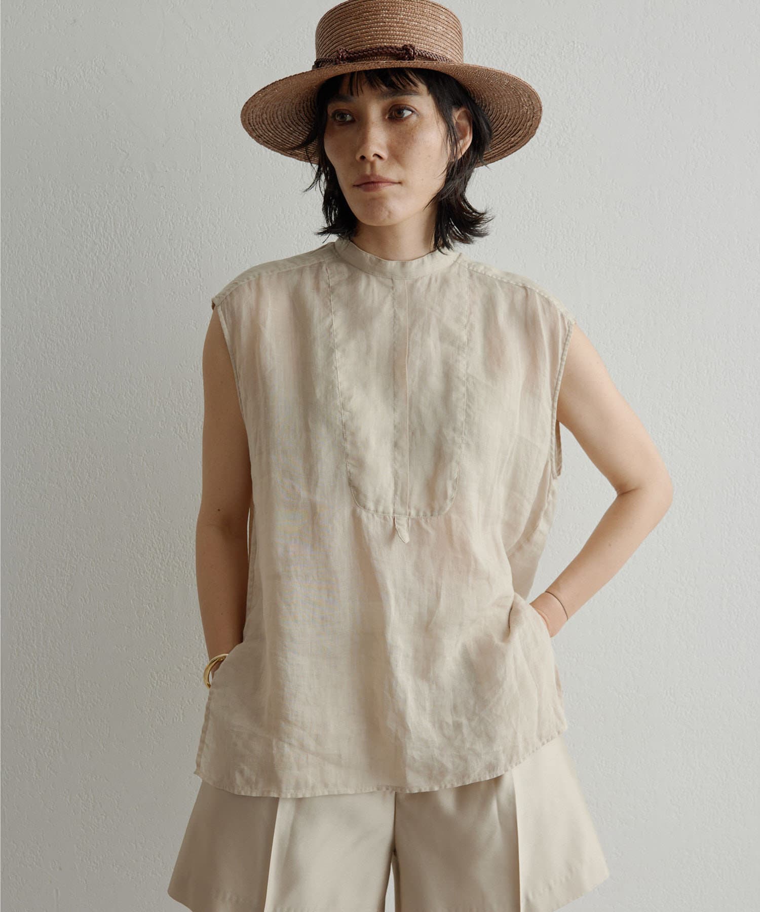 後ろボタン仕様で、後ろのスリットが抜け感を演出。程よい透け感とリネンのドライな雰囲気で、夏まで涼しくお召しいただけます。