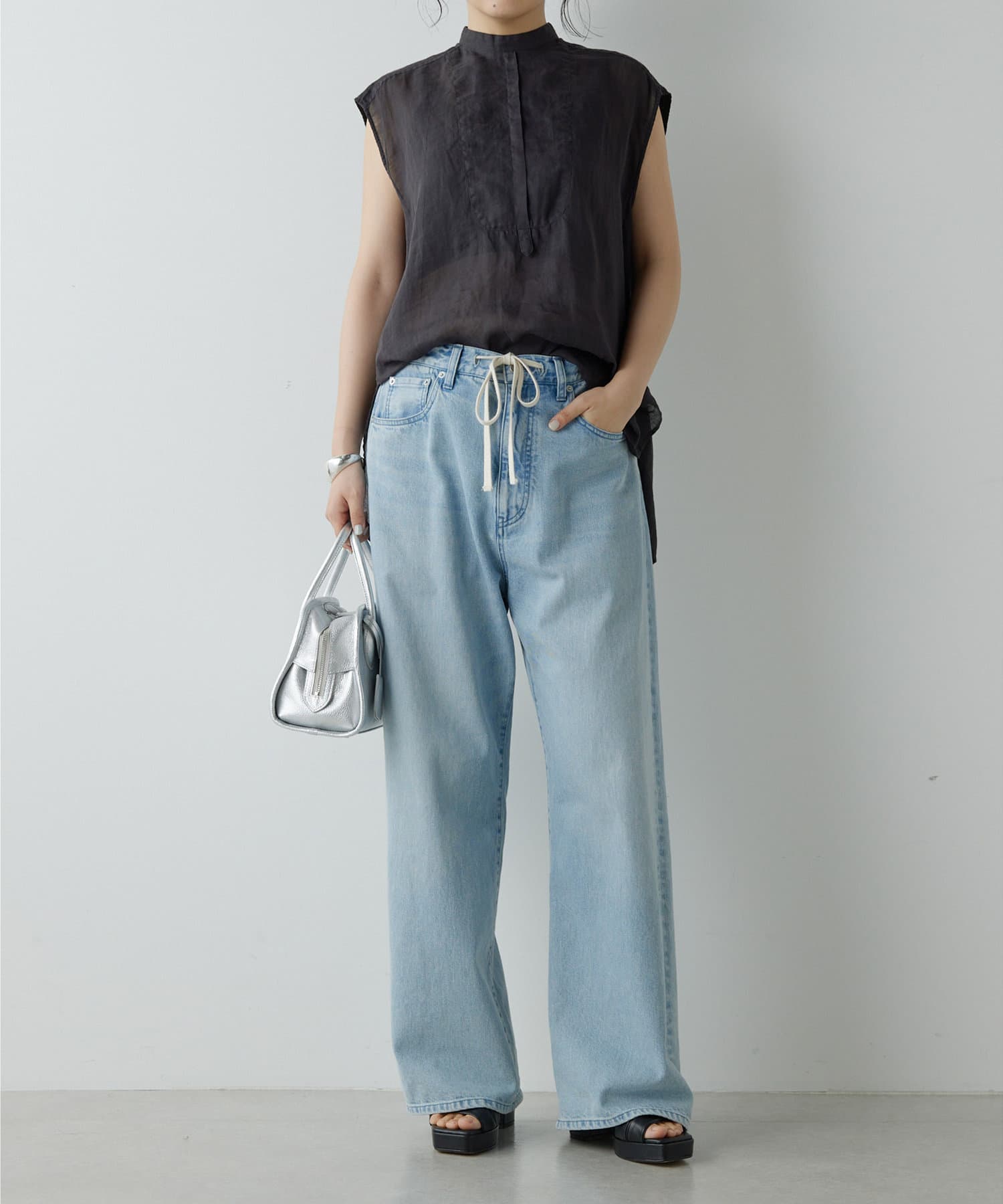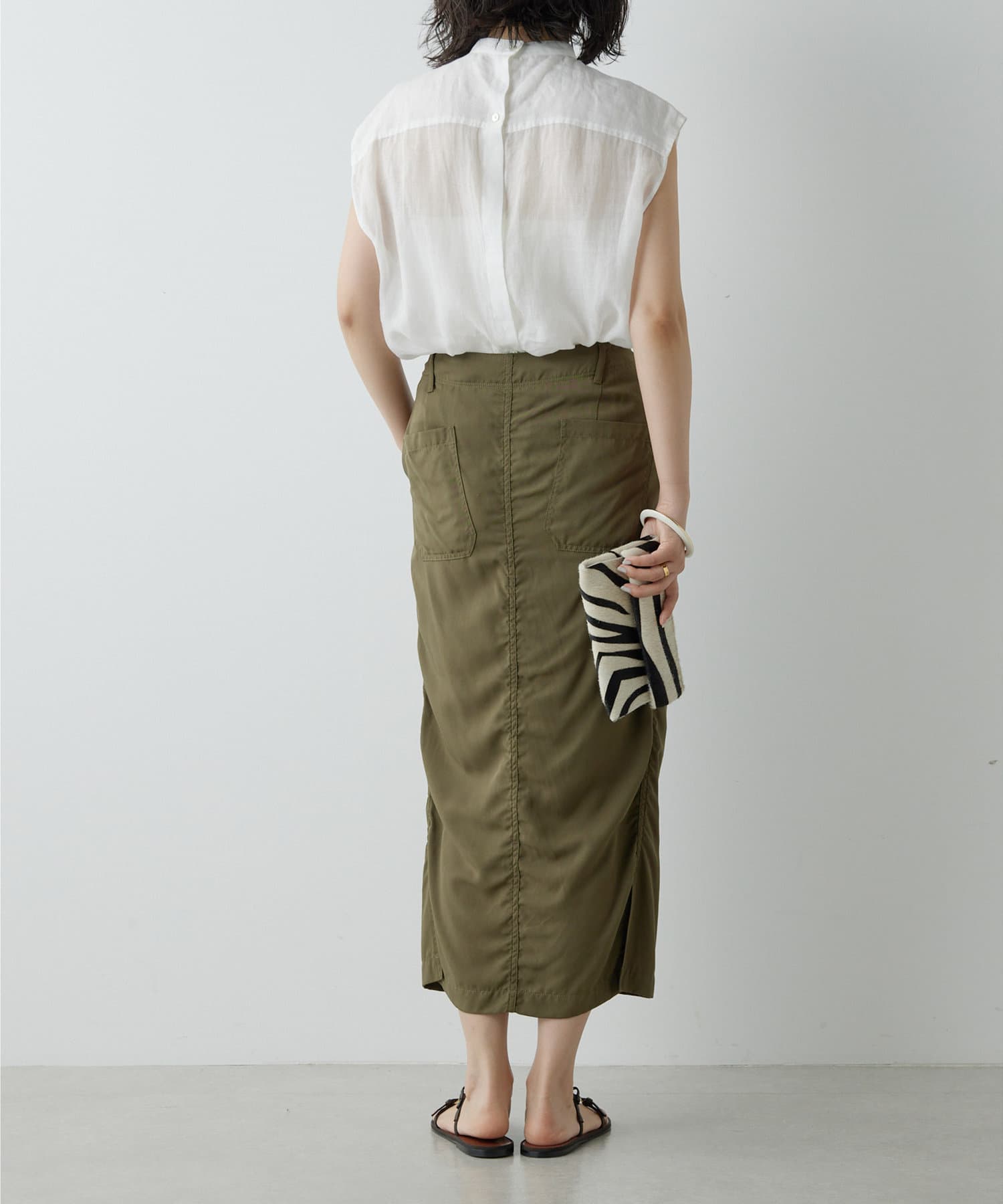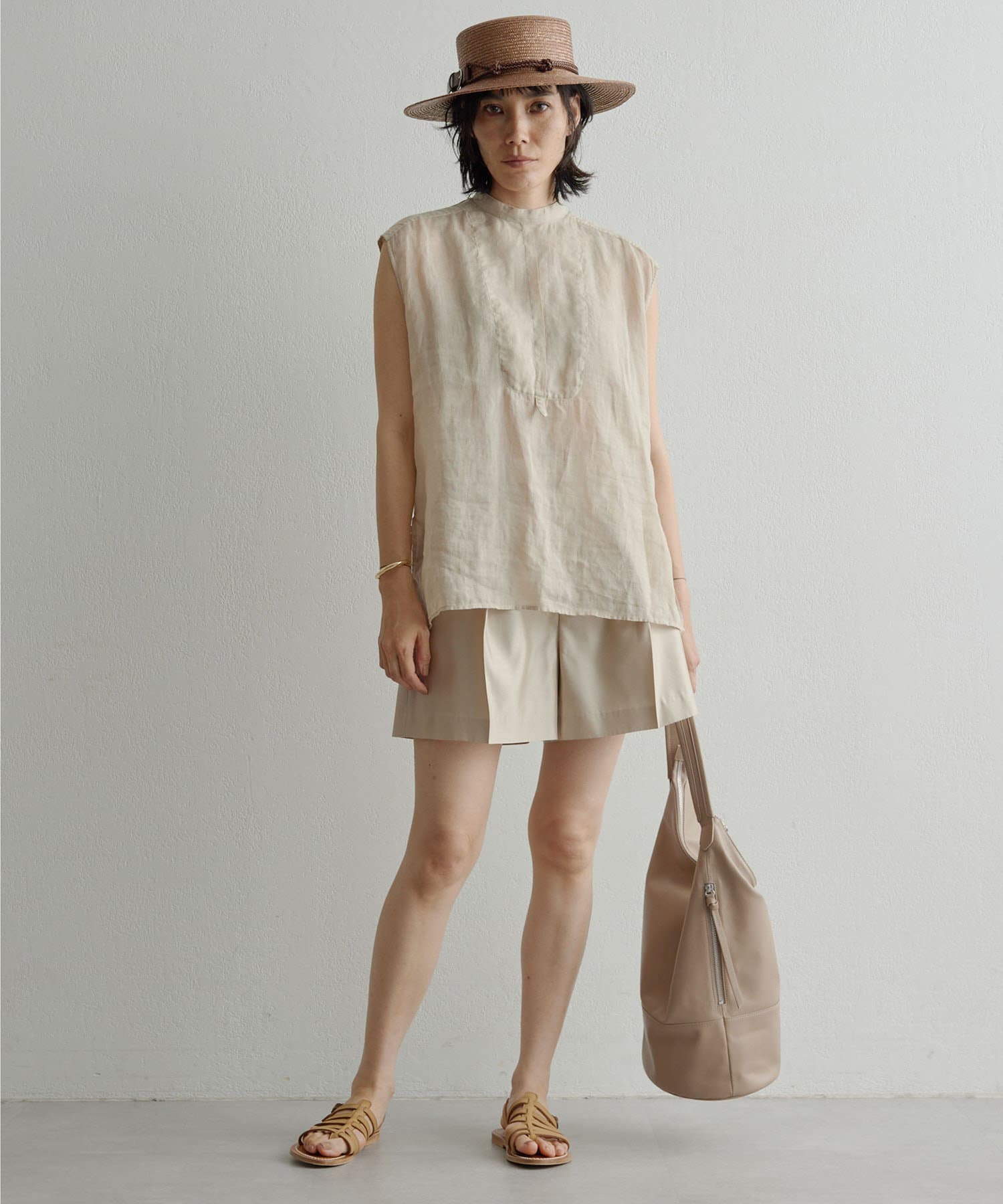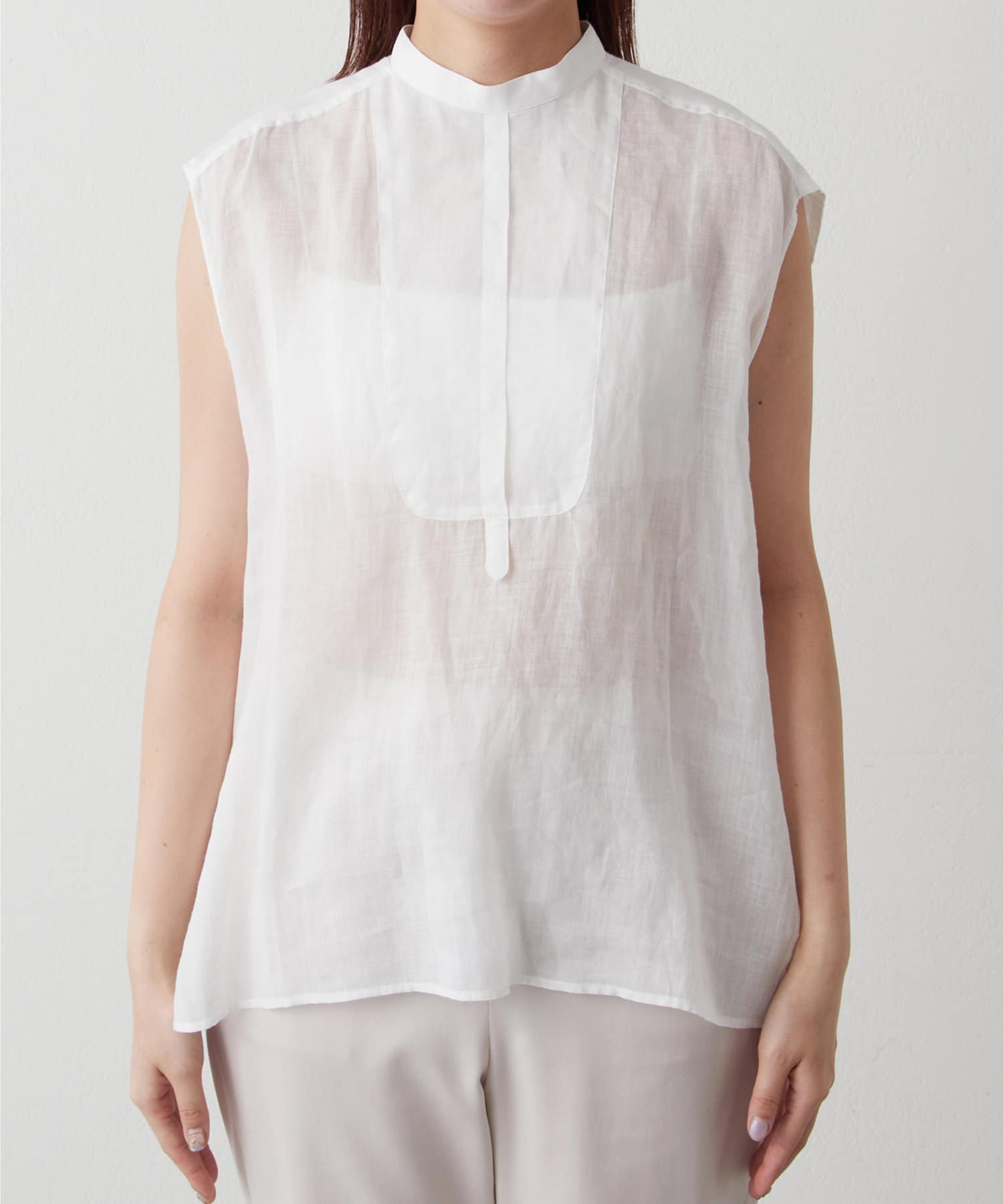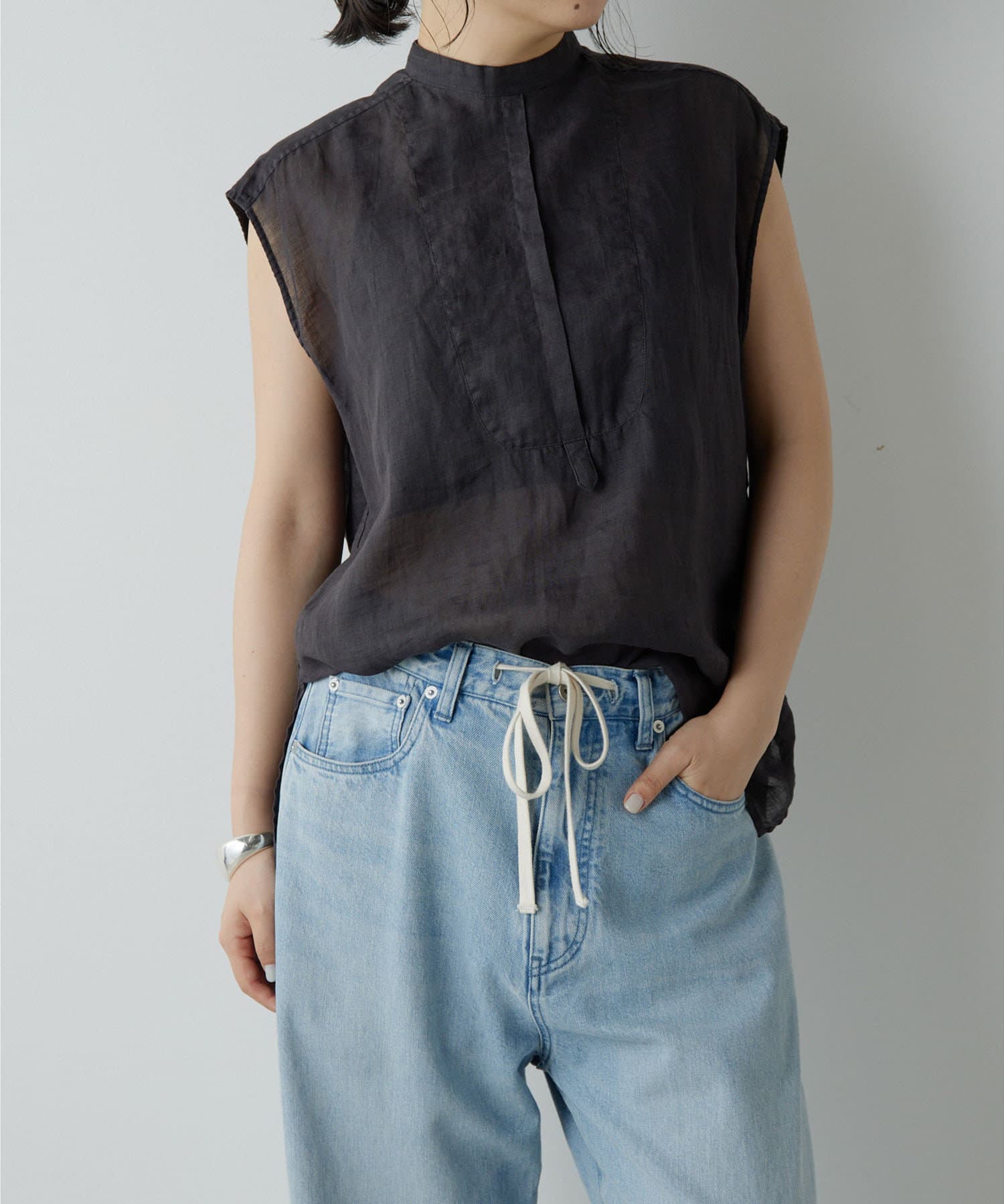 後ろボタン仕様で、後ろのスリットが抜け感を演出。程よい透け感とリネンのドライな雰囲気で、夏まで涼しくお召しいただけます。