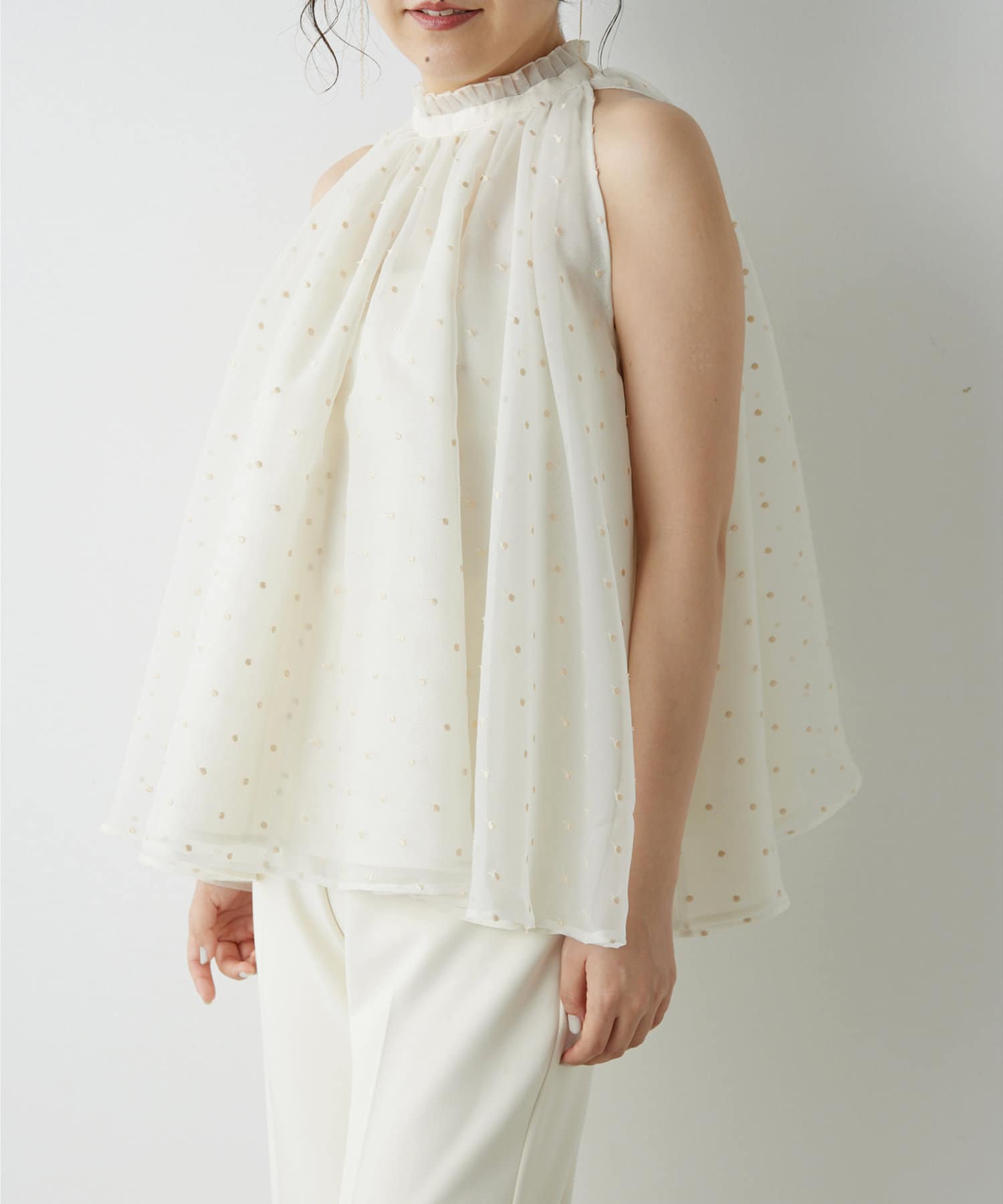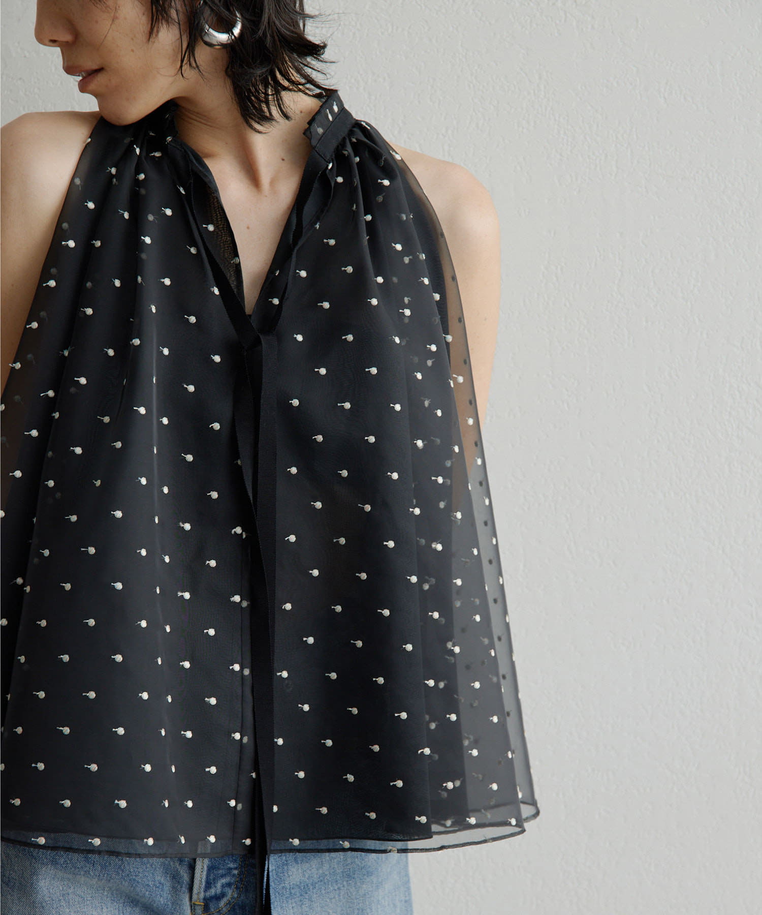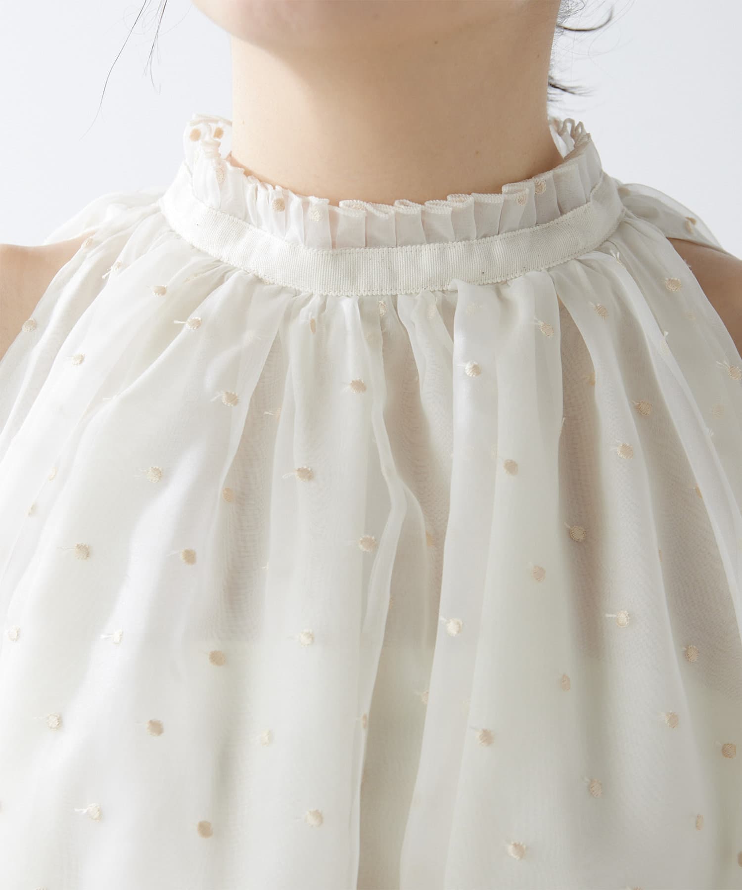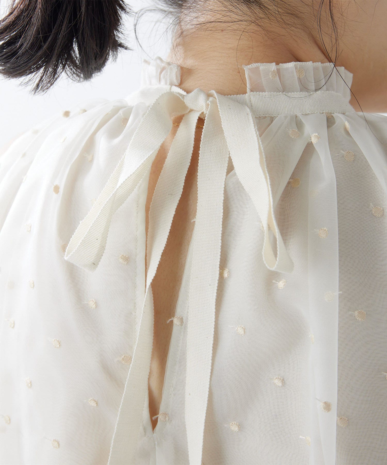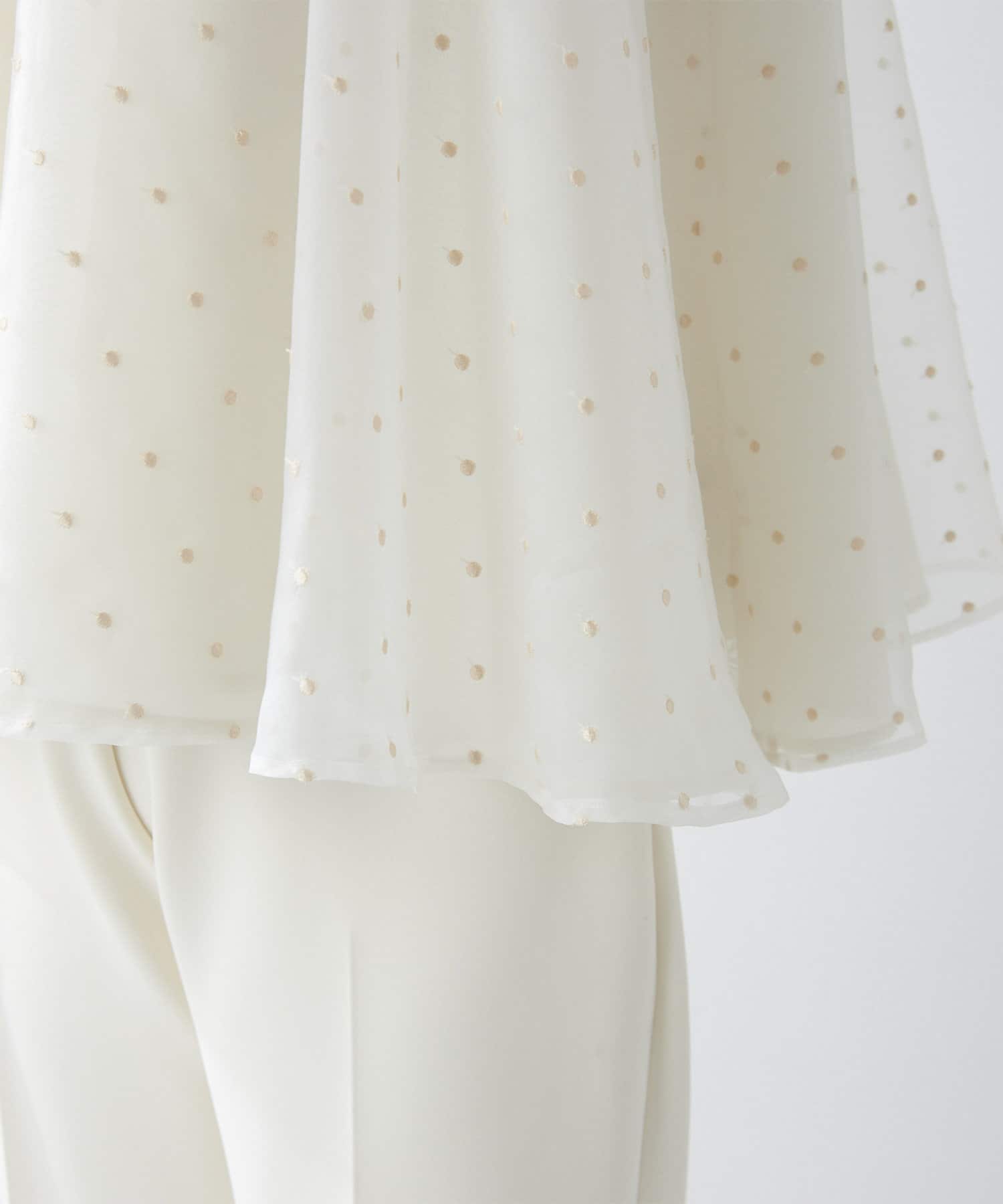 ■繊細なドット柄刺繍を施したオーガンジー素材が目を惹く一枚。