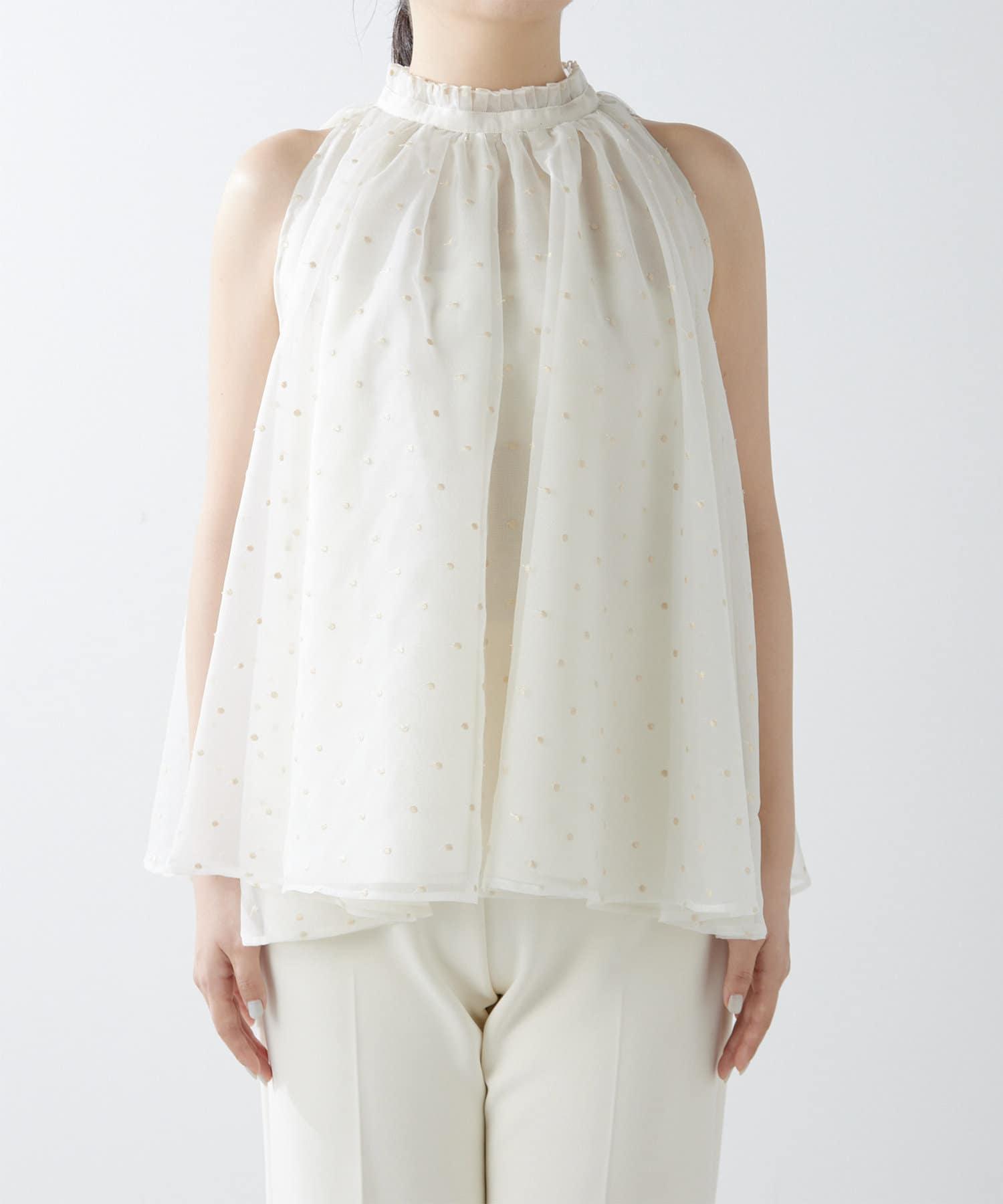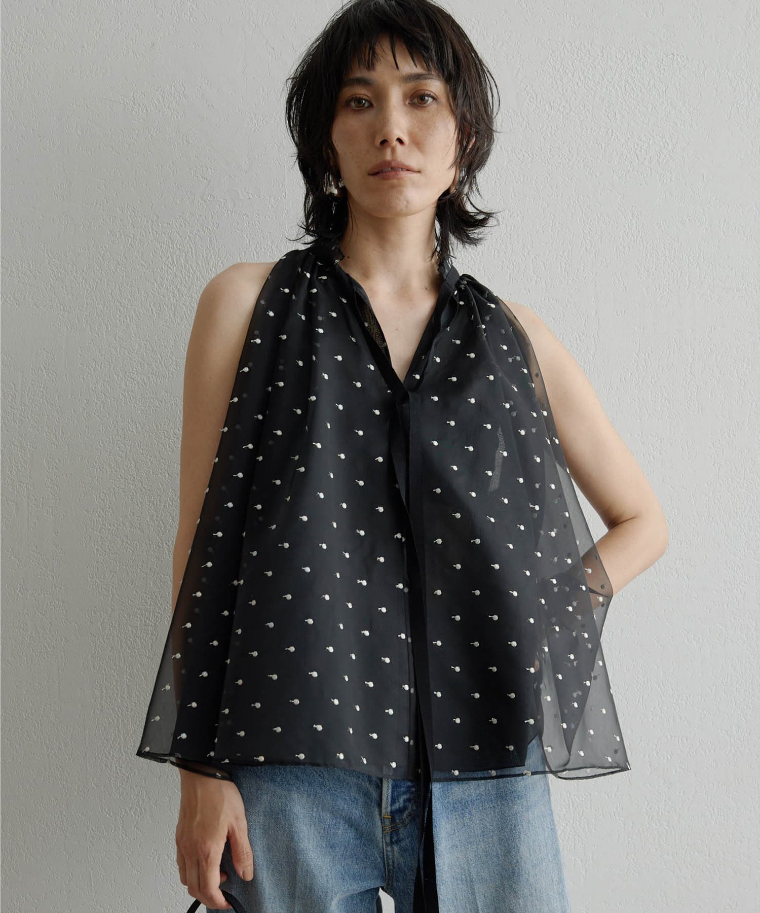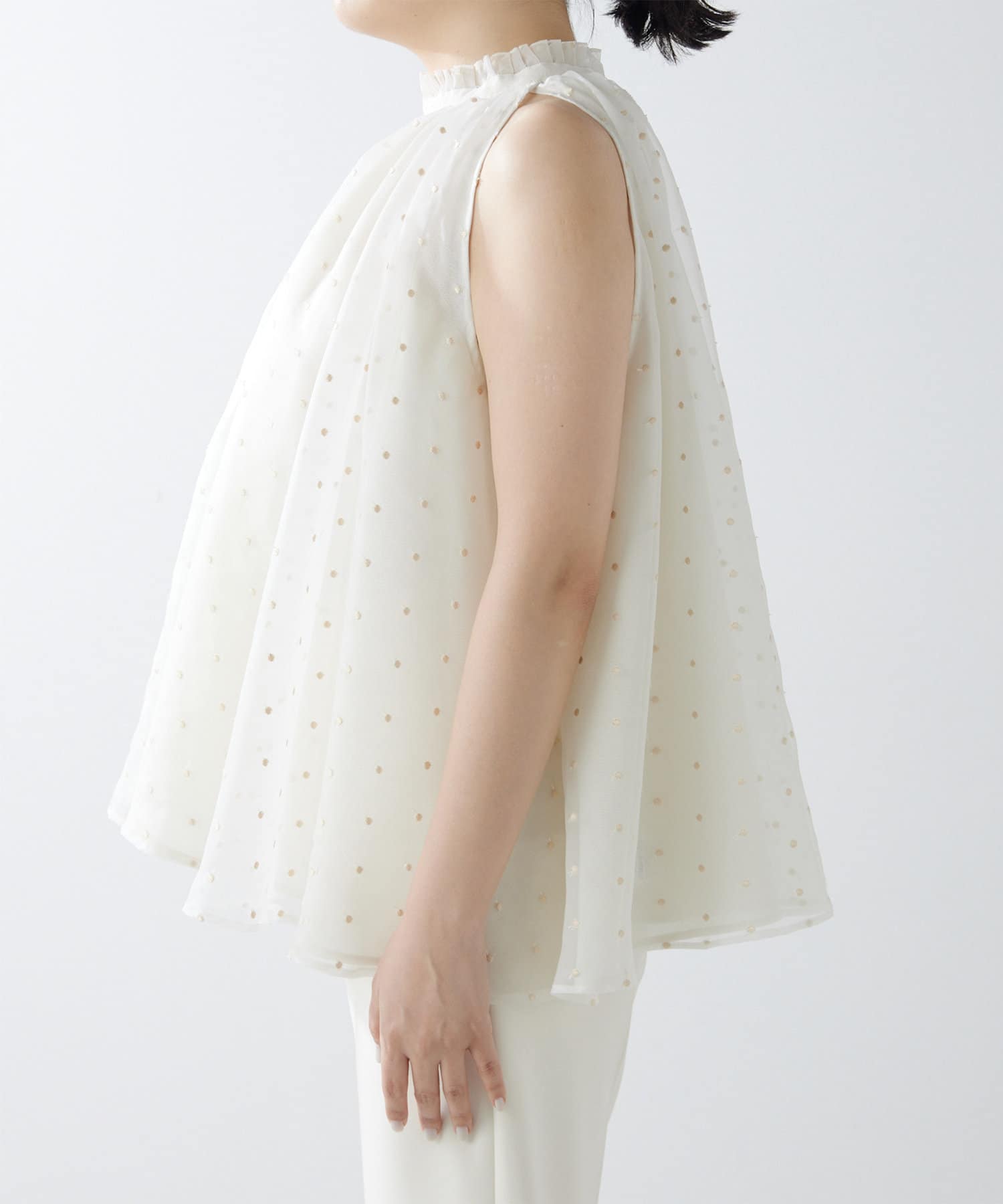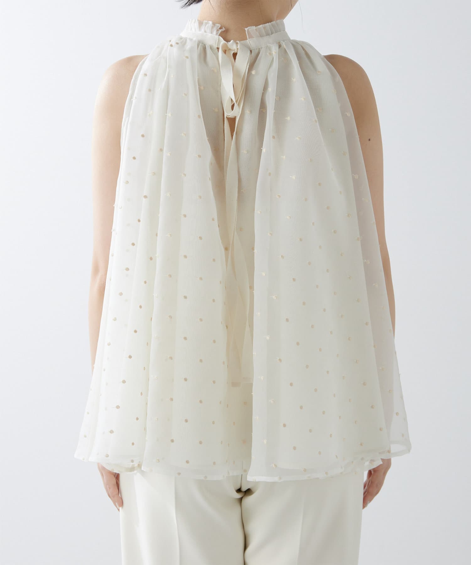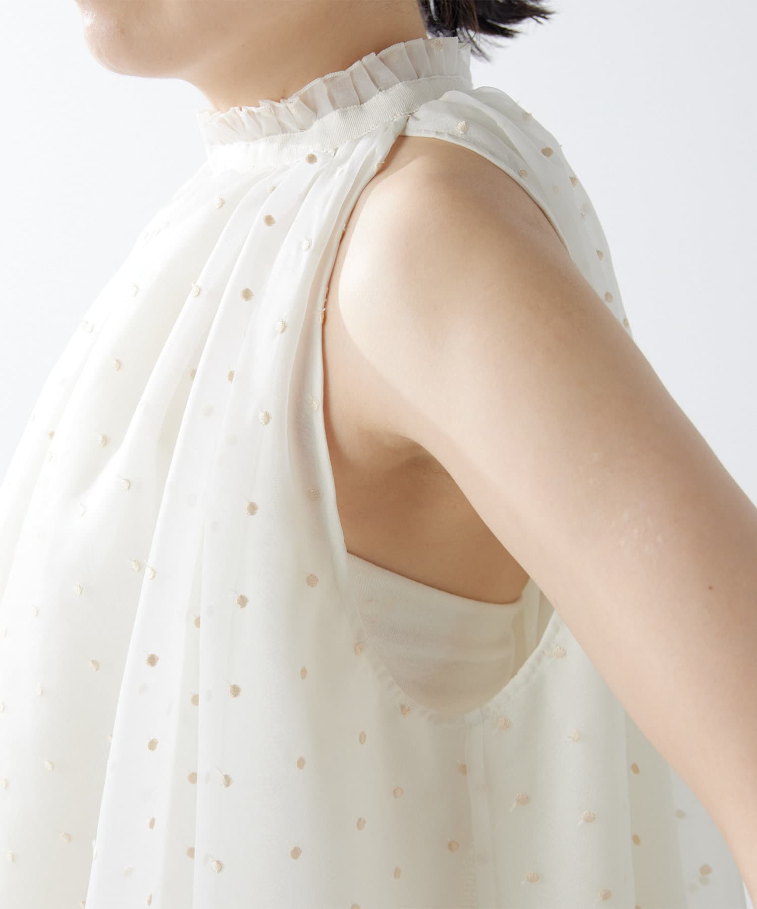 ■繊細なドット柄刺繍を施したオーガンジー素材が目を惹く一枚。