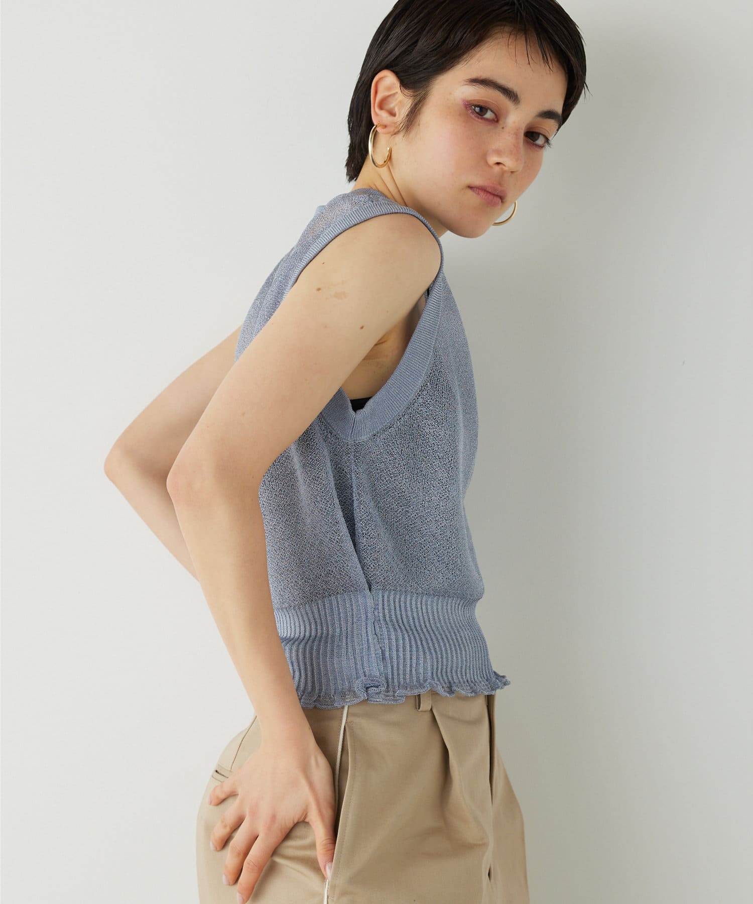 裾のデザインがかわいいノースリーブプルオーバー。コンパクトなサイズ感でヘルシーな肌見せが叶うニットです。