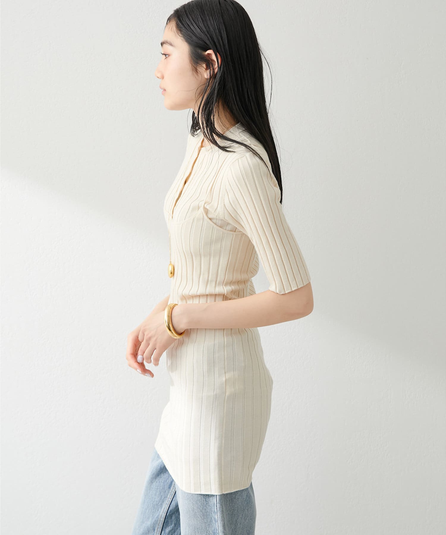 フィット感のあるシルエットがとても女性らしいです。柔らかい薄手のニットで着圧感はなくノンストレスな着心地でした。華奢な肩紐が素敵なので、コンパクトなカットソーやタンクトップの上にレイヤードするのもおすすめです。