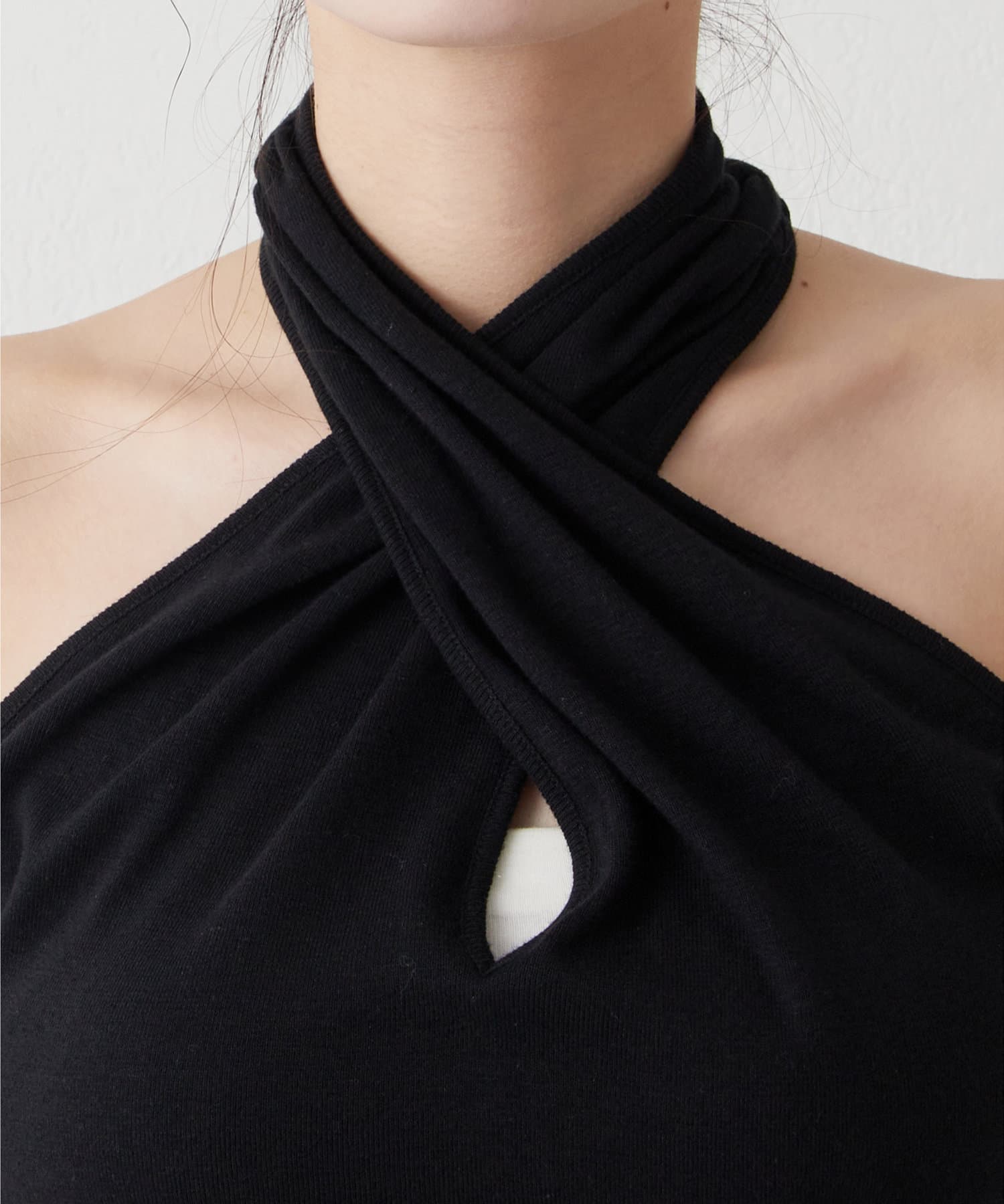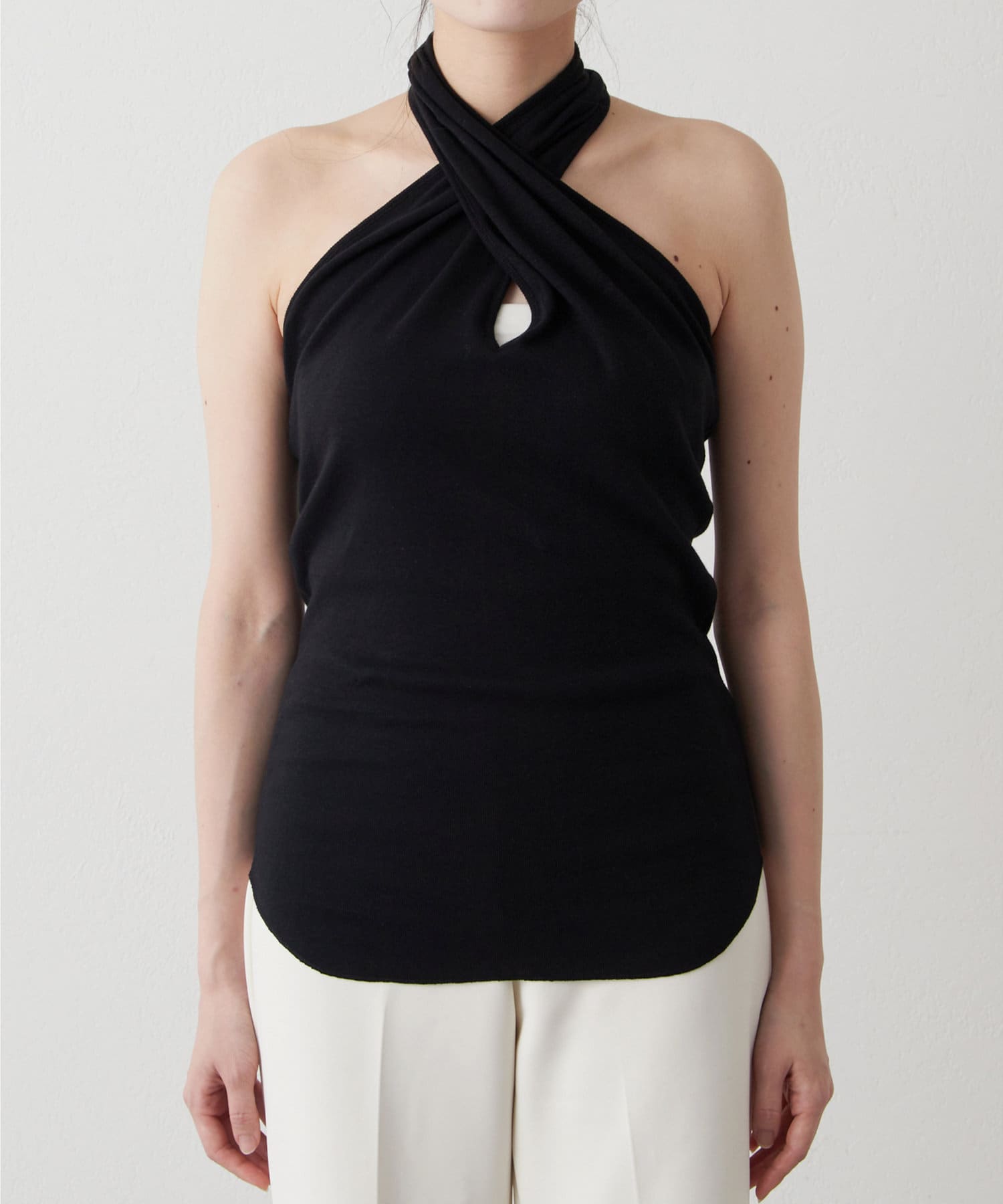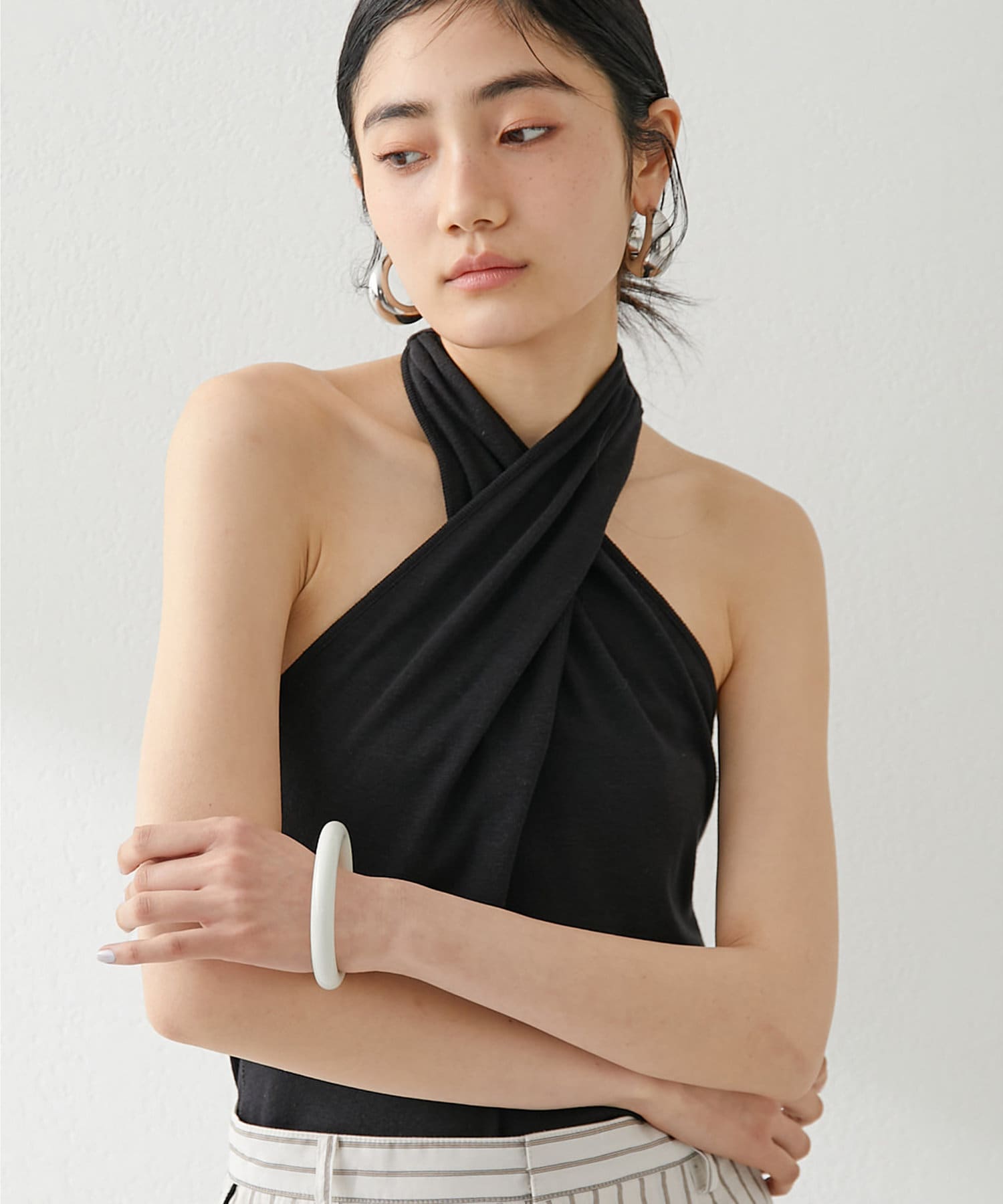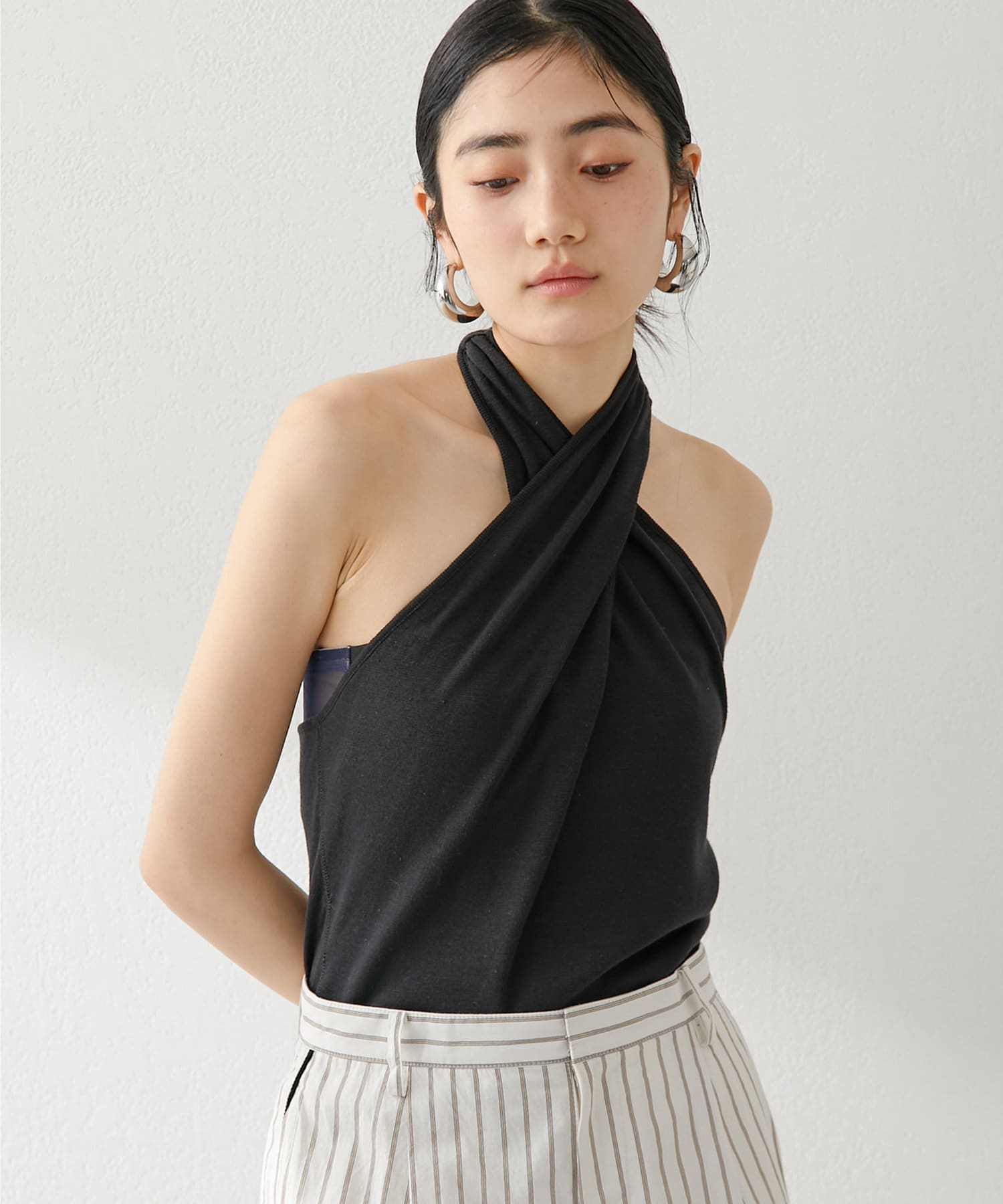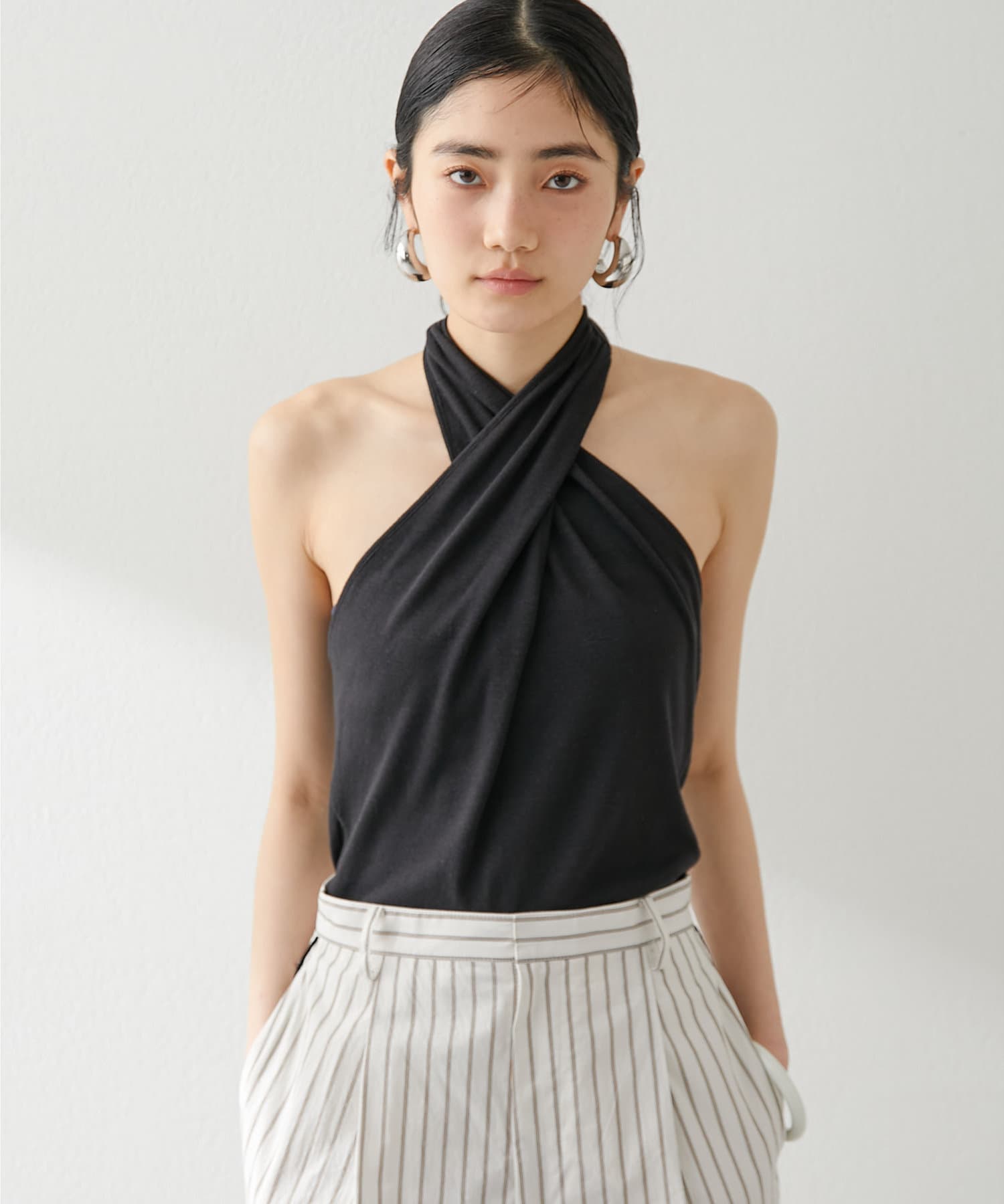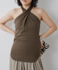 ■ツイストデザインのホルターネックが特徴的なトップス。