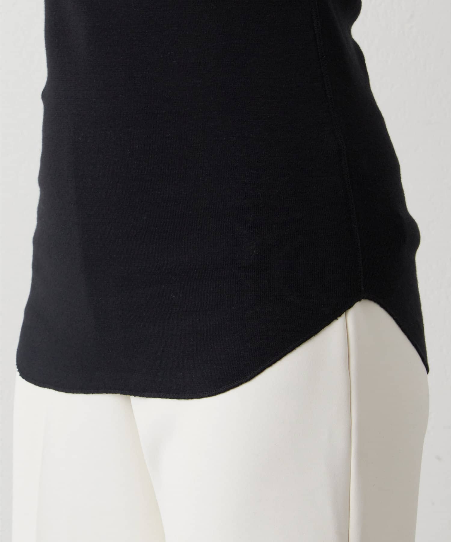 伸縮性のある生地で着心地も良く、脱ぎ着も楽にしていただけます。胸周りはフィット感がありますが、身幅はゆったりとし、ボディラインを拾わず安心。裾がラウンドカットになっているので、タックアウトスタイルもおすすめ。