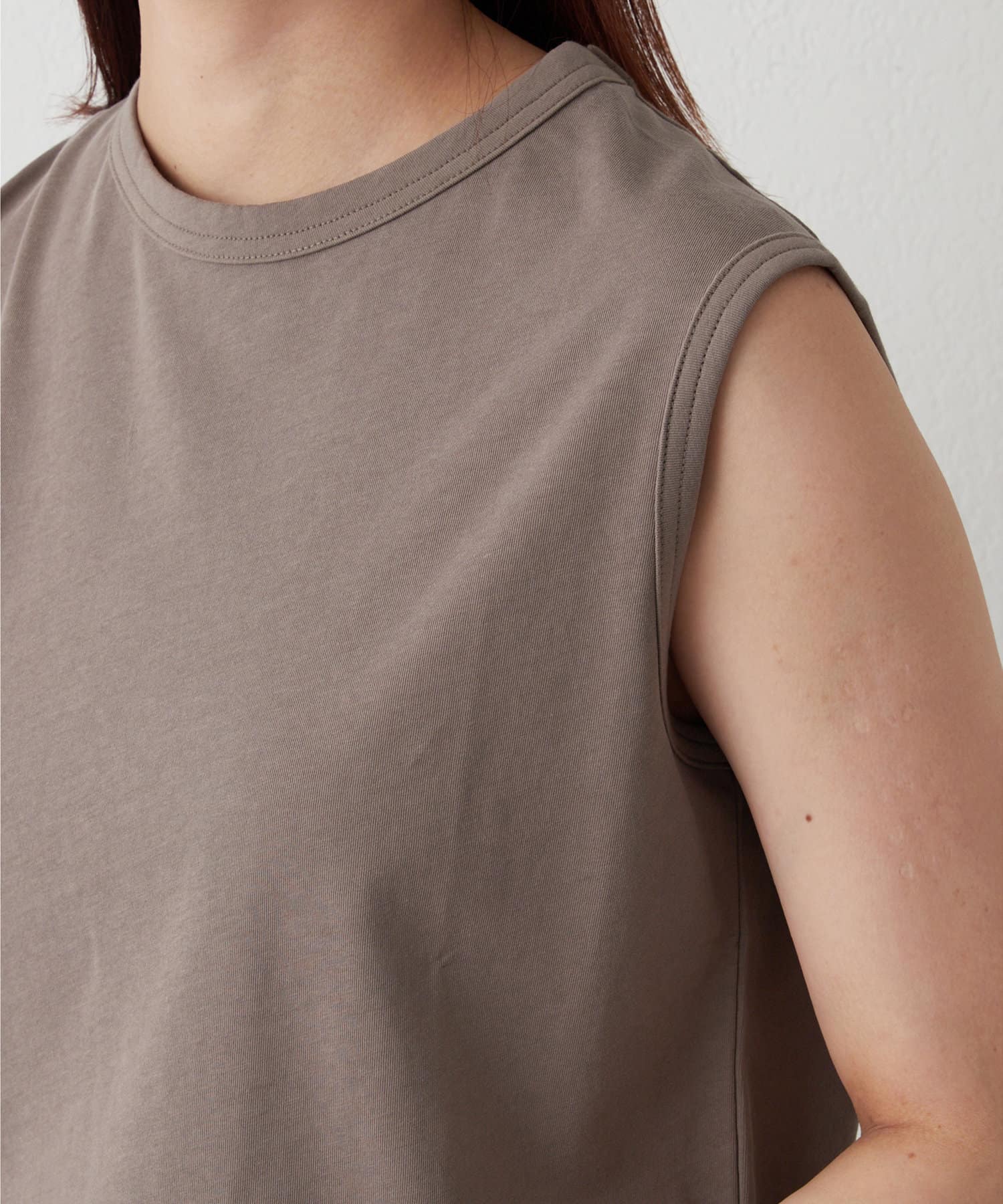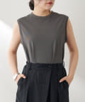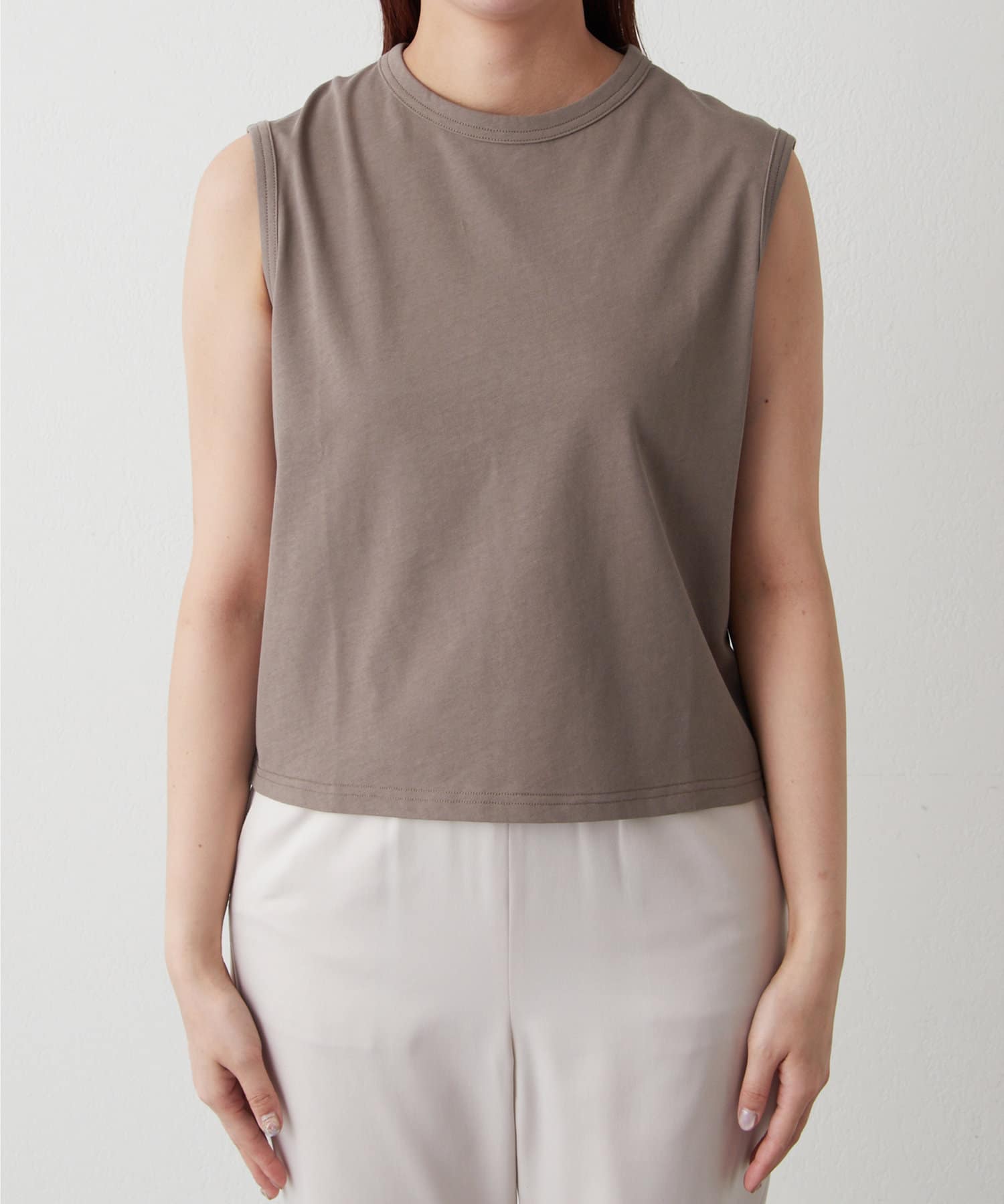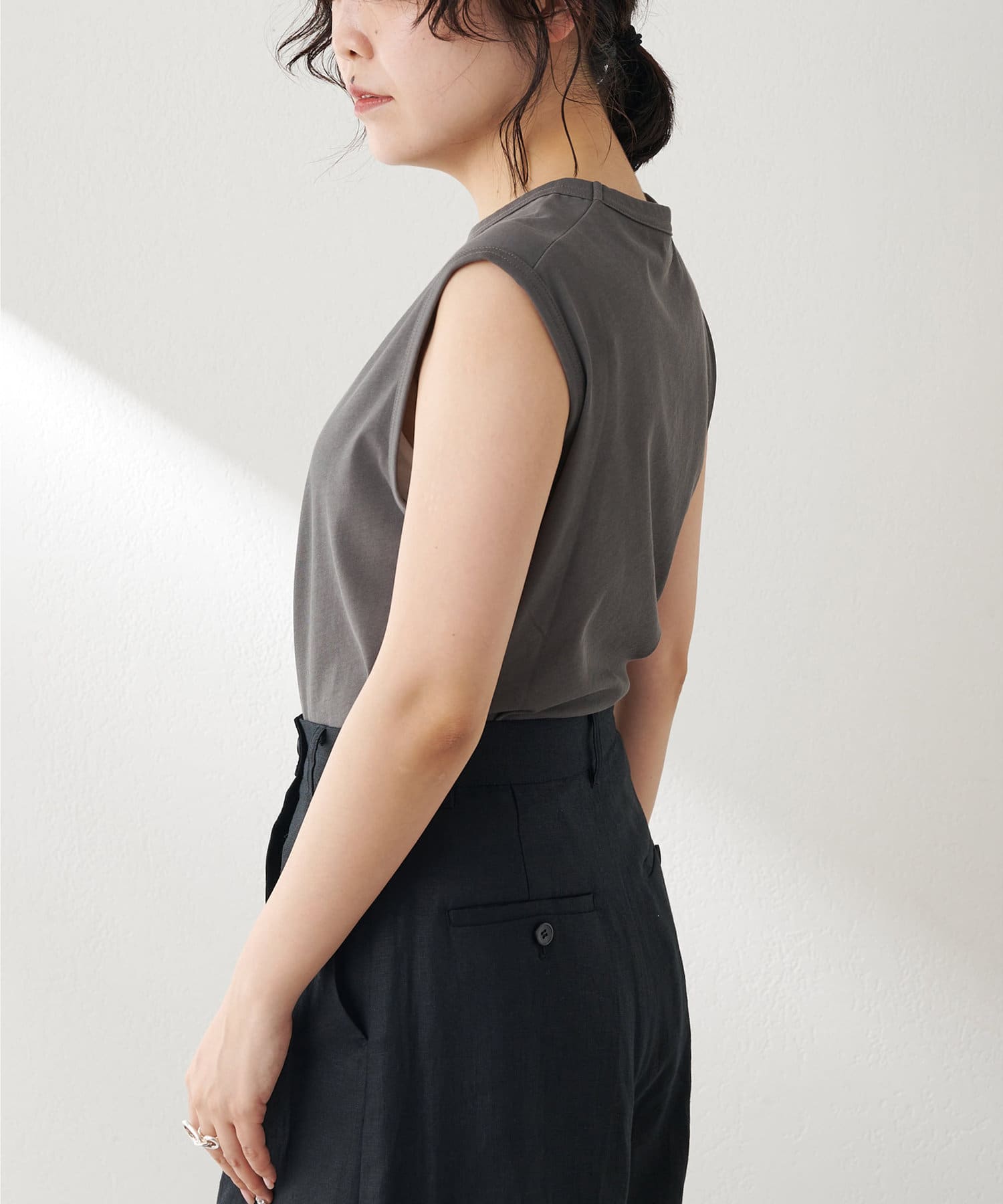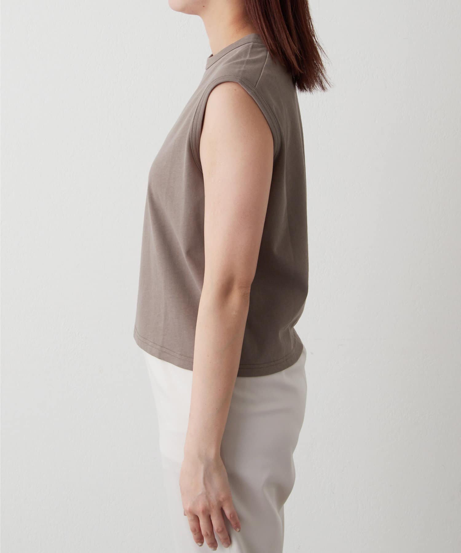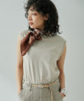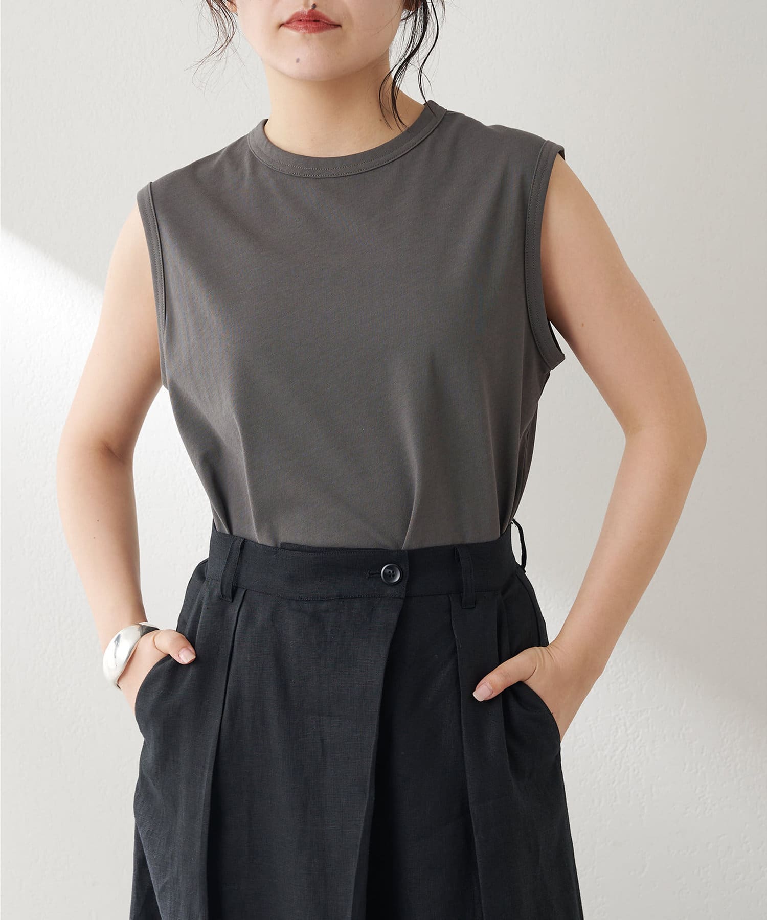 肩をカバーしてくれるノースリーブカットソー。気になる脇肉も見えないアームのラインが絶妙です。これこそ1枚で様になる1着。シンプルですがこういう垢抜けアイテムは欠かせません。