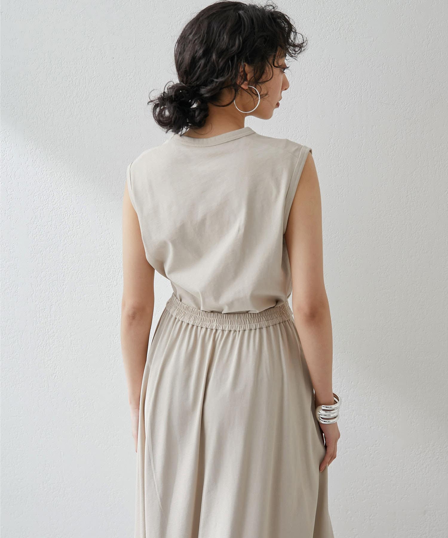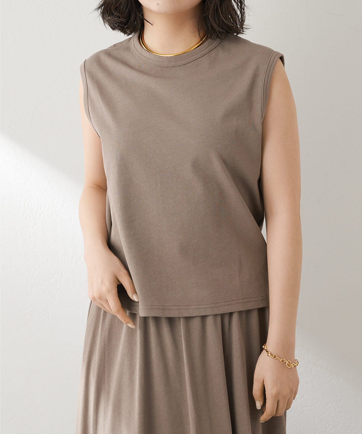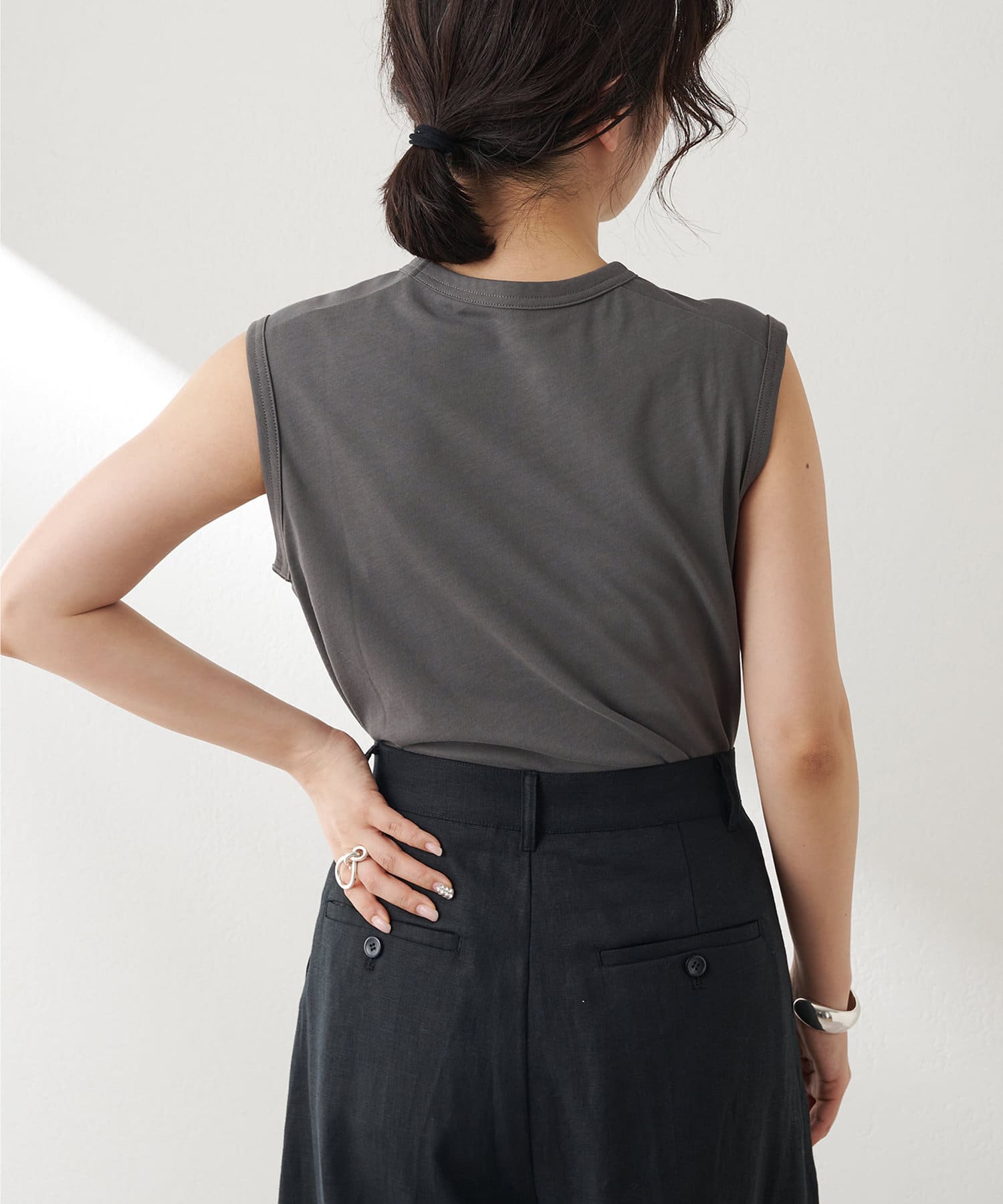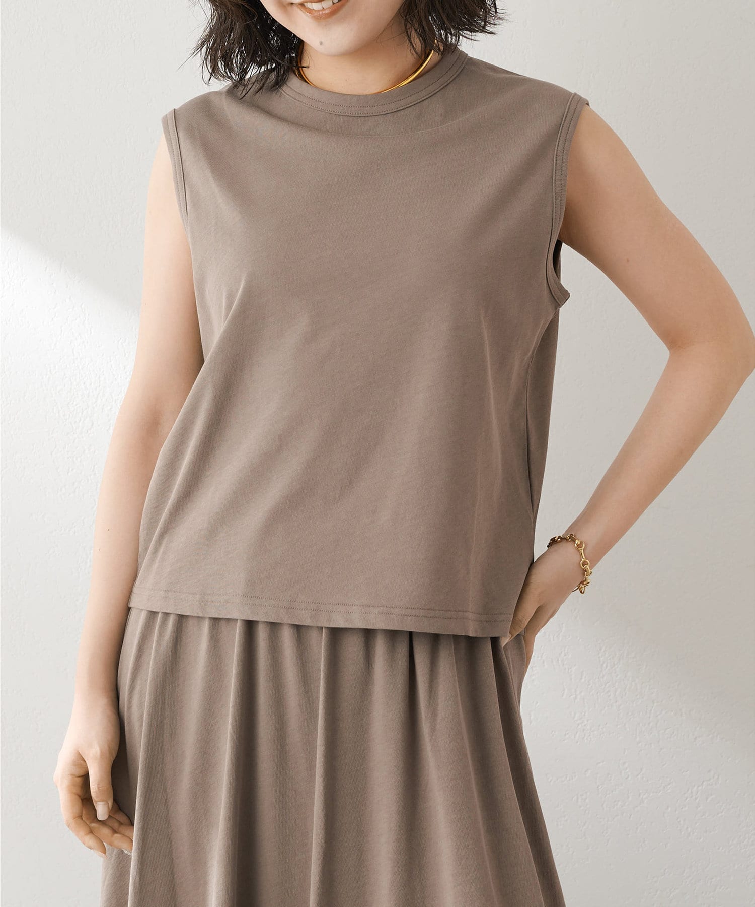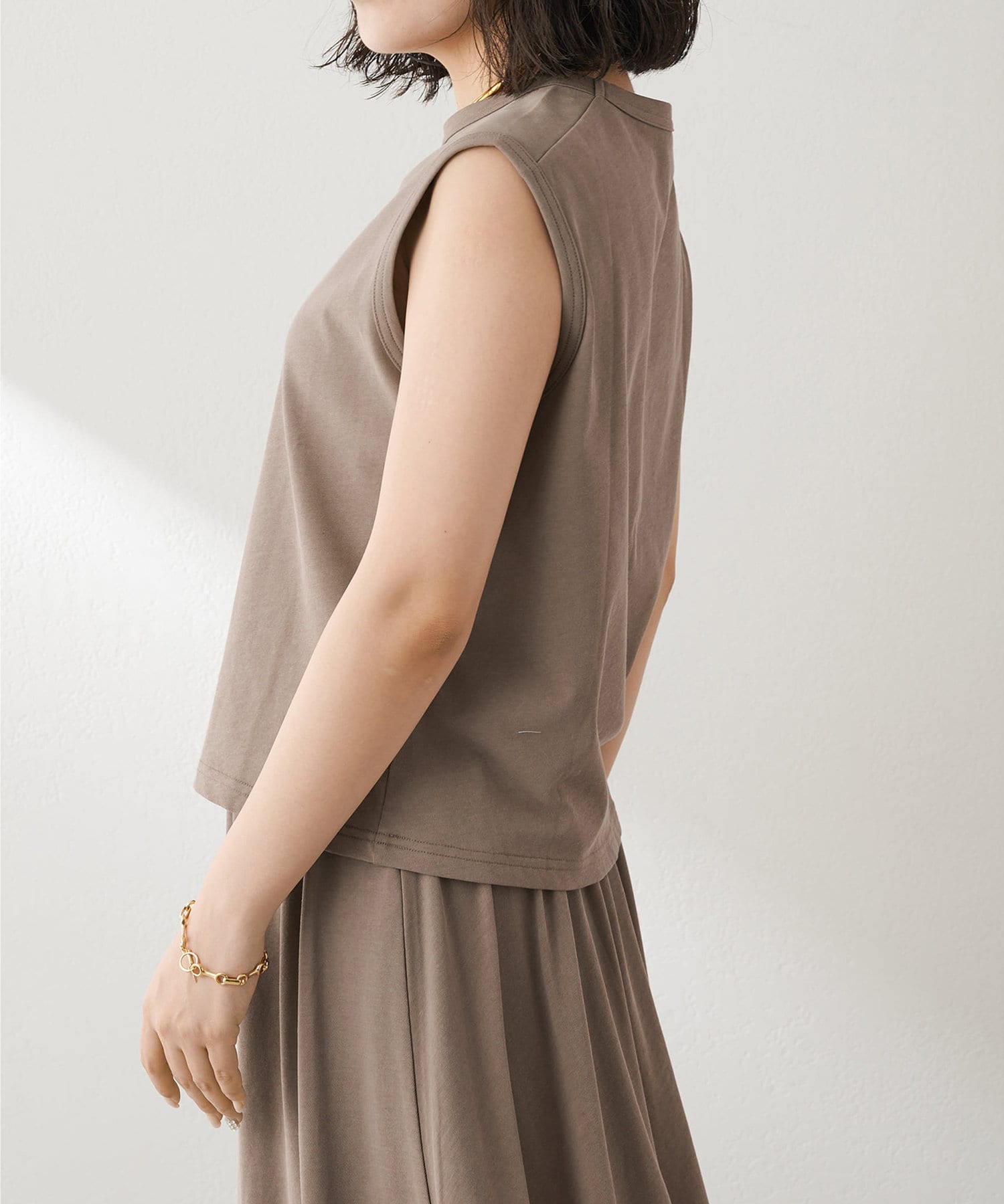 肩をカバーしてくれるノースリーブカットソー。気になる脇肉も見えないアームのラインが絶妙です。これこそ1枚で様になる1着。シンプルですがこういう垢抜けアイテムは欠かせません。