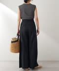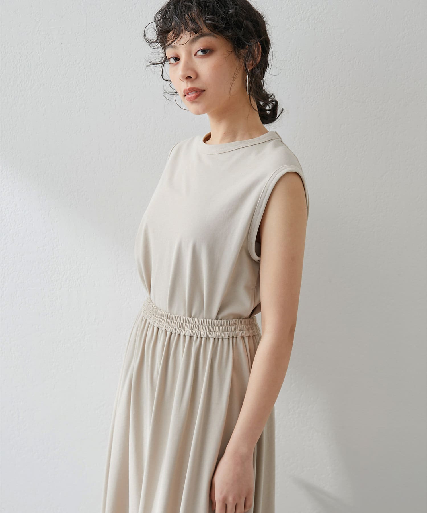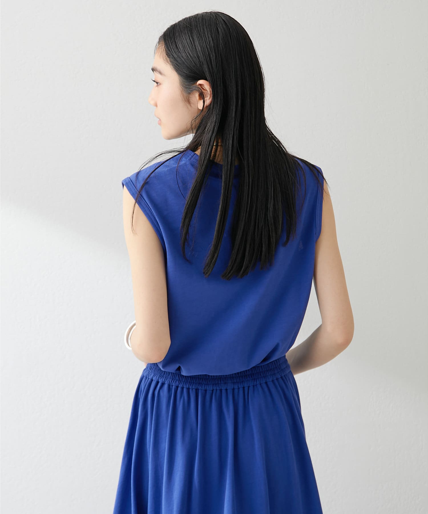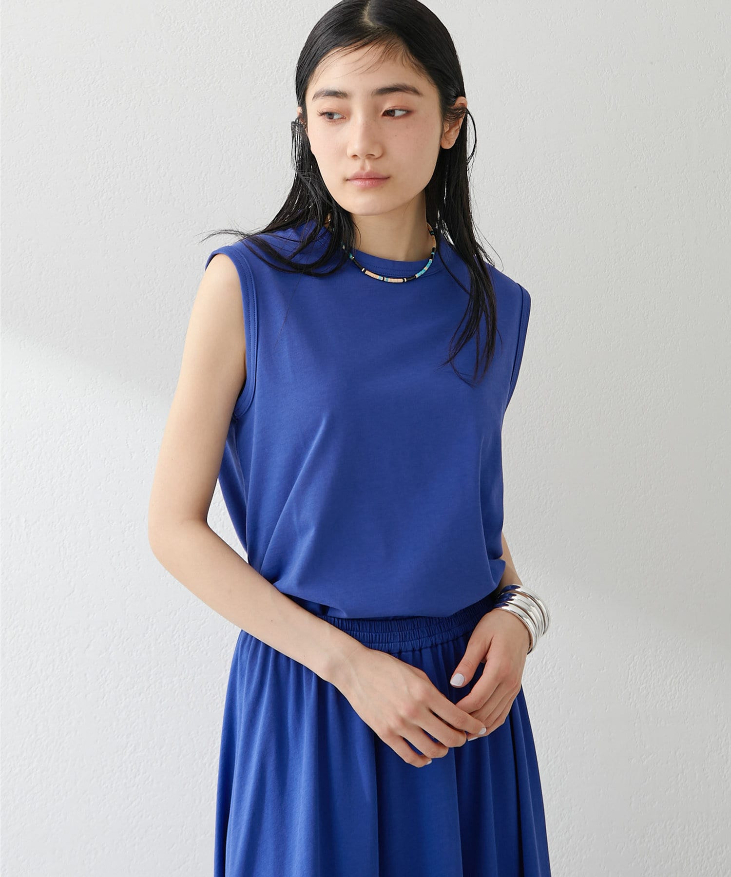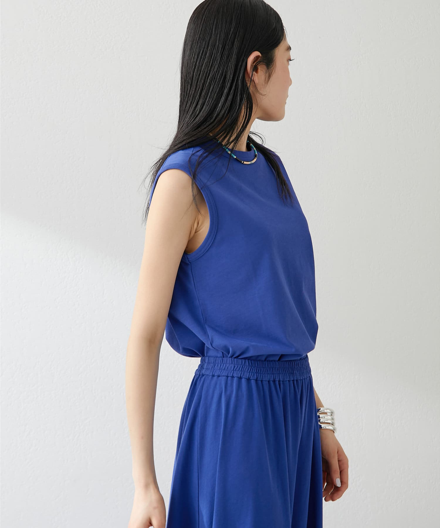 肩をカバーしてくれるノースリーブカットソー。気になる脇肉も見えないアームのラインが絶妙です。これこそ1枚で様になる1着。シンプルですがこういう垢抜けアイテムは欠かせません。