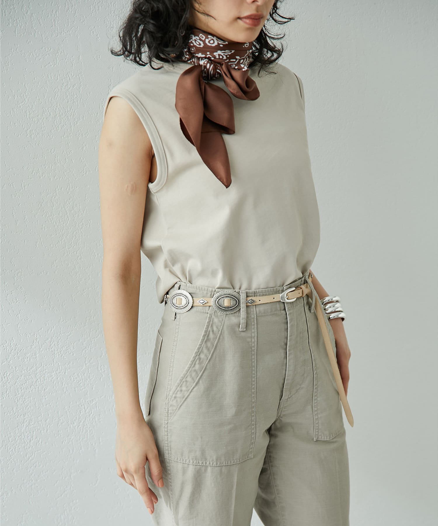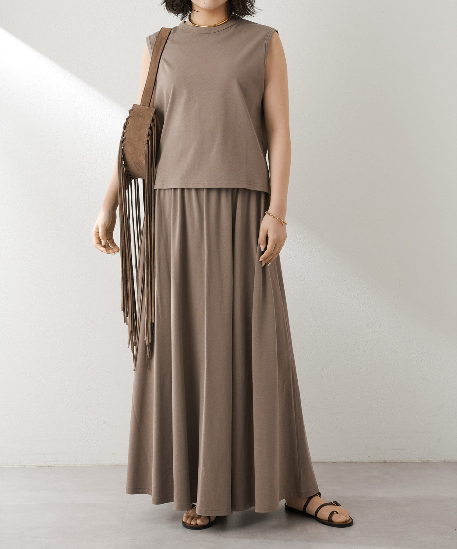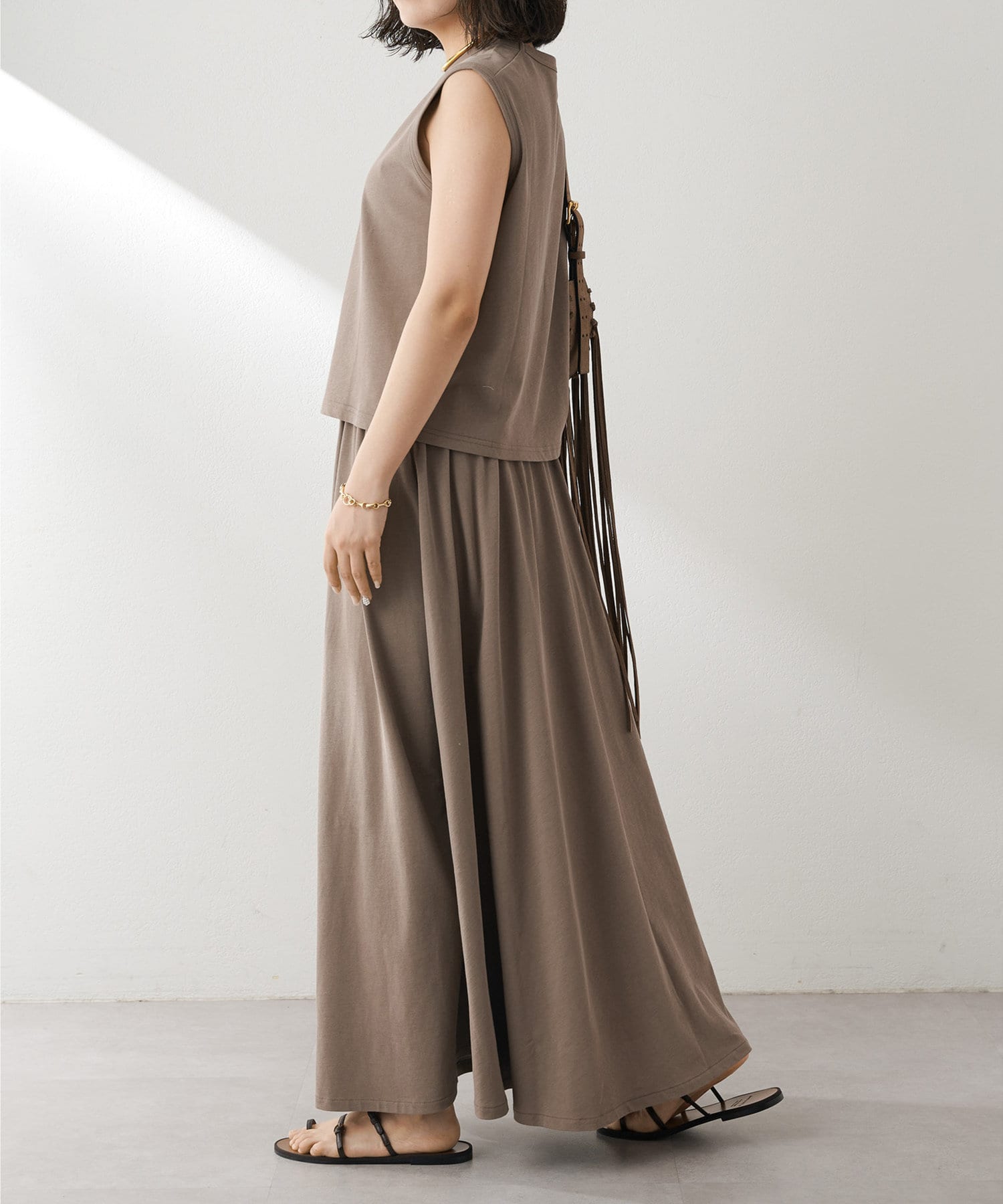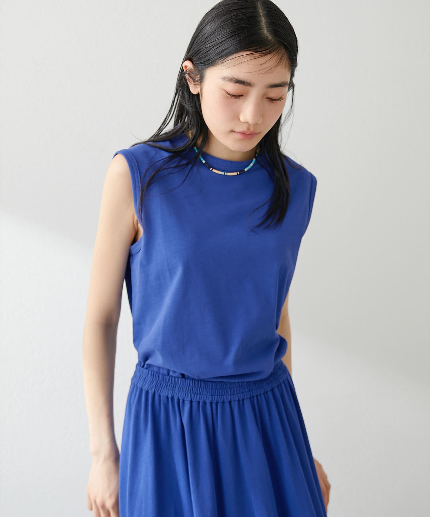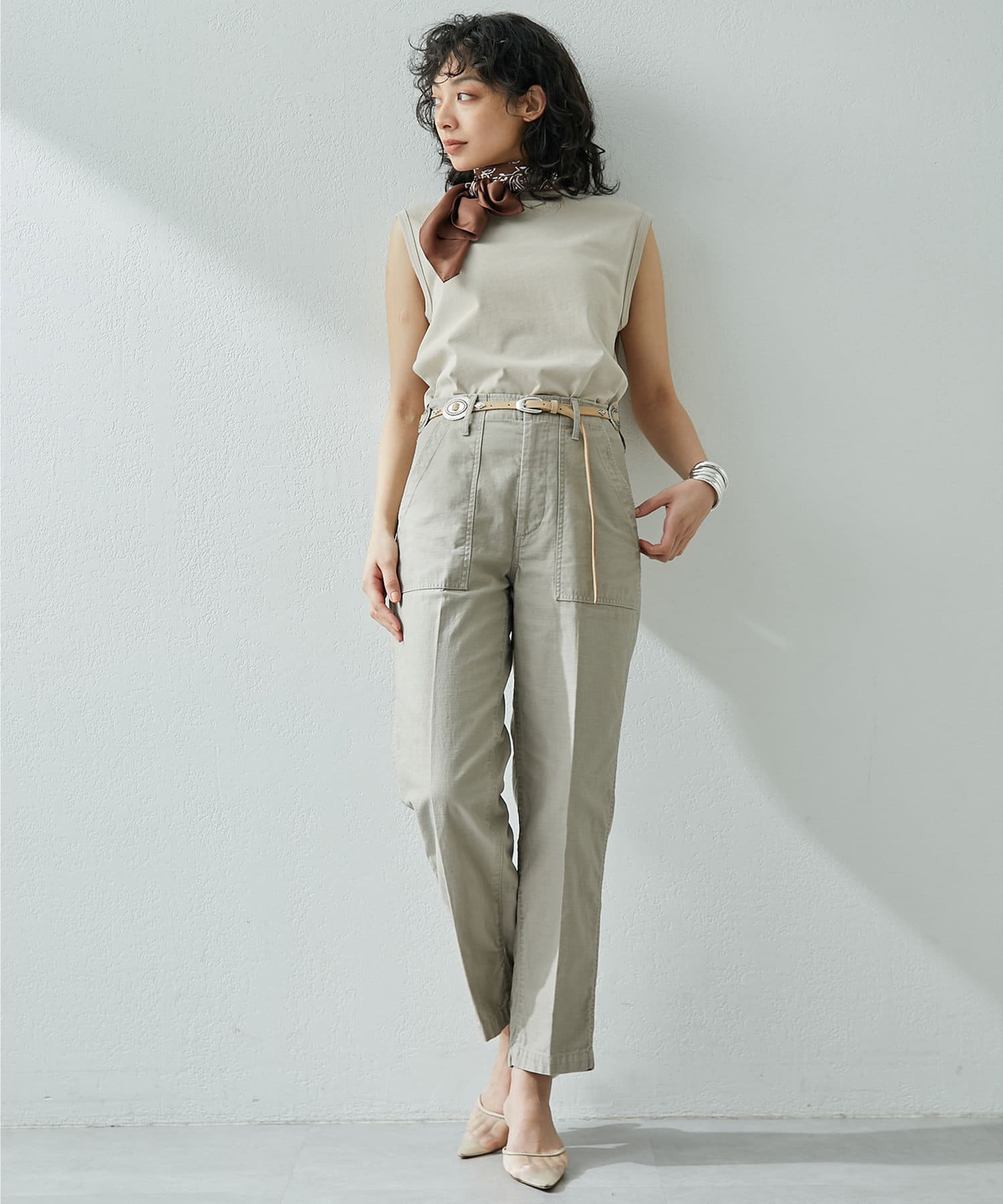 肩をカバーしてくれるノースリーブカットソー。気になる脇肉も見えないアームのラインが絶妙です。これこそ1枚で様になる1着。シンプルですがこういう垢抜けアイテムは欠かせません。