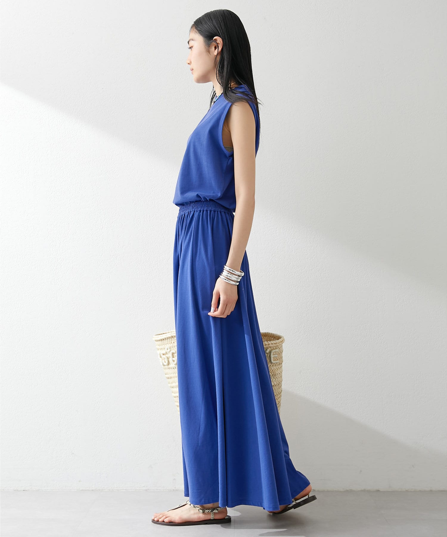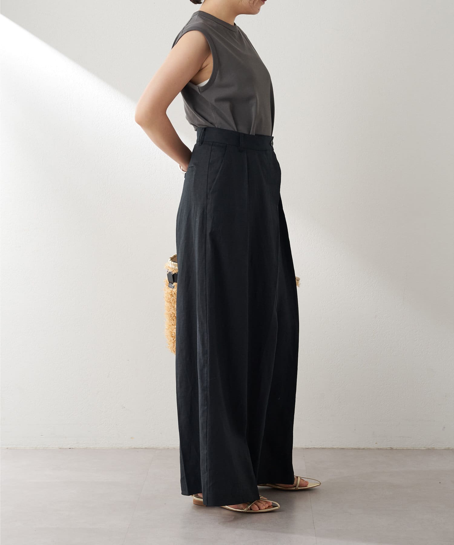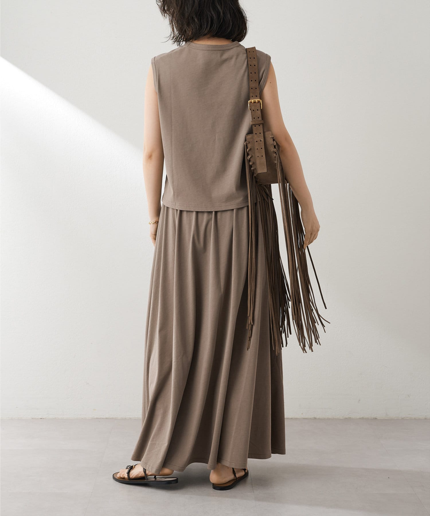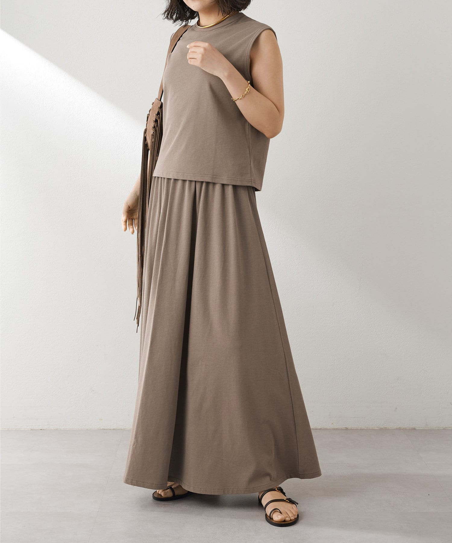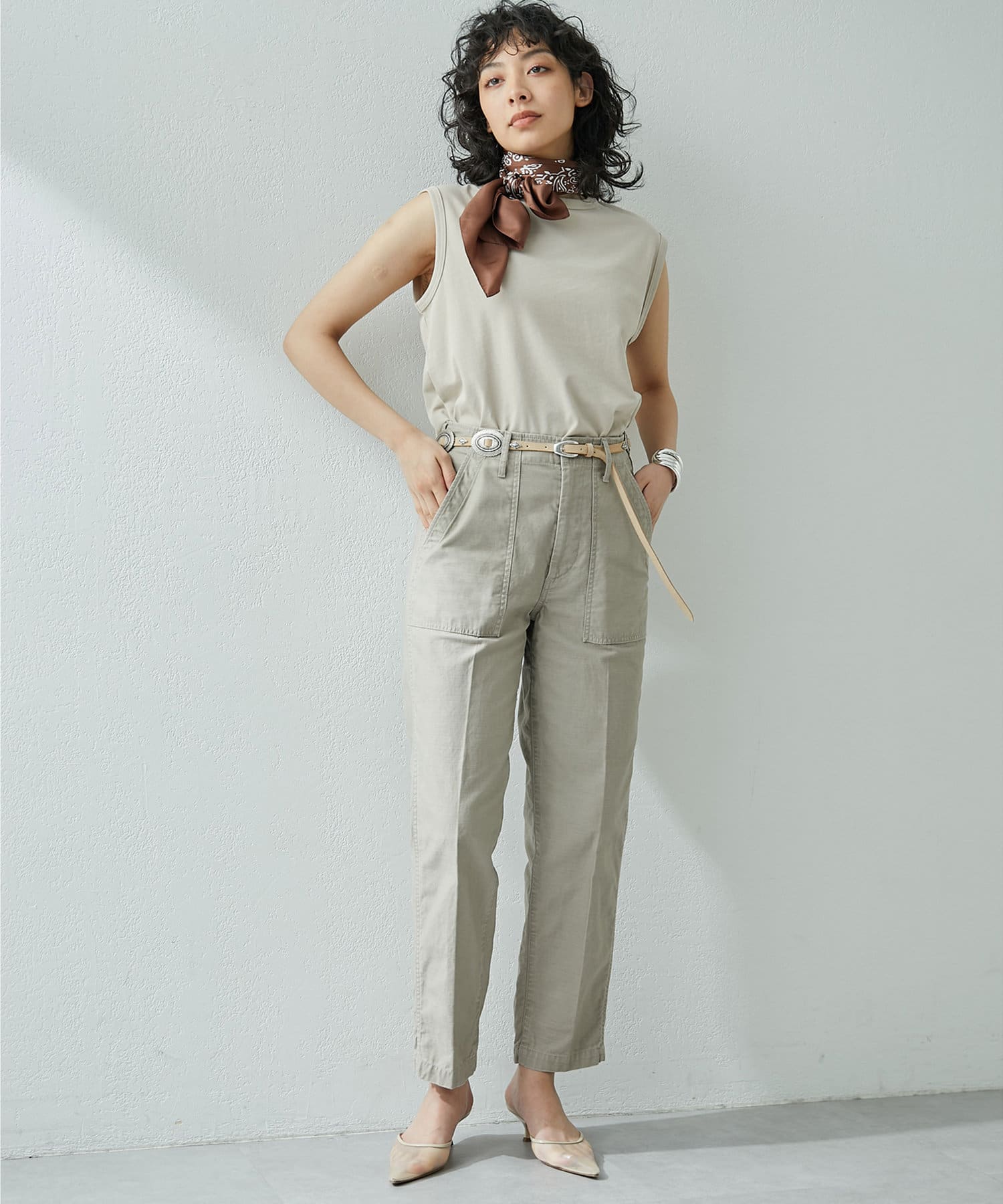 肩をカバーしてくれるノースリーブカットソー。気になる脇肉も見えないアームのラインが絶妙です。これこそ1枚で様になる1着。シンプルですがこういう垢抜けアイテムは欠かせません。
