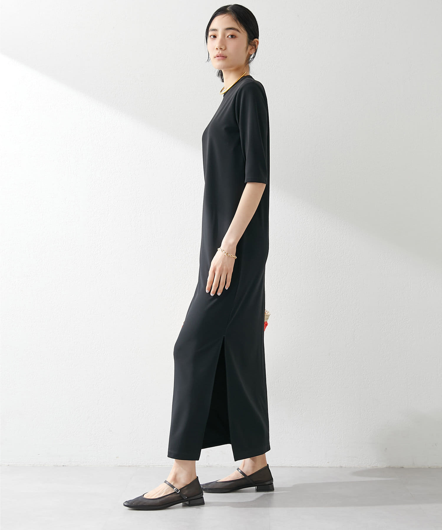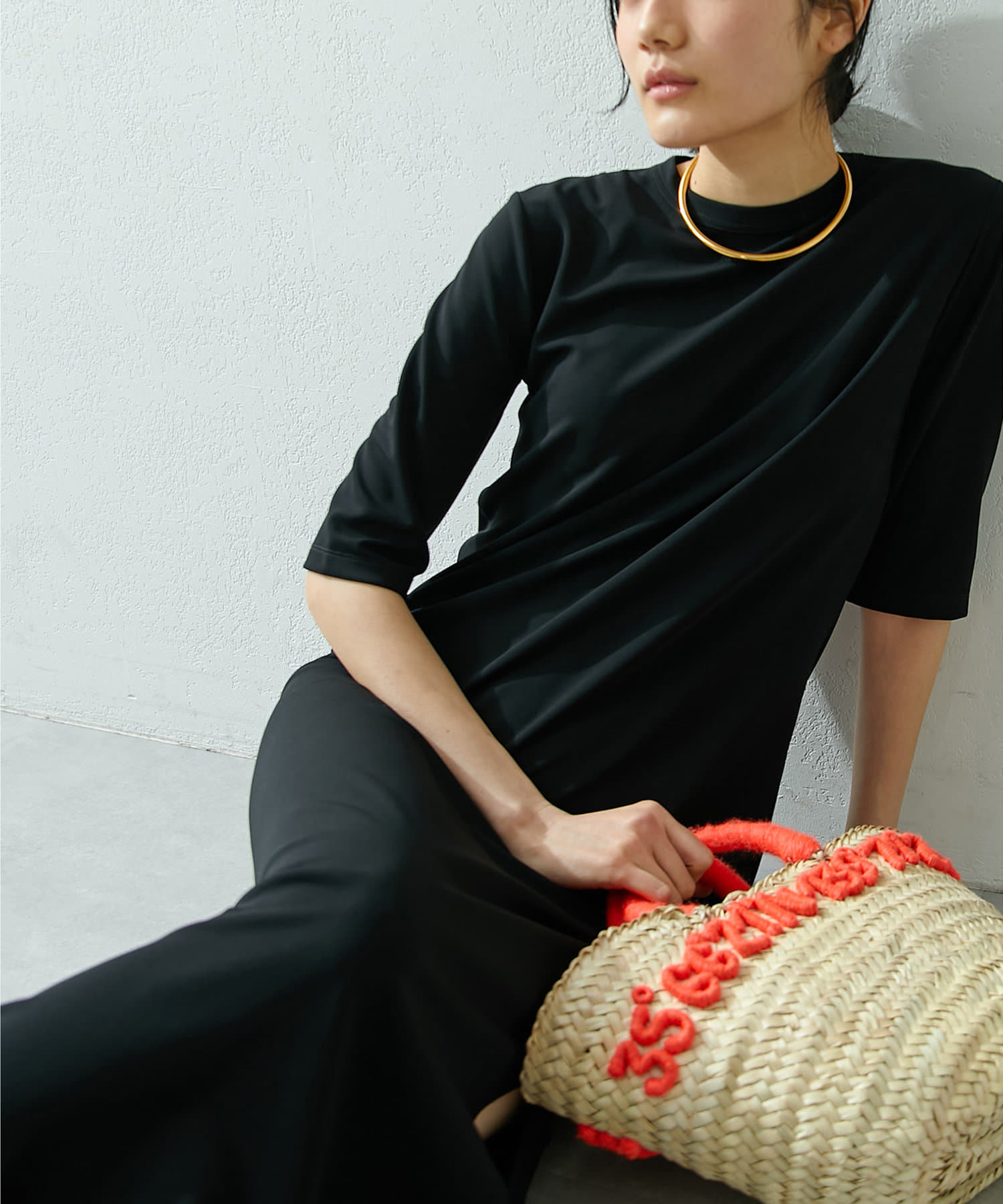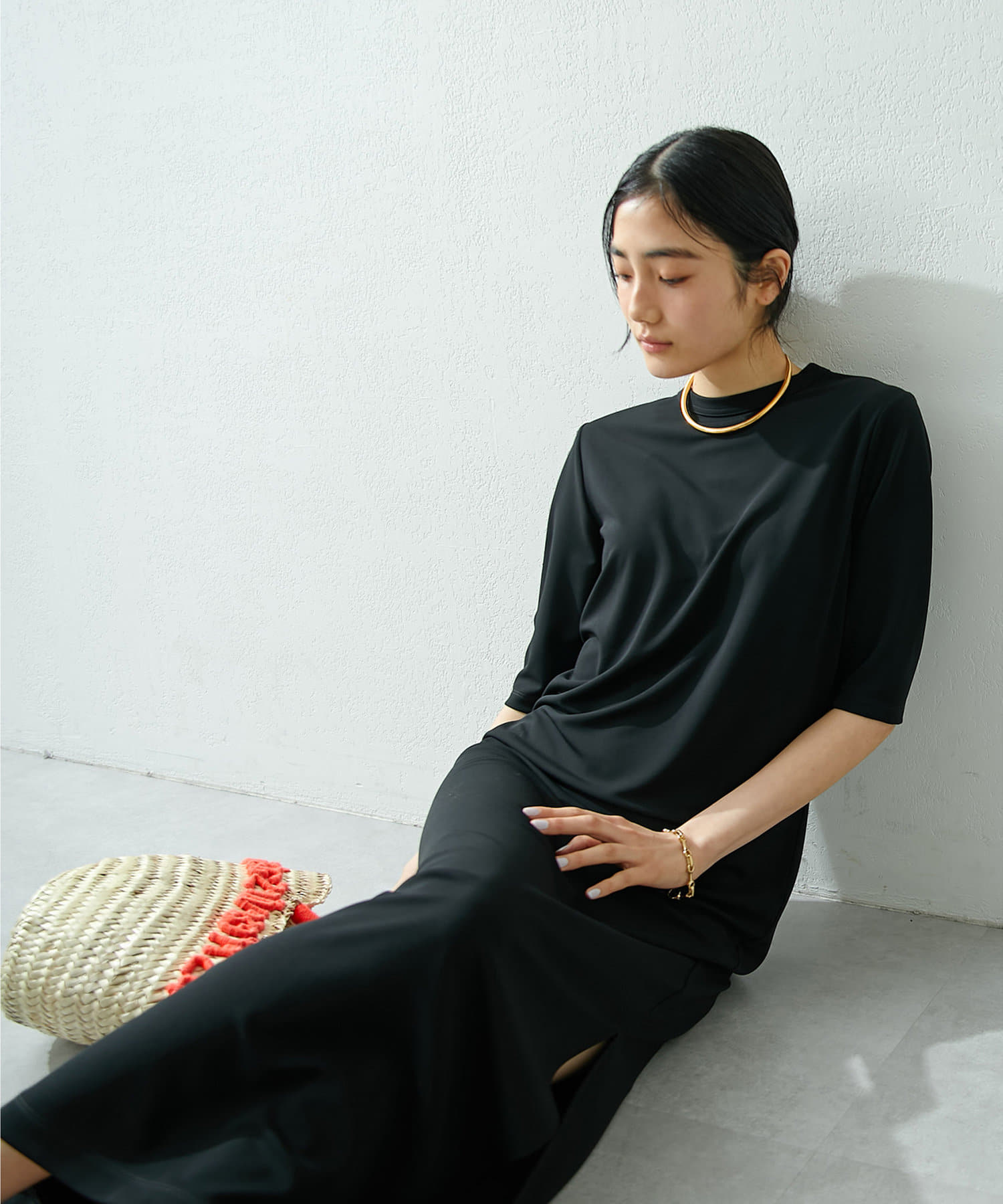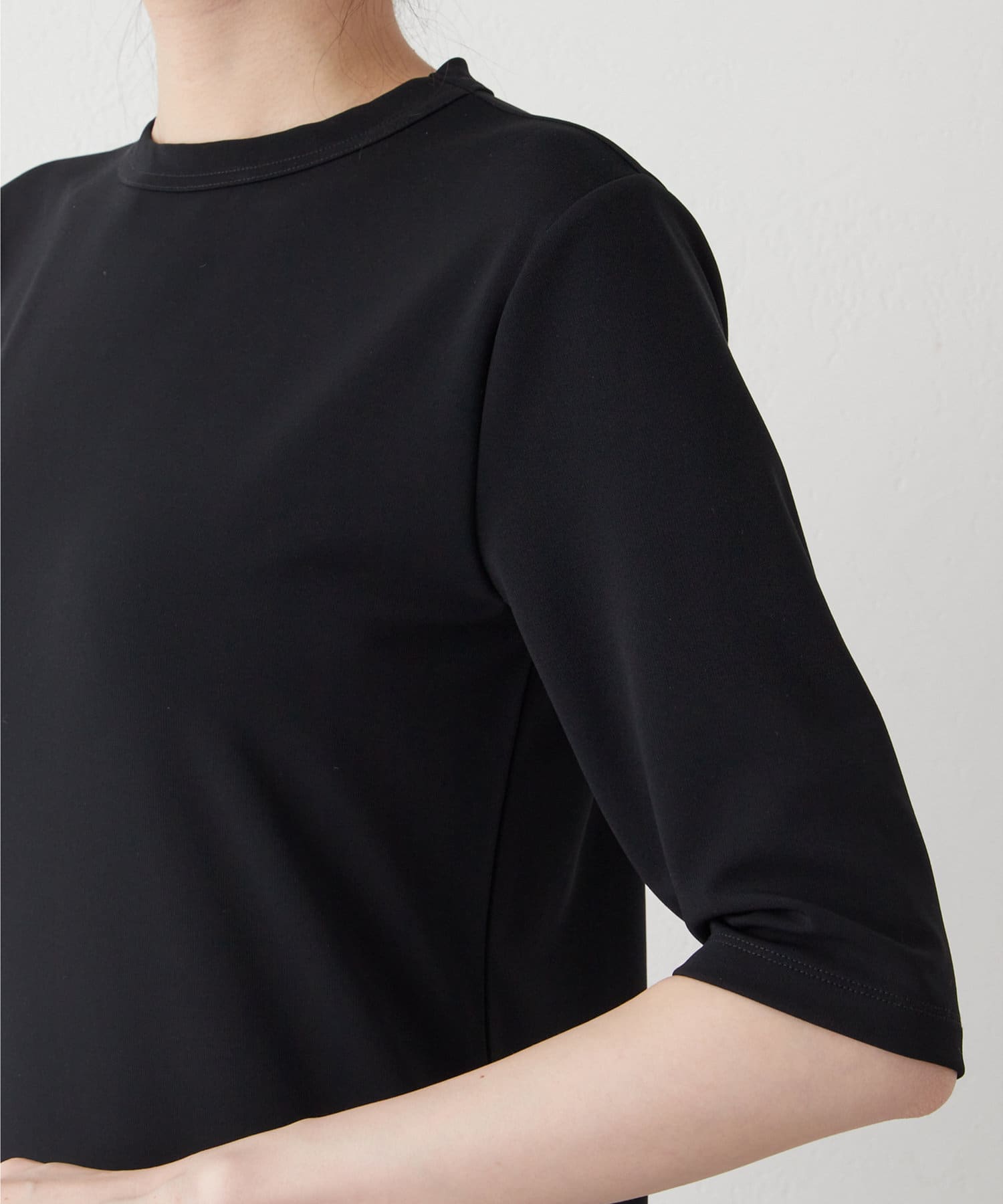 落ち感のあるストレッチ素材はとても肌触りが良くノンストレスに楽しめます!細身のシルエットですとんときれいに落ちるのですっきりと着こなせます。長めのハーフスリーブが上品に見せてくれるだけでなく、二の腕もカバーもしてくれますよ。