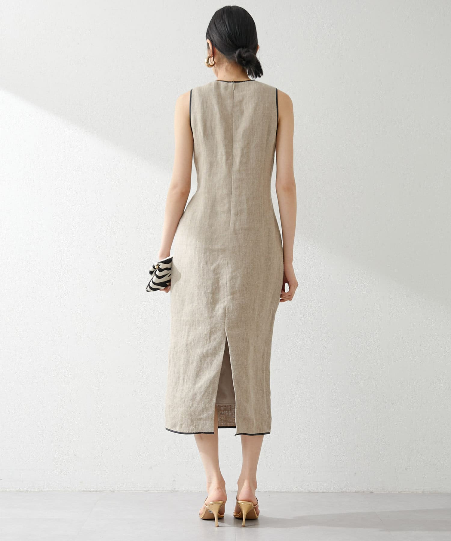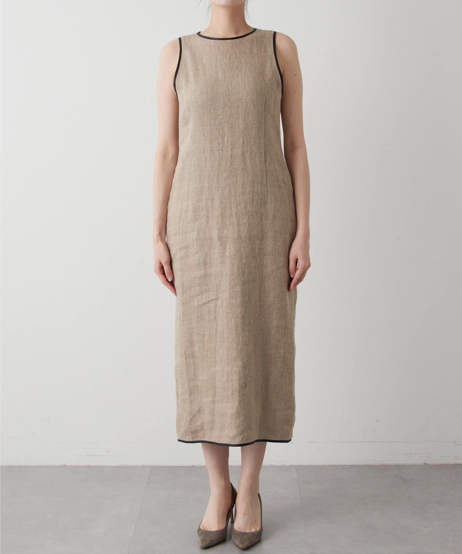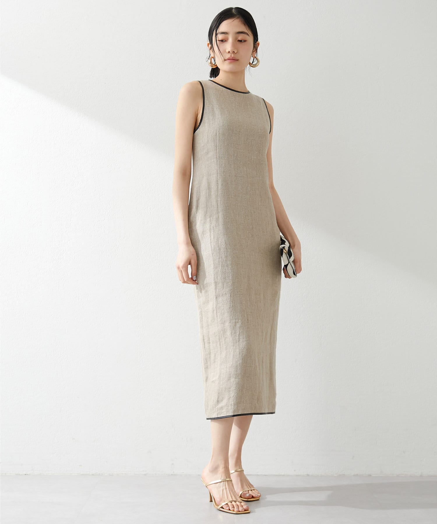 大人の女性におすすめしたいリネンワンピース。スッキリとしたシルエットで女性らしさとこなれ感も感じられるアイテムです。リネン素材が綺麗めになり過ぎず、華やかな印象にしてくれます。パイピングがアクセントに。