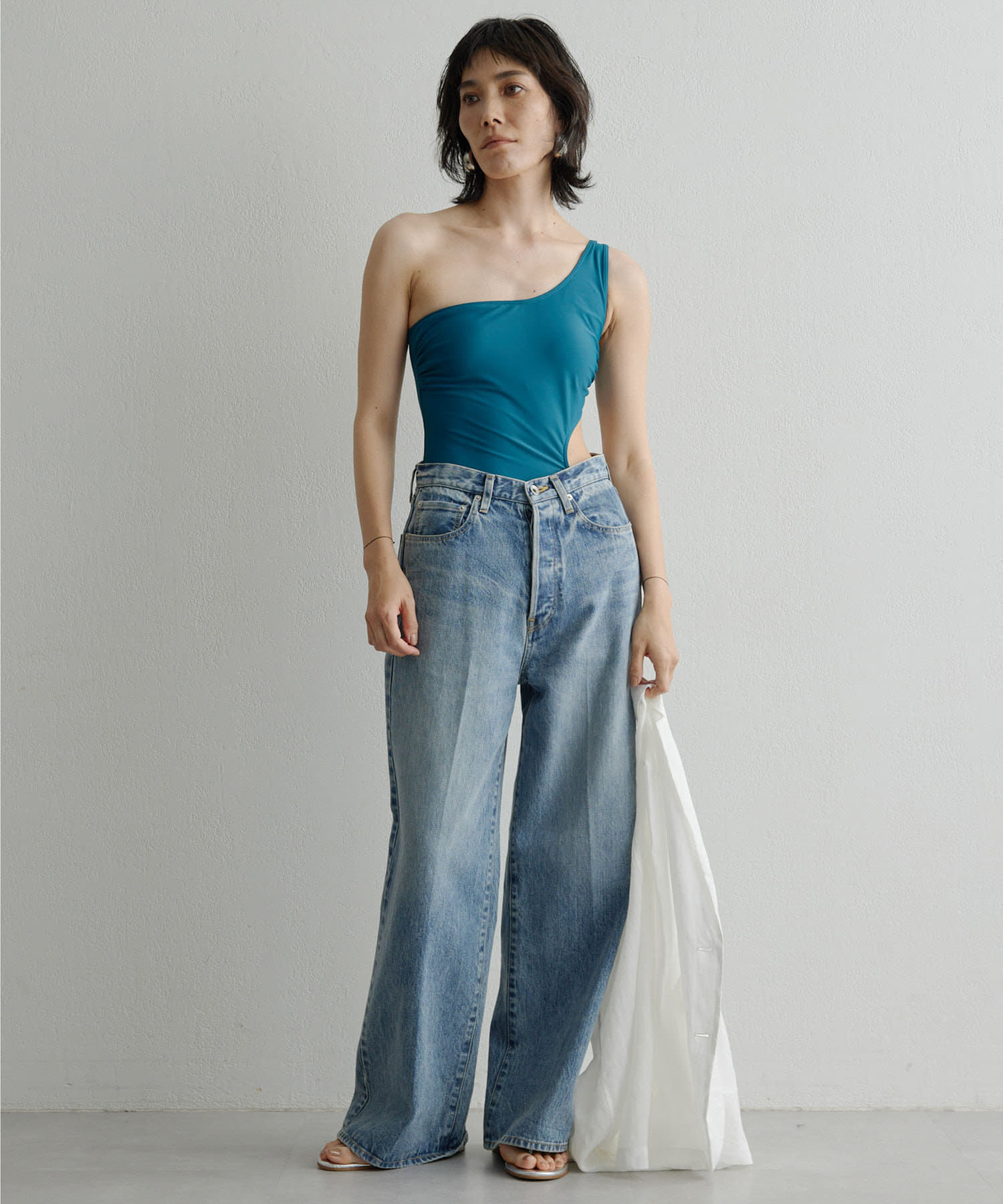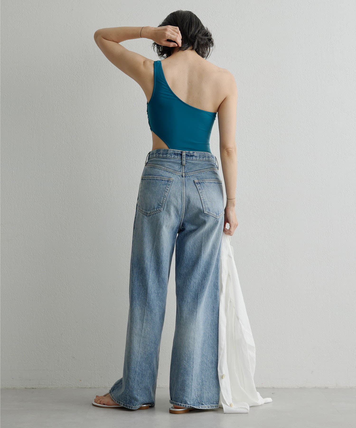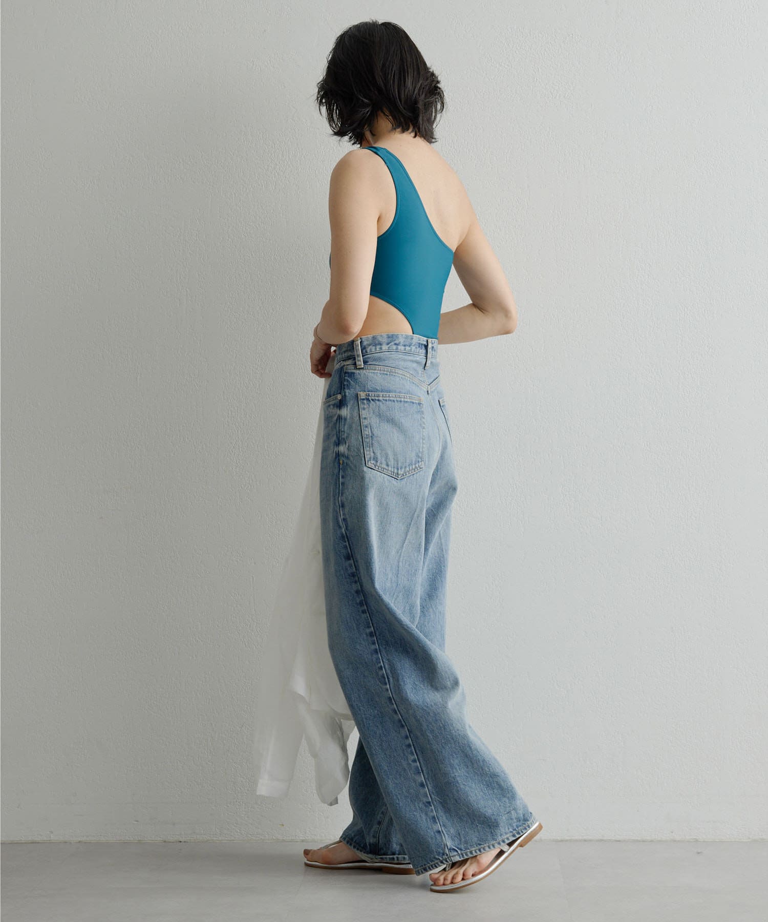 ウエストのくびれが綺麗に見えるスイムウェア。ワンショルダーの水着は初めての挑戦でしたが、自然と身体に馴染みました。両サイド脇肉も見えないカッティング◎拘り抜かれたスイムウェアです。