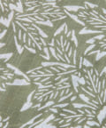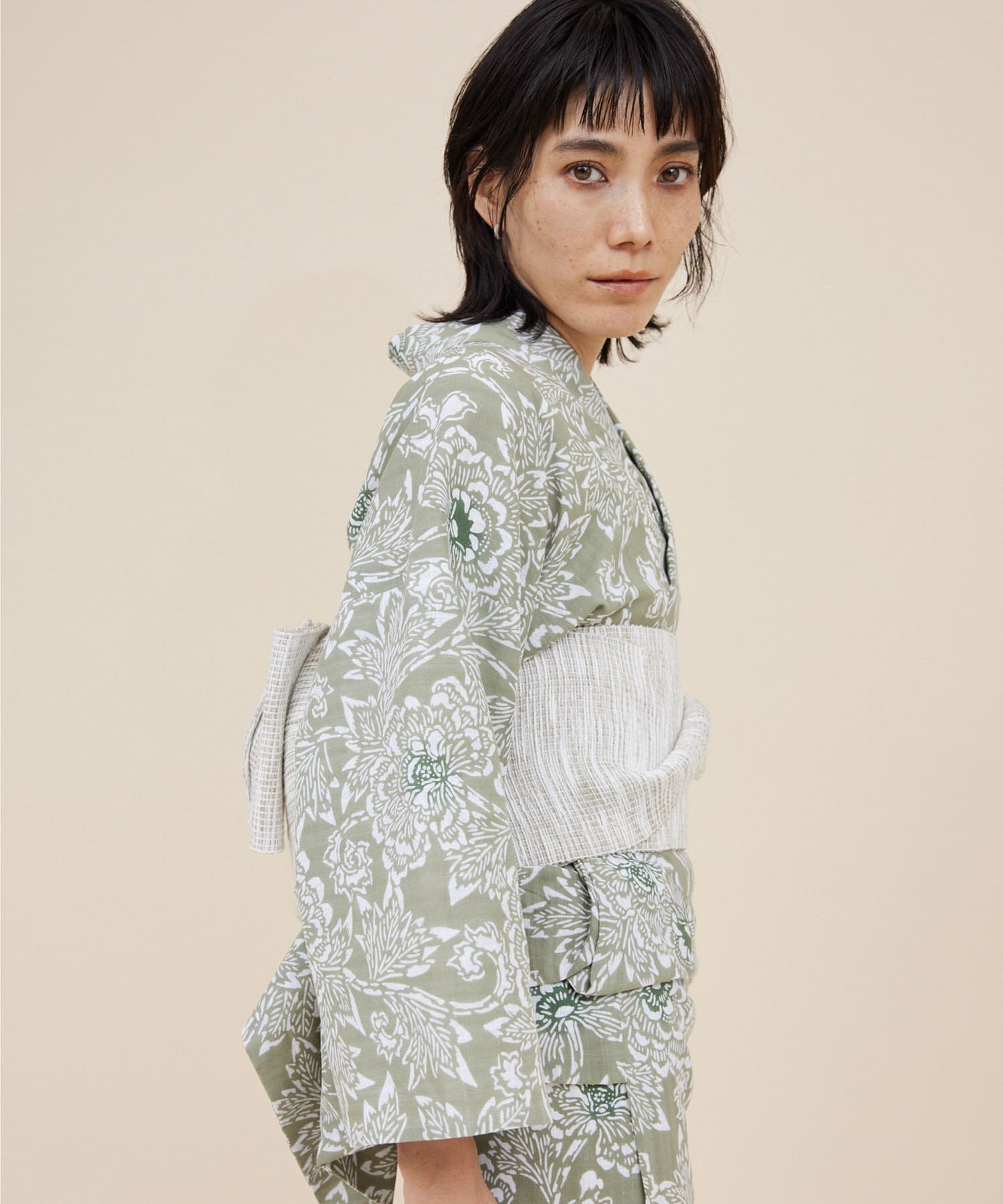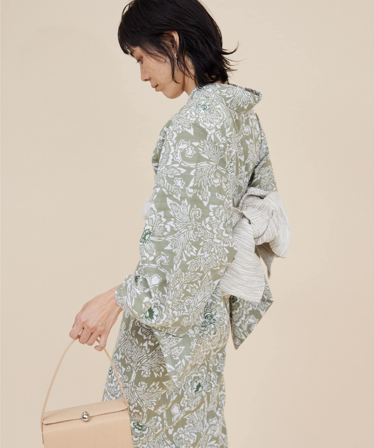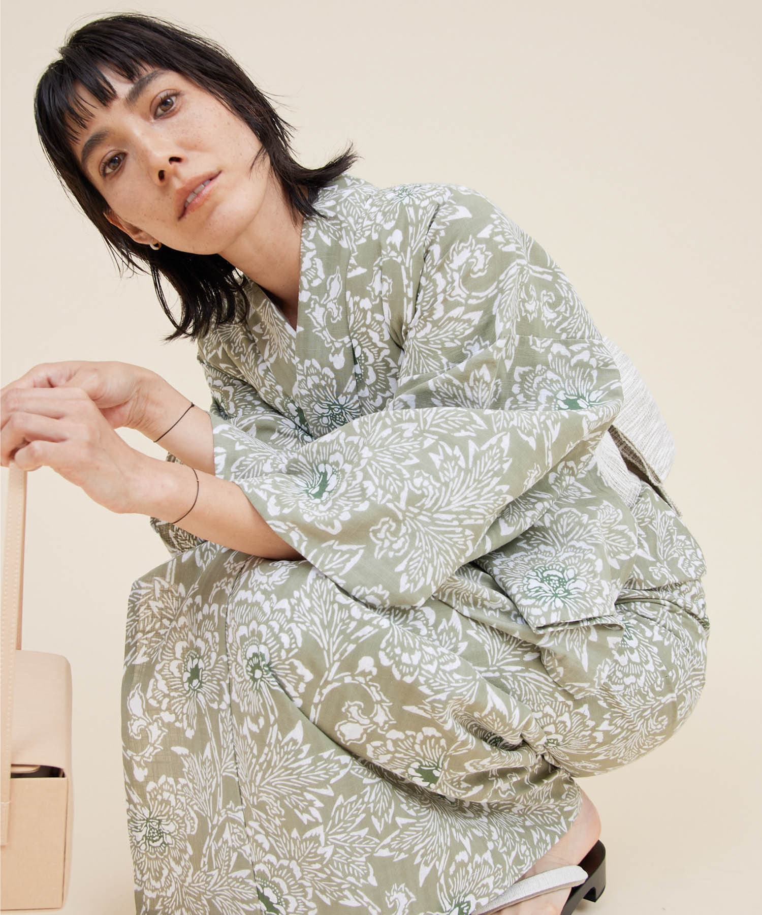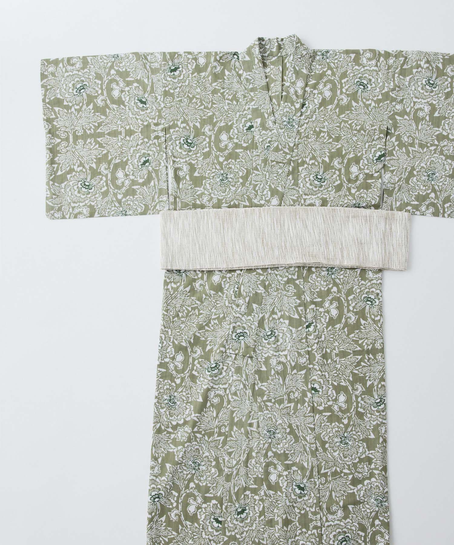グリーン:「牡丹唐草」。注染で染められた柄の色や濃淡が爽やかに見える薄カーキ。