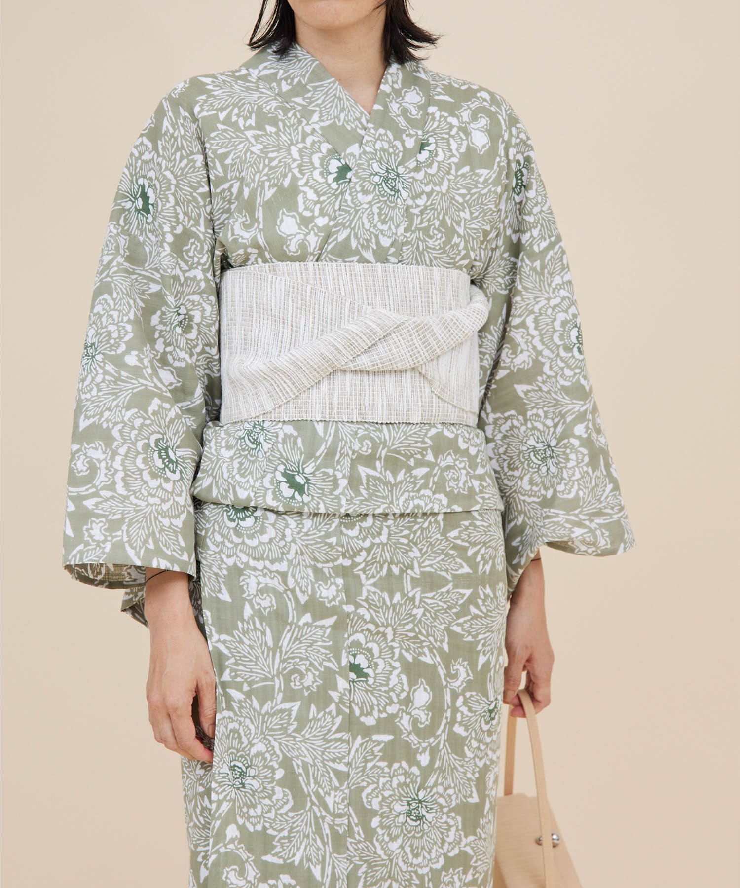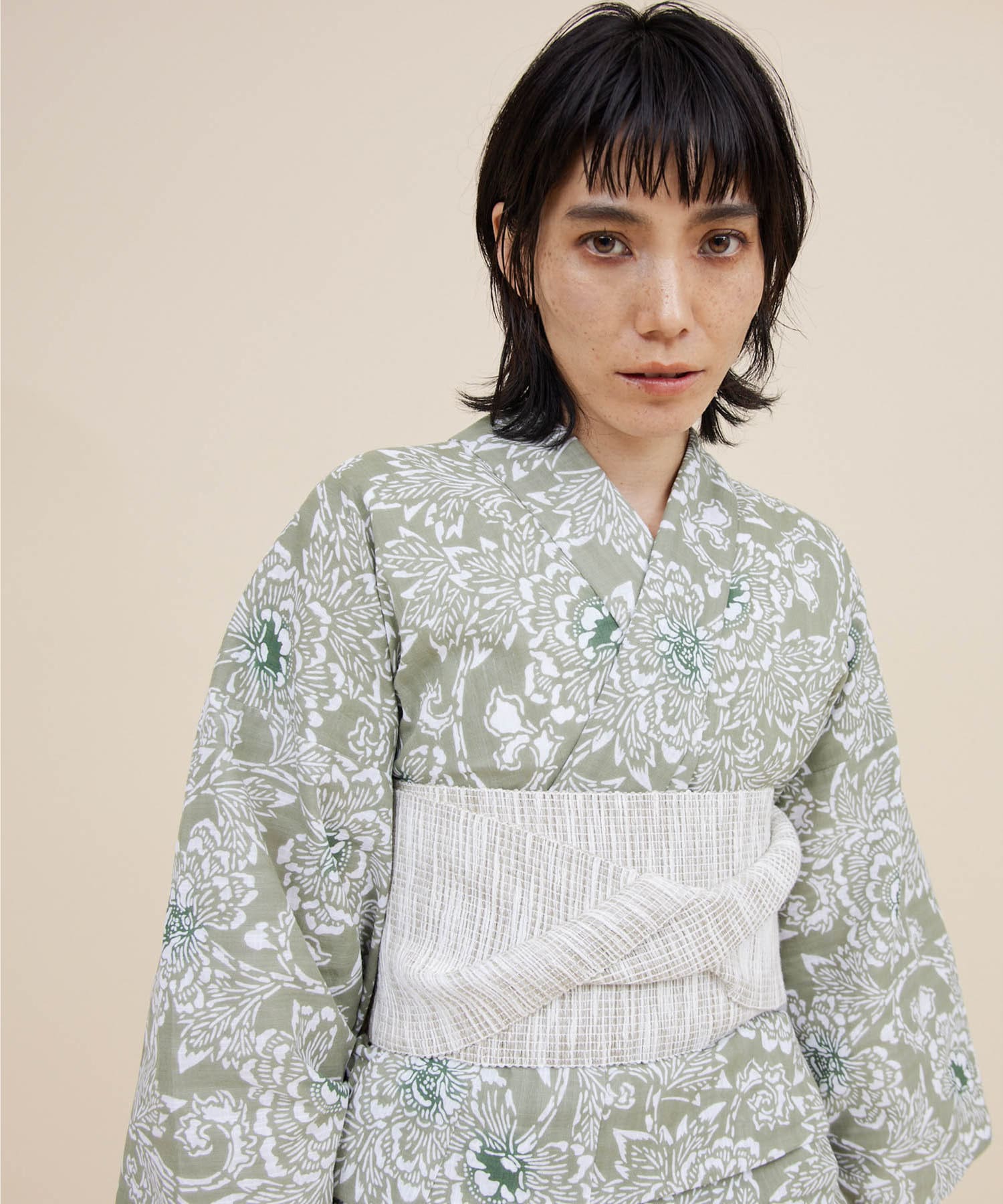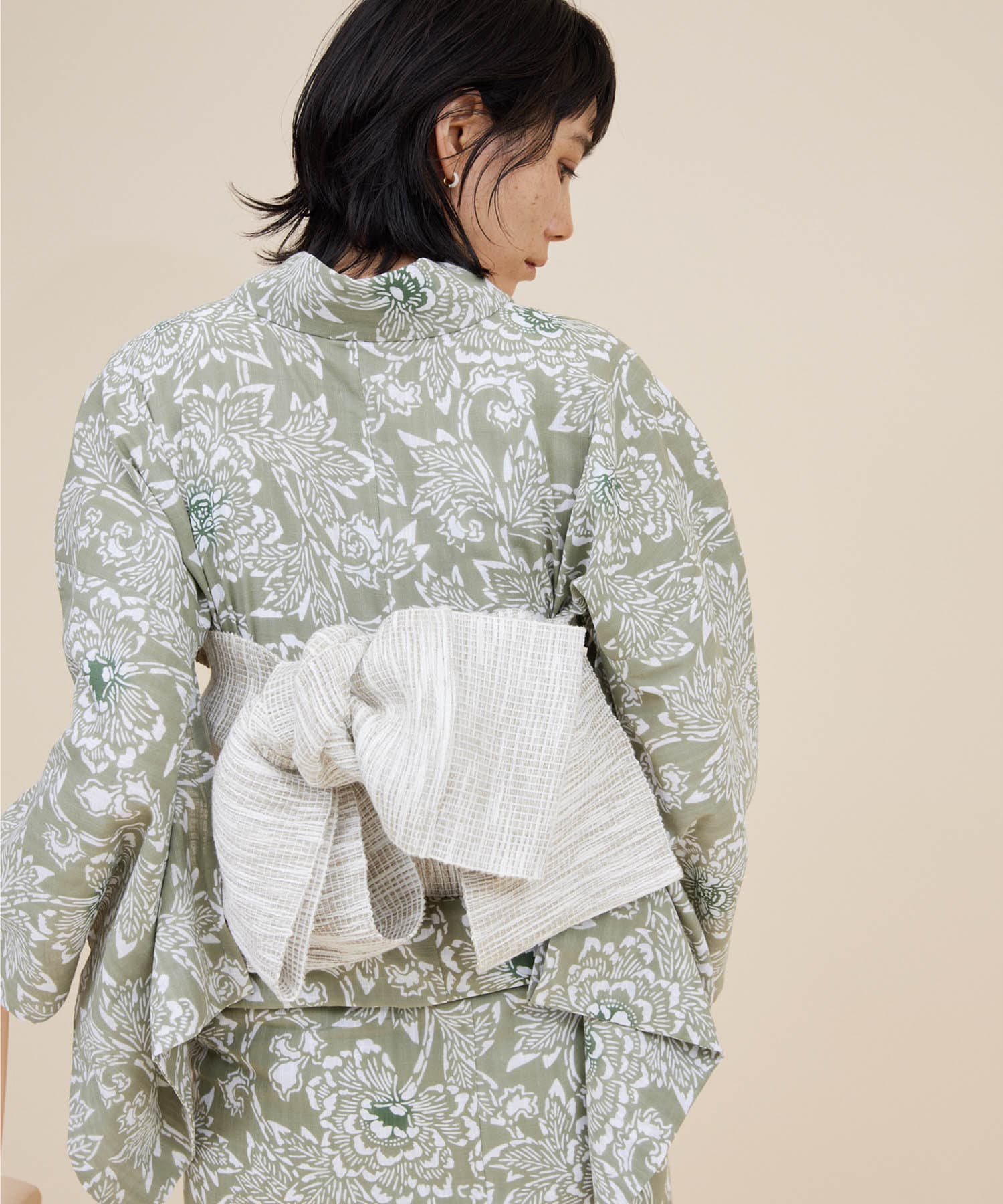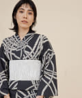 ■帯は国内の帯屋さんでオリジナルカラーで織り、ベージュやホワイトを合わせる事でウィムガゼットらしいカラーを表現。