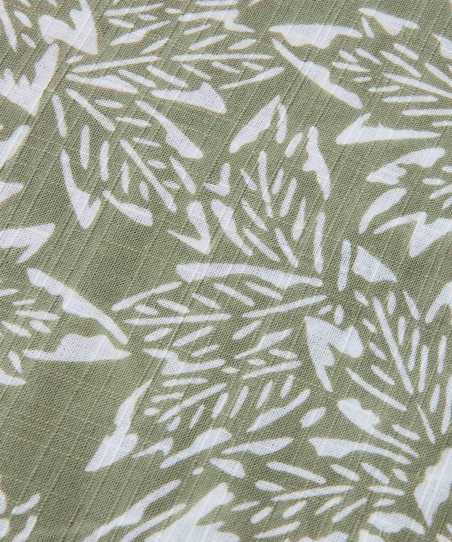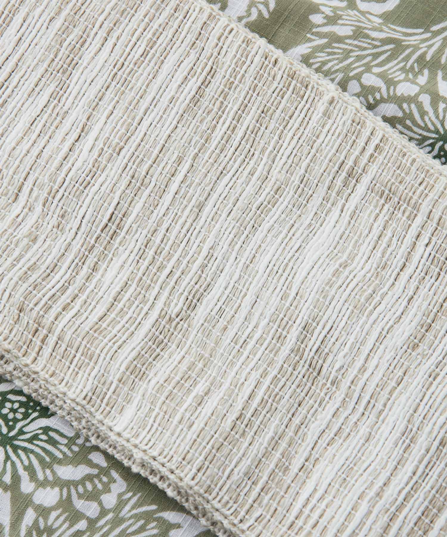 ■グリーン:縦横にランダムに短い節が走り、節の凹凸が肌の当たりを少なくしてさらりとお召しいただける綿麻スラブ生地。