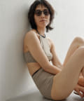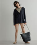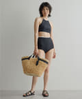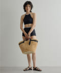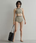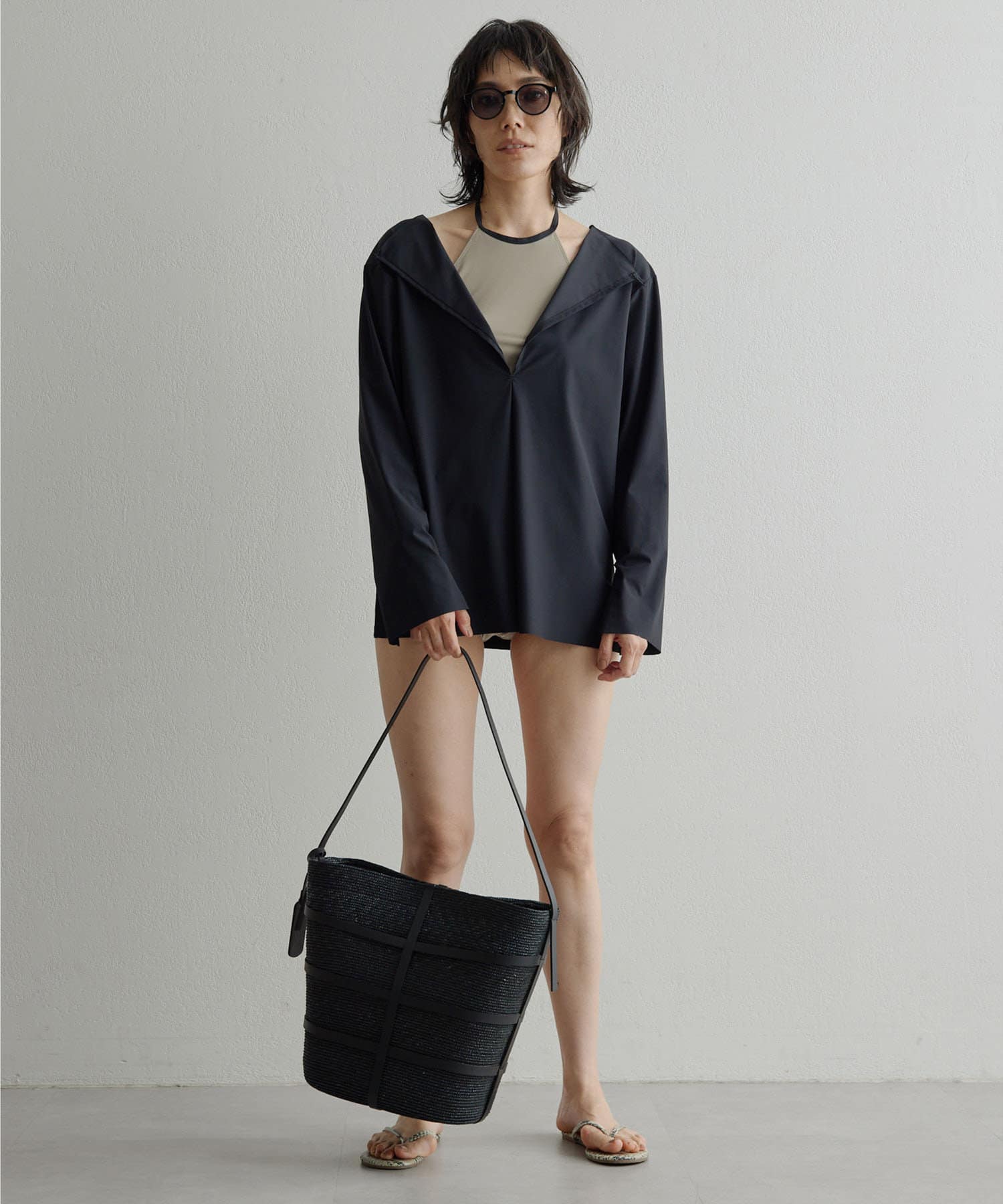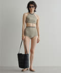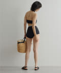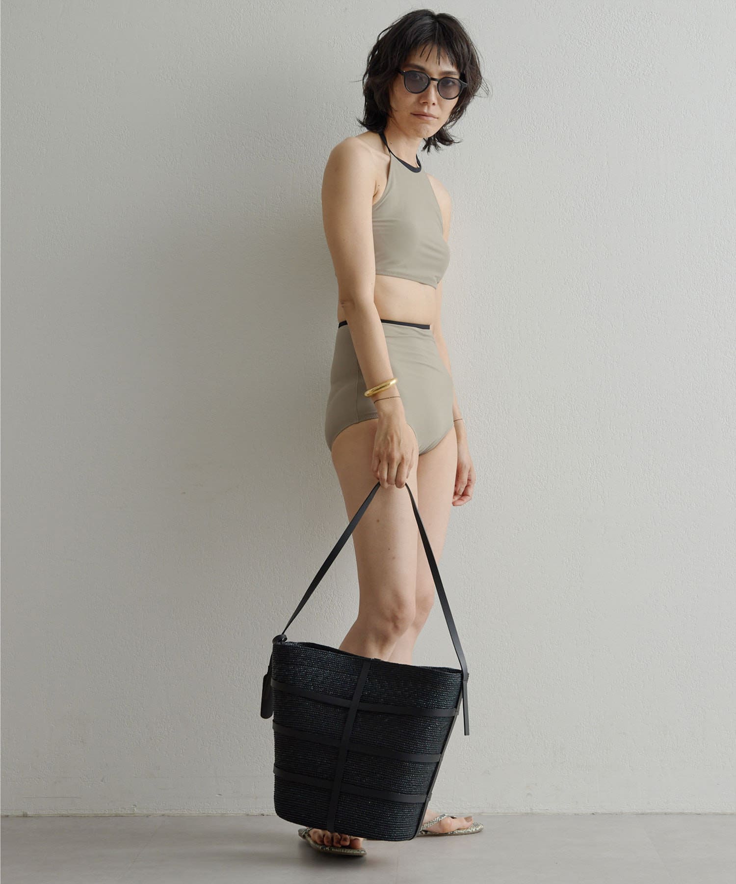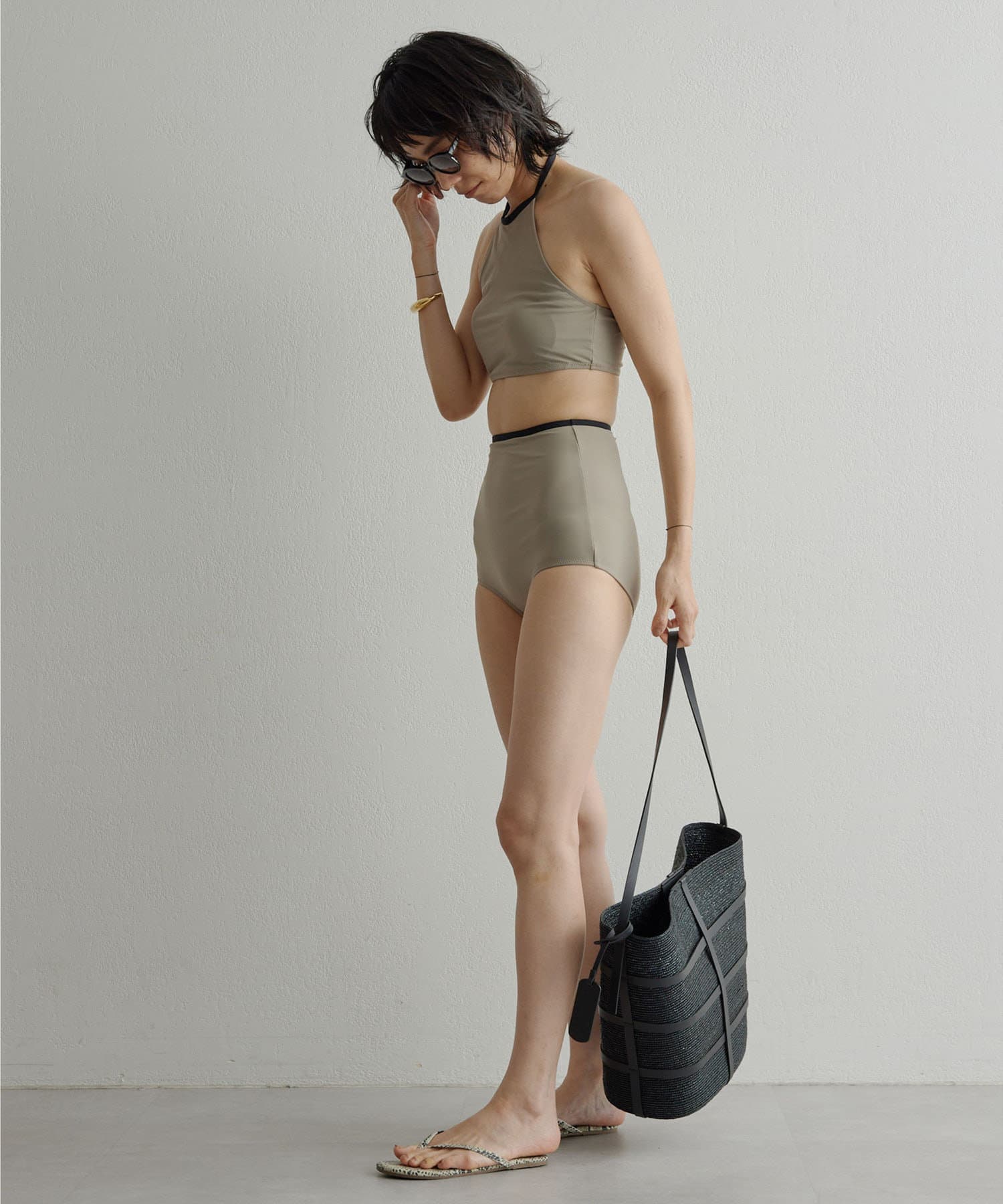 日常でもお使いいただける水着です。今回はメッシュニットと合わせたヘルシーな装いに。胸元はしっかりとホールドされている安心感がありました。いやらしくない胸元のデザインで大人の女性も合わせやすいです。